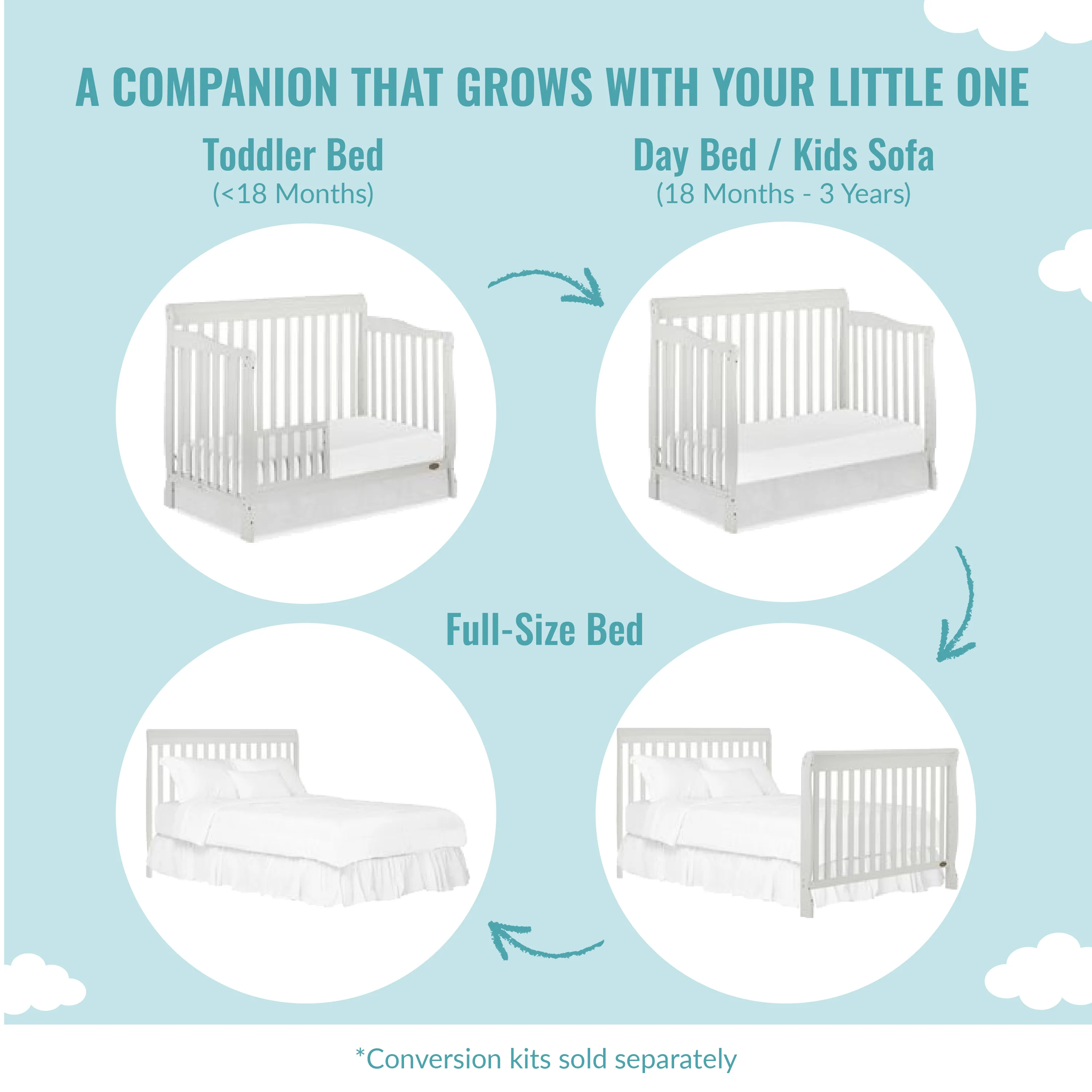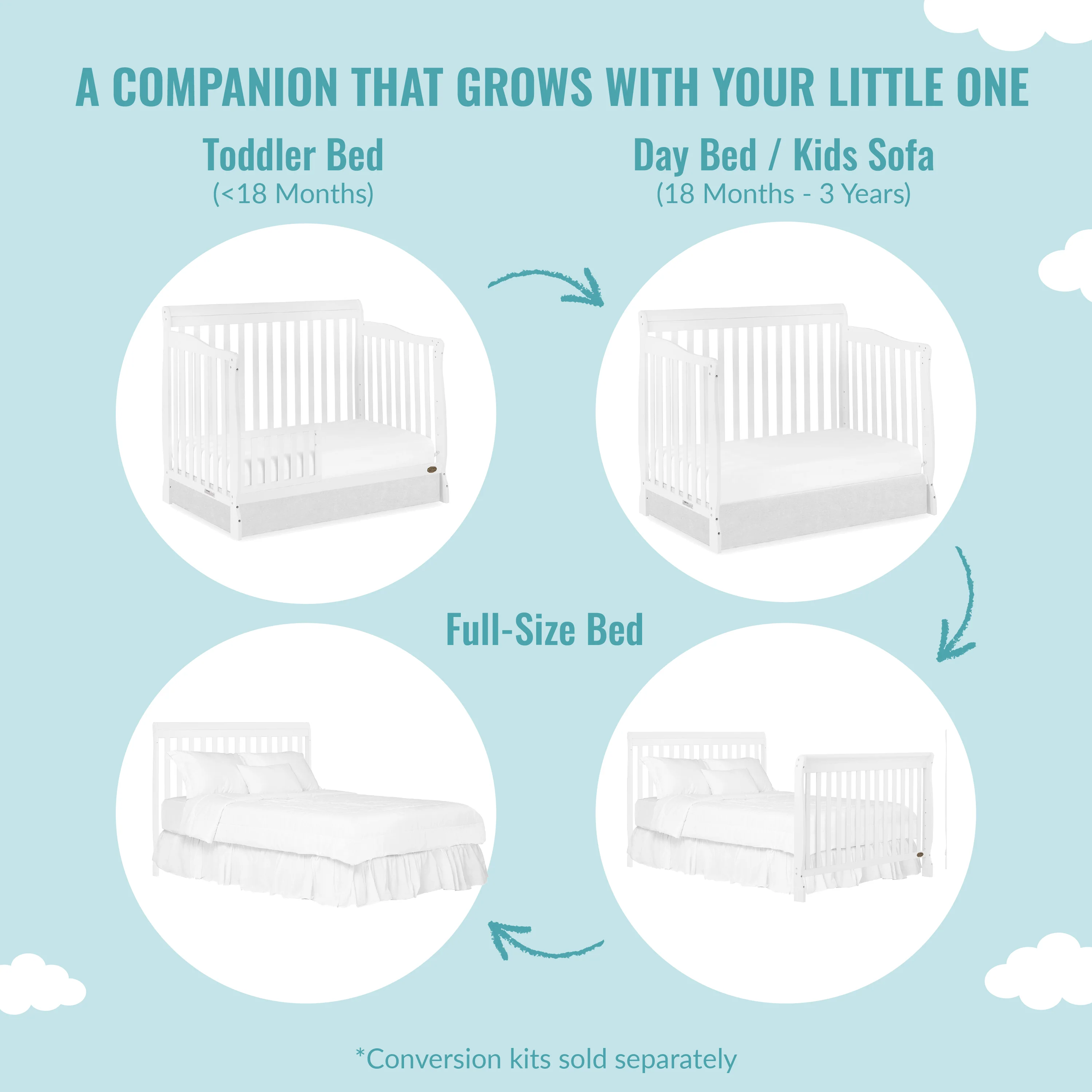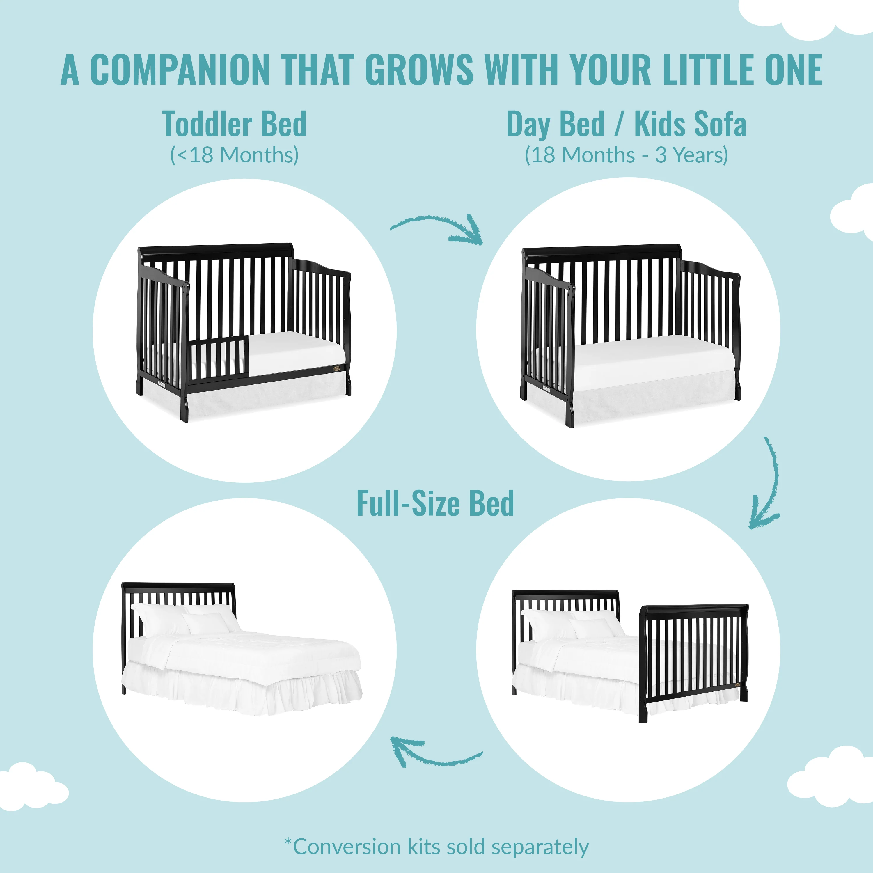 - 4-IN-1 CONVERTIBLE CRIB: A lifetime investment, the Ashton grows with your child, easily converting from a crib into a toddler, day and full-size bed. The toddler guardrail, stabilizer and full-size rail are sold separately