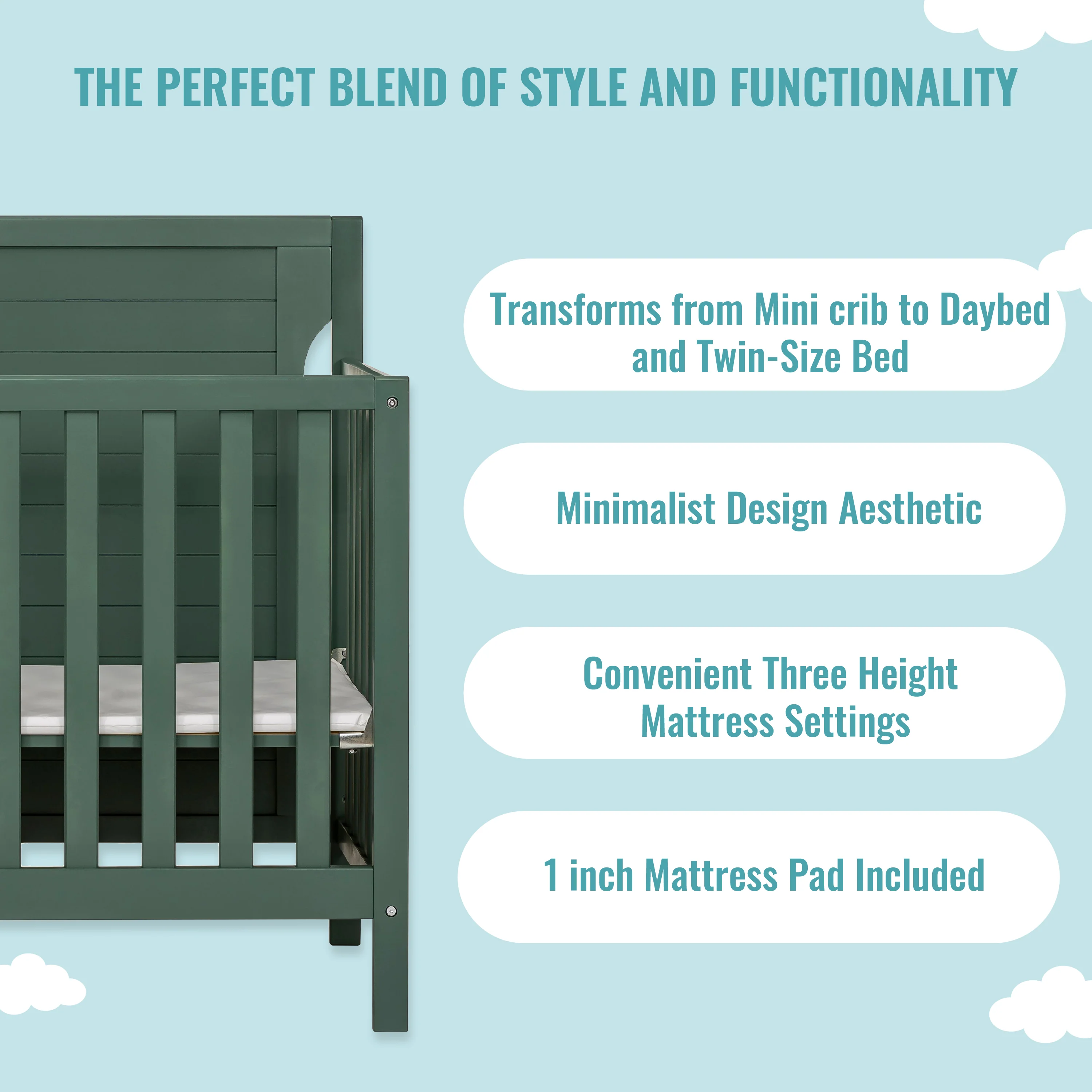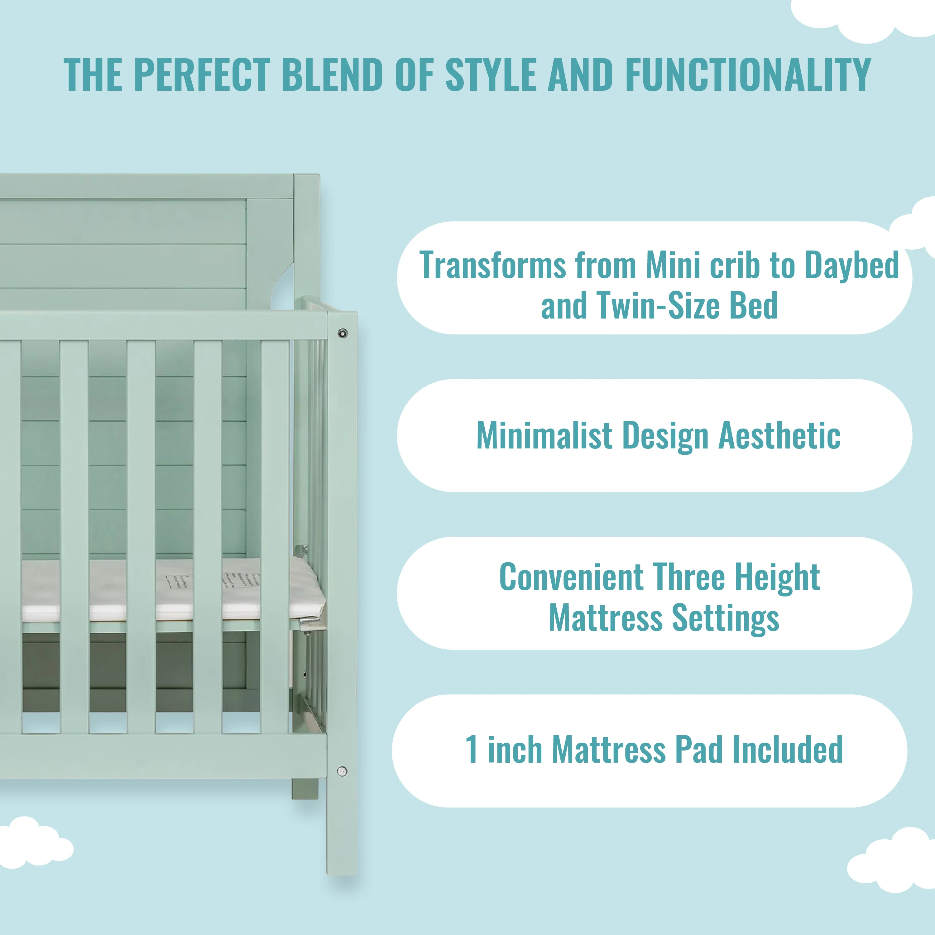 - Keep pace with your growing child’s changing needs with the Bellport Mini Crib. Starting as a mini crib, you can convert it into a mini daybed and twin-size bed (bed rails sold separately)