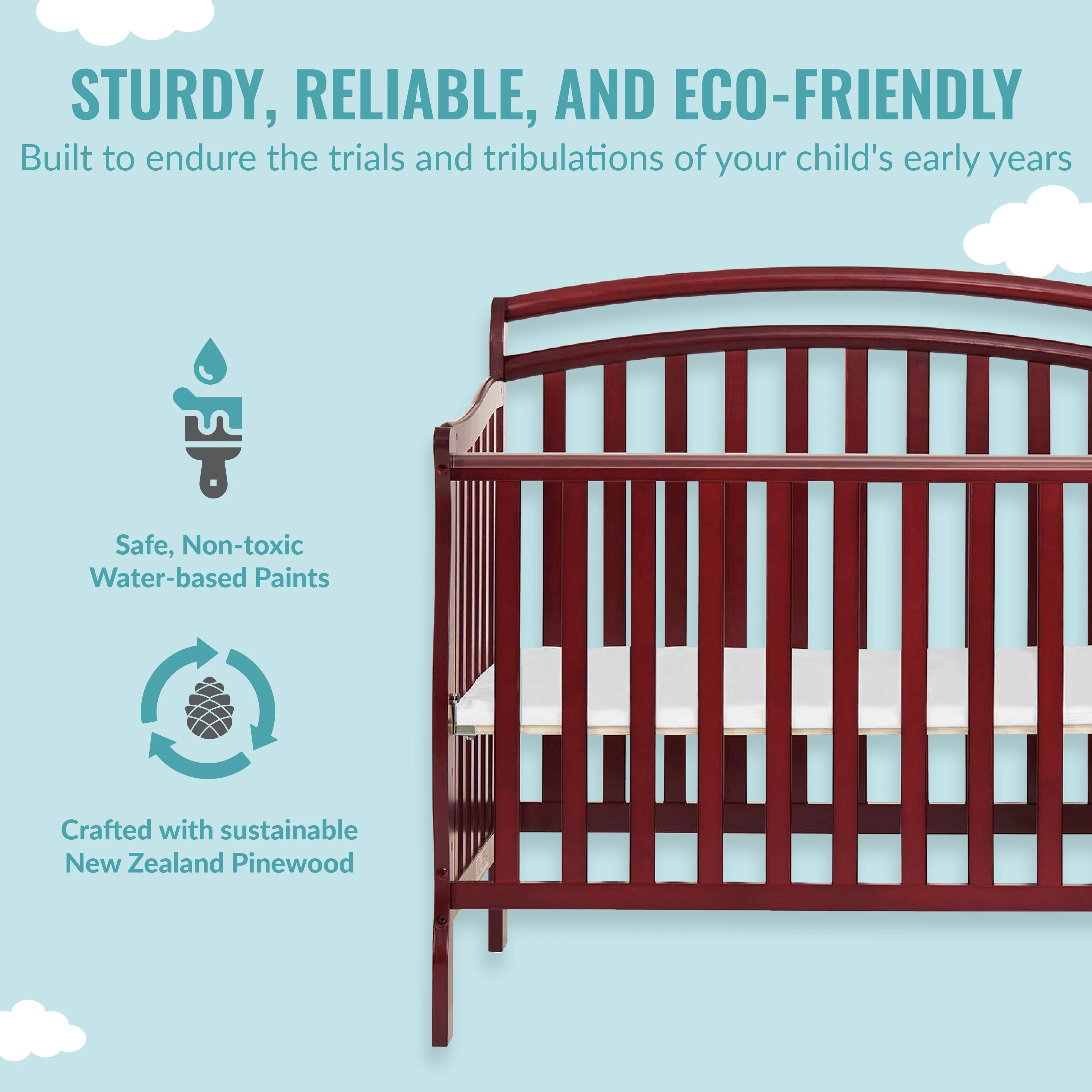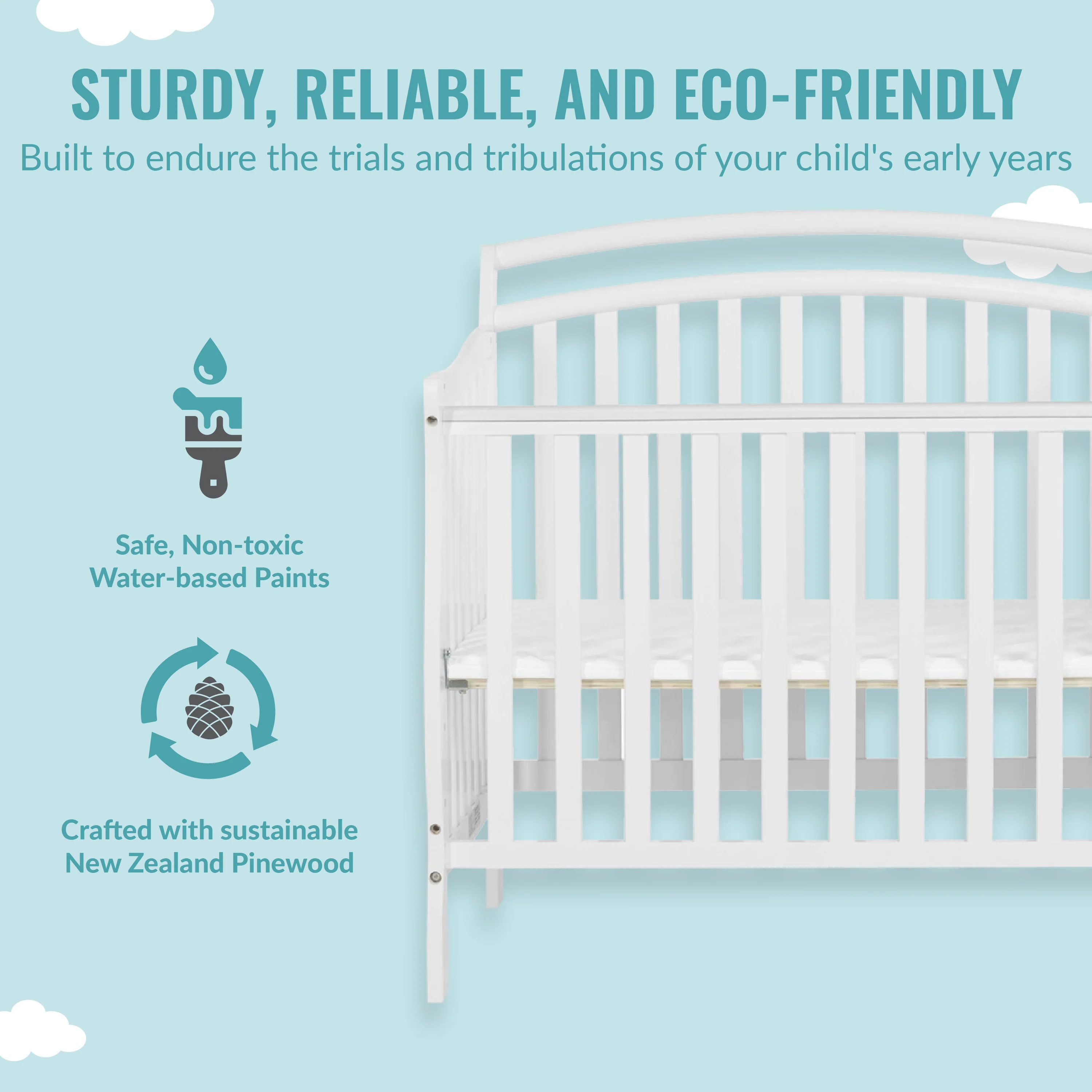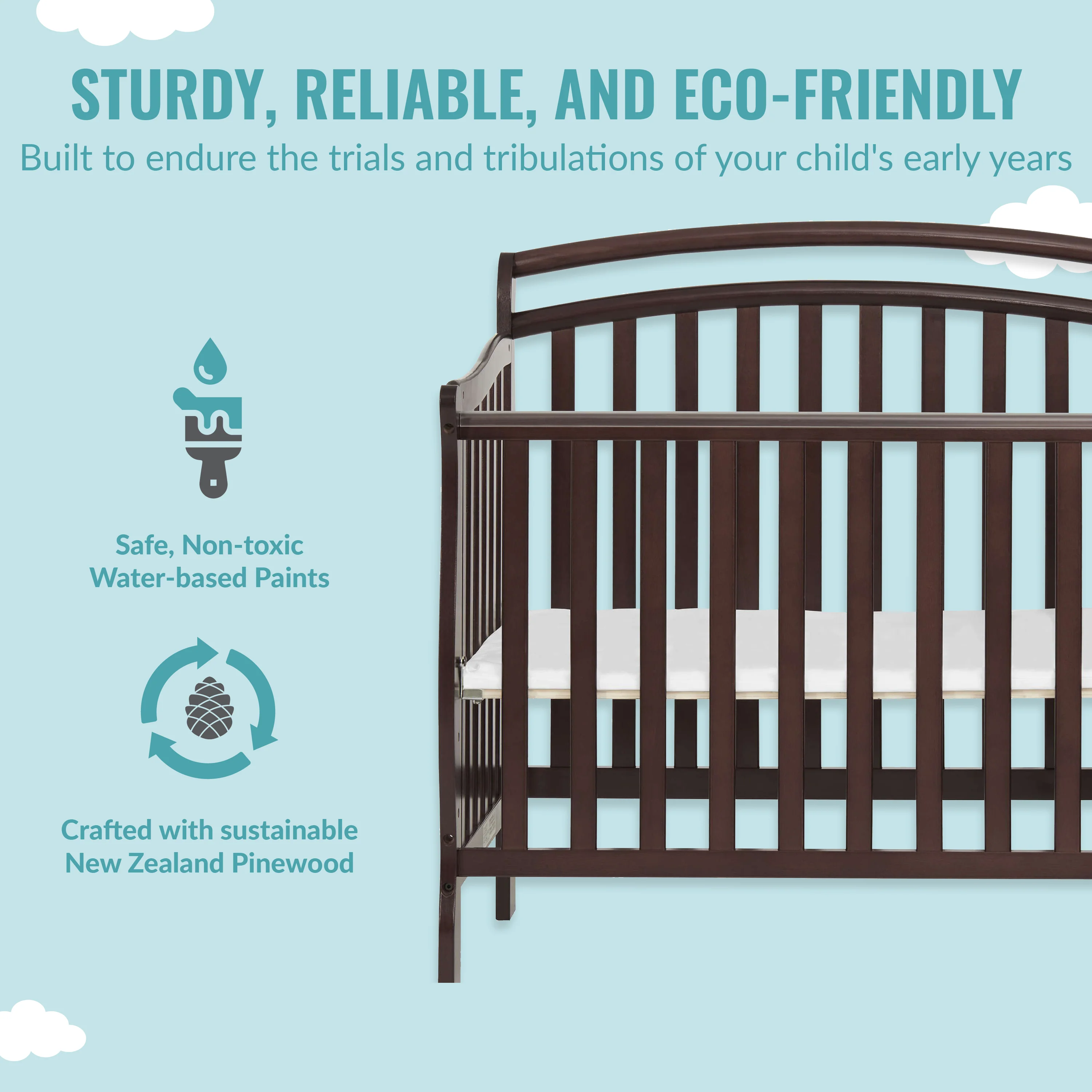 - Starting as a mini crib, the Casco converts into a mini daybed and twin-size bed (bed rails sold separately). Its compact size makes it ideal for small nurseries.