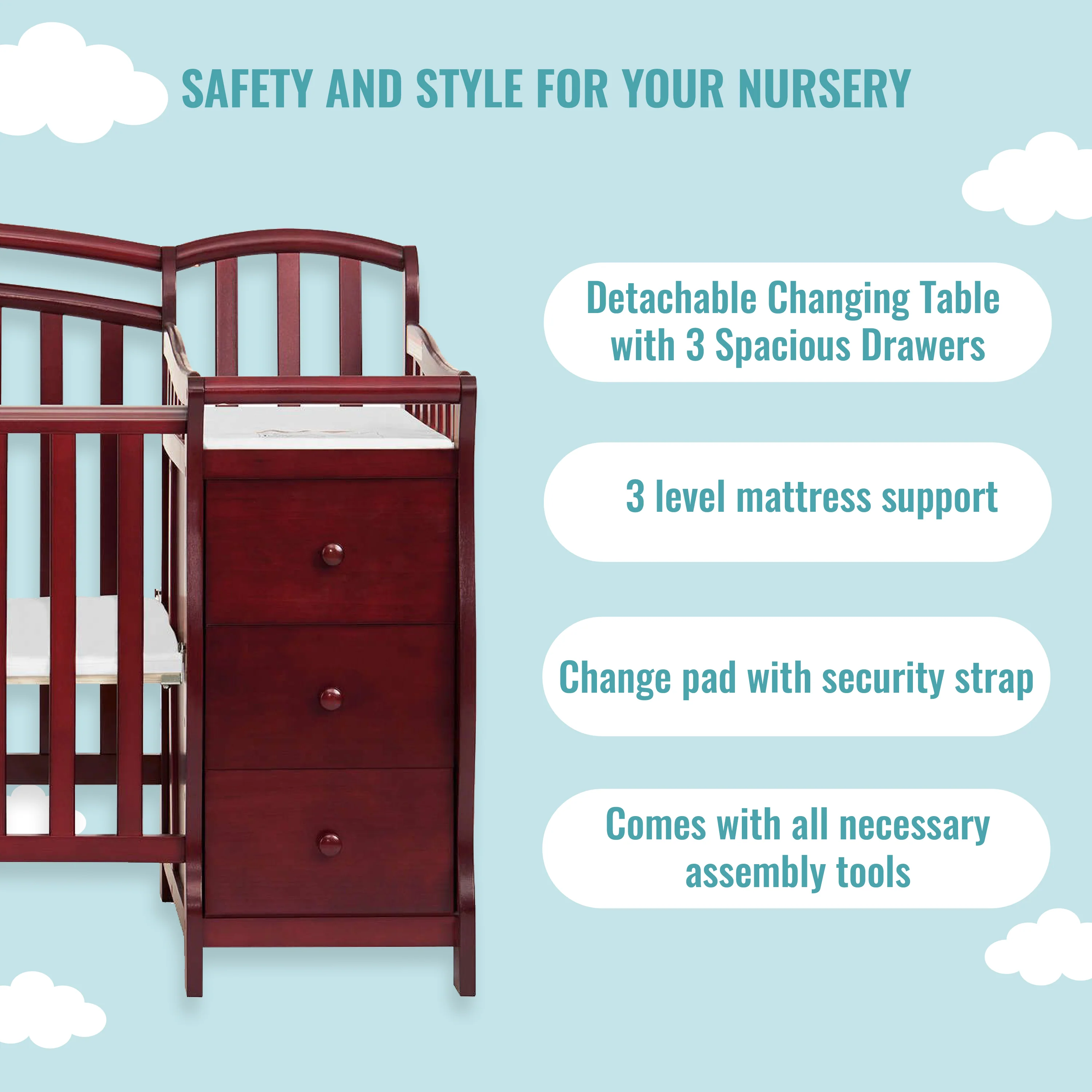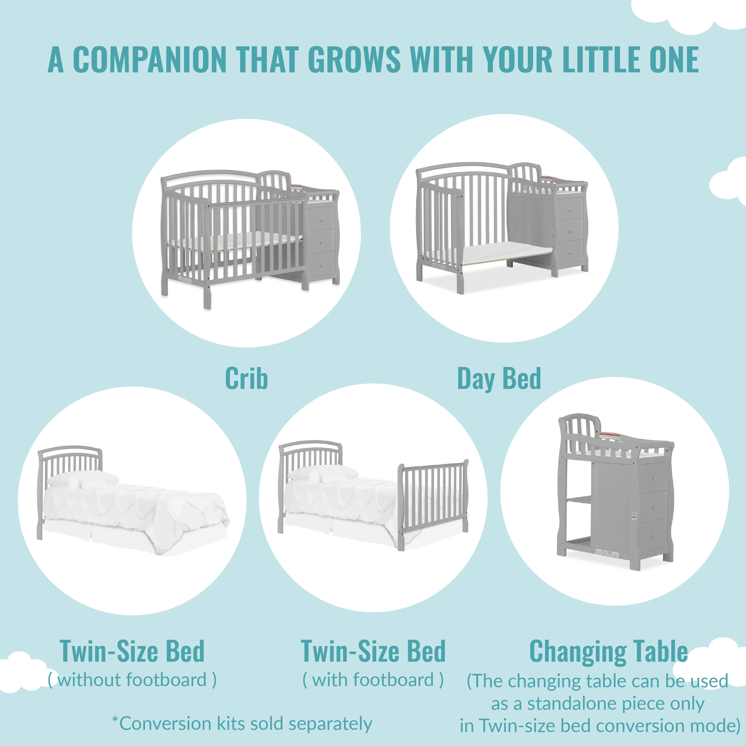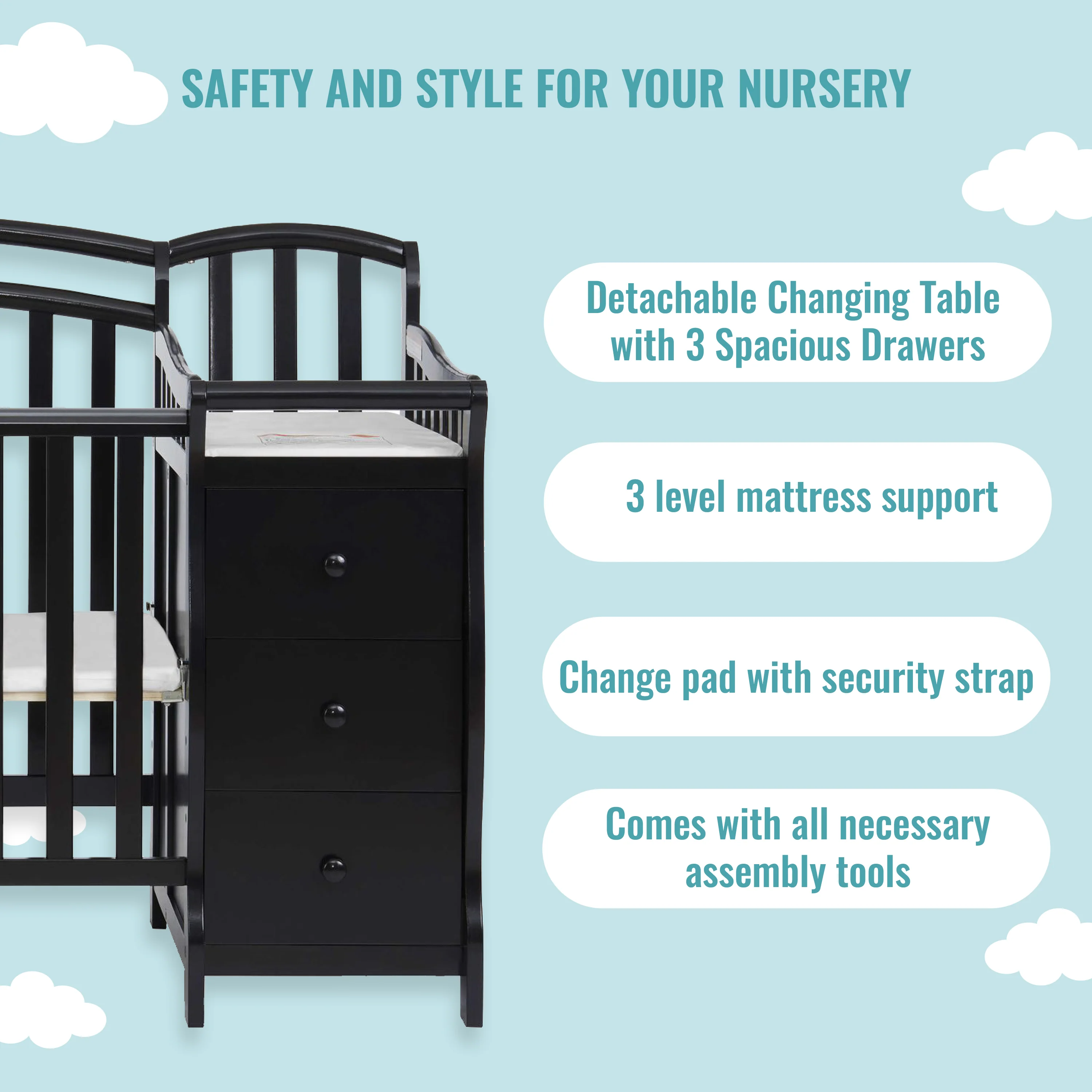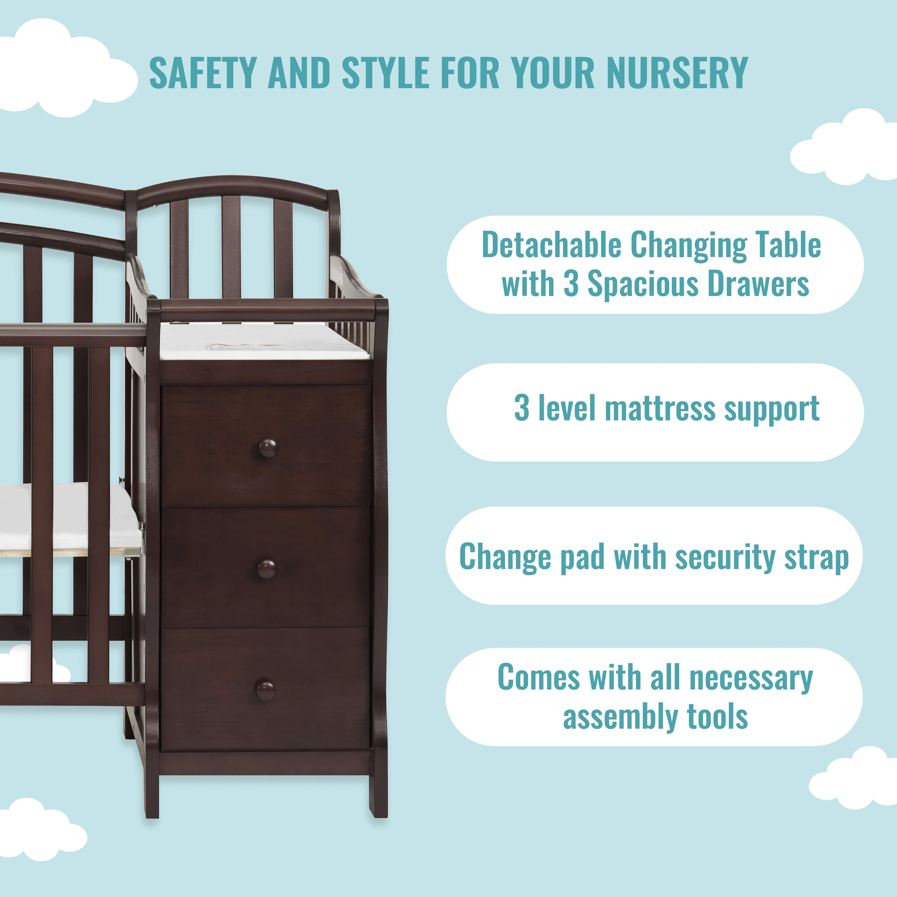 - The Casco comes with a 3-drawer changing table, changing pad & a security strap to keep your baby secured. The changing table can be used as a standalone piece only in twin bed conversion mode.