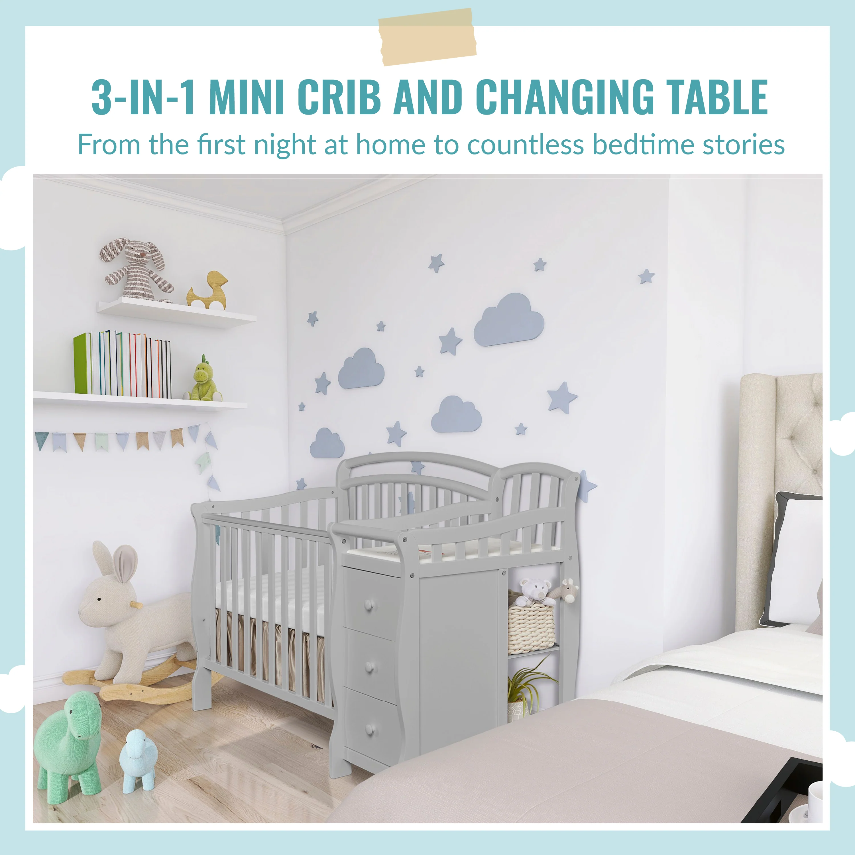 The Dream On Me Casco 4-in-1 Mini Crib & Dressing Table Combo marries style with functionality.