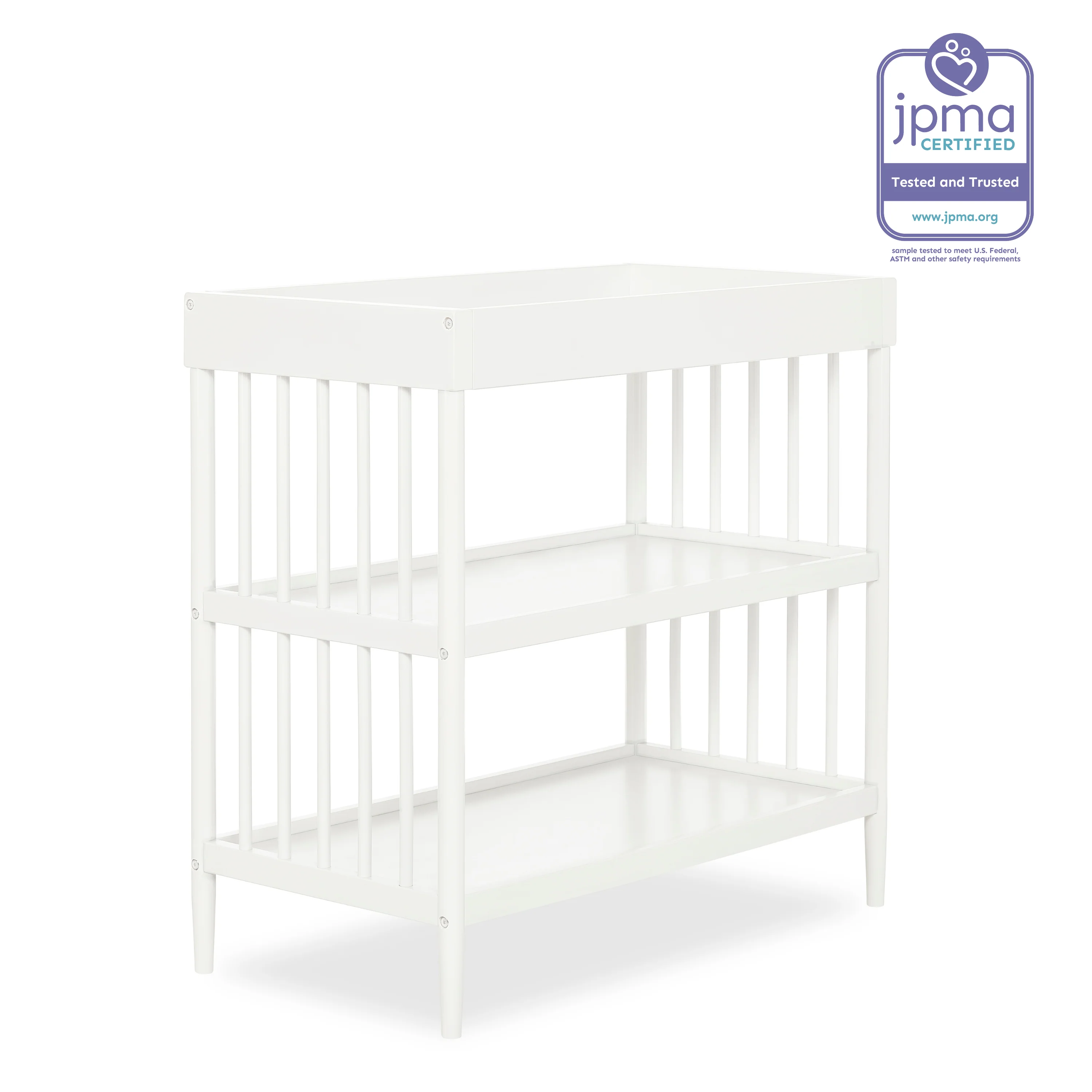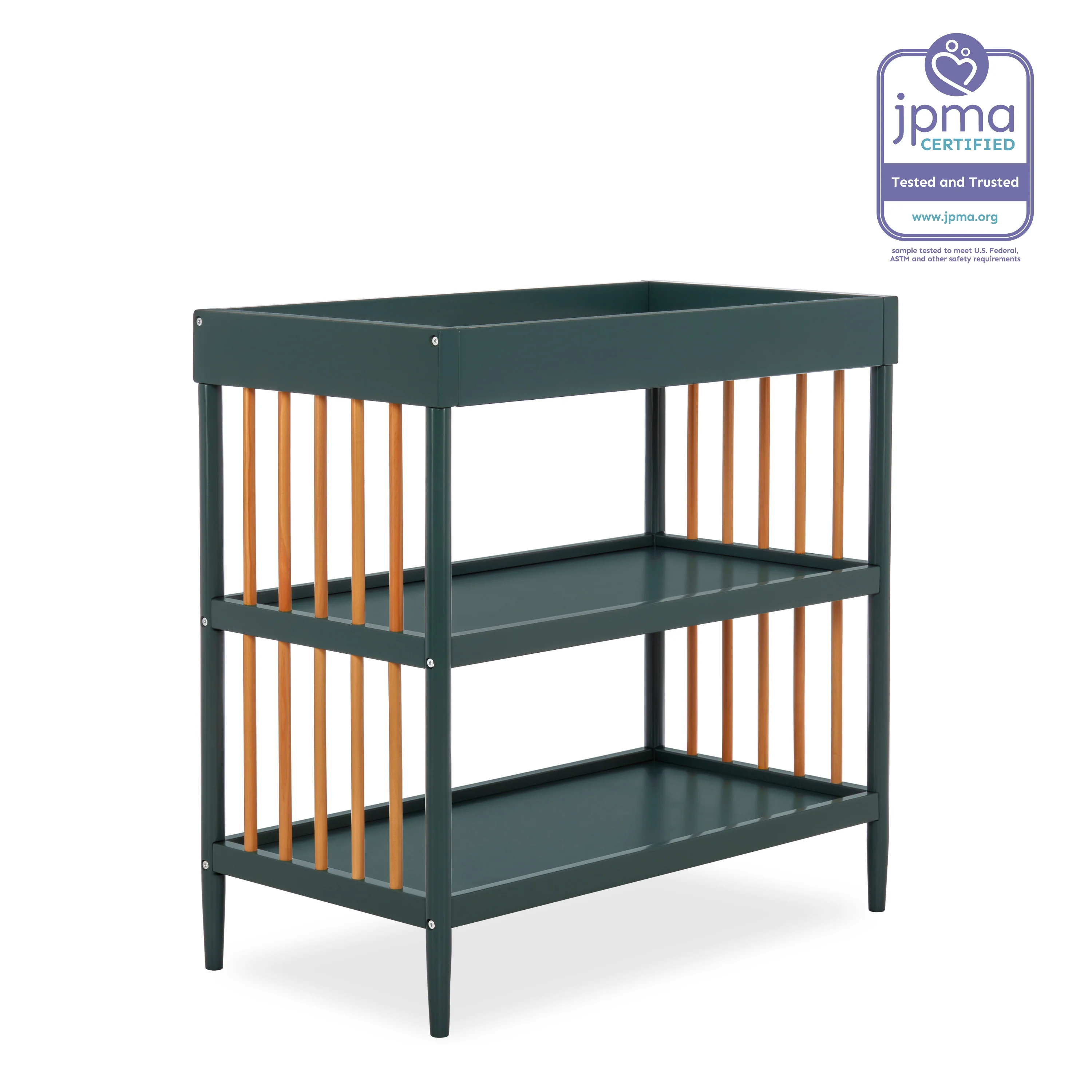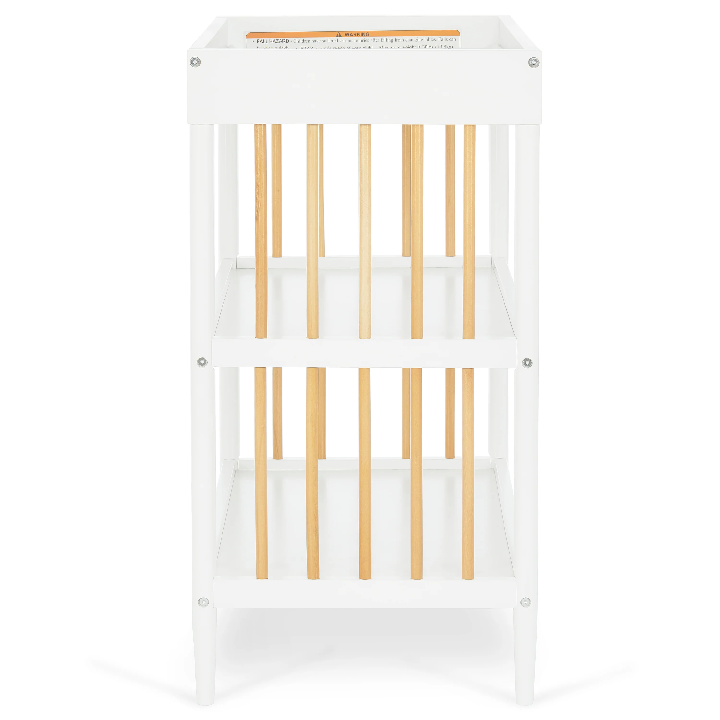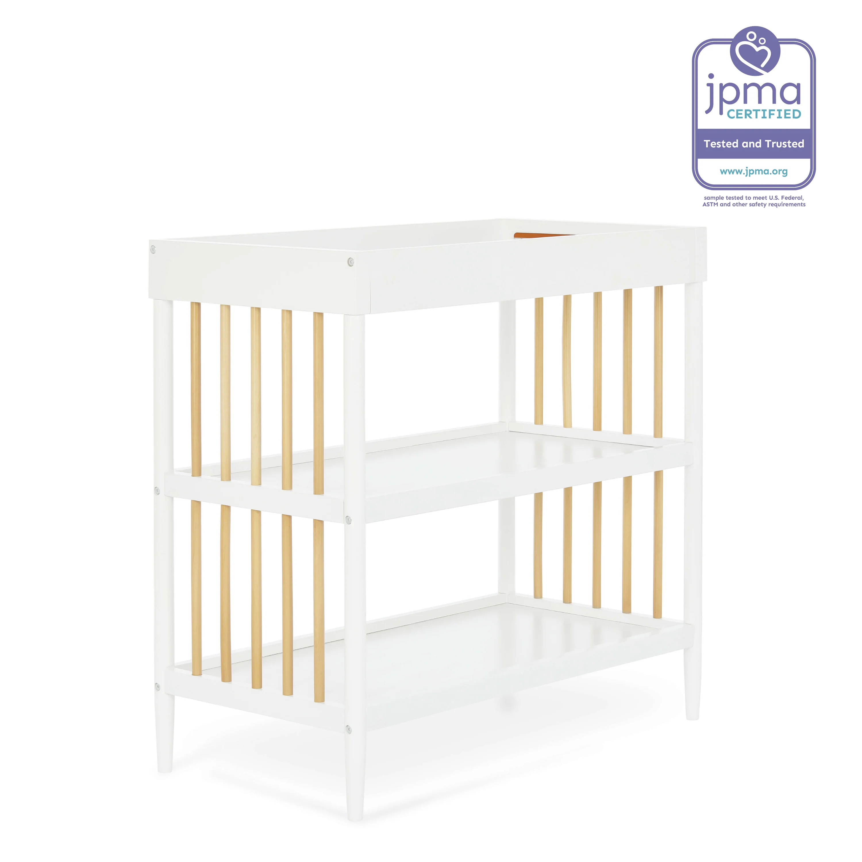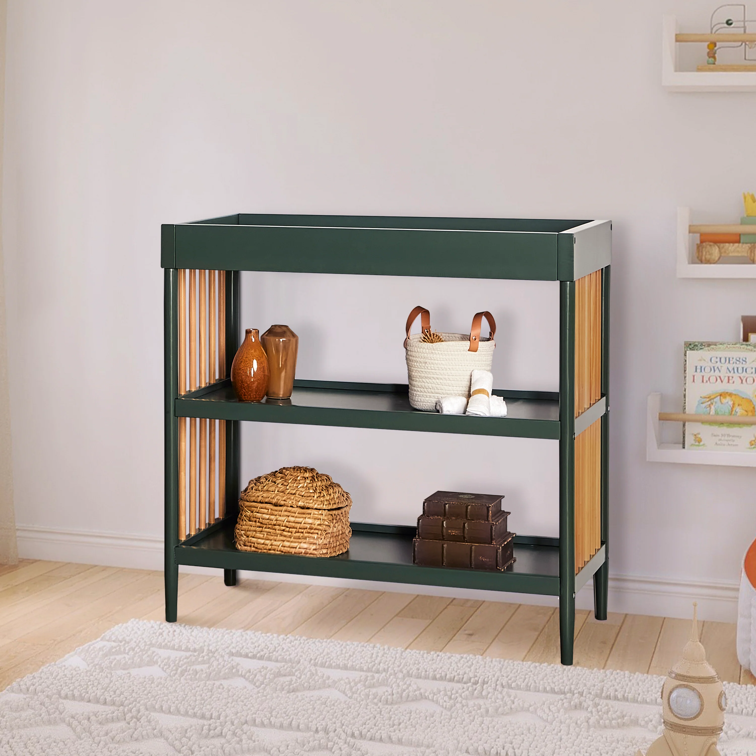 - Keeps your child’s essentials neatly organized and easily accessible in the two easy-to-reach, spacious shelves below the changing table.