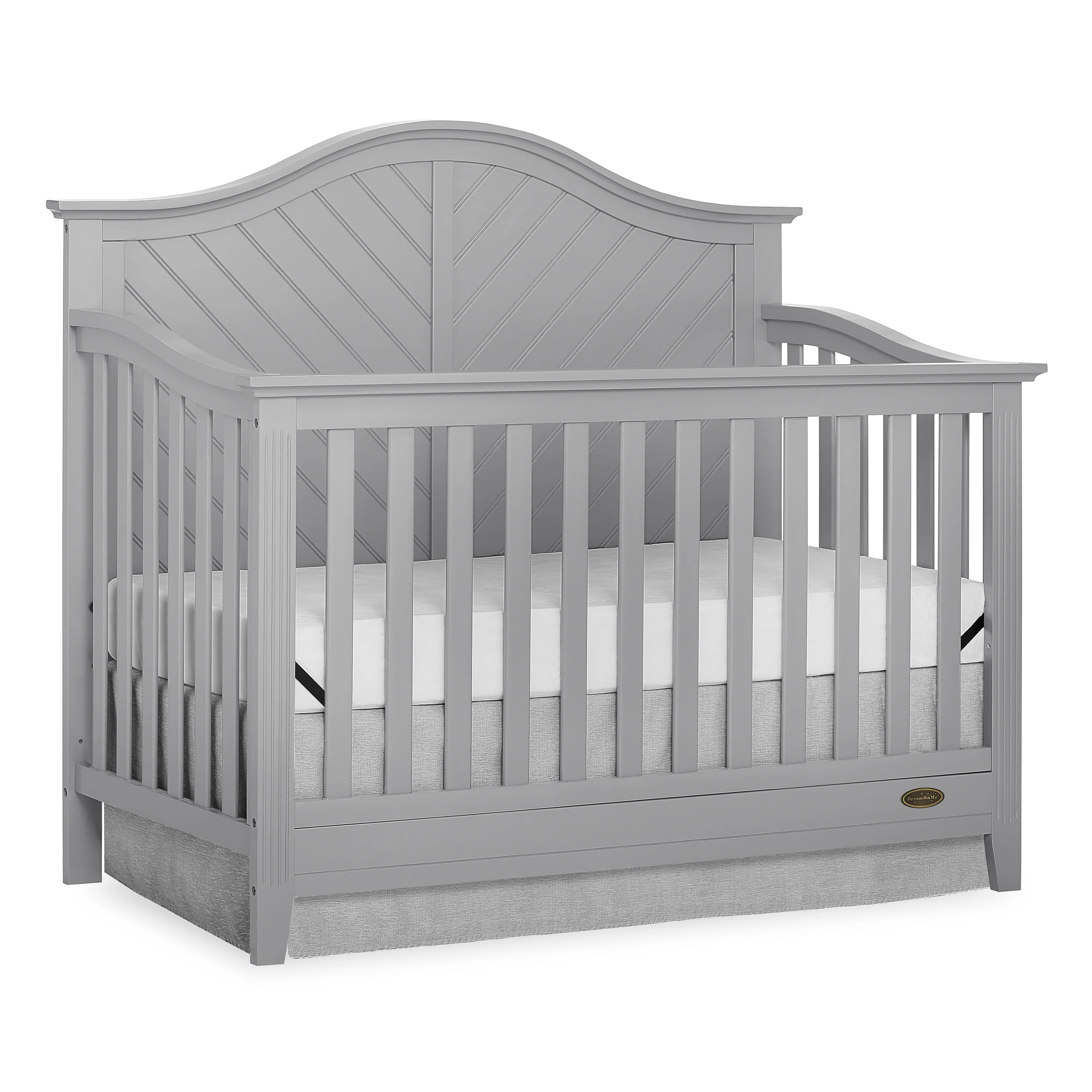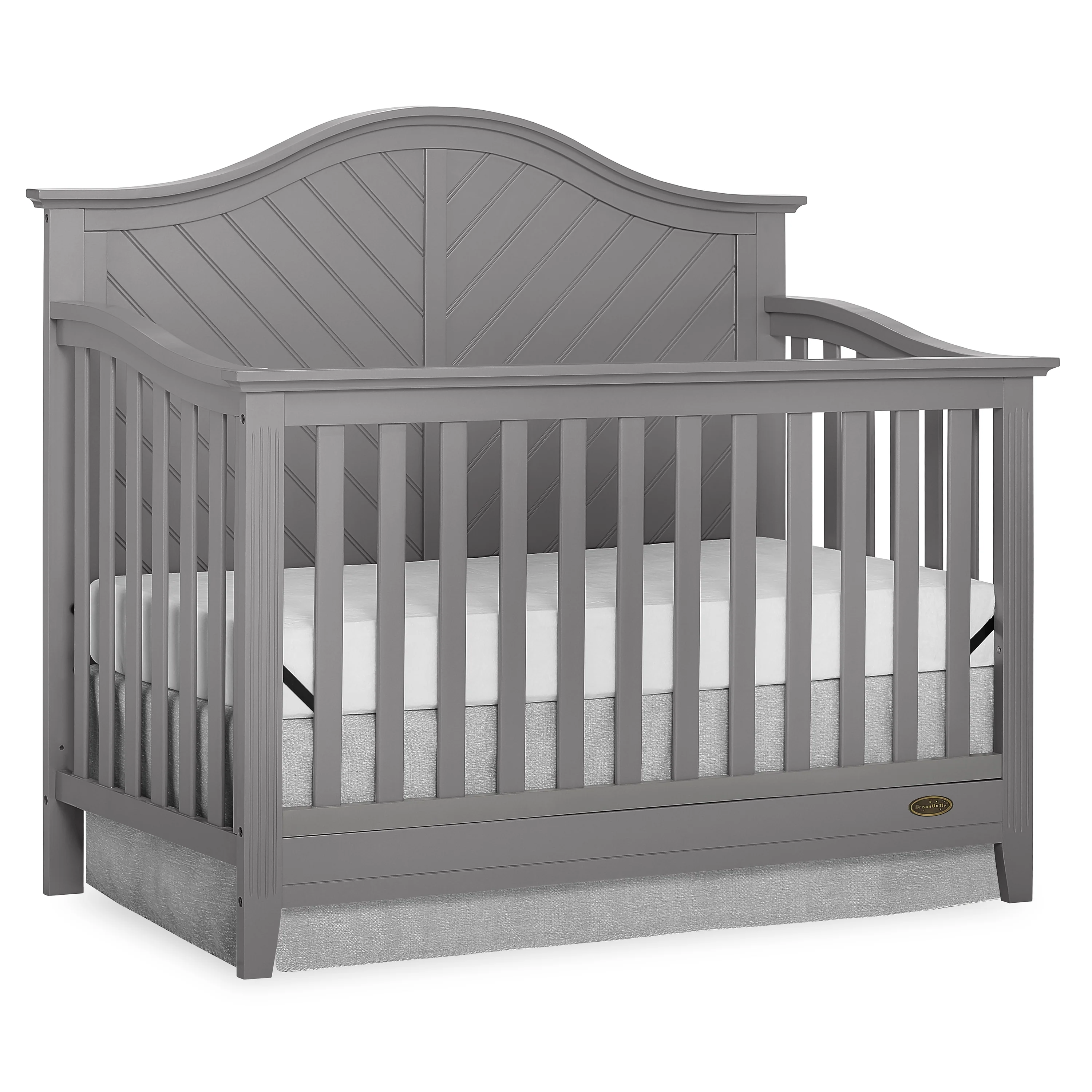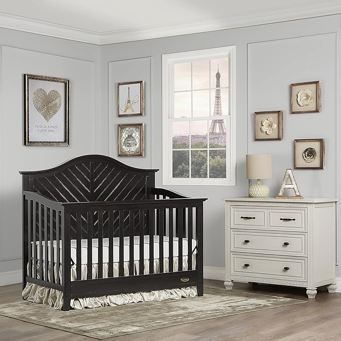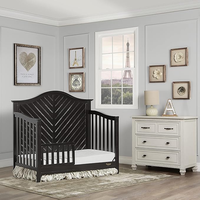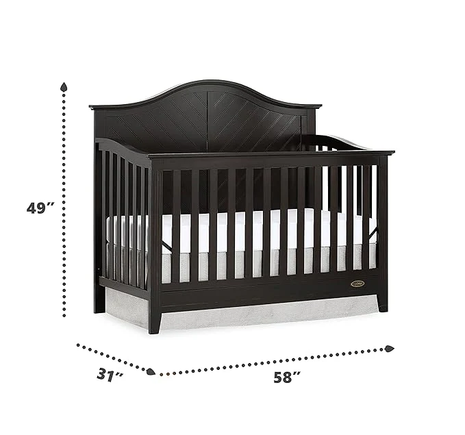 Dream On Me Ella 5 in 1 Convertible Crib offers a timeless silhouette with its bell-shaped full panel headboard and its oblique inset design . This crib grows with your child by converting into a charming toddler bed with our conversion kit ( sold separately ), daybed and theback panel converts to a full-size headboard with the simple addition of a bed frame ( sold separately). This crib is construct from New Zealand pine with a steel mattress platform which adjust tofour different heights depending on the age of your baby. All Dream On Me cribs goes through rigorous testing to ensure it meets all applicable ASTM, JPMA and CPSC standards. The Ella crib fits any décor from you baby nursery to your growing child’s bedroom.