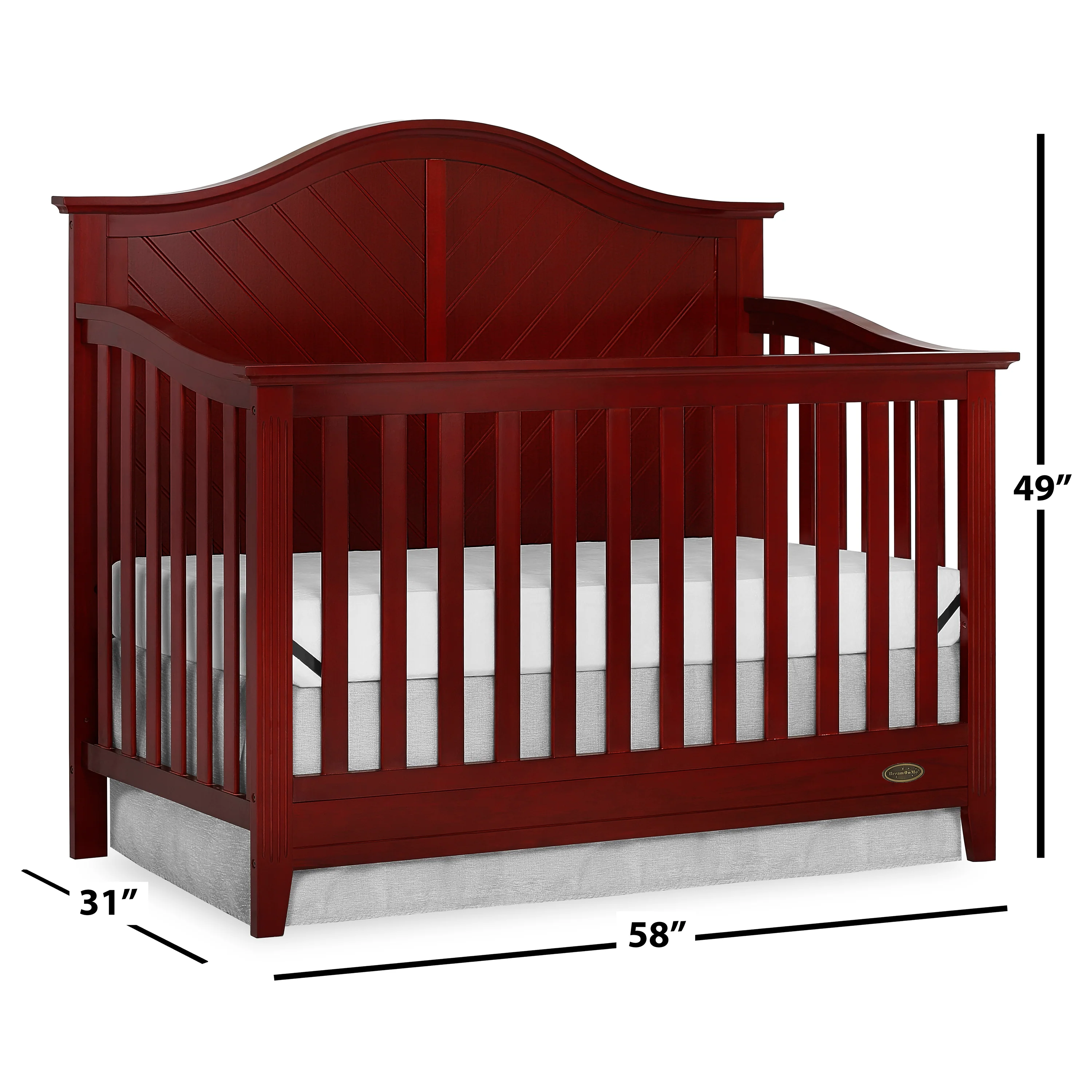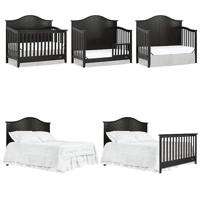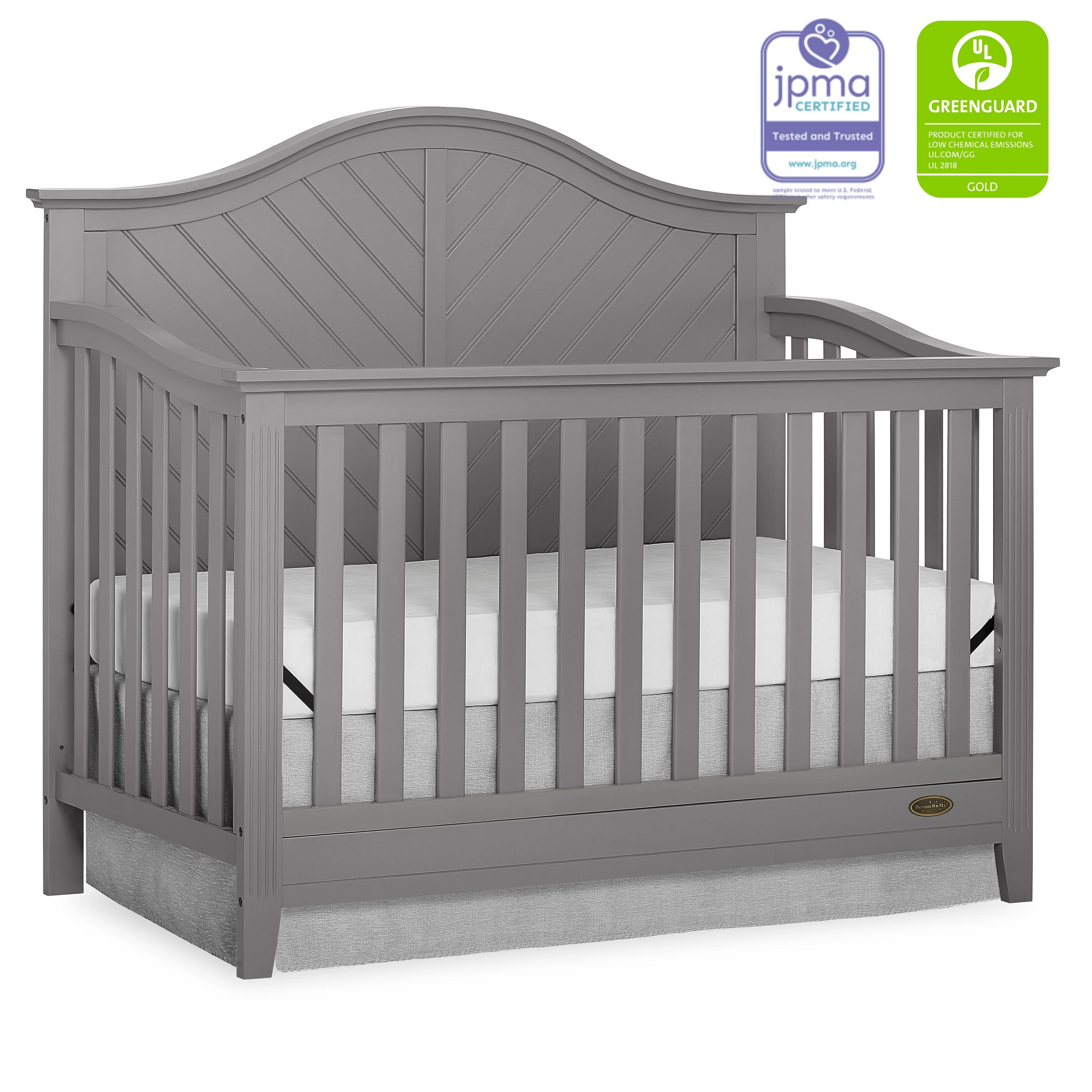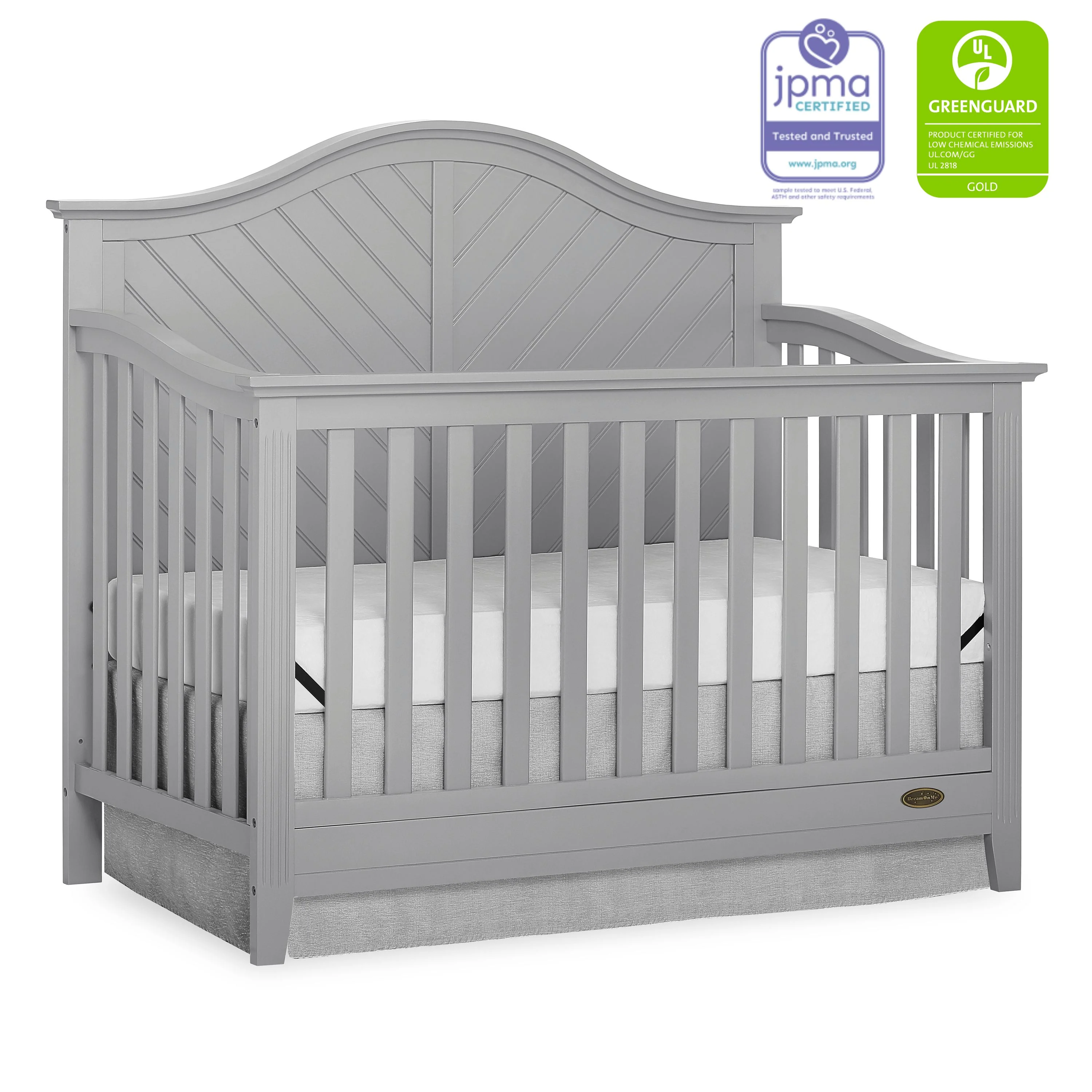 Dream On Me Ella 5 in 1 Convertible Crib offers a timeless silhouette with its bell-shaped full panel headboard and its oblique inset design . This crib grows with your child by converting into a charming toddler bed with our conversion kit ( sold separately ), daybed and theback panel converts to a full-size headboard with the simple addition of a bed frame ( sold separately). This crib is construct from New Zealand pine with a steel mattress platform which adjust tofour different heights depending on the age of your baby. All Dream On Me cribs goes through rigorous testing to ensure it meets all applicable ASTM, JPMA and CPSC standards. The Ella crib fits any décor from you baby nursery to your growing child’s bedroom.