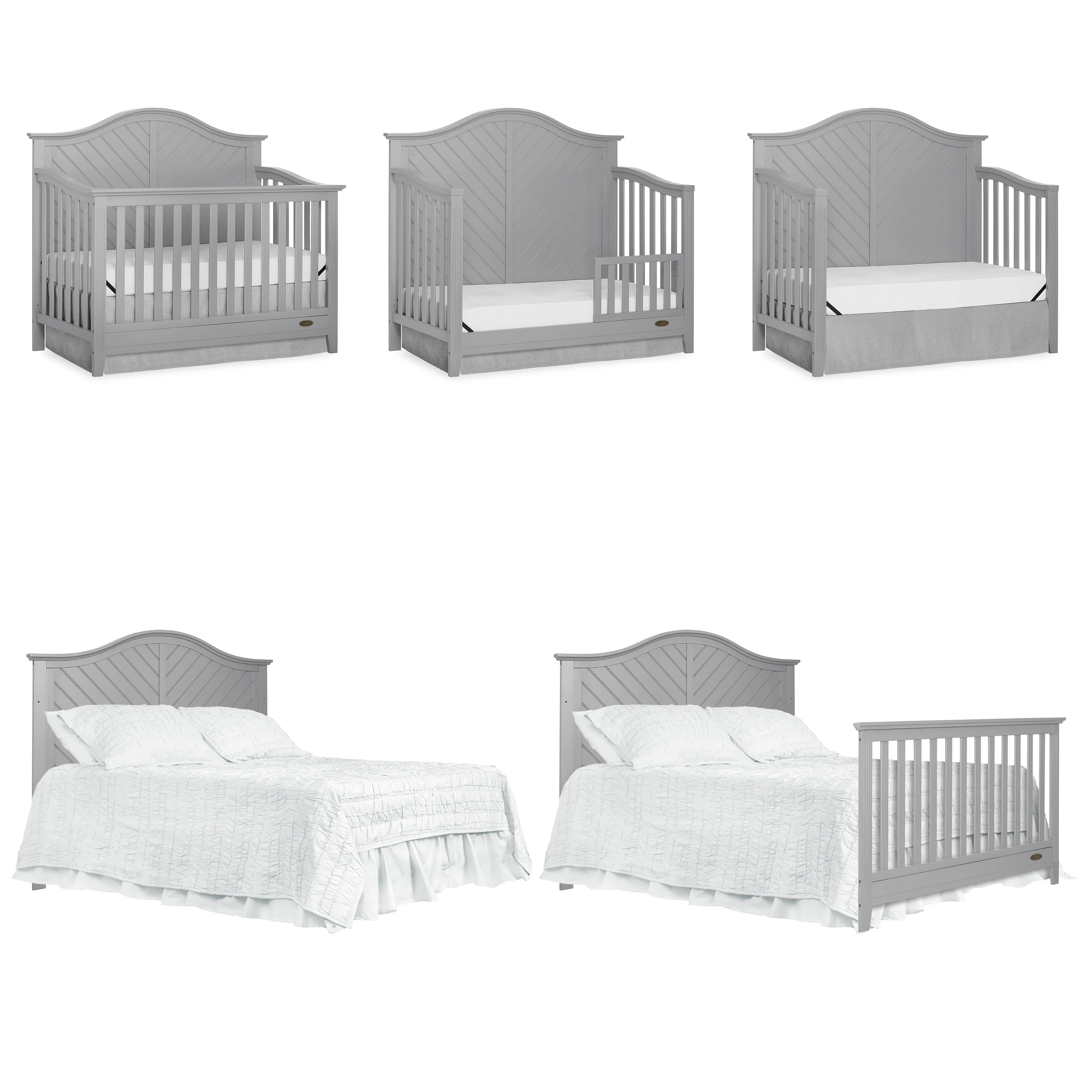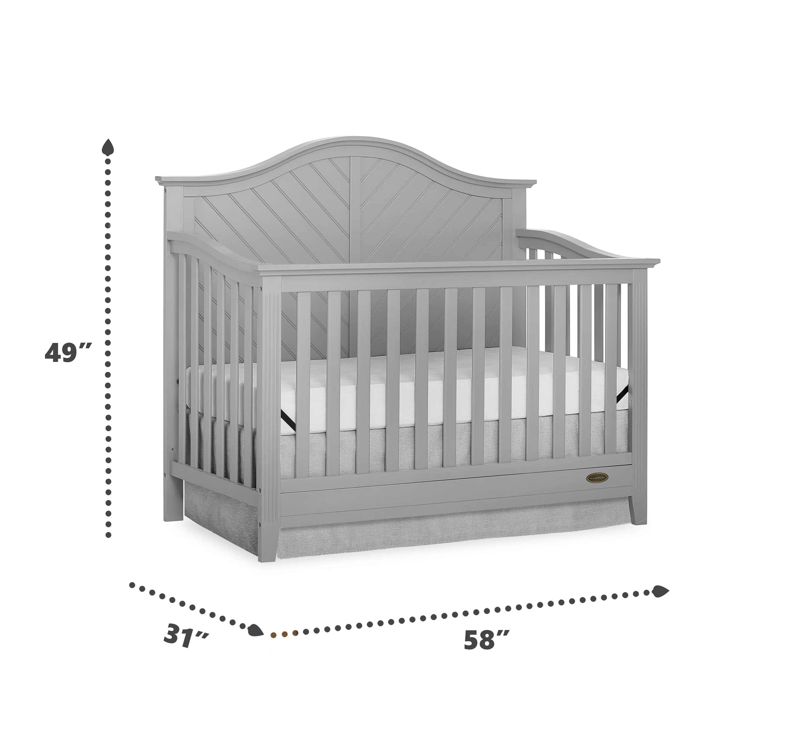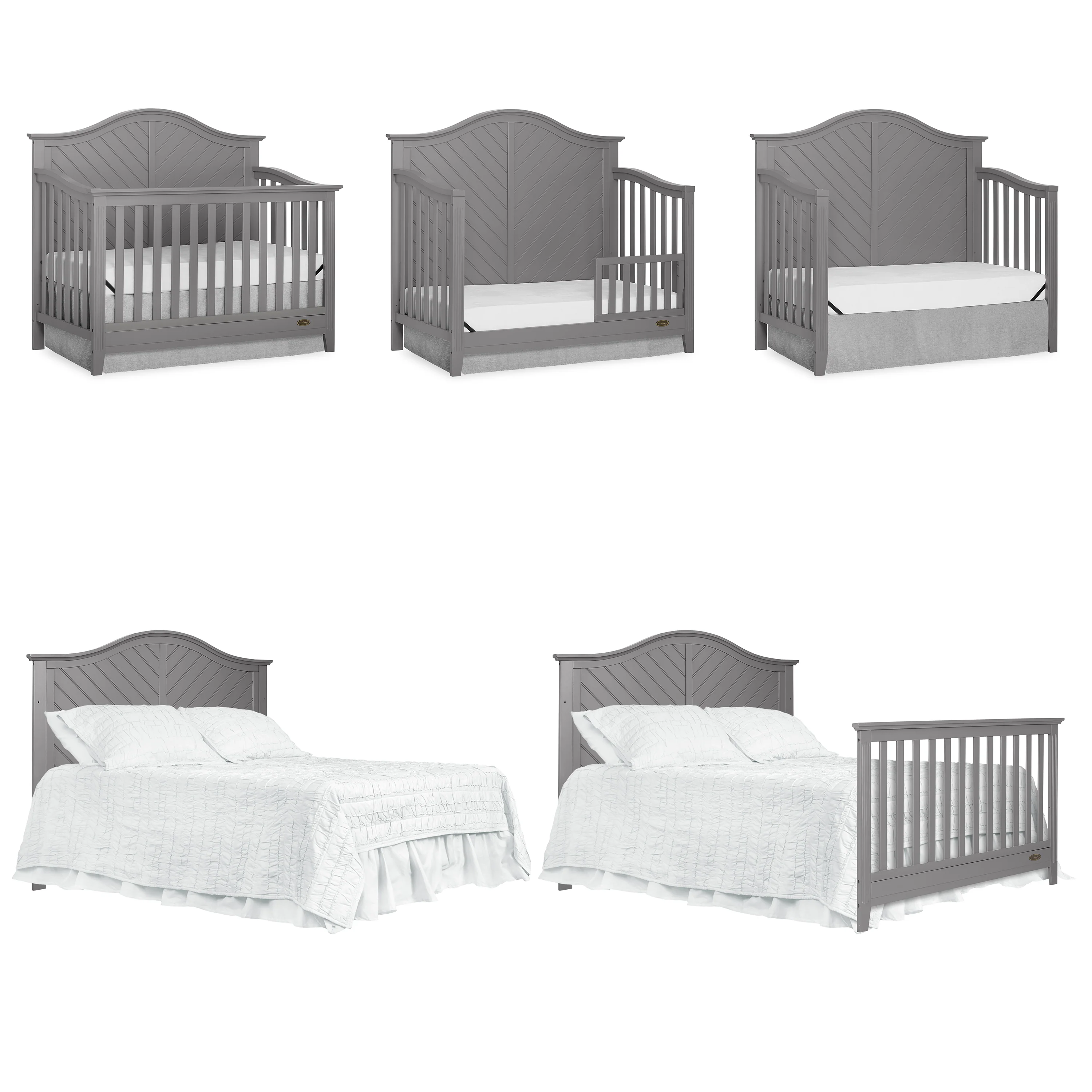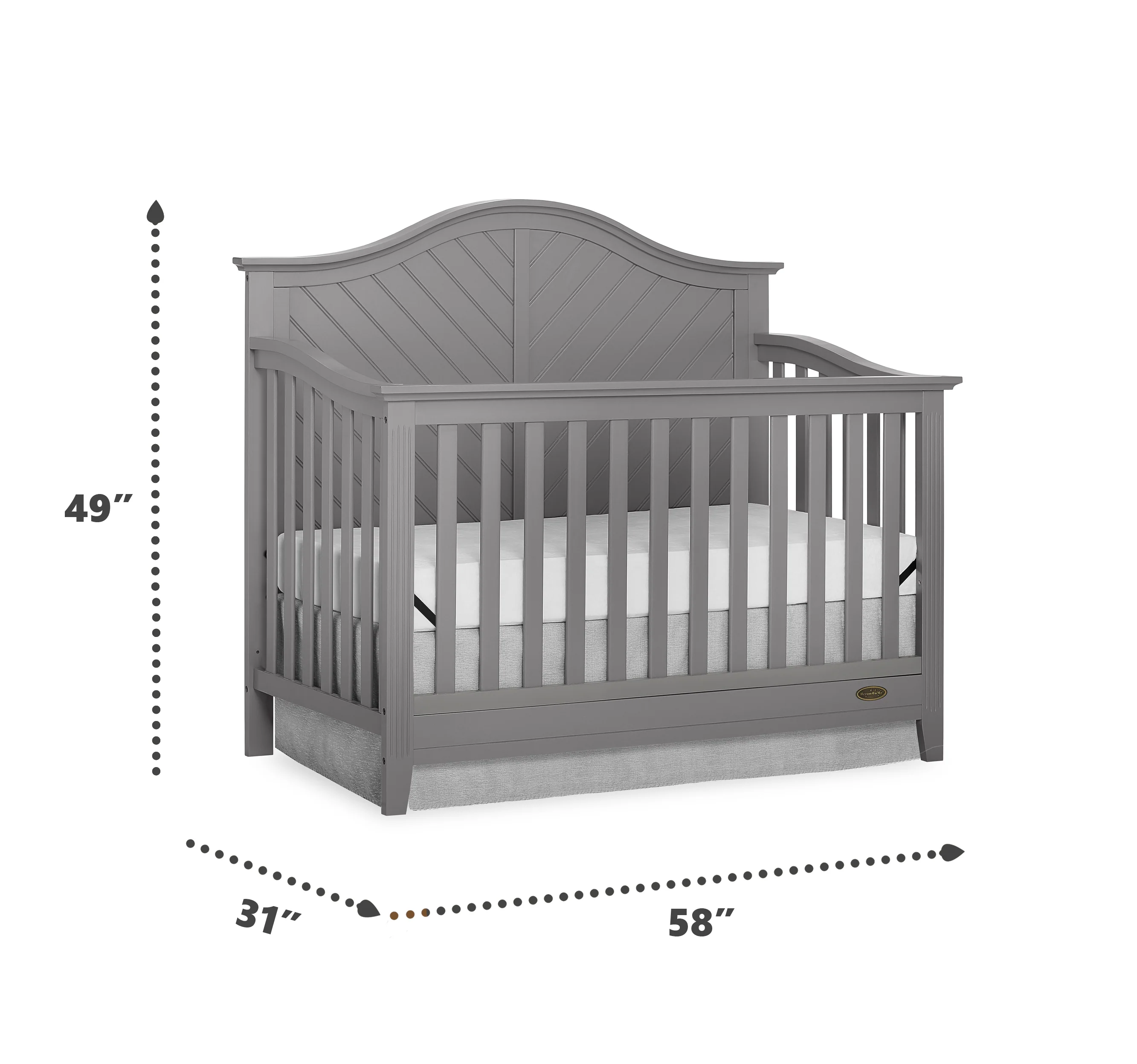 Dream On Me Ella 5 in 1 Convertible Crib offers a timeless silhouette with its bell-shaped full panel headboard and its oblique inset design . This crib grows with your child by converting into a charming toddler bed with our conversion kit ( sold separately ), daybed and theback panel converts to a full-size headboard with the simple addition of a bed frame ( sold separately). This crib is construct from New Zealand pine with a steel mattress platform which adjust tofour different heights depending on the age of your baby. All Dream On Me cribs goes through rigorous testing to ensure it meets all applicable ASTM, JPMA and CPSC standards. The Ella crib fits any décor from you baby nursery to your growing child’s bedroom.