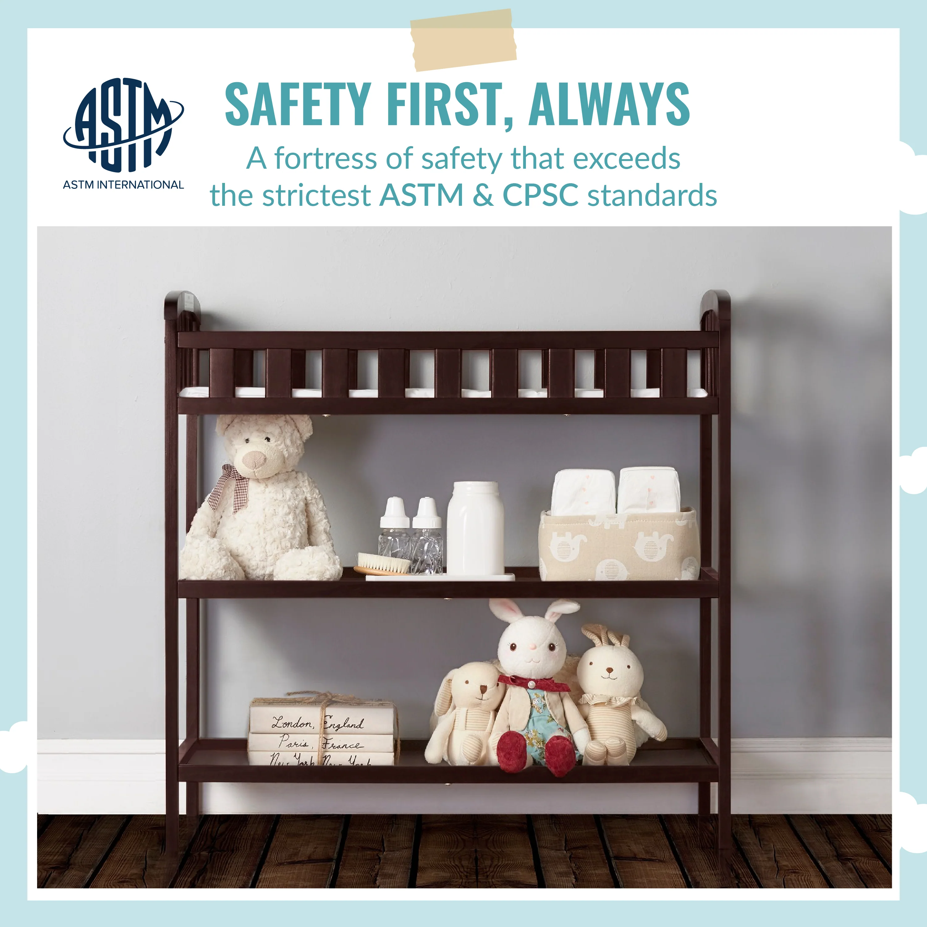 - SAFETY MATTERS: With safety rails on four sides the changing table is a fully enclosed & secure space. It is tested for lead/other toxic elements and meets applicable CPSC/ASTM standards. Weighs 19.5 lbs