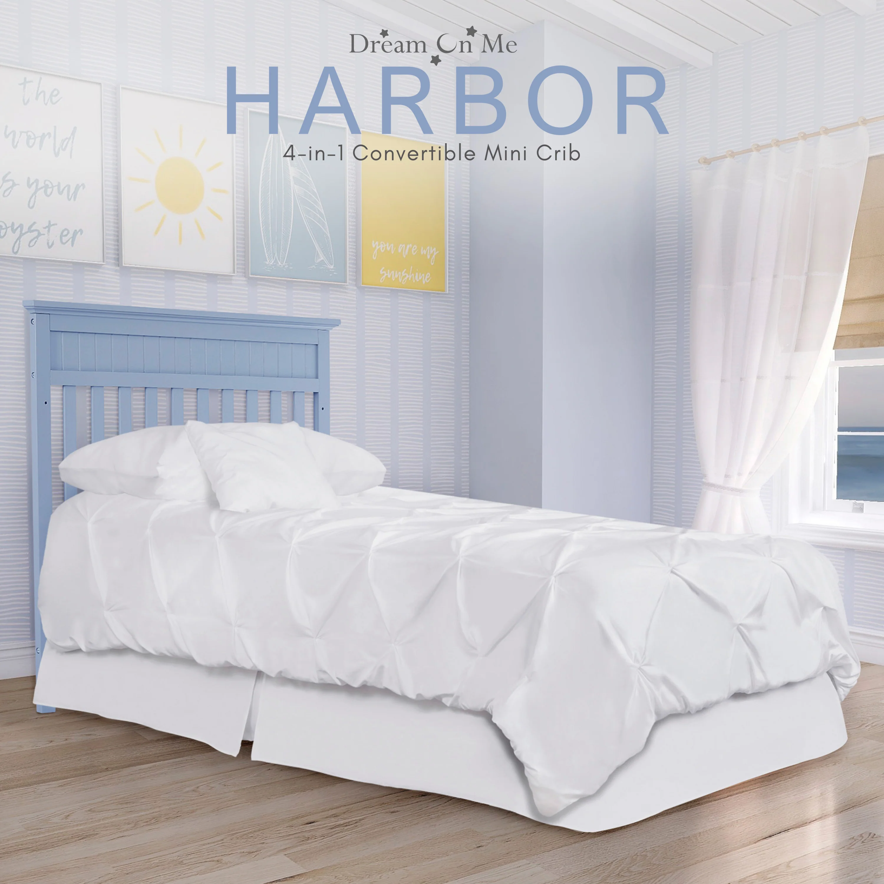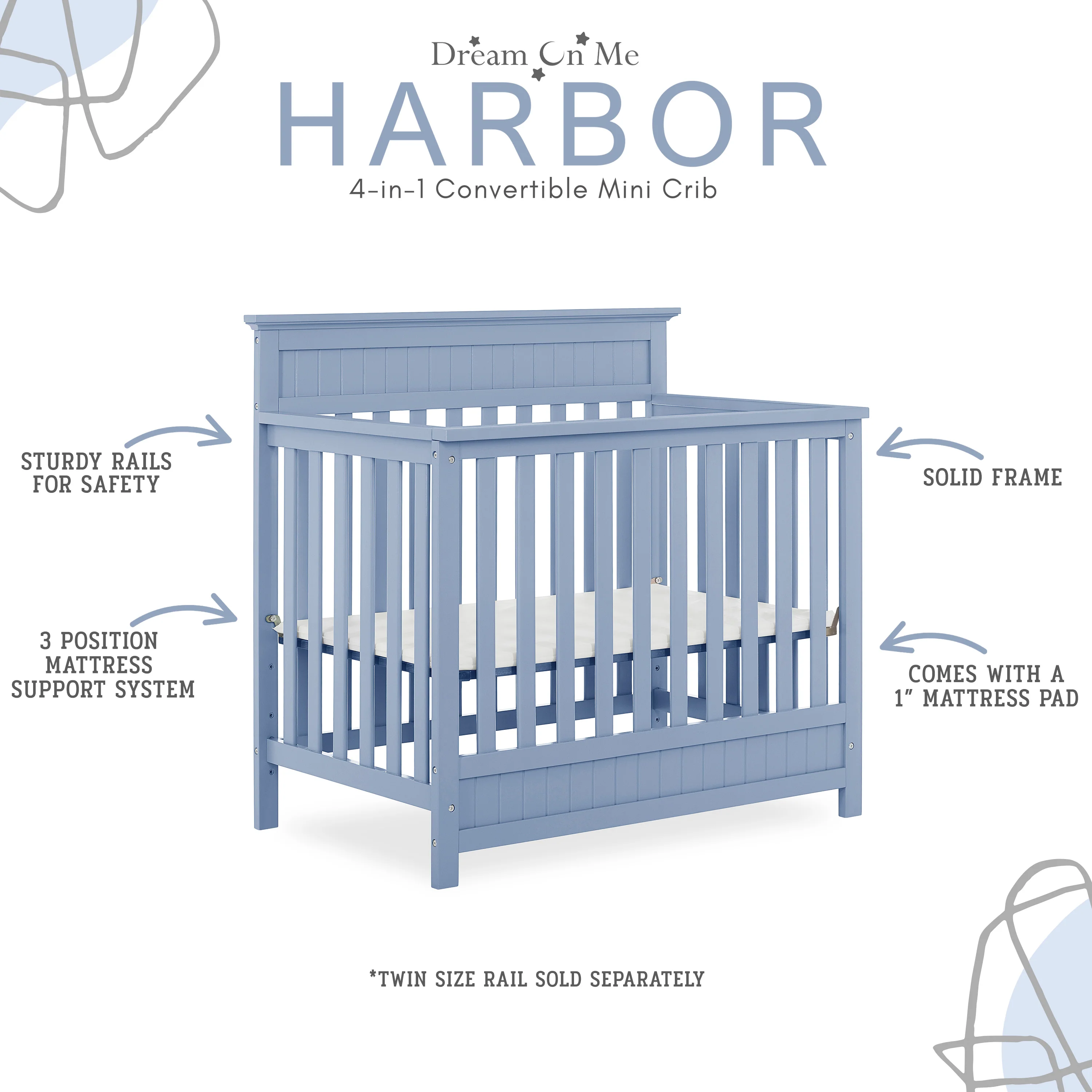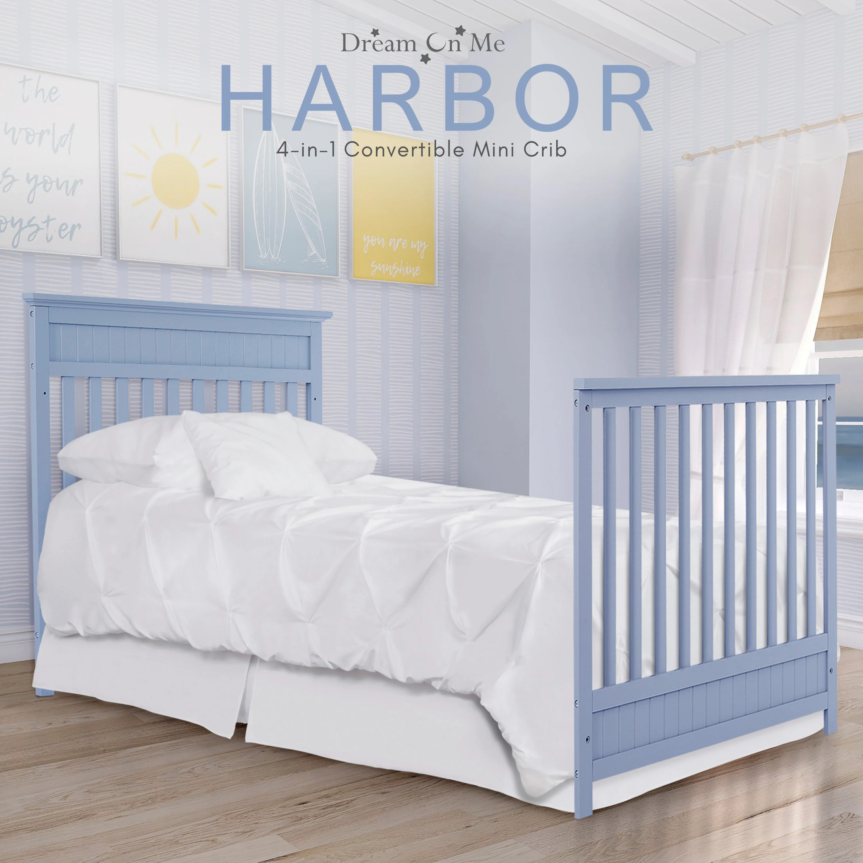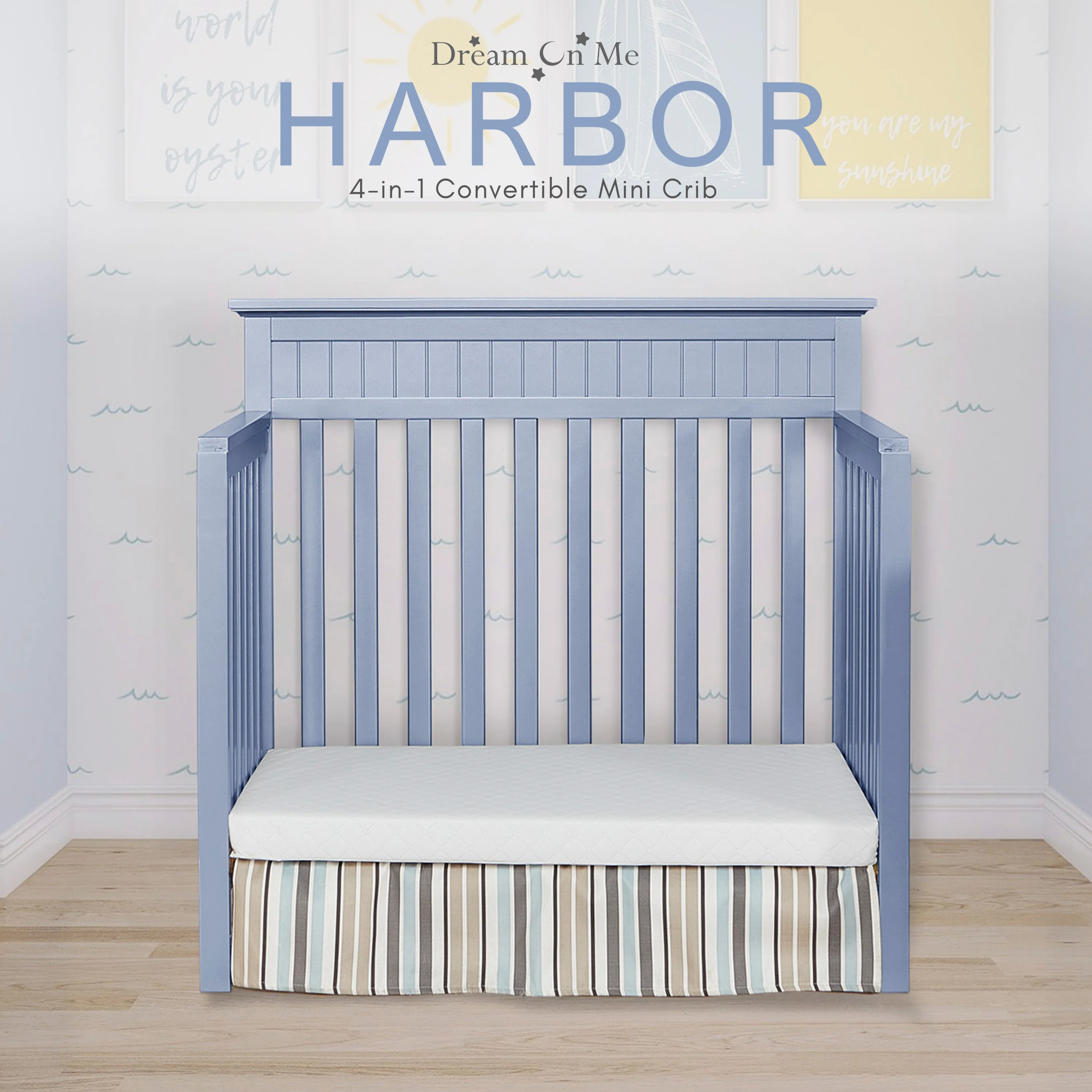 The Dream On Me Harbor Mini crib is a modern Newport style with subtle molding details on the headboard and footboard. This crib offers a long-term value converting into a charming day bed and twin size bed (twin-size bed frame and twin mattress not included). The Harbor mattress platform adjusts to three different heights depending on the age of your baby. All Dream On Me cribs meets all applicable ASTM and CPSC standards. Crib converts into a daybed and twin size bed. Twin Size Rail sold separately. Bed frame , Bedding and Mattress not included. Create a breezy nursery with palettes of coastal blues, textured wood finishes and accessories that reflects a summer day at sea