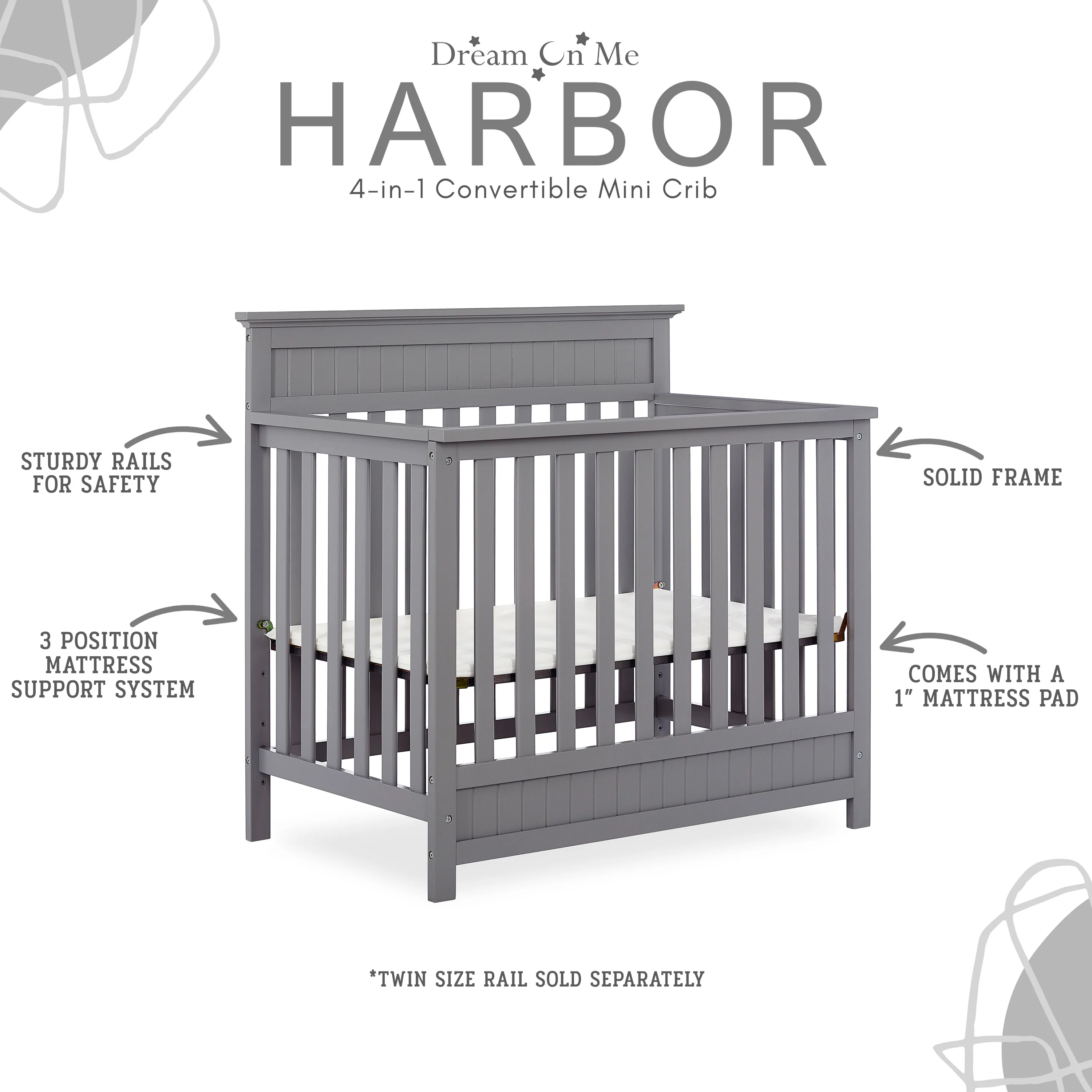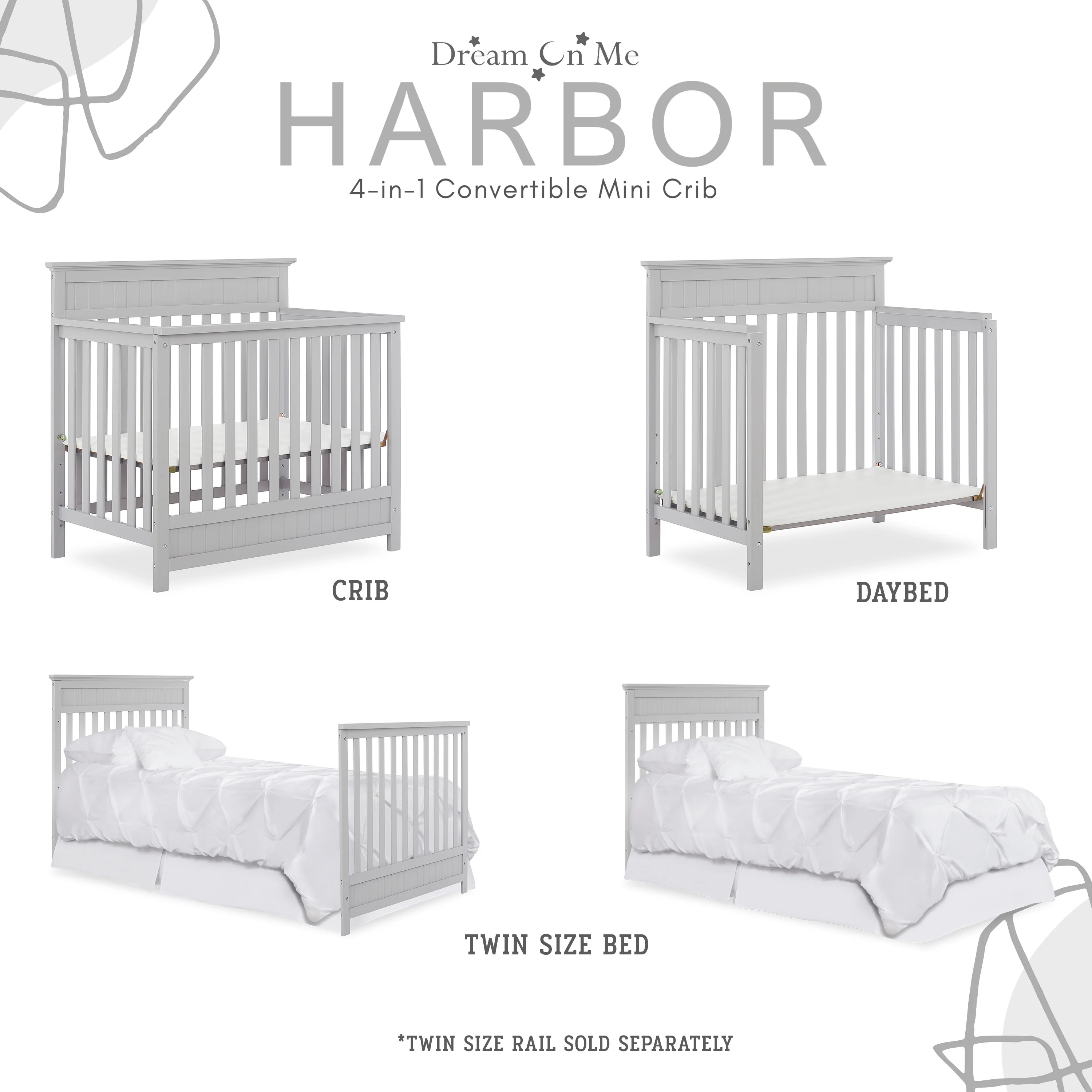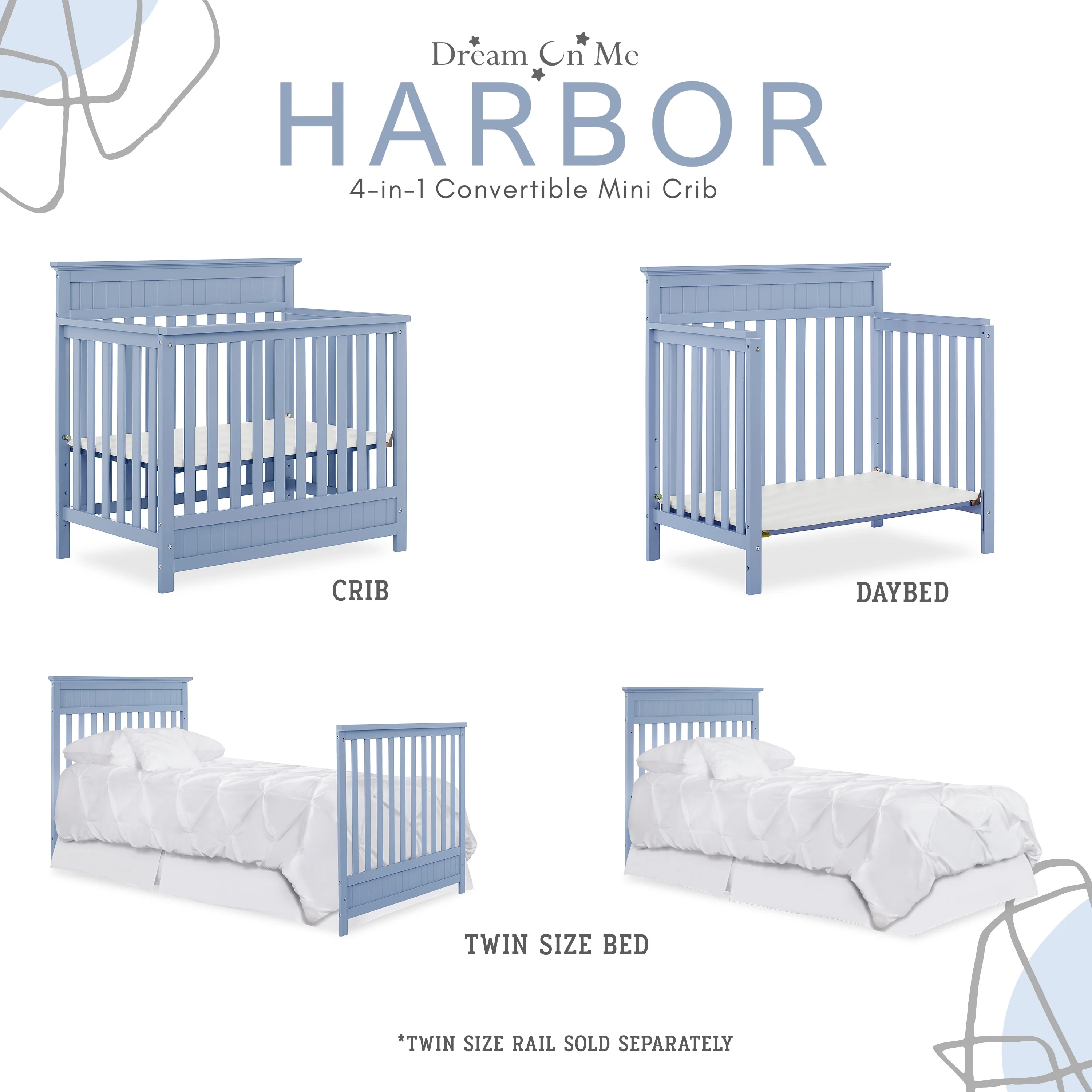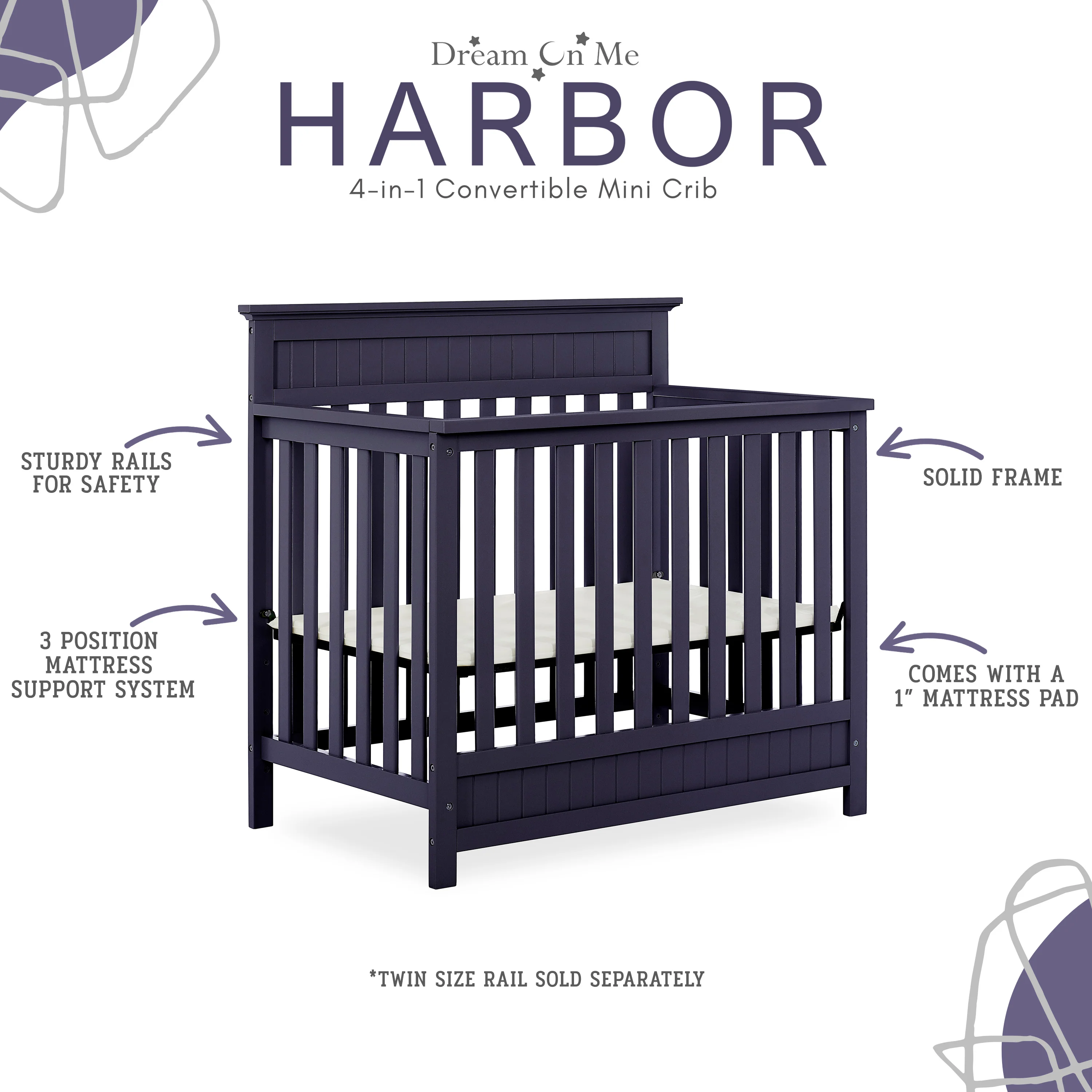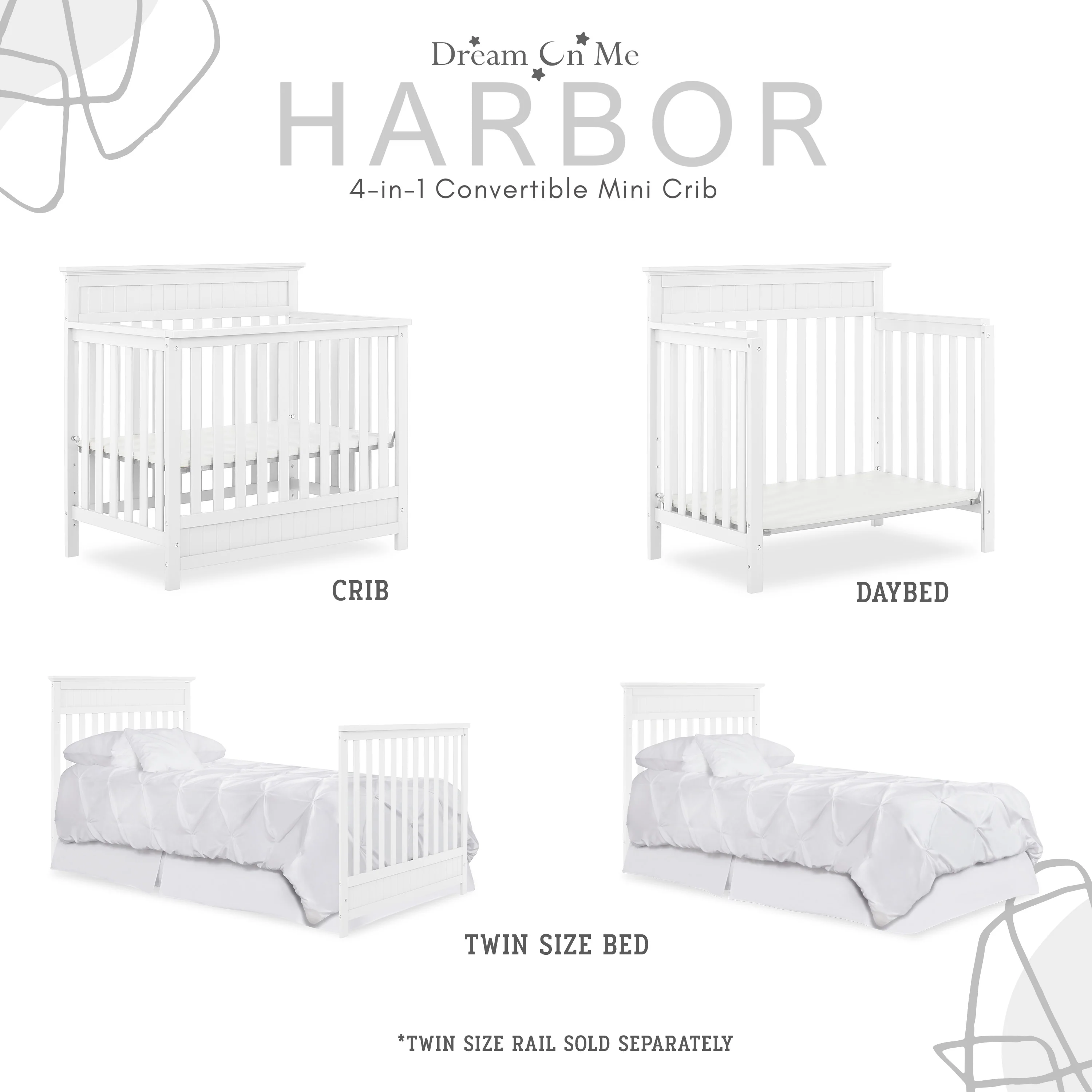 - CONVERTIBILITY OPTIONS: The Harbor 4-in-1 Convertible Mini Crib is a convenient way to keep pace with your child’s changing needs. Use it as a crib; as your baby grows, convert it into a mini daybed and twin-size bed (bed rails and frame sold separately)