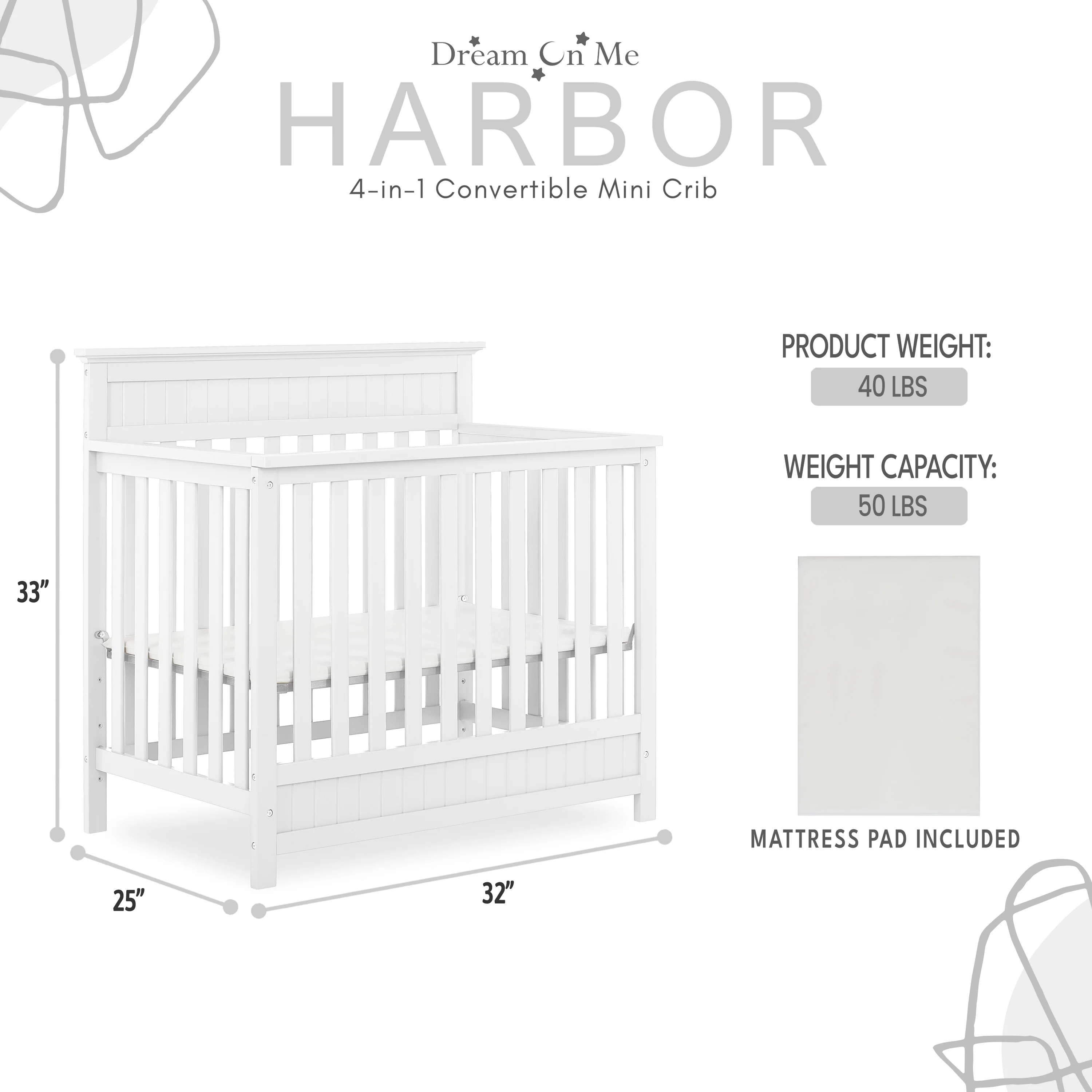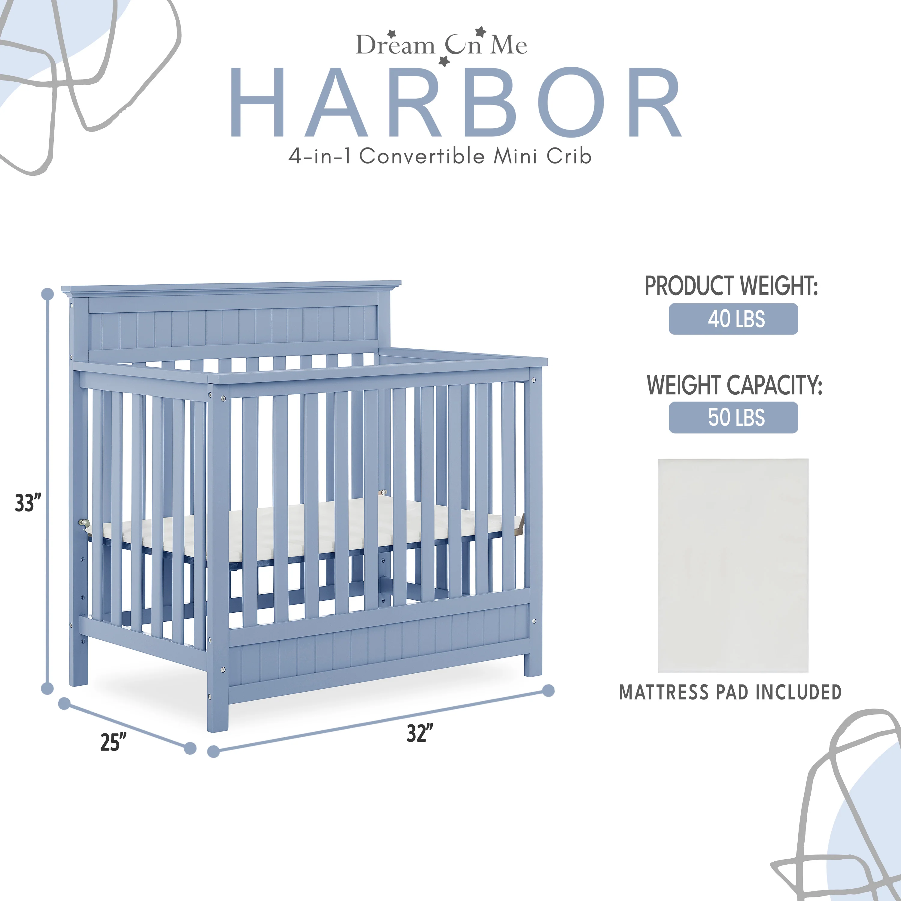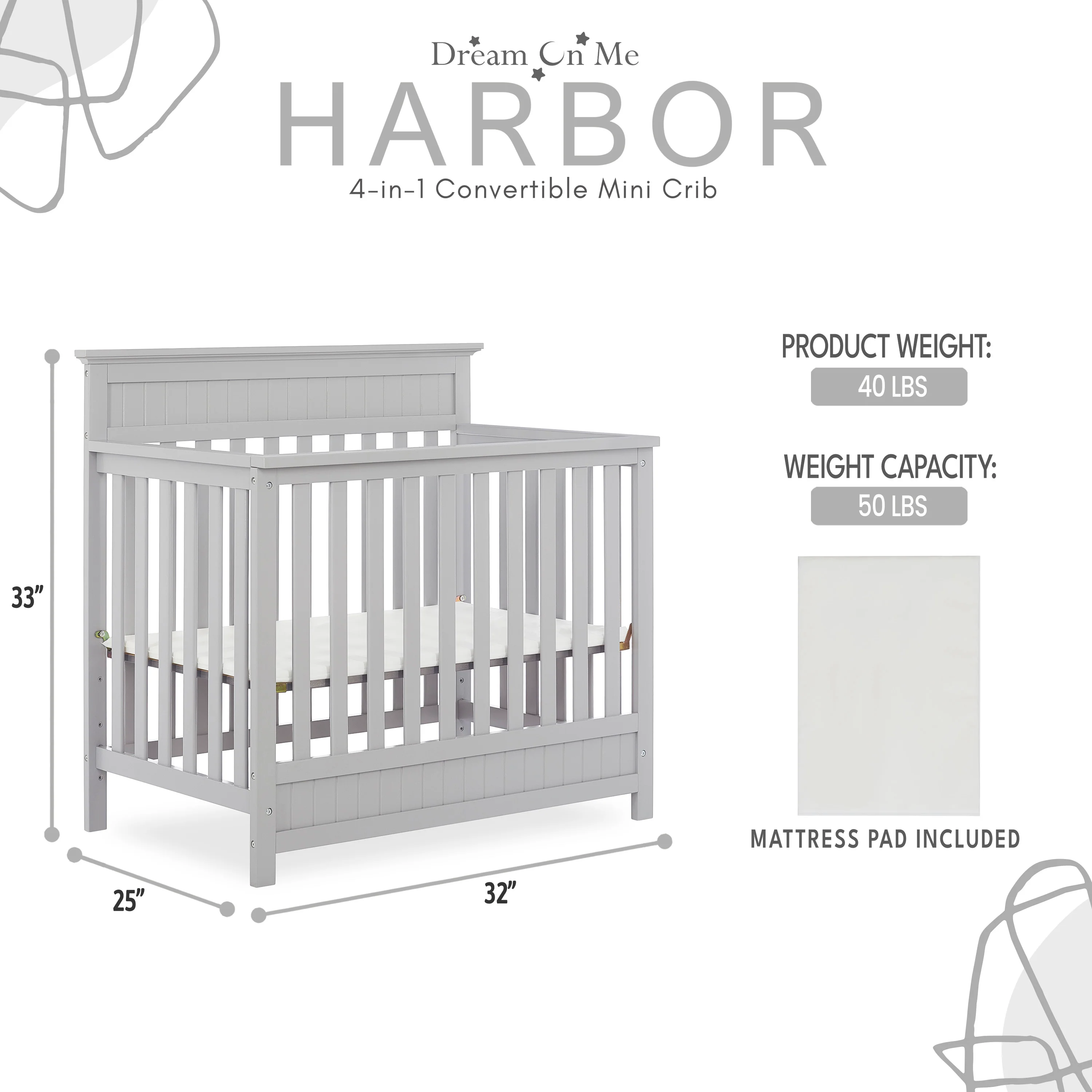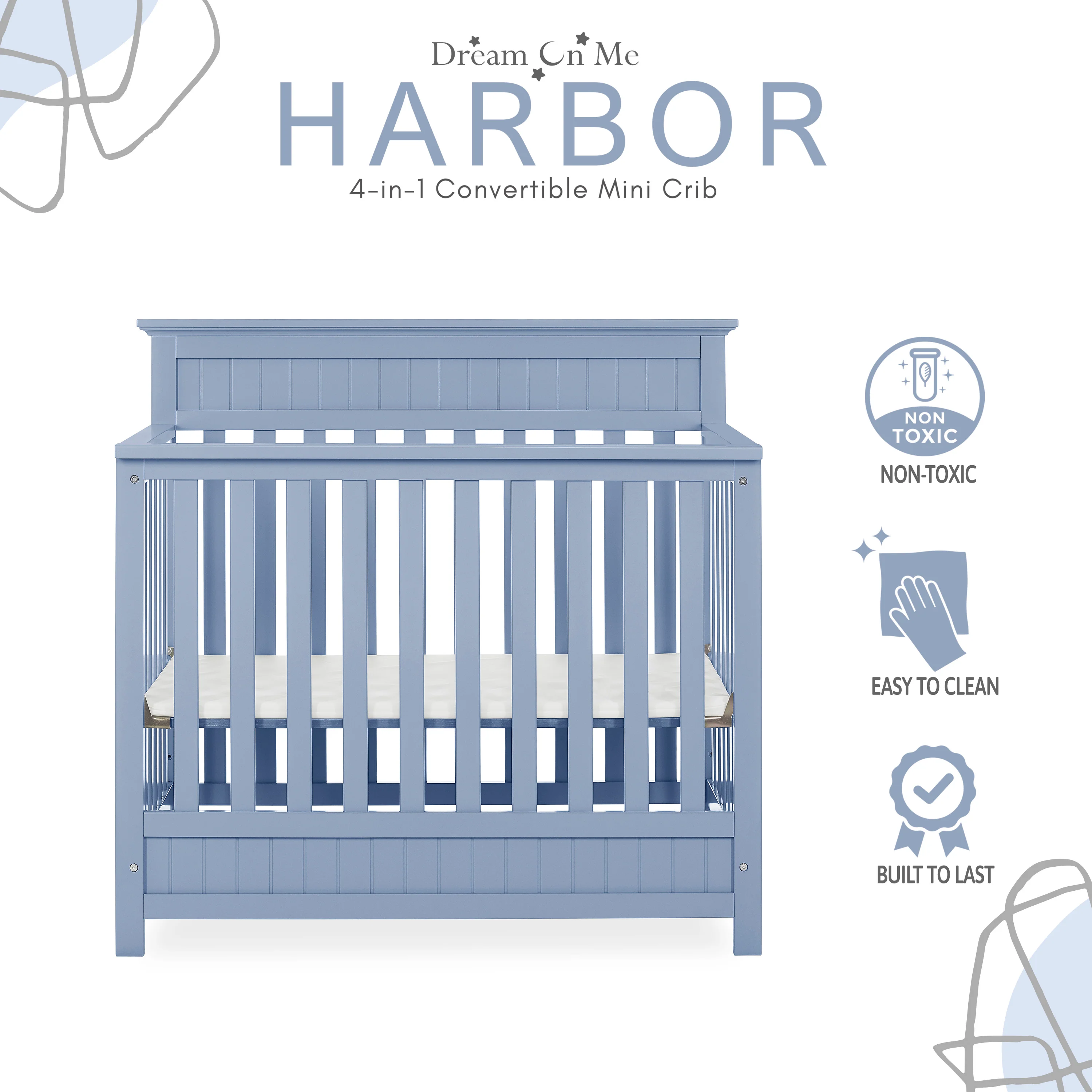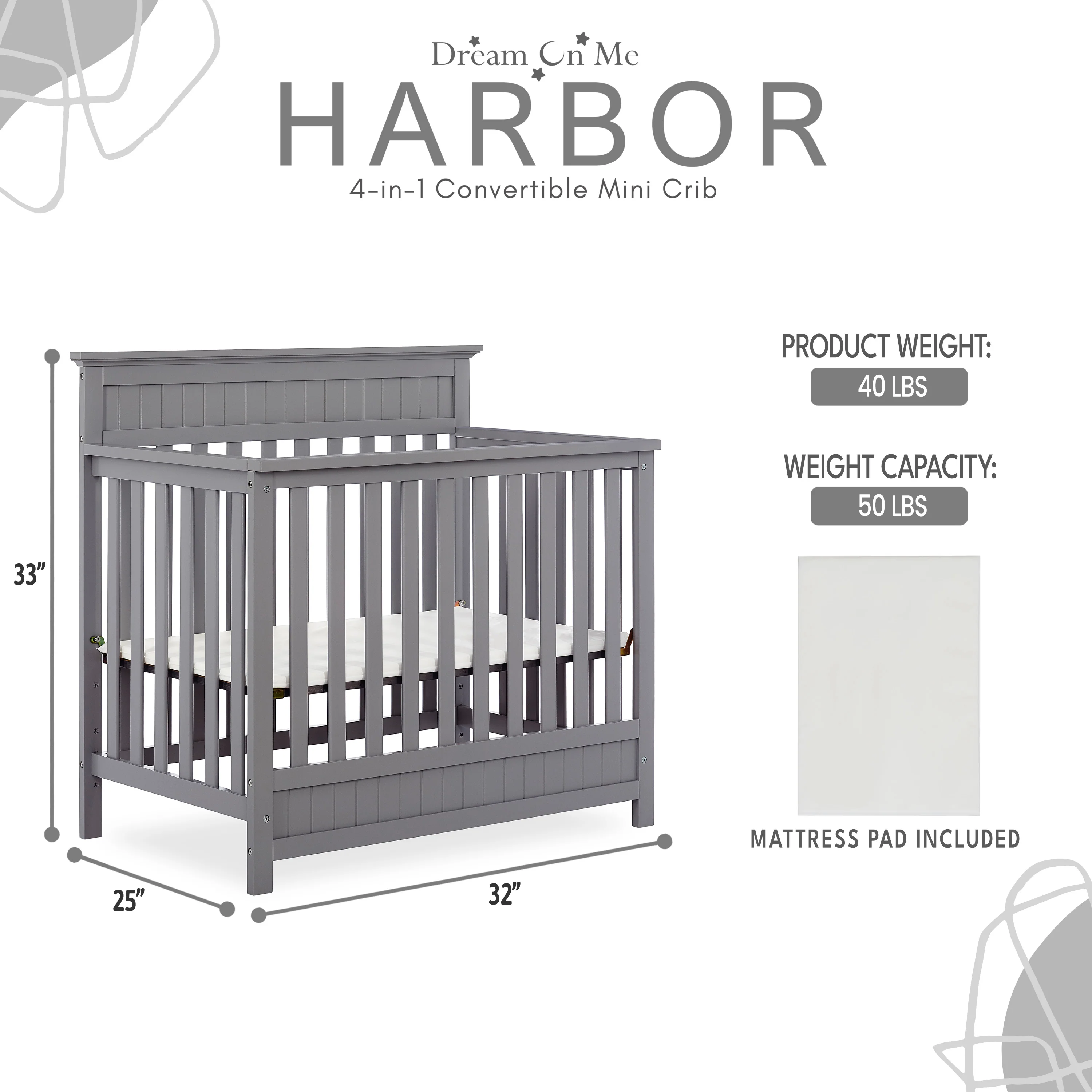 - CONVERTIBILITY OPTIONS: The Harbor 4-in-1 Convertible Mini Crib is a convenient way to keep pace with your child’s changing needs. Use it as a crib; as your baby grows, convert it into a mini daybed and twin-size bed (bed rails and frame sold separately)