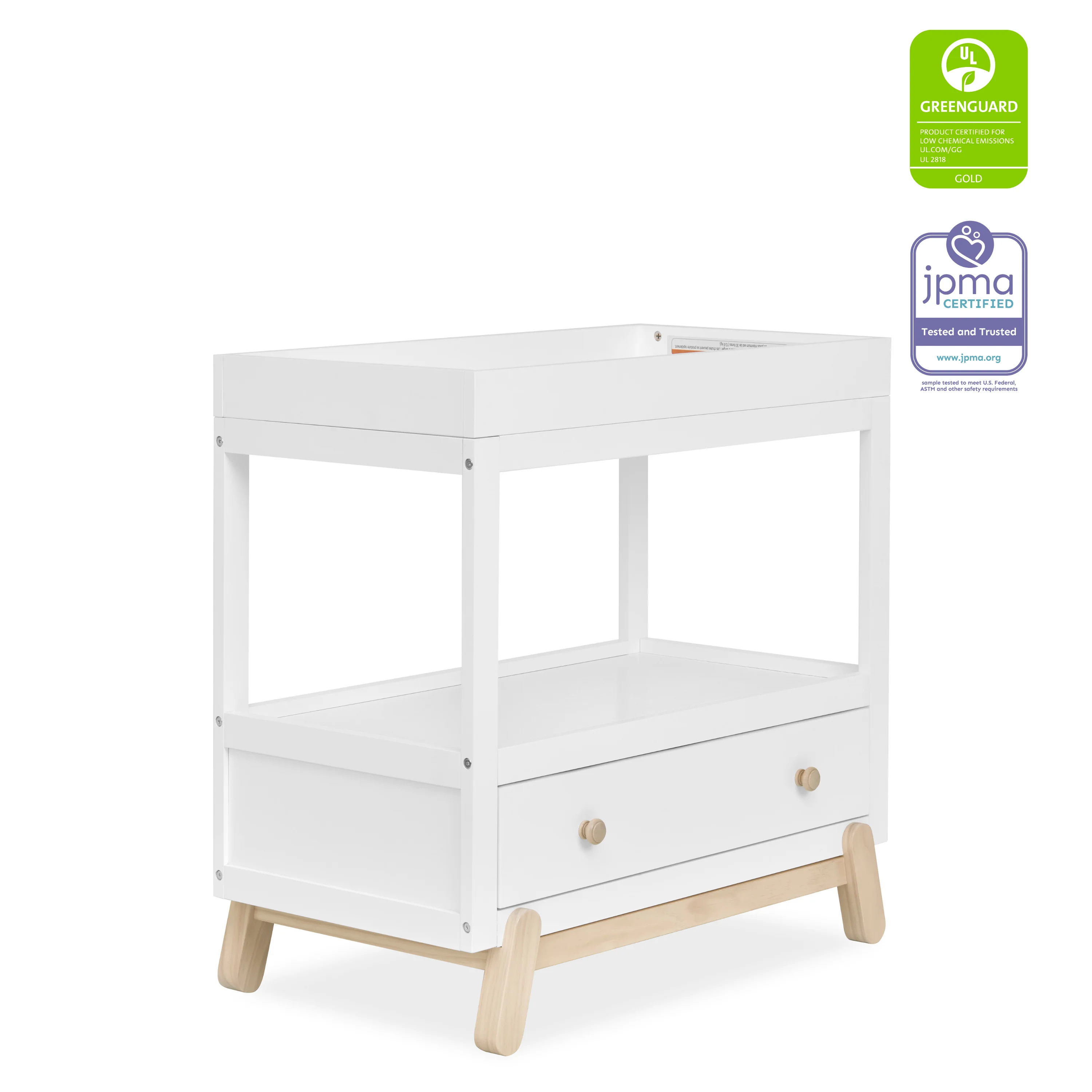 Pamper your baby while you’re on diaper duty with the highly-functional Dream On Me Hygge Changing Table. With a solid, sturdy base and unique Scandinavian-style legs that offer maximum support, this compact changing table is warm & safe for your baby. Designed to fit into your modern nursery, the Dream On Me Hygge Changing Table comes with a spacious bottom drawer to store all your little one’s changing essentials. Keeping in mind your child’s safety, as well as your convenience, the Dream On Me Hygge Changing Table is JPMA & Greenguard Gold certified. This wonderful addition is very easy to clean & maintain and is thoughtfully crafted, using sustainable New Zealand Pinewood. Not only that, the Dream On Me Hygge Changing Table meets/exceeds the ASTM & CPSC standards and is available in 2 elegant finishes - Matte Black Vintage Oak & White Vintage Oak.