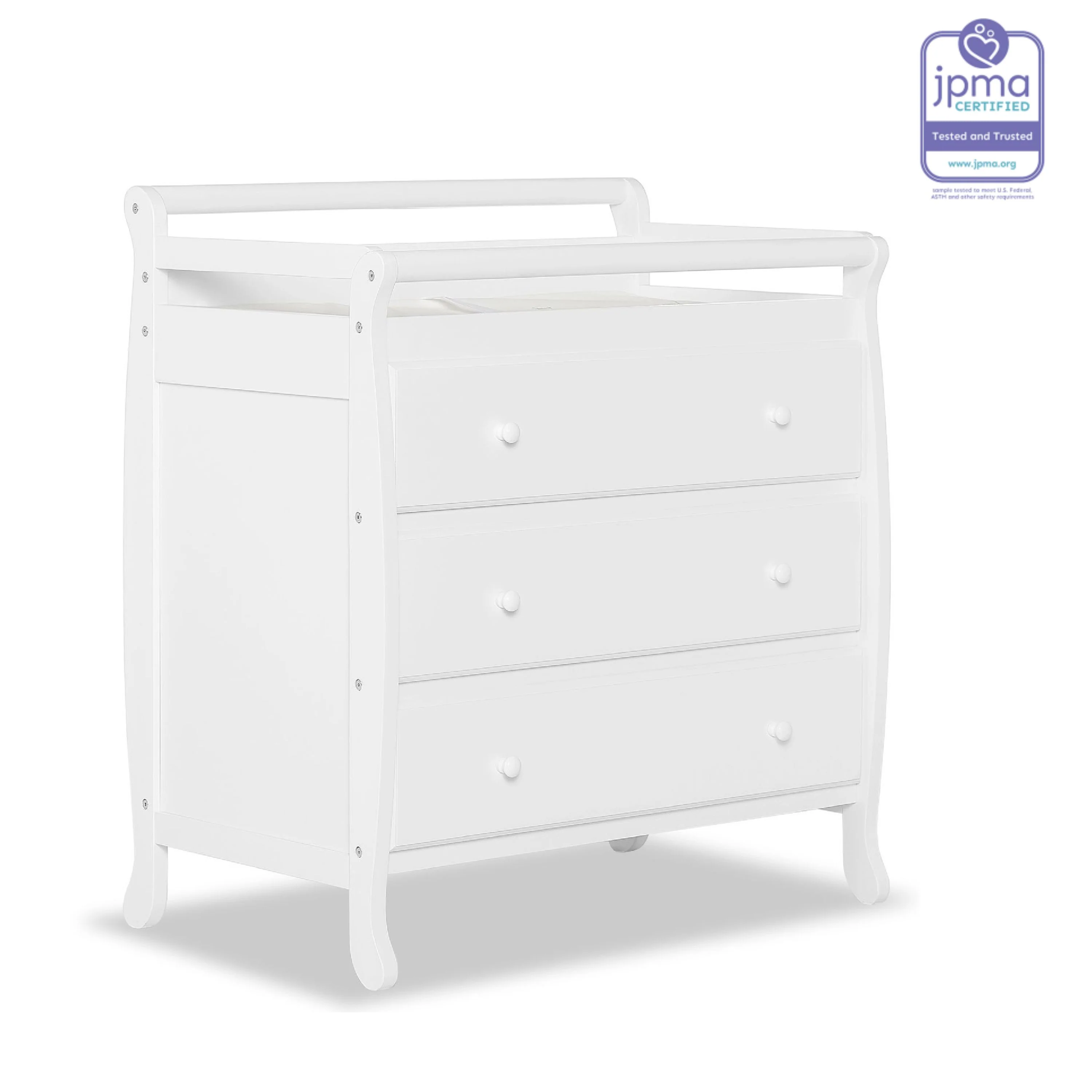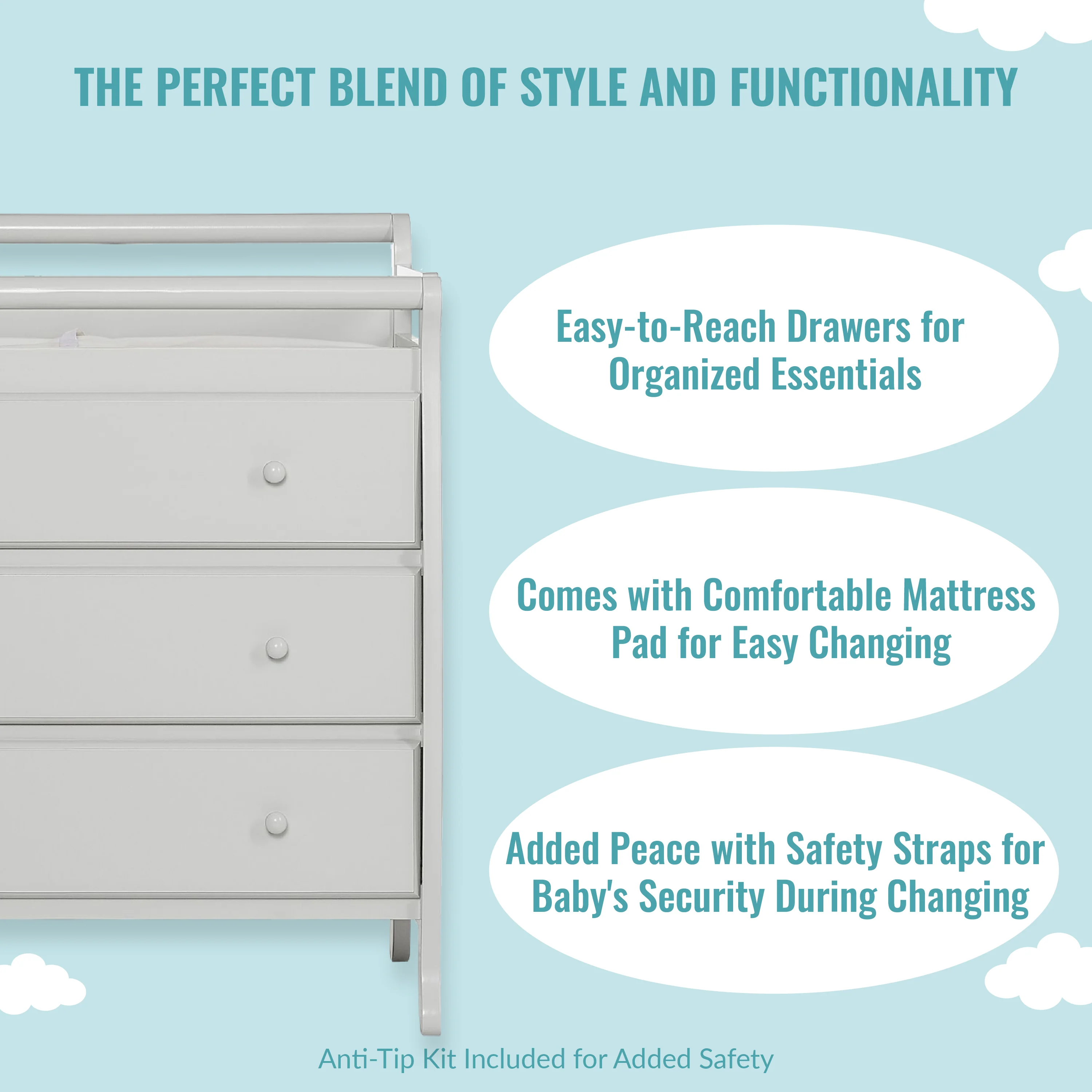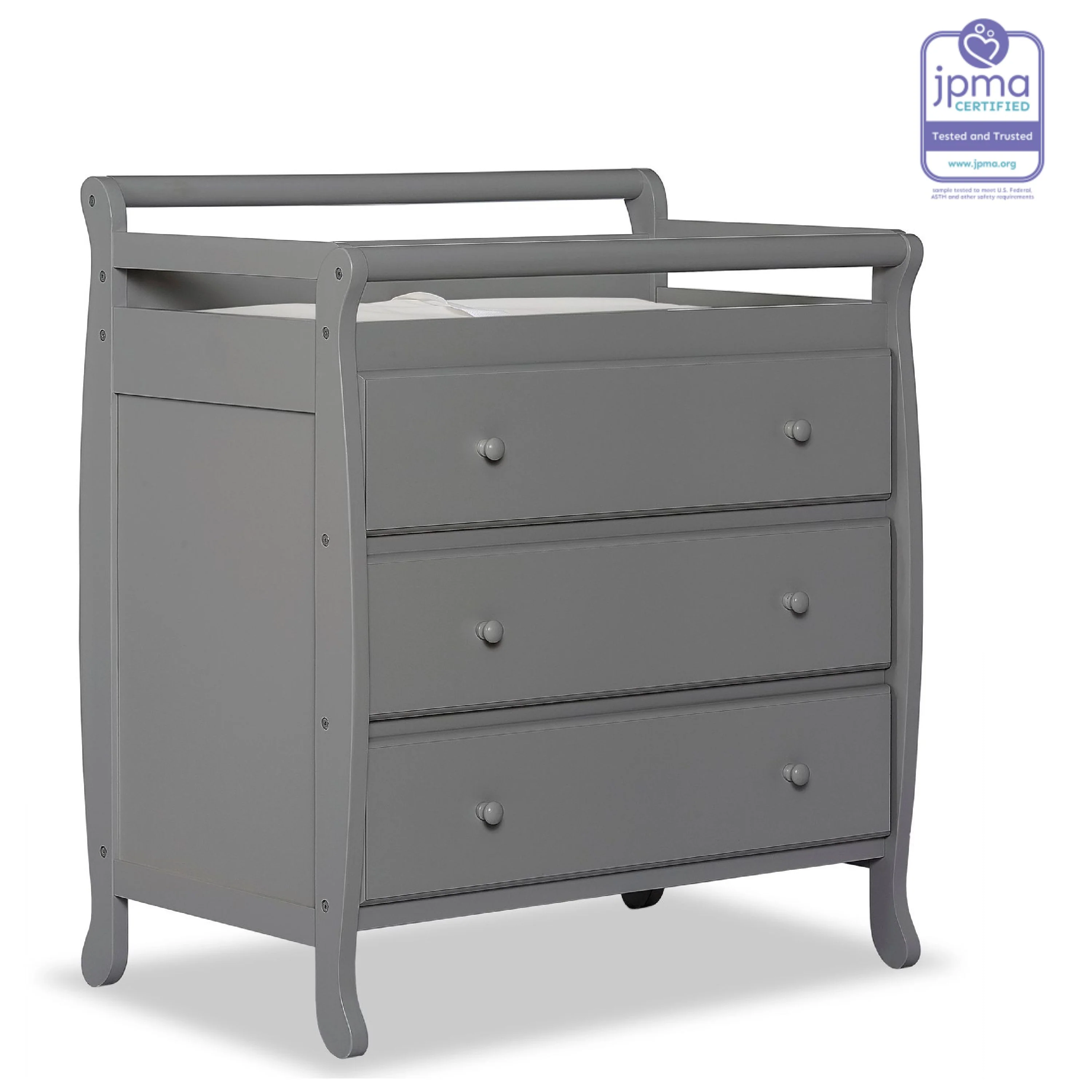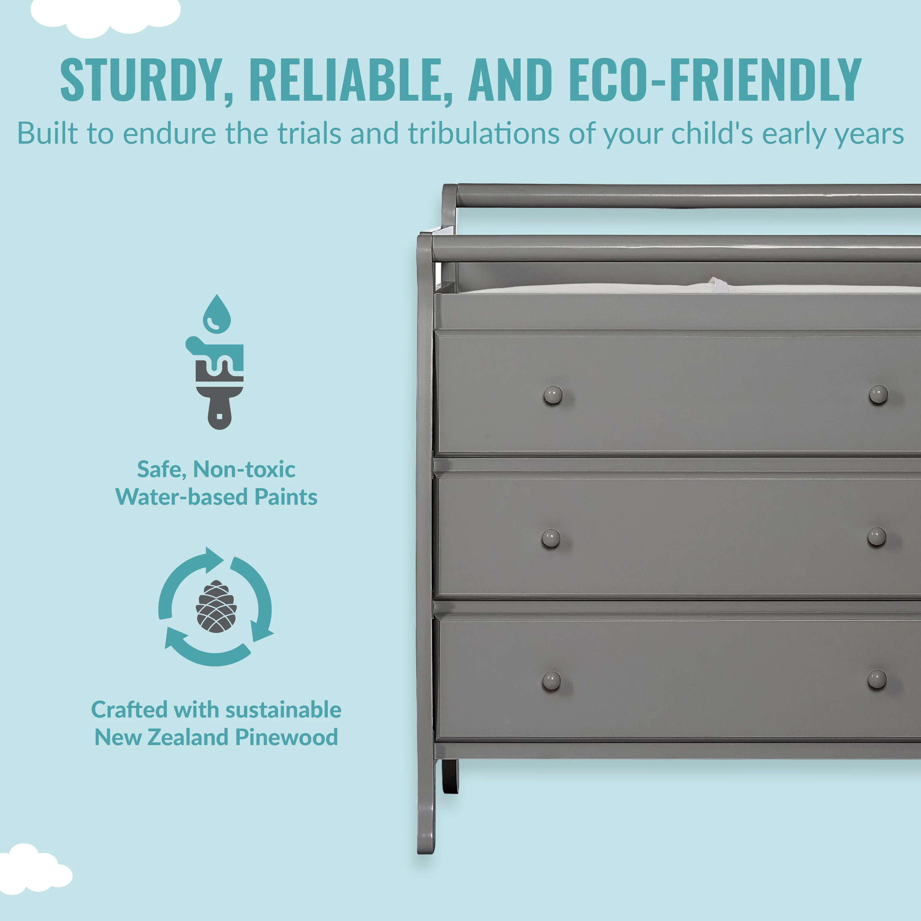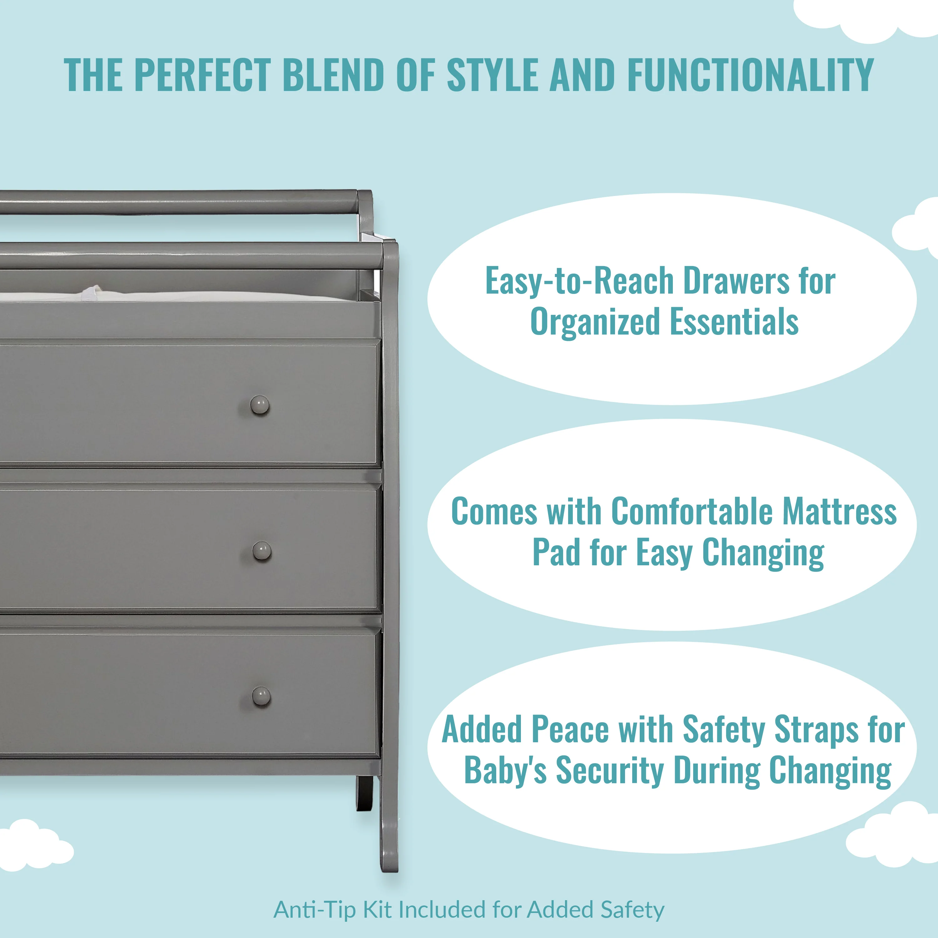 With its blend of style, functionality and safety, the Liberty Collection 3 Drawer Changing Table is a must-have nursery essential Made of solid wood, its classic sleigh design features a mix of curved and straight lines and a gender-neutral vibe