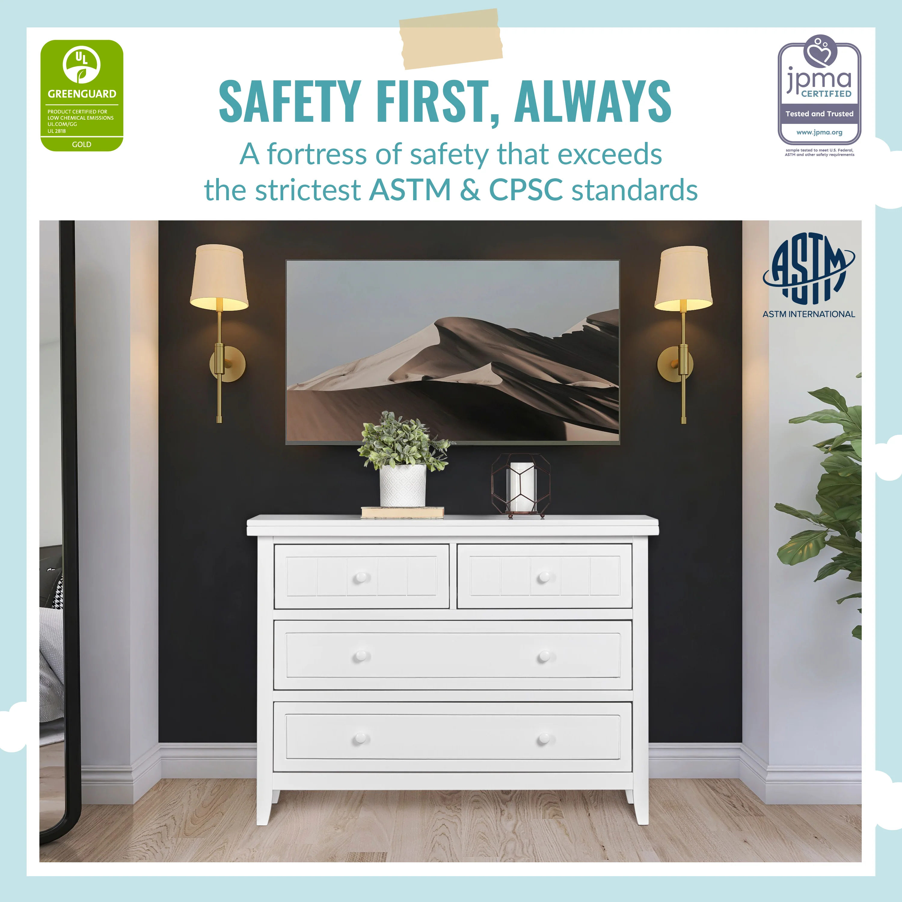 - FOR YOUR BABY'S SAFETY: Say goodbye to toxic chemicals! Finished in a non-toxic multi-step painting process and lead and phthalate safe. Rest assured knowing it exceeds ASTM International and U.S. CPSC safety standards. Stop mechanism and anti-tip kit included for additional safety