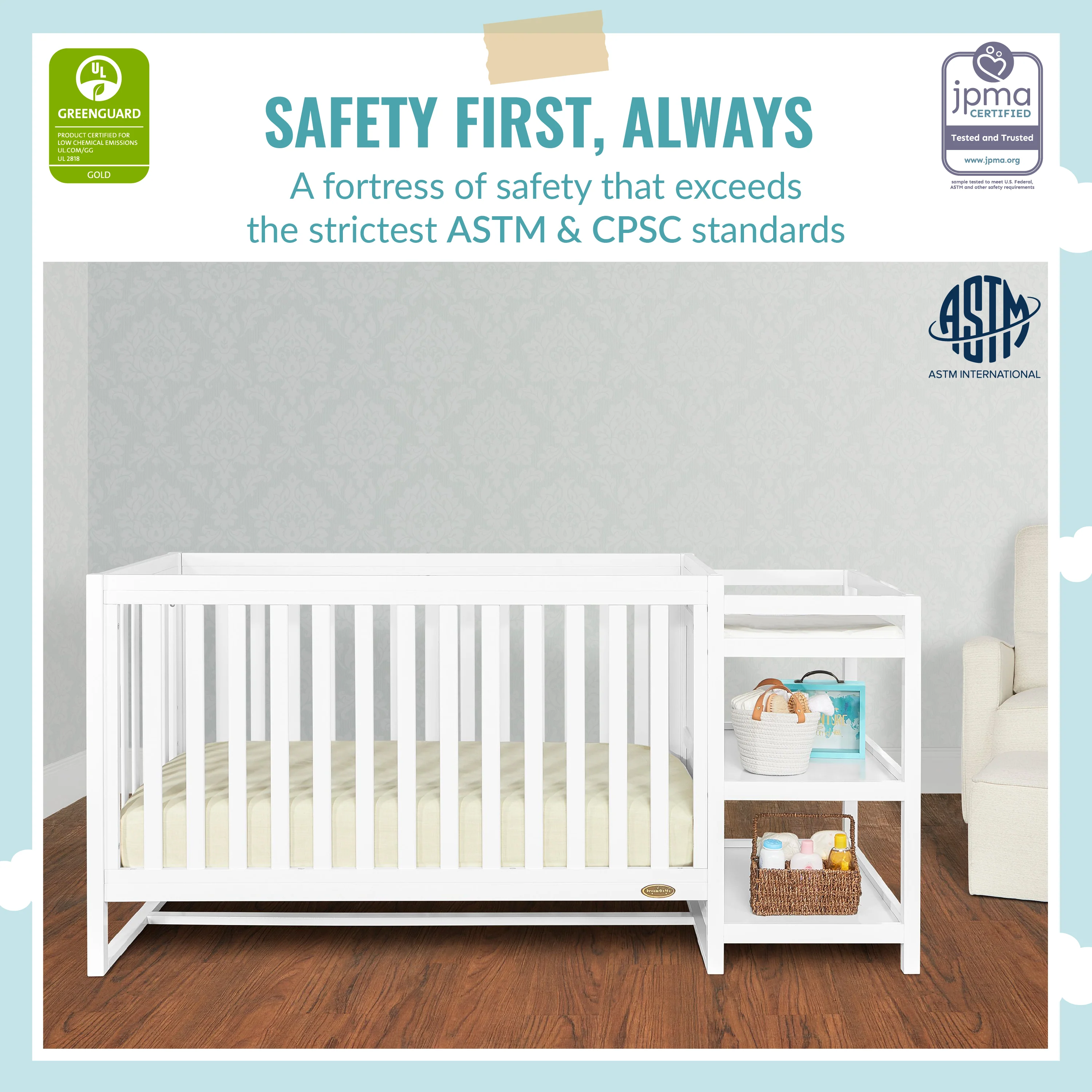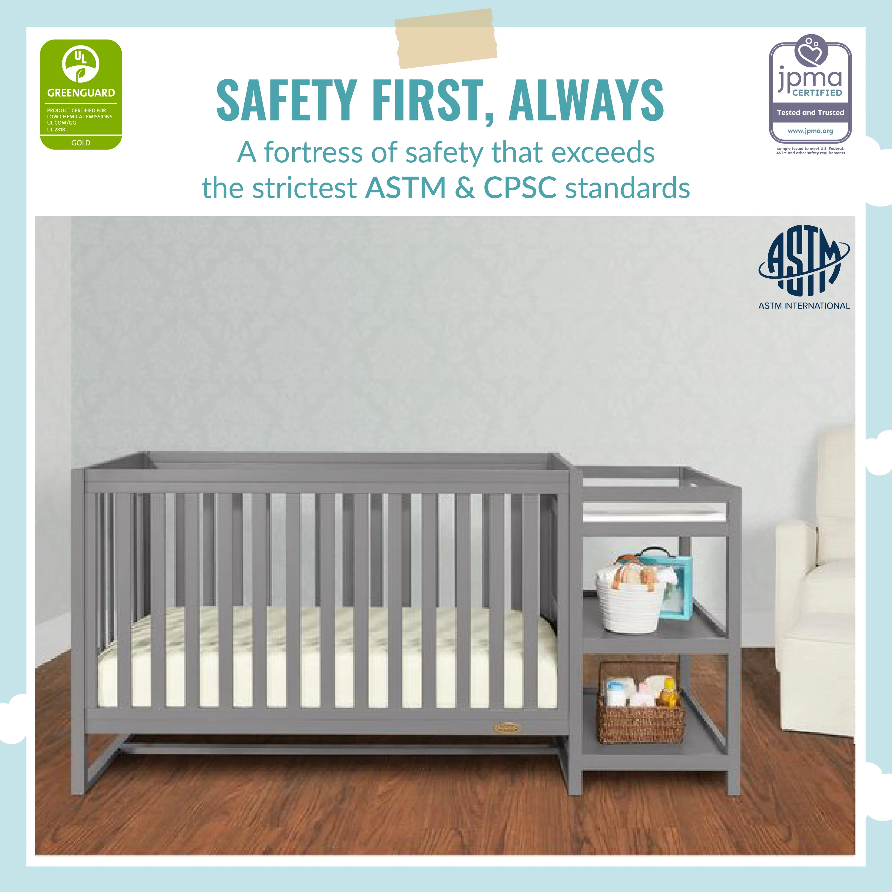 • This crib is JPMA certified to meet/exceed CPSC/ASTM safety standards. Tested by 3rd party labs for lead and other toxic elements to meet or exceed CPSC and ASTM safety standards.