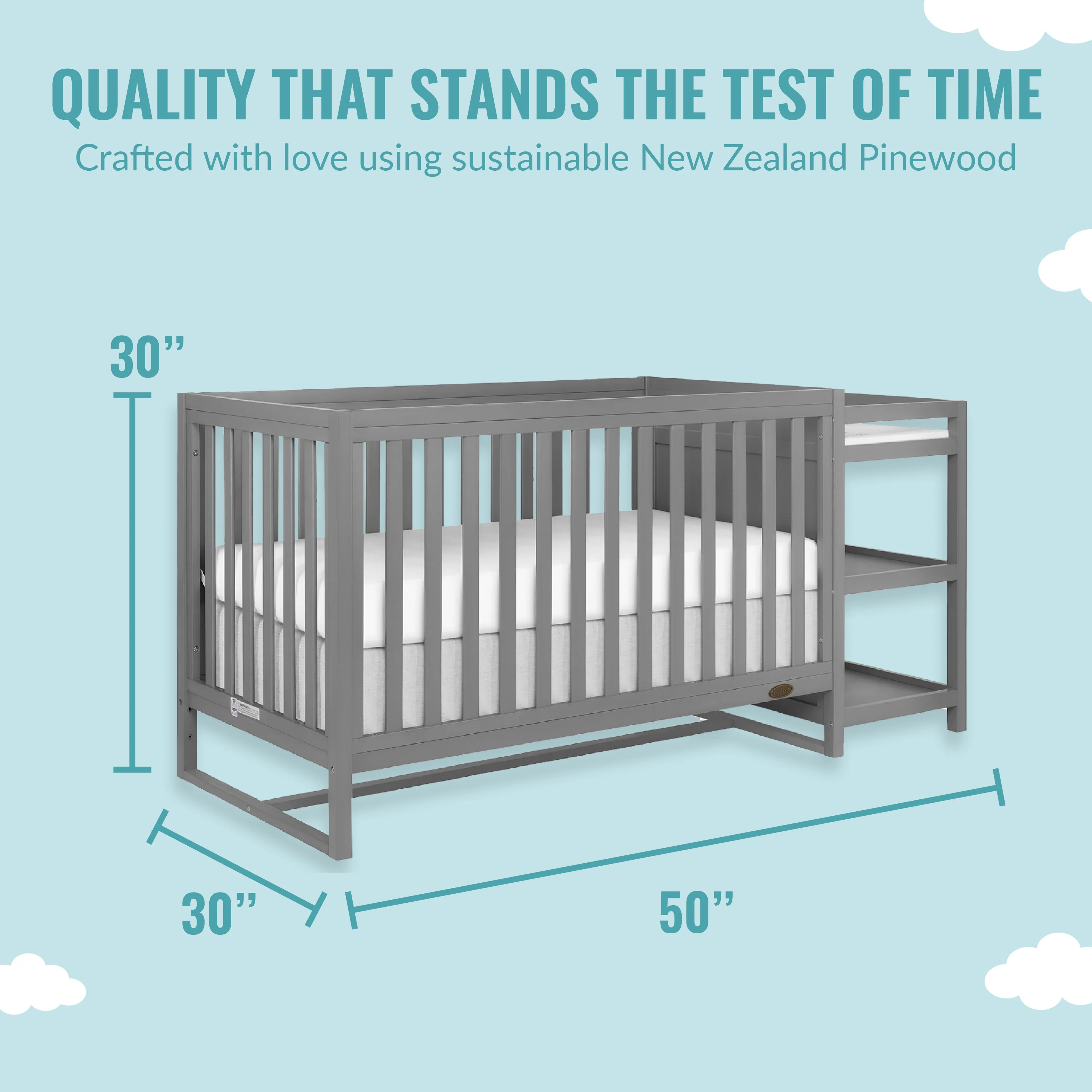 • Built of durable, sustainable, and renewable New Zealand pinewood, the Milo features a modern, gender-neutral design that fits beautifully into any nursery decor