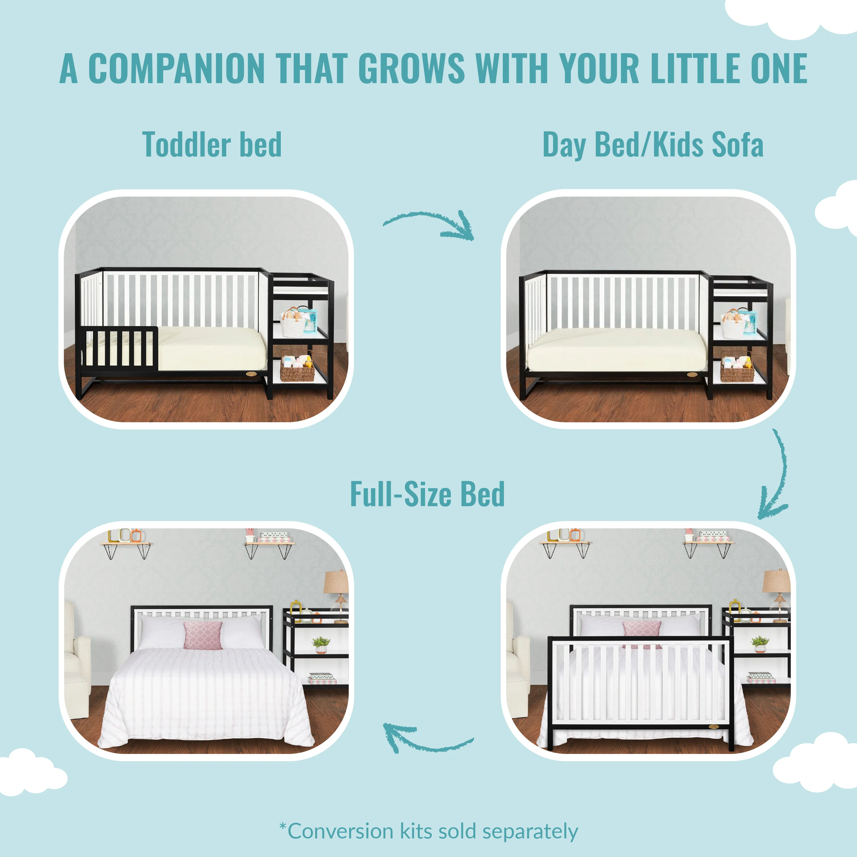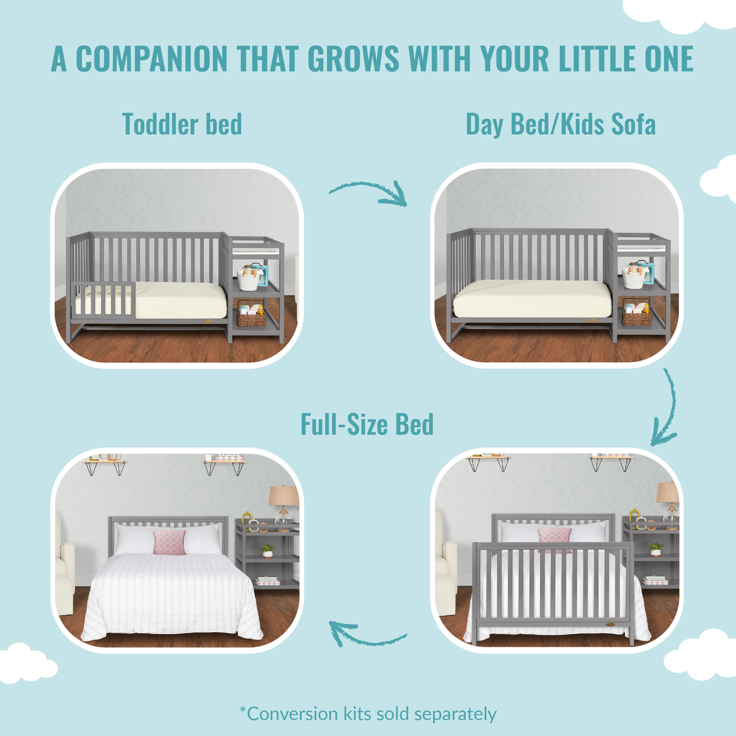 • Convert it from a crib to a toddler bed, a day bed, and then a full-size bed (full-size bed frame and bed rails sold separately). Features a convenient 3-height mattress setting