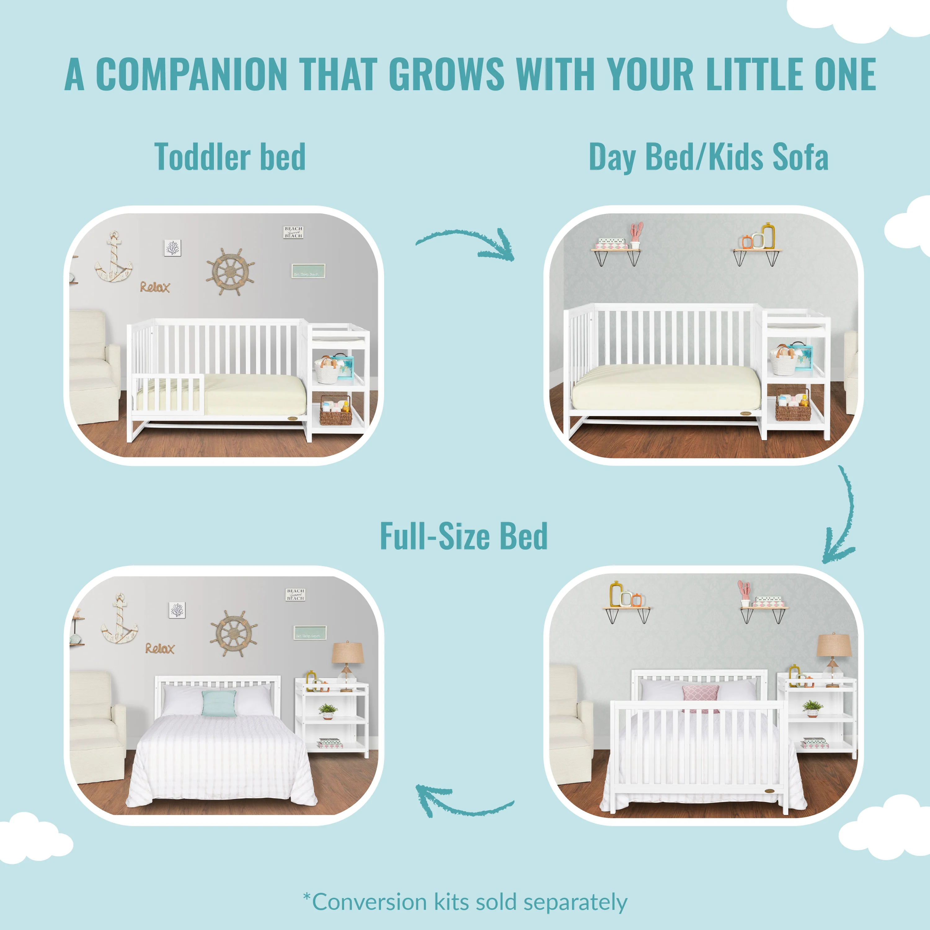 - Convert it from a crib to a toddler bed, a day bed, and then a full-size bed (full-size bed frame and bed rails sold separately). Features a convenient 3-height mattress setting