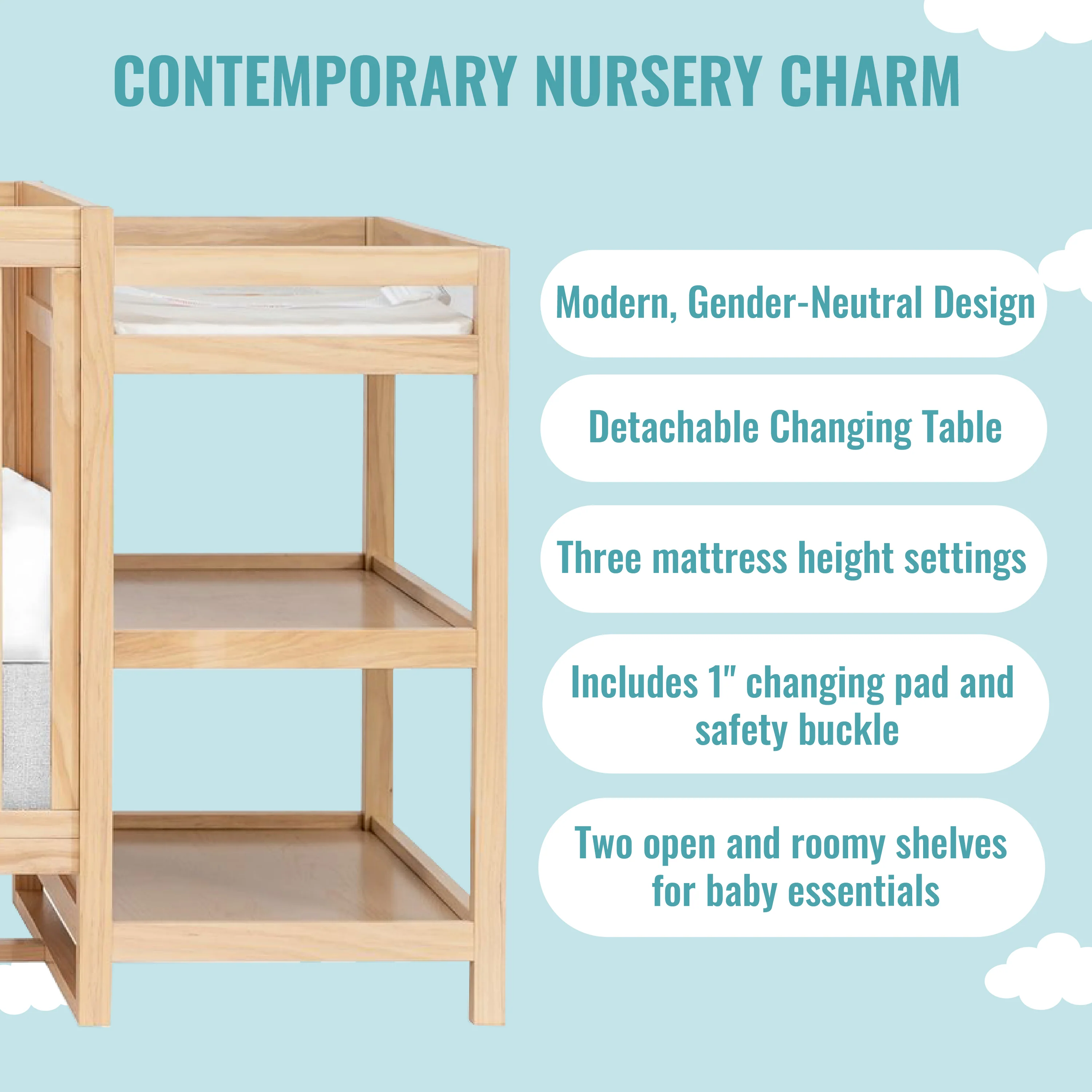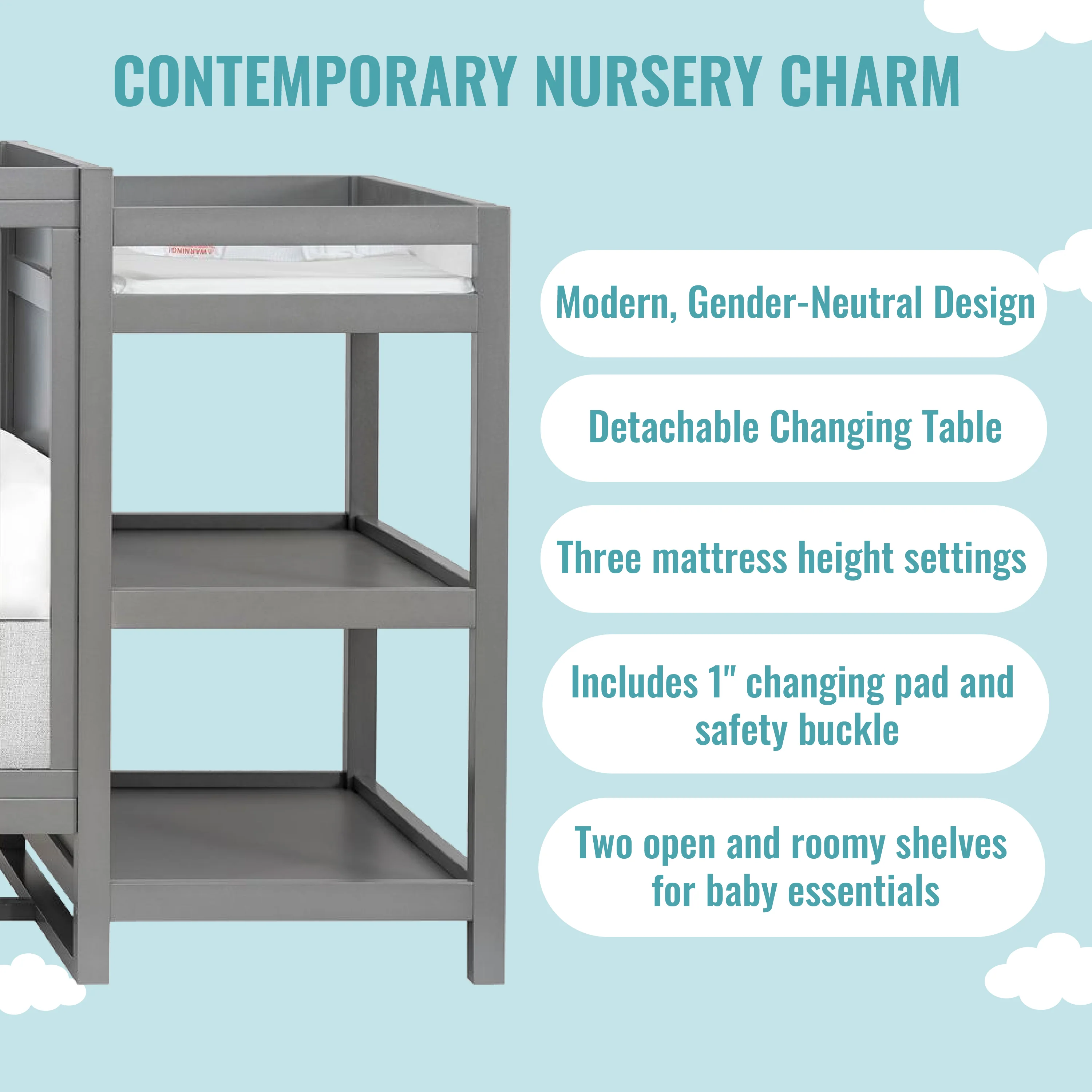 - Comes with a detachable changing table that is fitted with a 1" changing pad and safety buckle making changing time a breeze. It is fitted with two open and roomy shelves