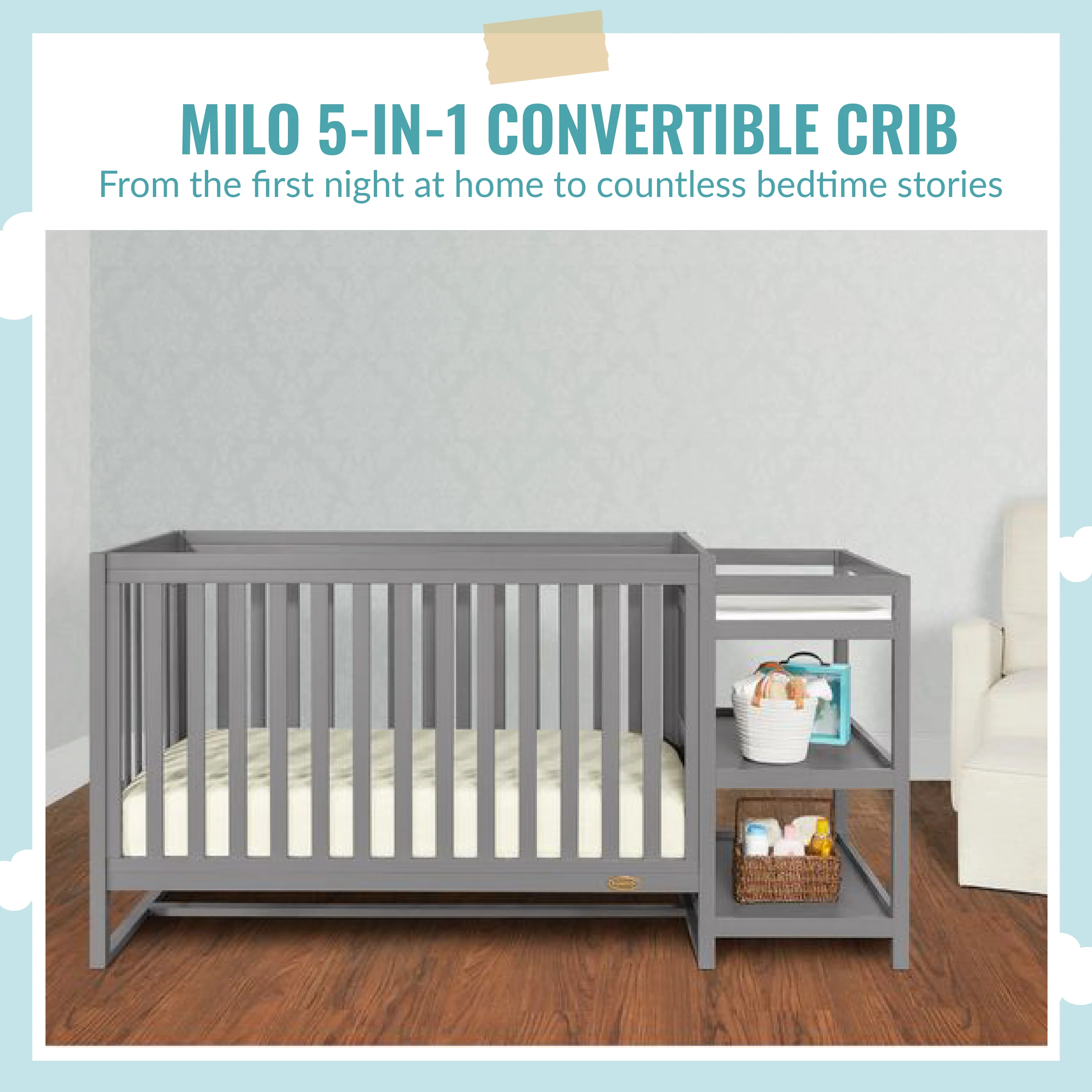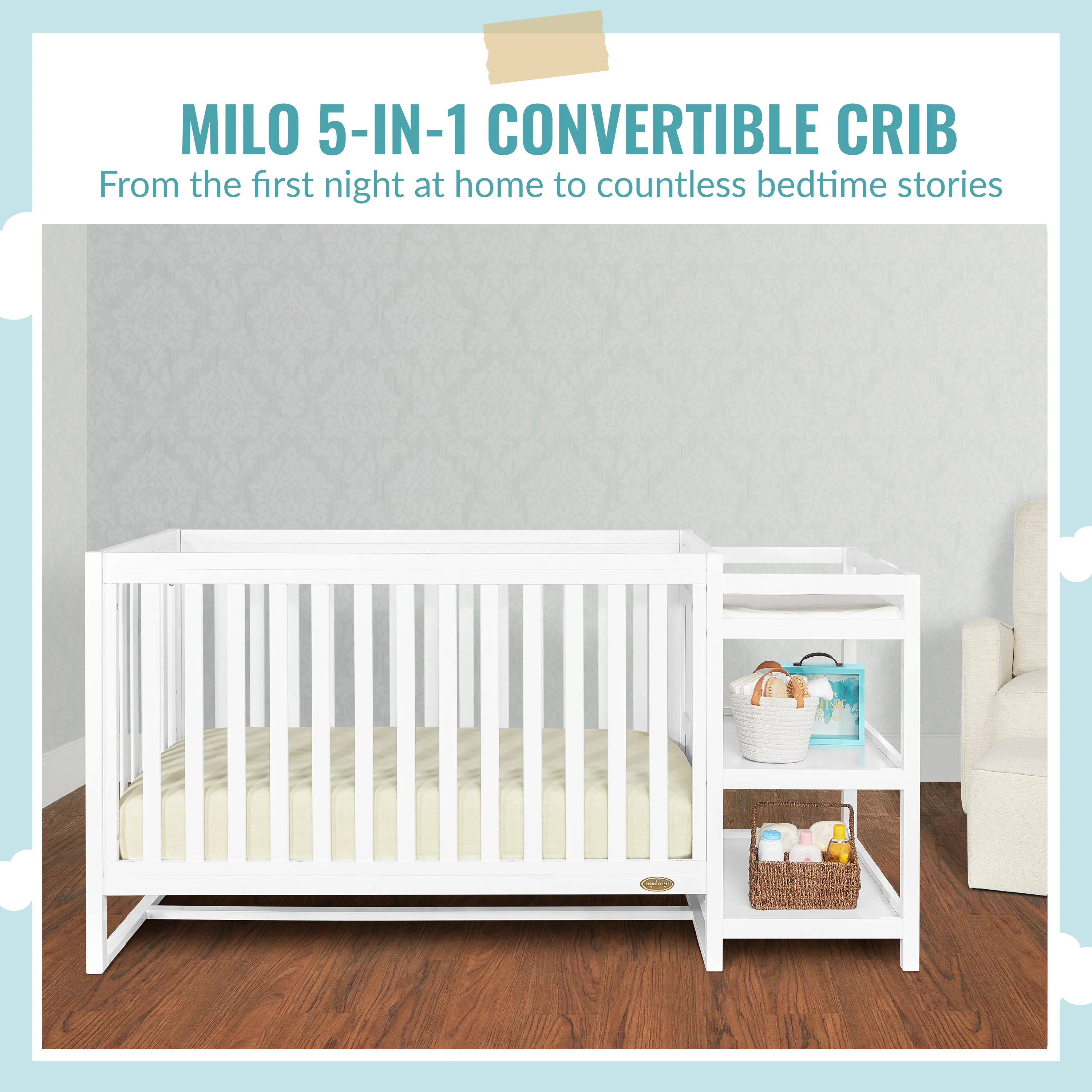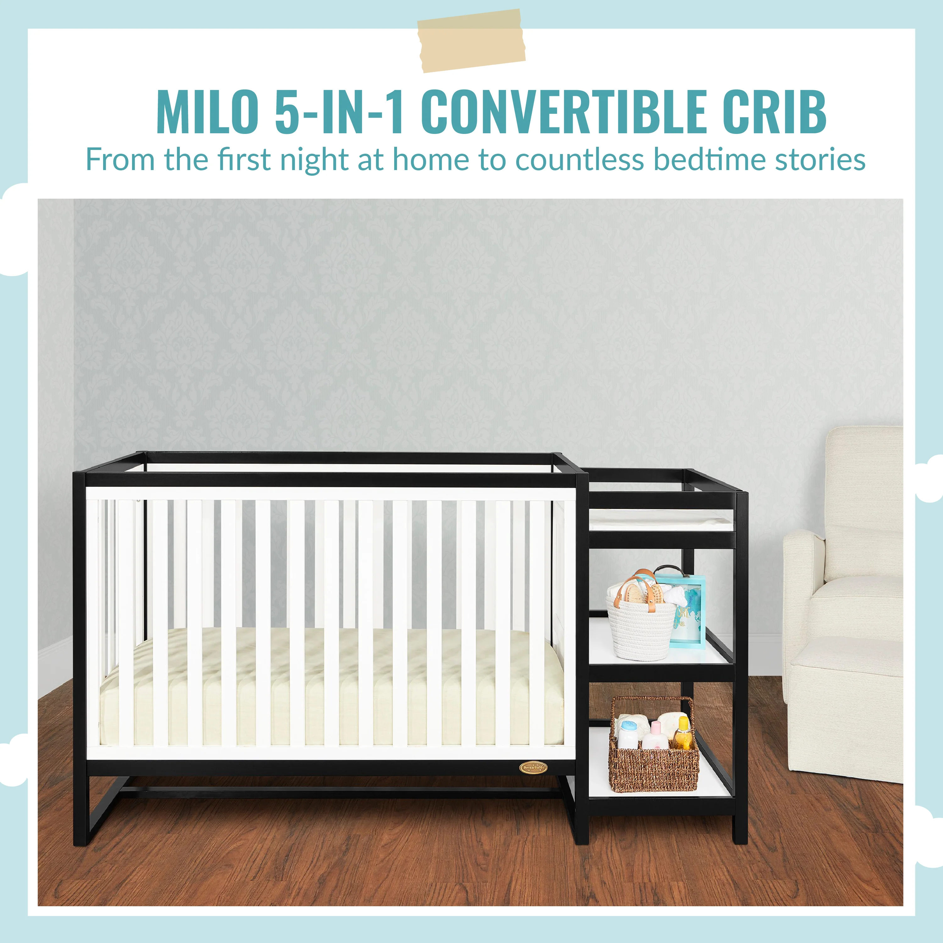 The Dream On Me Milo 5-in-1 Convertible Crib and Changing Table combines contemporary design with an attached changing station, featuring straight lines and a gender-neutral form