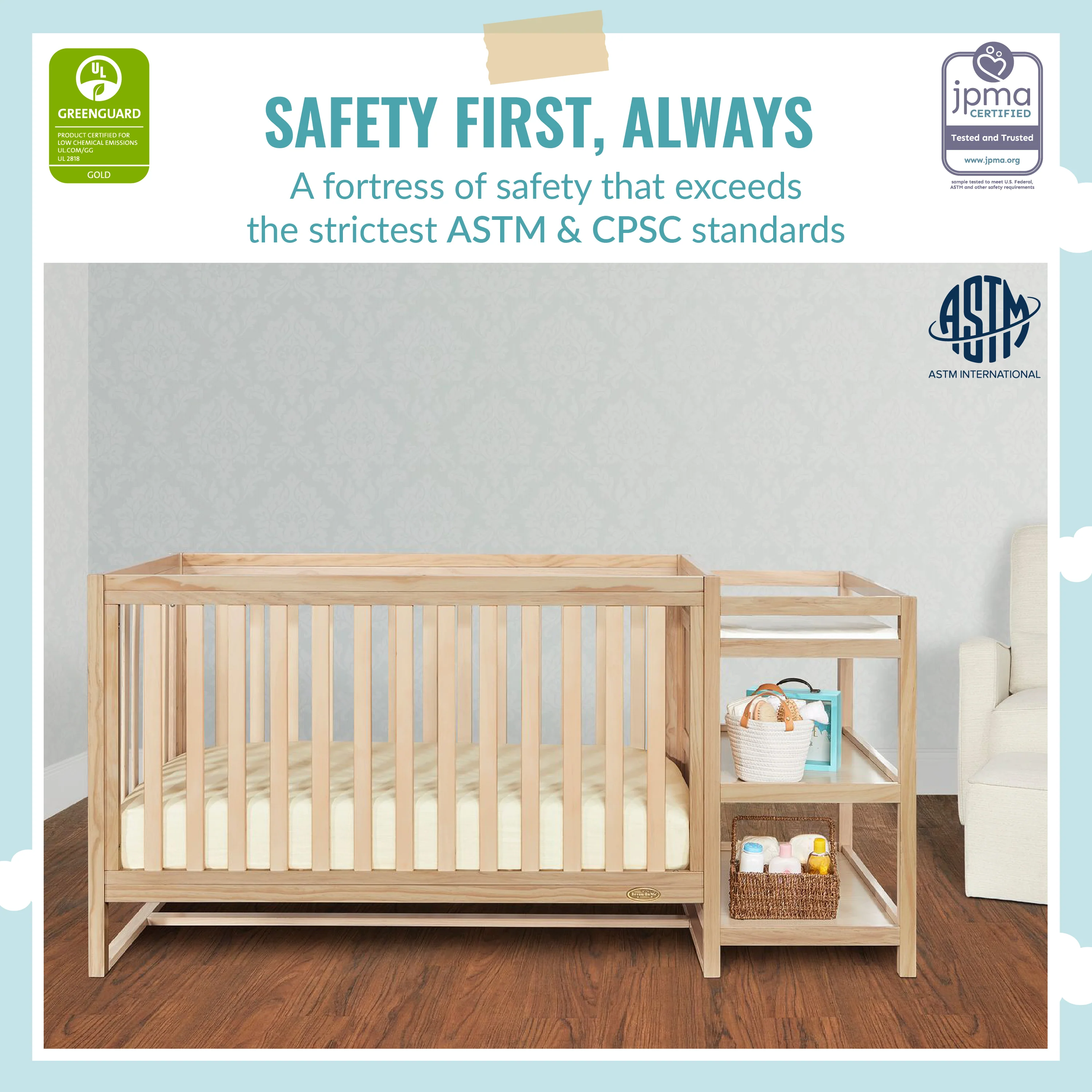 - This crib is JPMA certified to meet/exceed CPSC/ASTM safety standards. Tested by 3rd party labs for lead and other toxic elements to meet or exceed CPSC and ASTM safety standards.