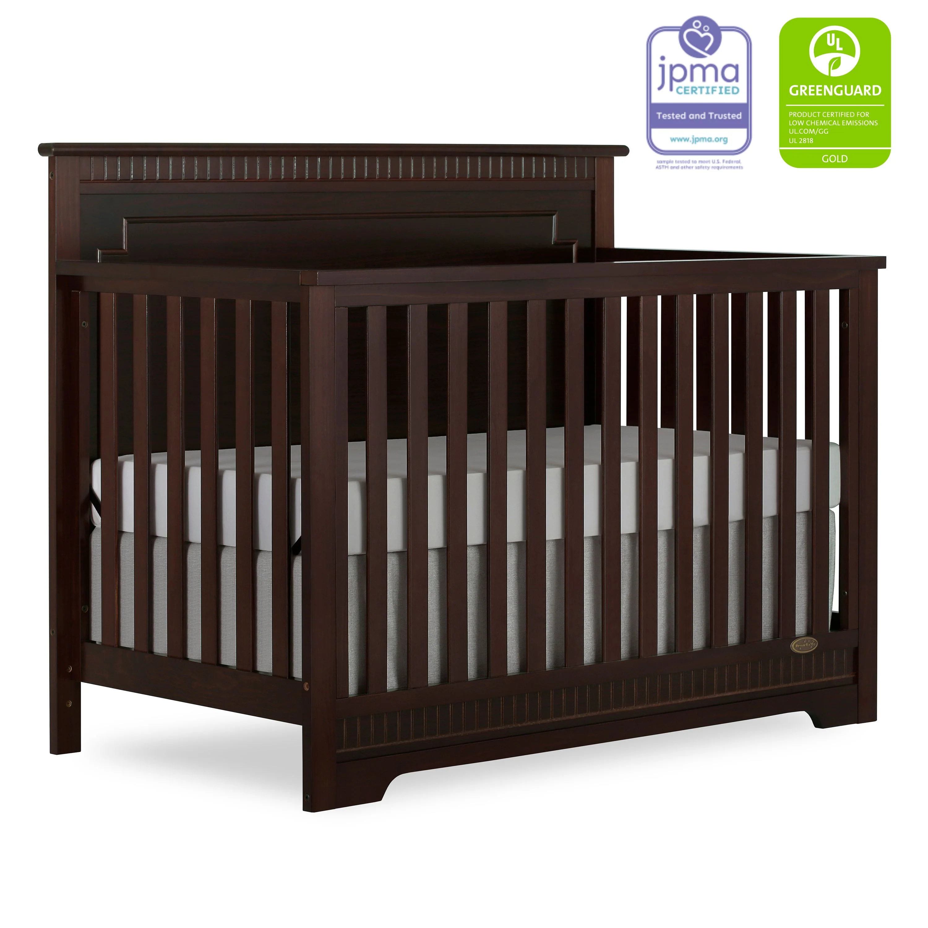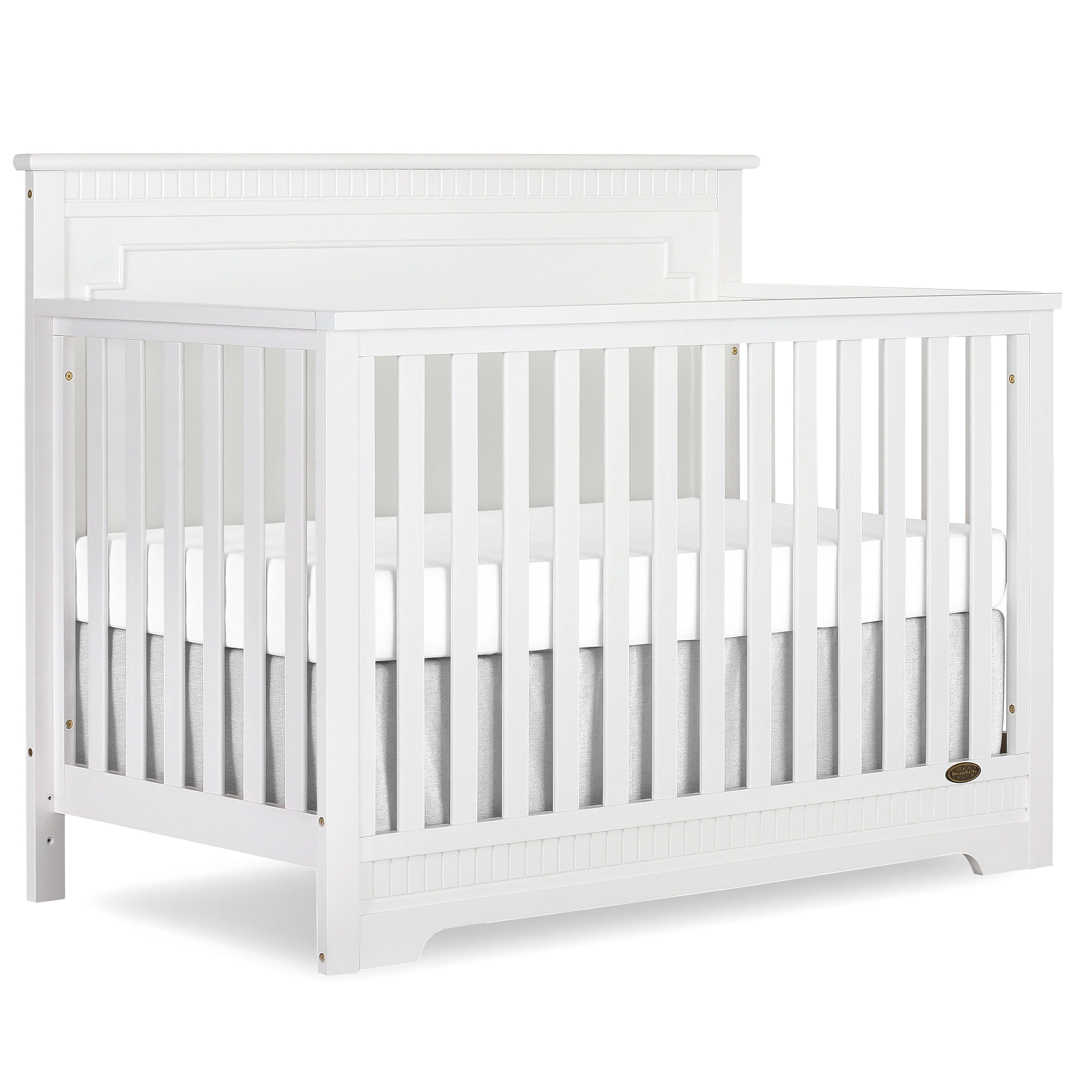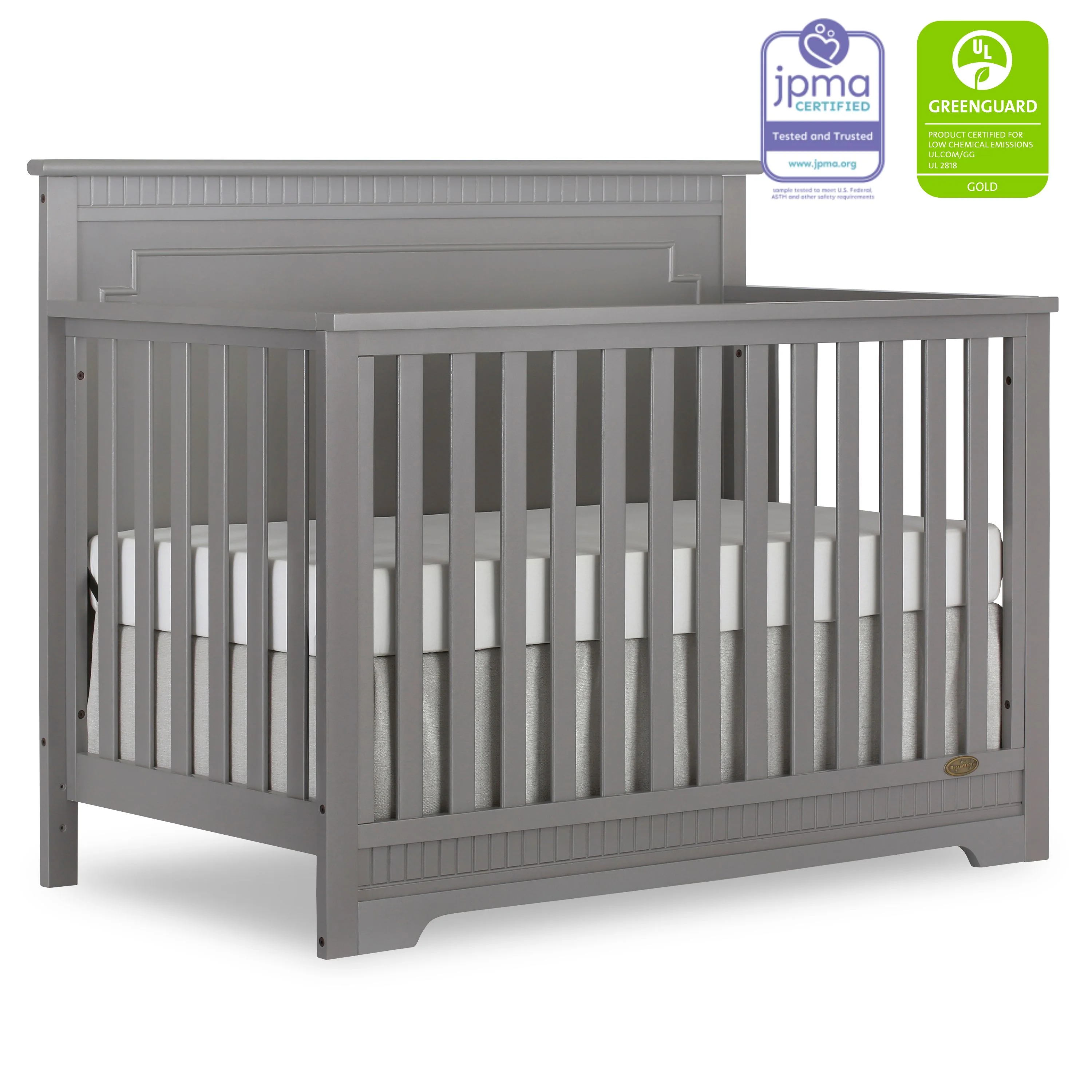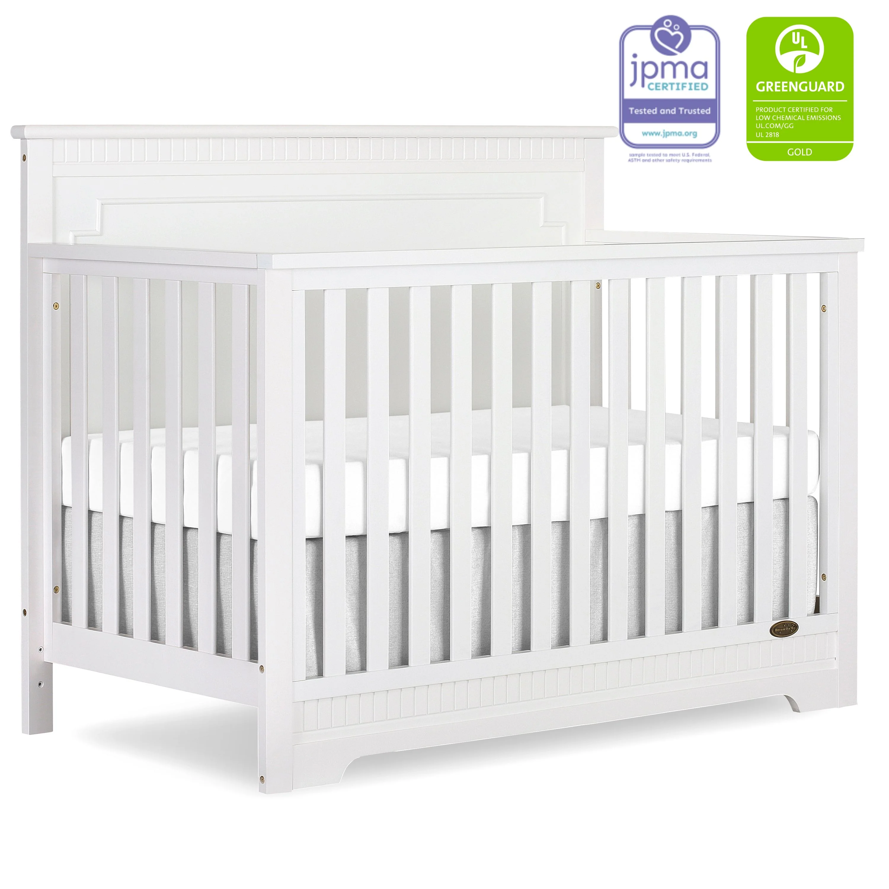 The Dream On Me Morgan inspired by the Boston sky line this modern , 5 in 1 convertible crib featuring full panel headboard connecting natural elements of wood with a flourish of decorator details. Its stylish flat-top headboard features dentil trim molding that lines the headboard and footboard. This crib offers a long term value converting into a charming toddler bed with our conversion kit ( sold separately ), daybed and theback panel converts to a full-size headboard with the simple addition of bed frame ( sold separately). The Morgan mattress platform adjusts to three different heights depending on the age of your baby. All Dream On Me cribs meets all applicable ASTM , CPSC and JPMA standards