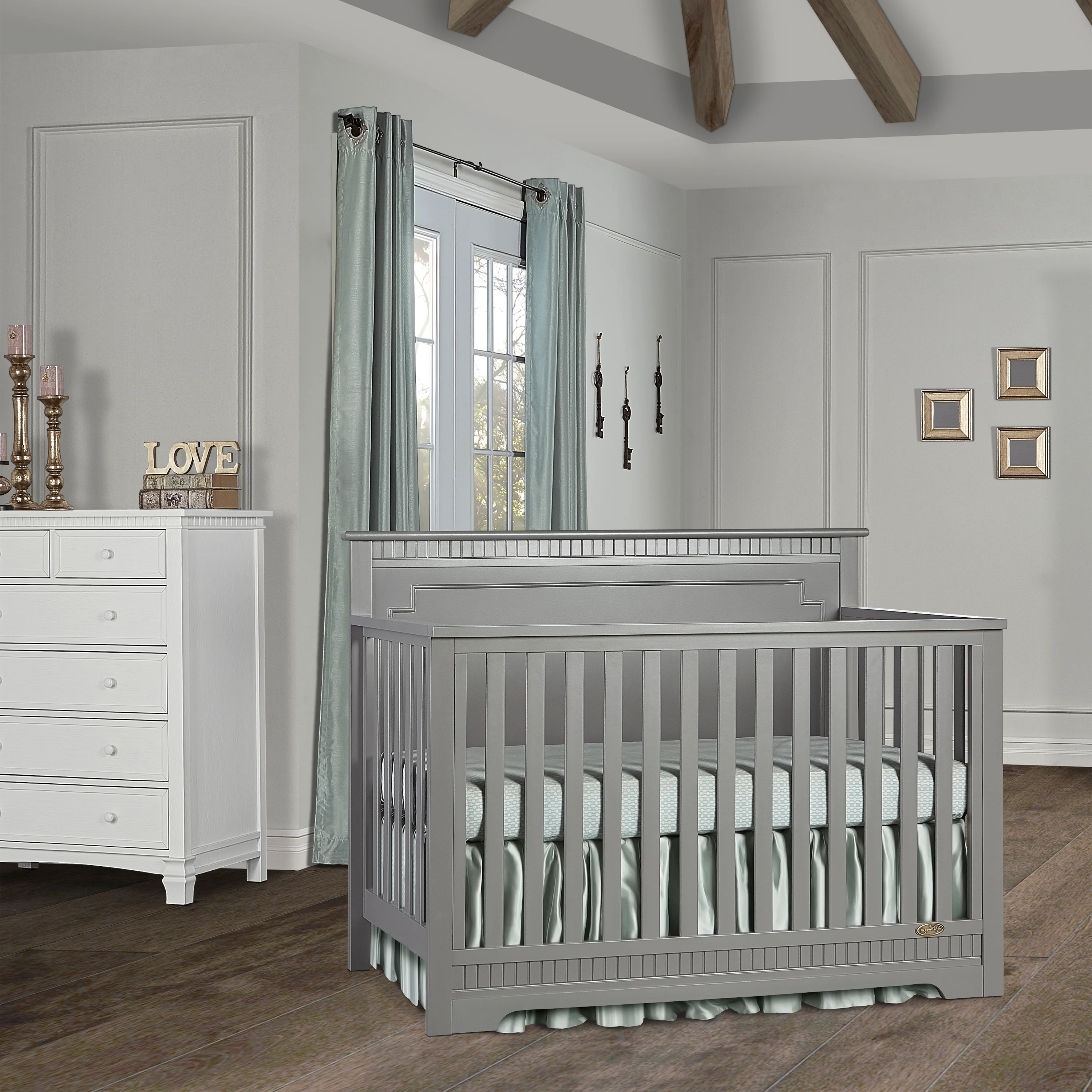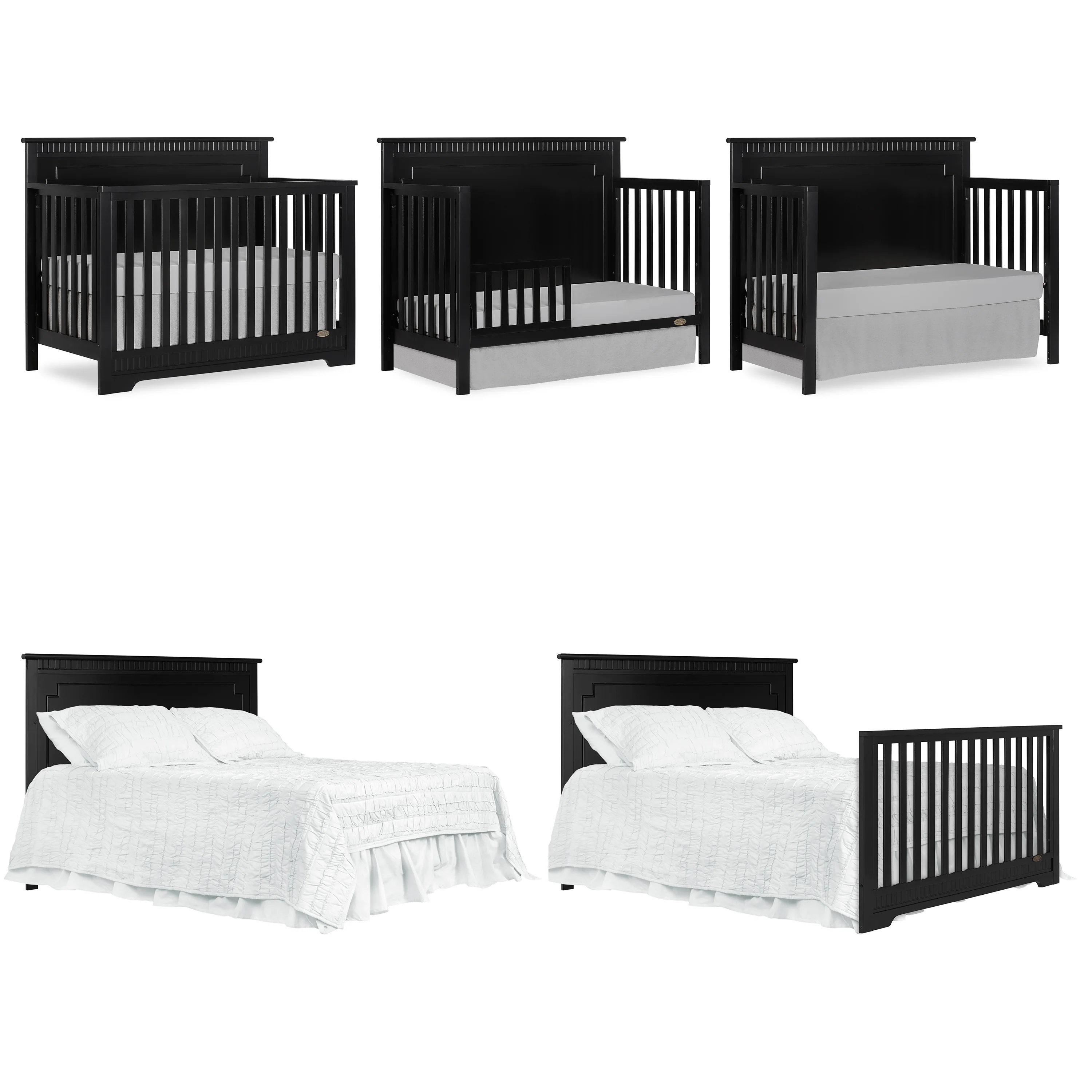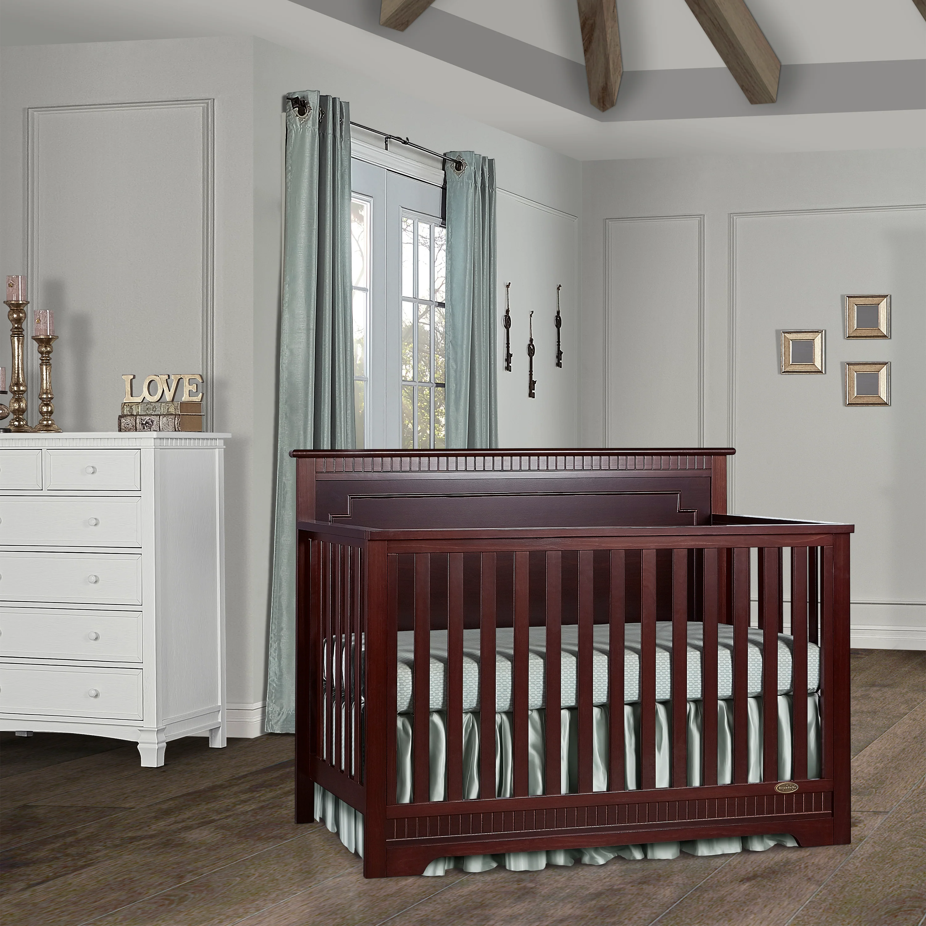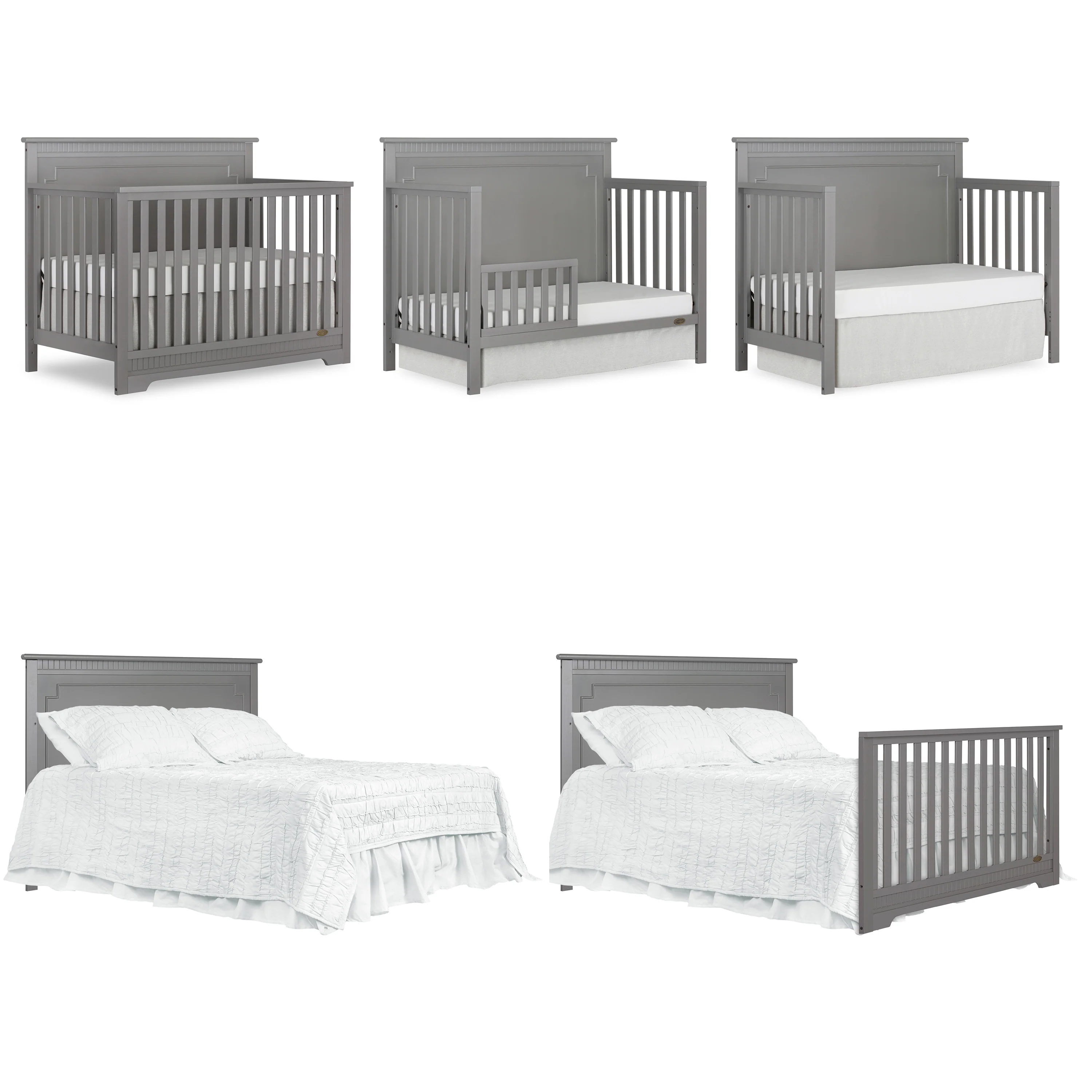 The Dream On Me Morgan inspired by the Boston sky line this modern , 5 in 1 convertible crib featuring full panel headboard connecting natural elements of wood with a flourish of decorator details. Its stylish flat-top headboard features dentil trim molding that lines the headboard and footboard. This crib offers a long term value converting into a charming toddler bed with our conversion kit ( sold separately ), daybed and theback panel converts to a full-size headboard with the simple addition of bed frame ( sold separately). The Morgan mattress platform adjusts to three different heights depending on the age of your baby. All Dream On Me cribs meets all applicable ASTM , CPSC and JPMA standards