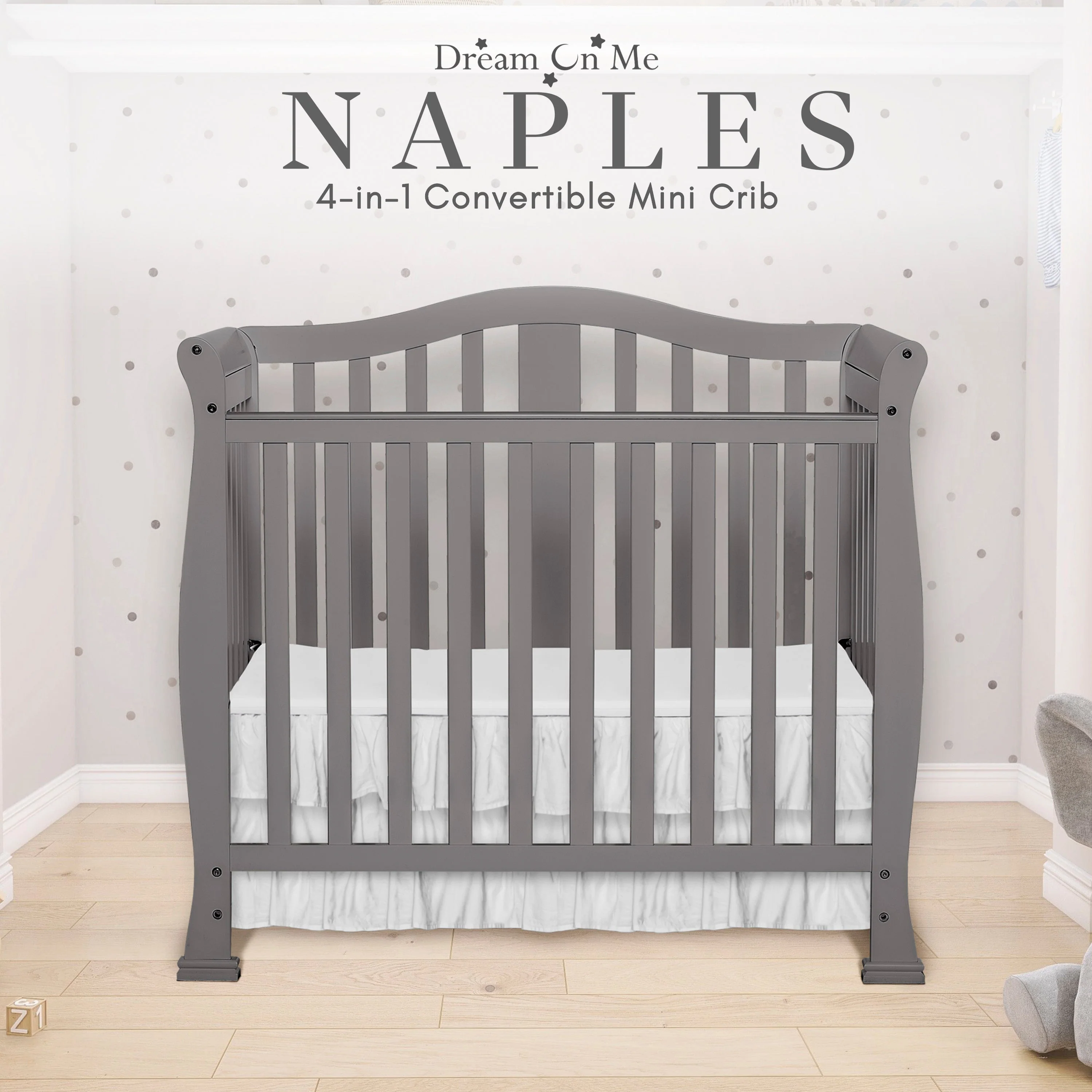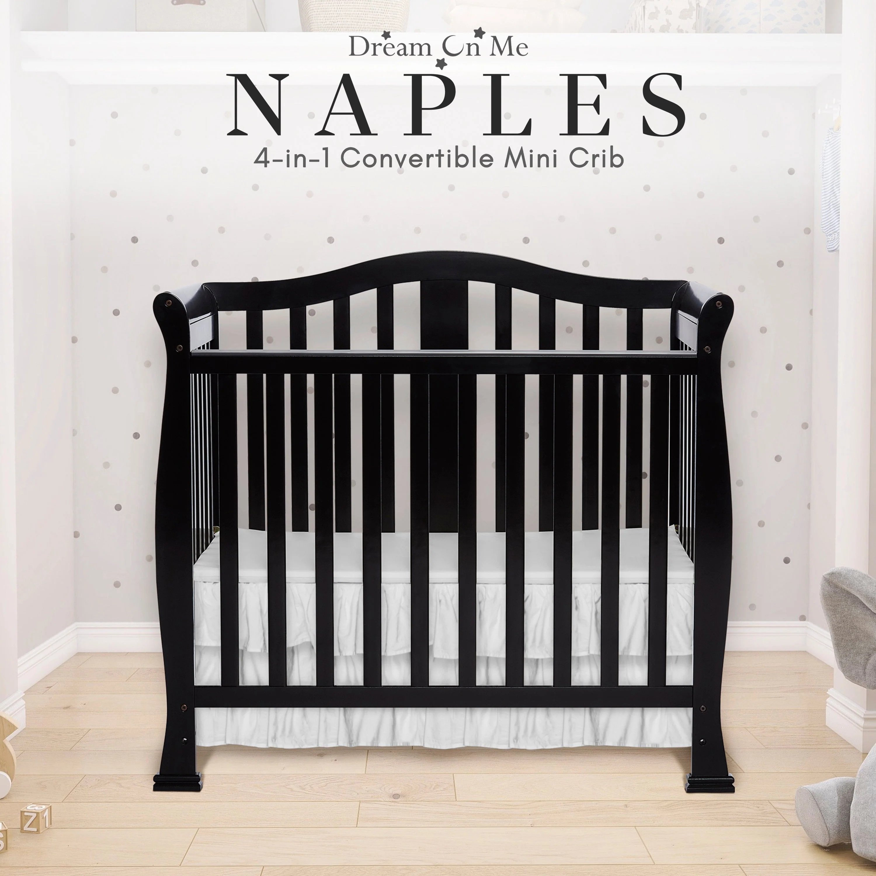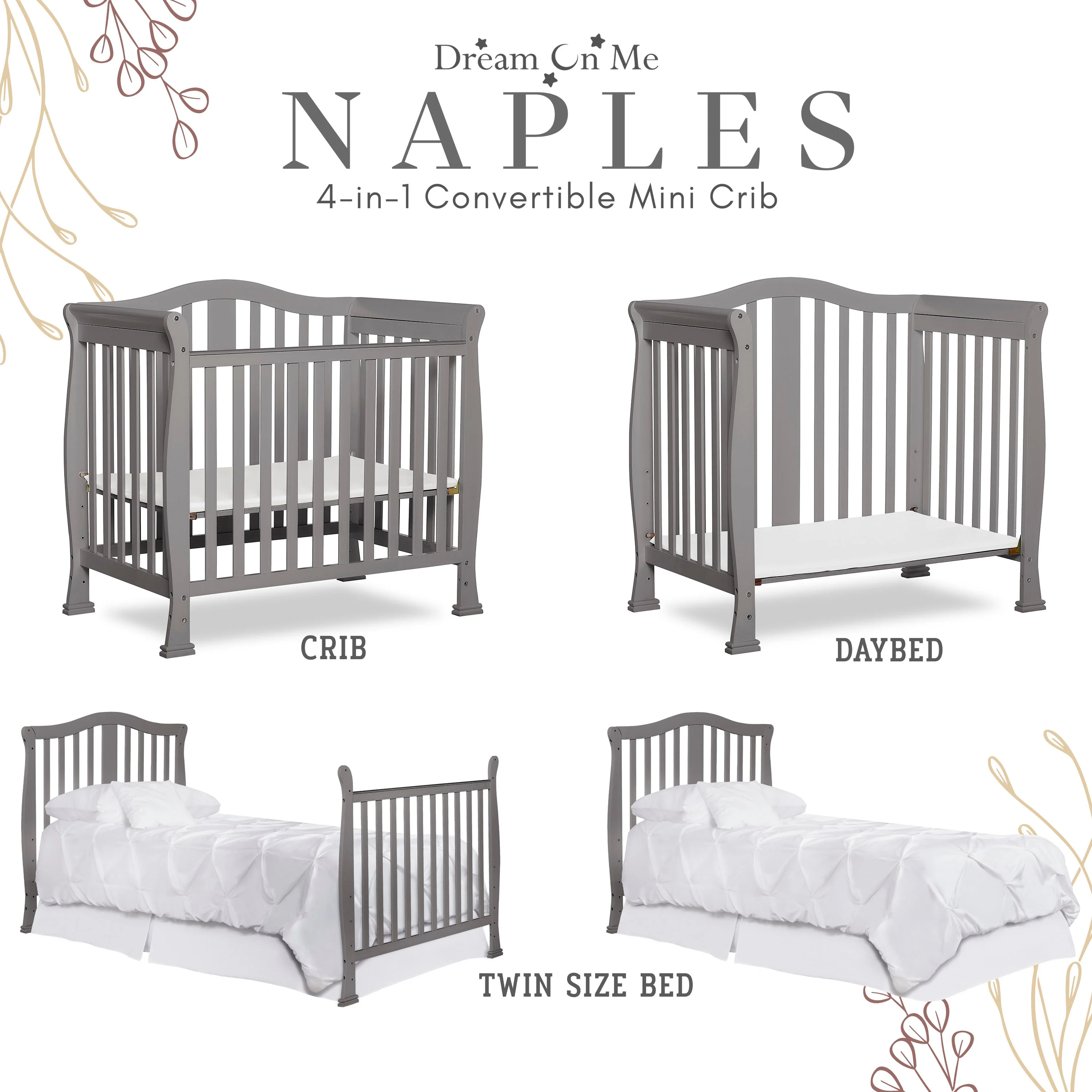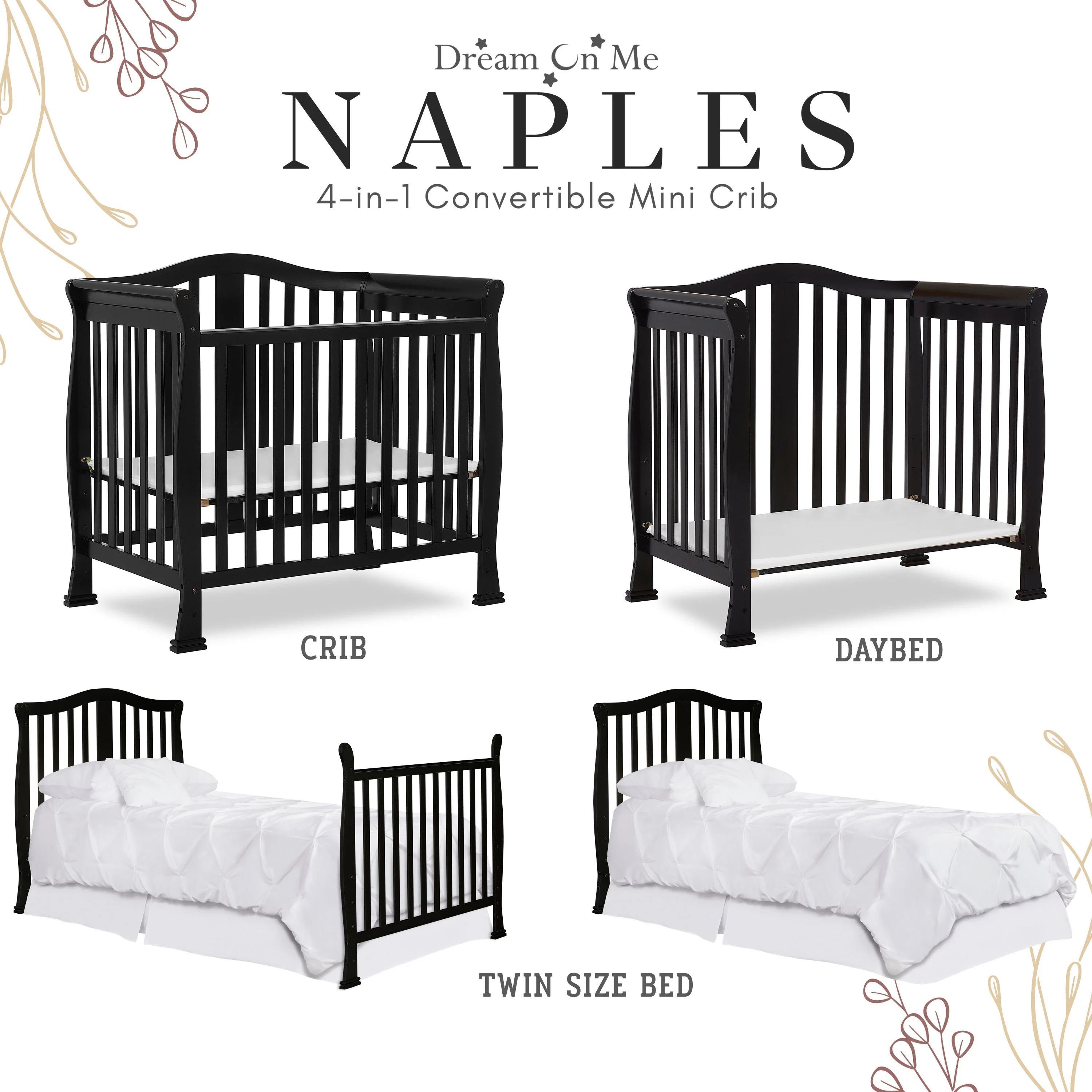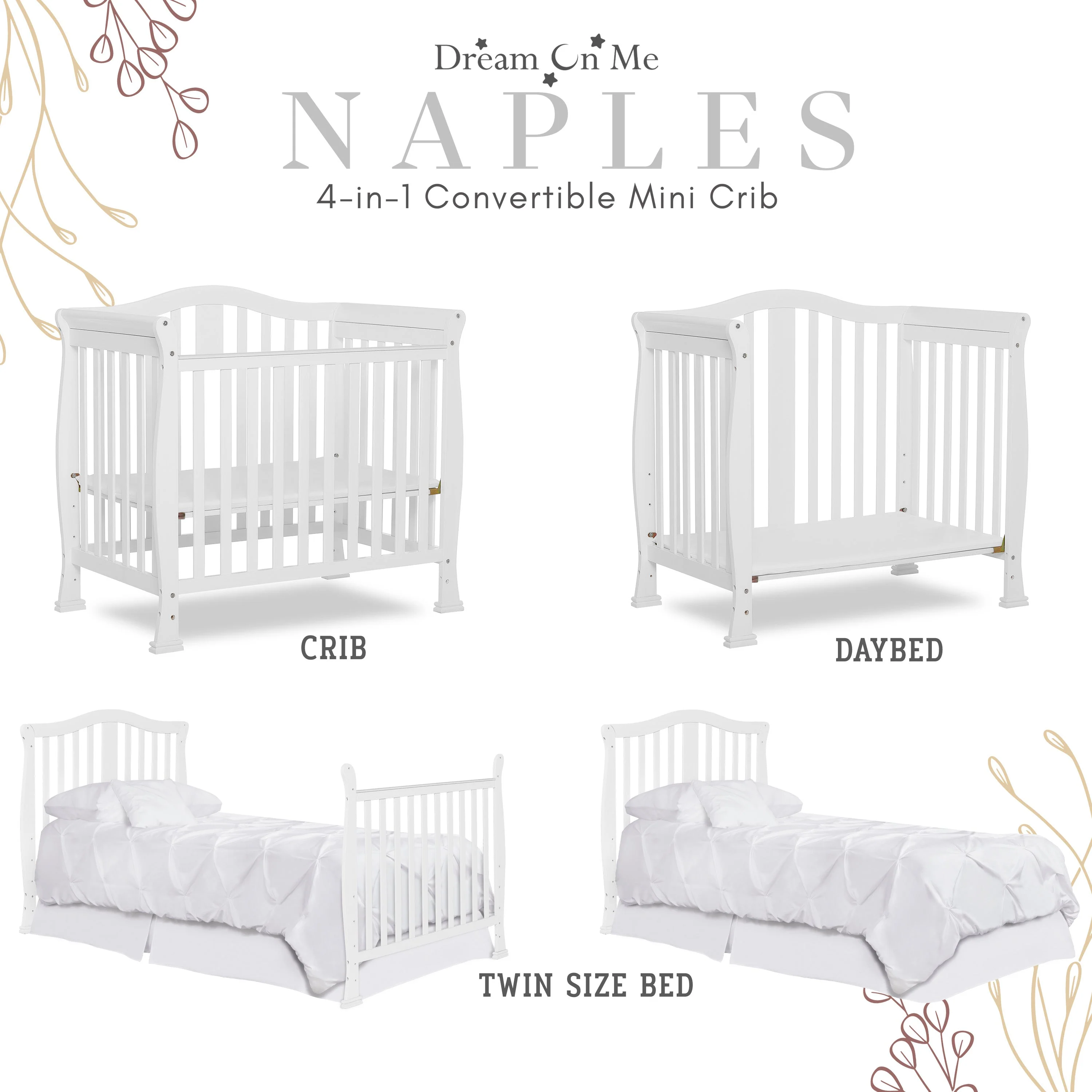- CONVERTIBILITY OPTIONS: Use the Naples 4-in-1 Convertible Mini Crib as a mini crib, mini daybed and twin-size bed to keep pace with your child! Comfortable and compact, it’s ideal to free up nursery space or to use in grandma’s home