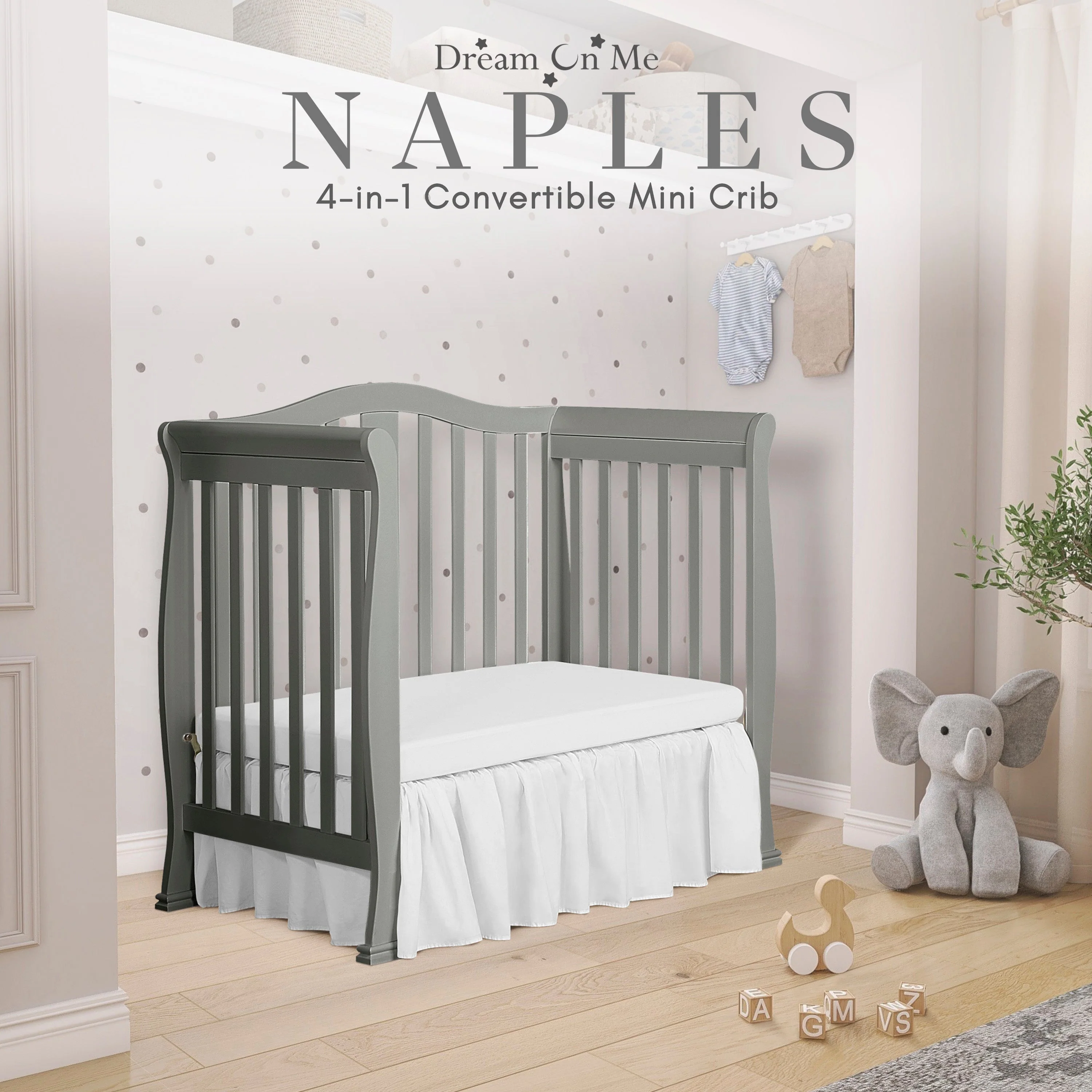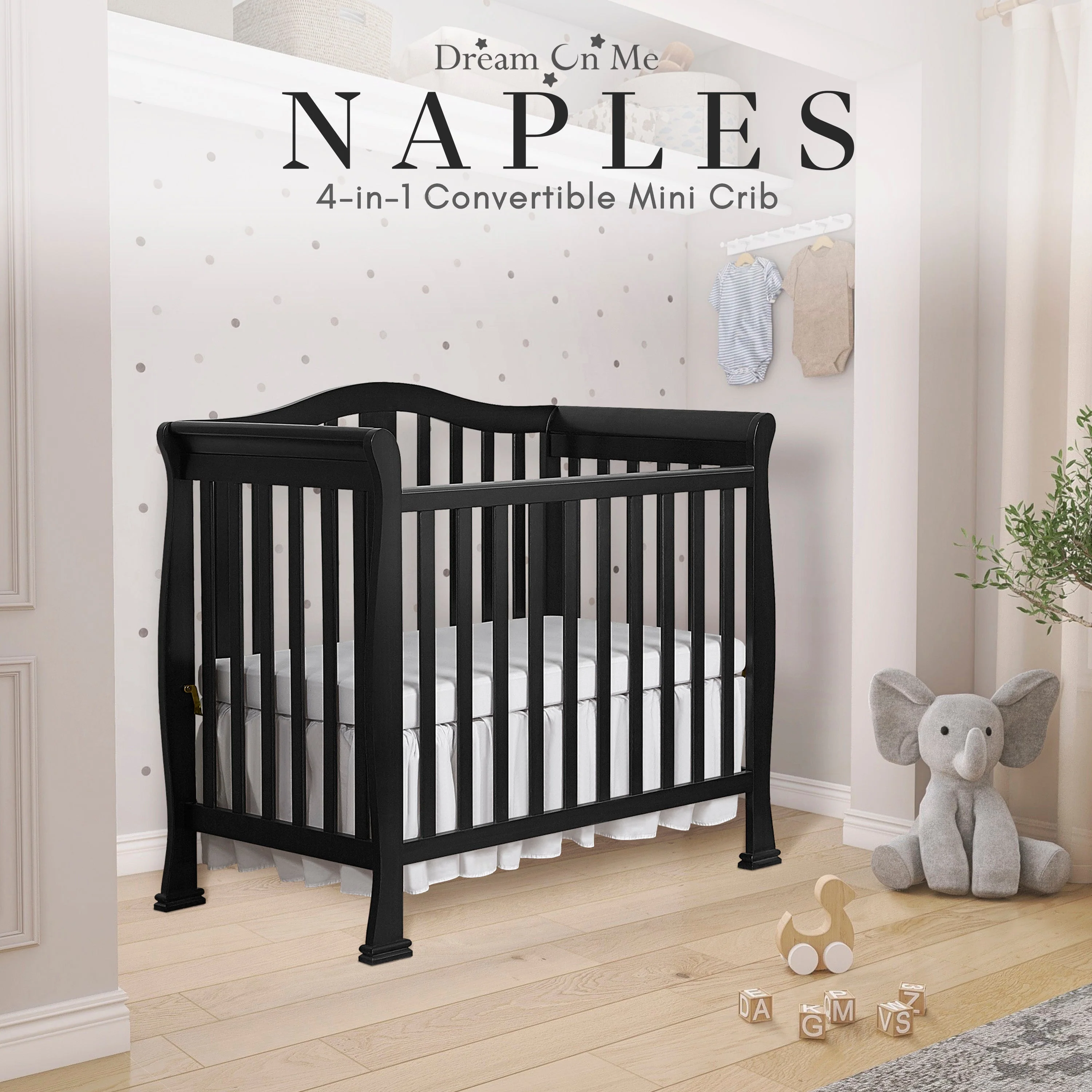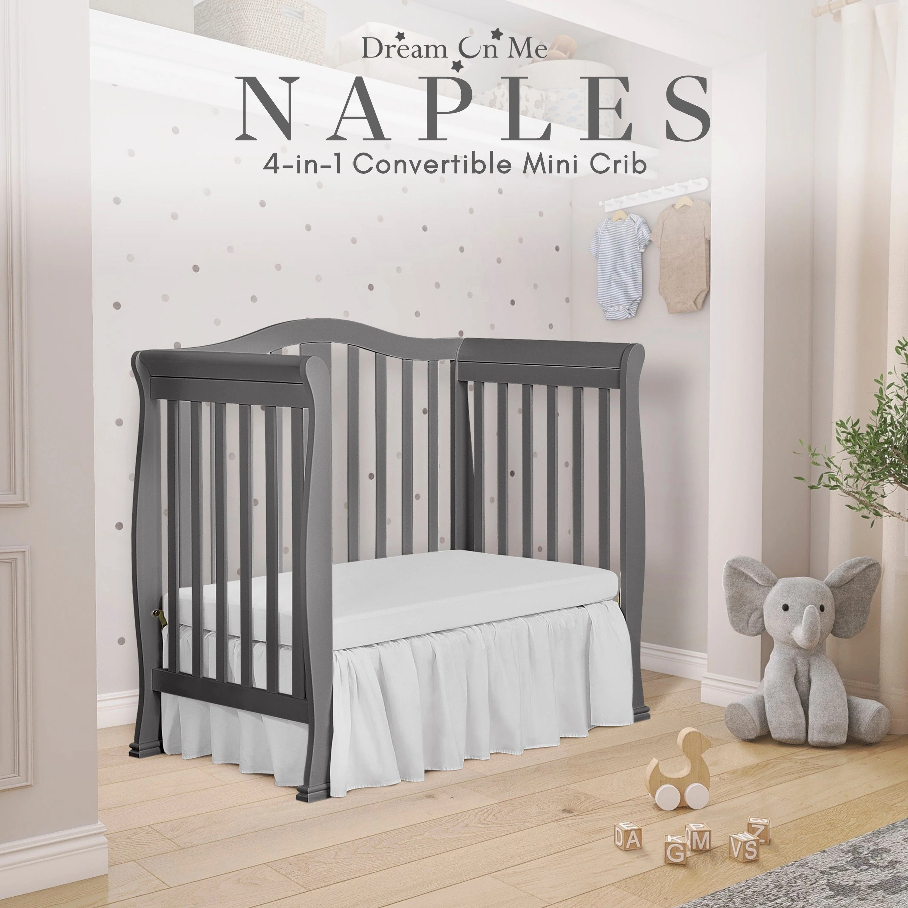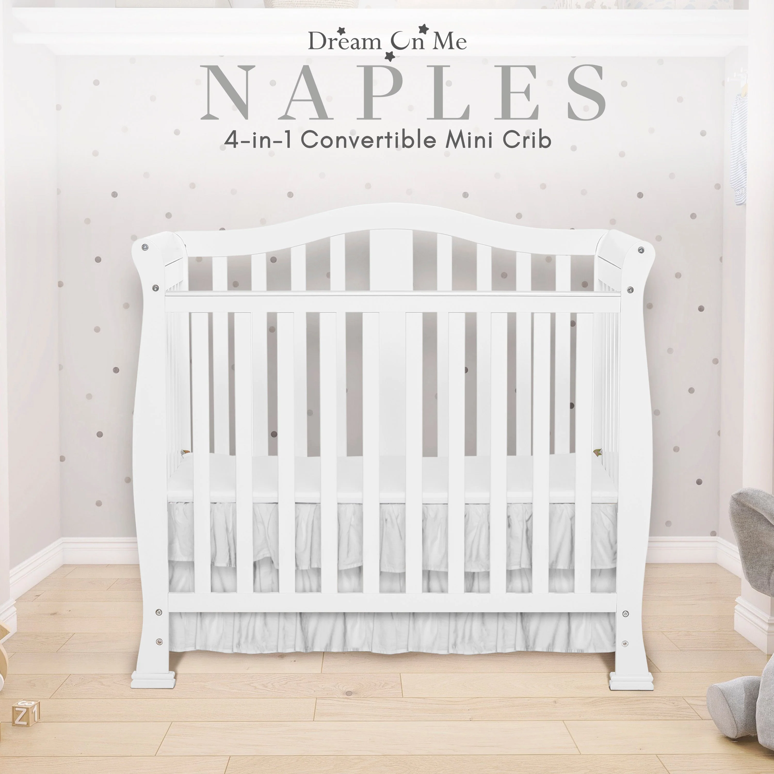 - CONVERTIBILITY OPTIONS: Use the Naples 4-in-1 Convertible Mini Crib as a mini crib, mini daybed and twin-size bed to keep pace with your child! Comfortable and compact, it’s ideal to free up nursery space or to use in grandma’s home
