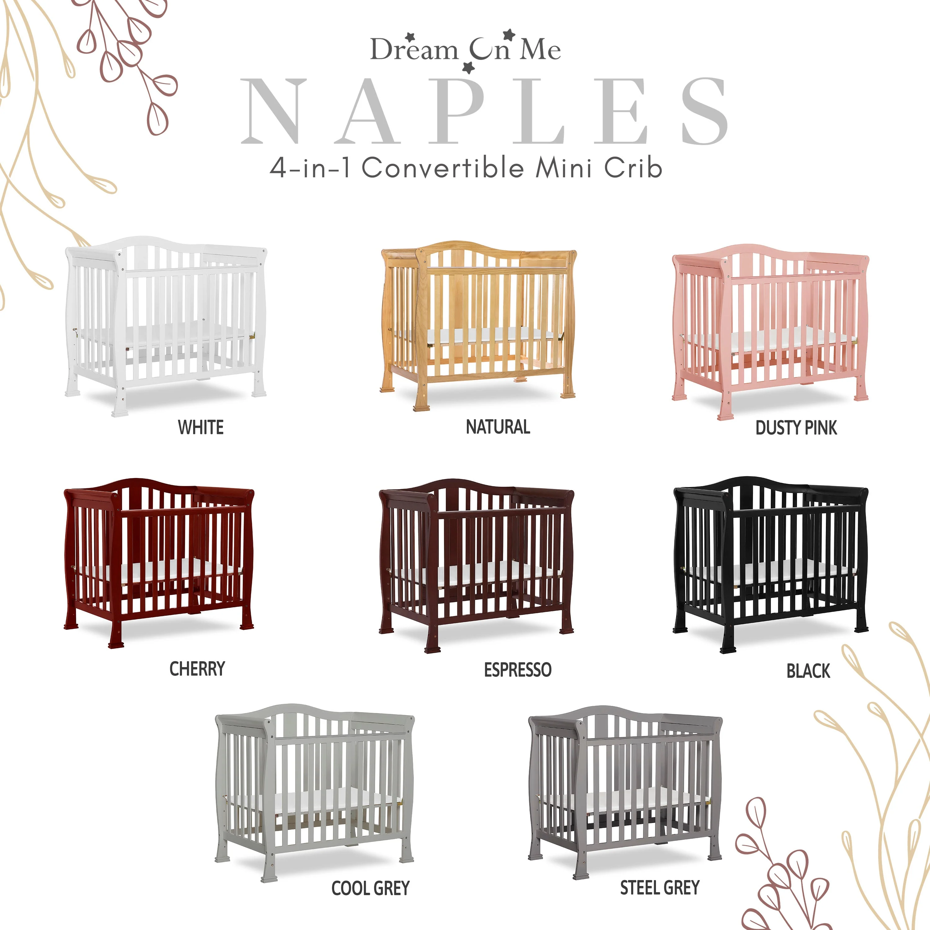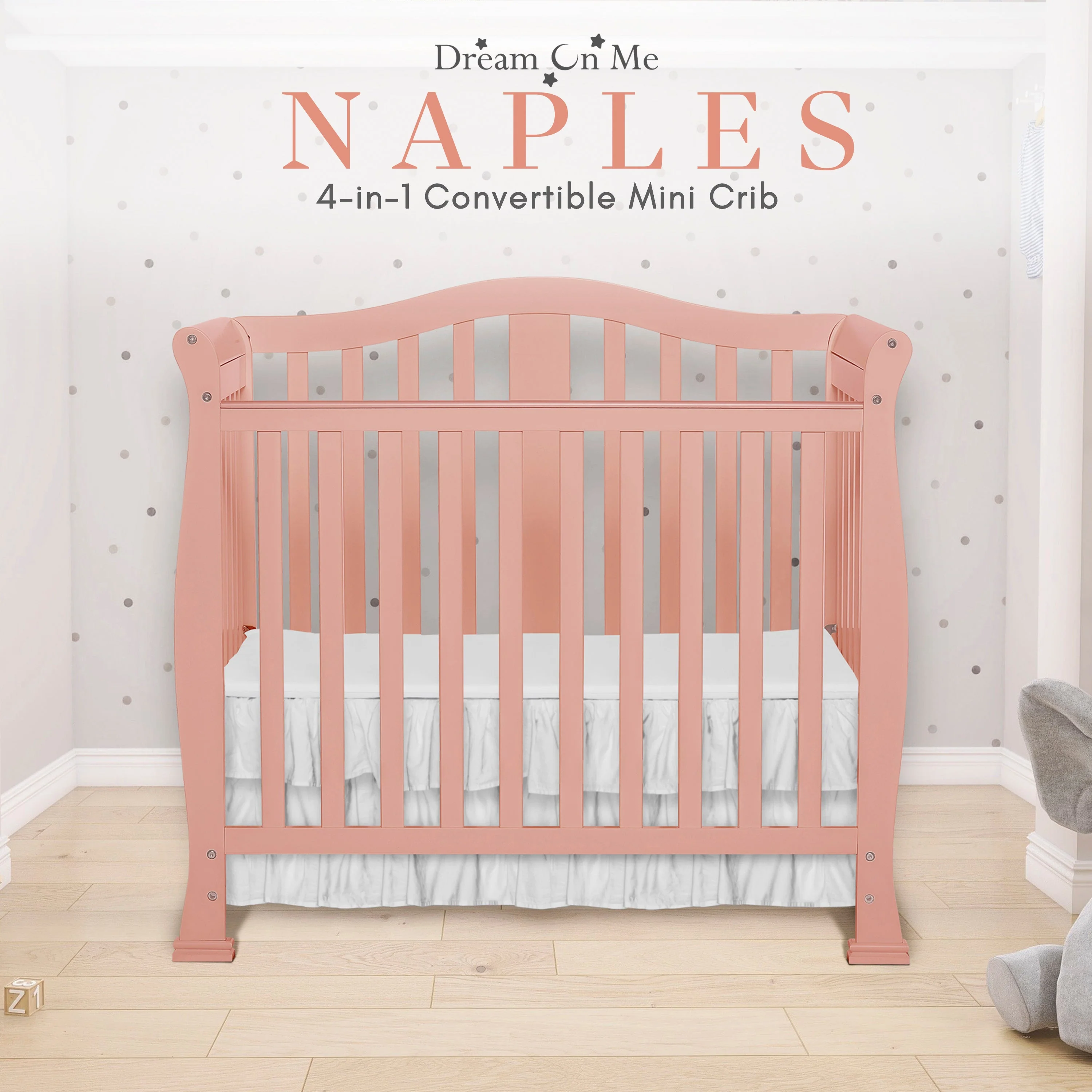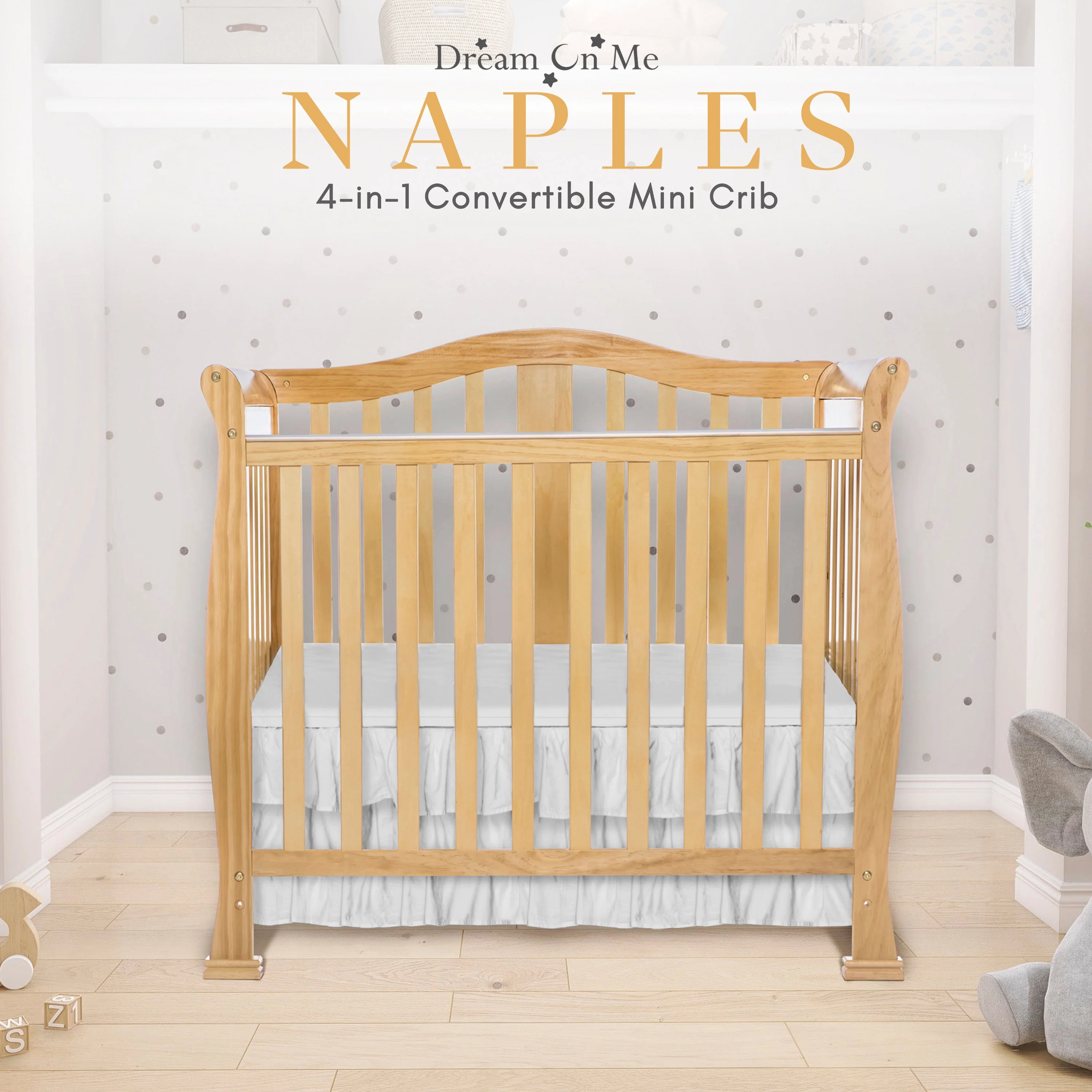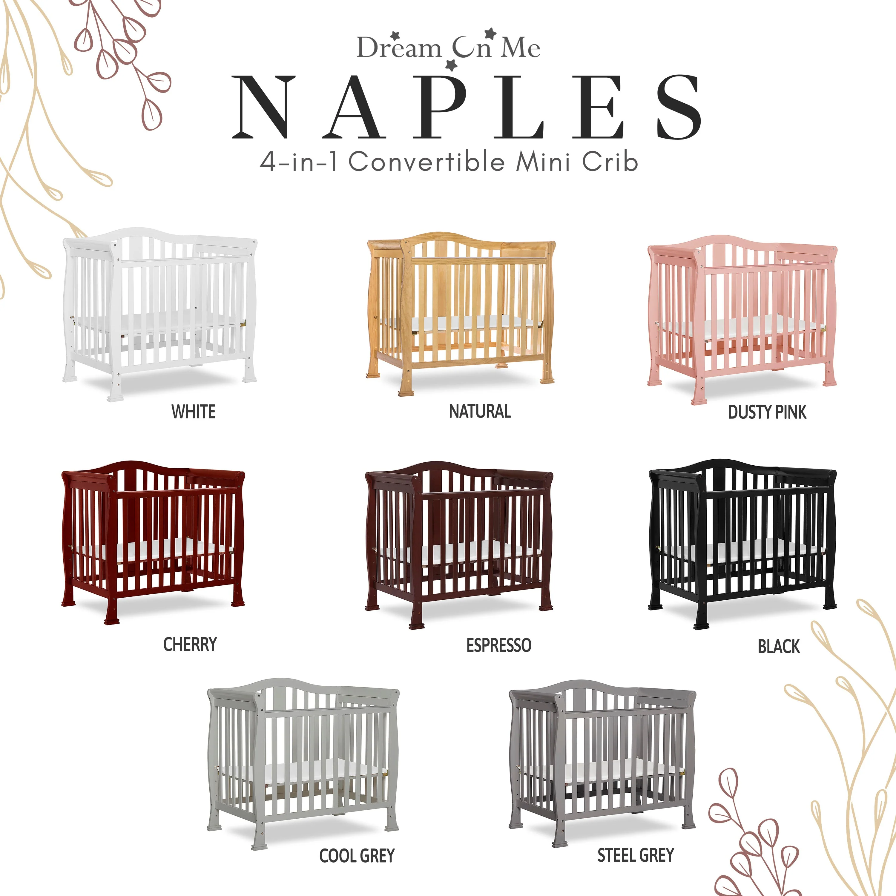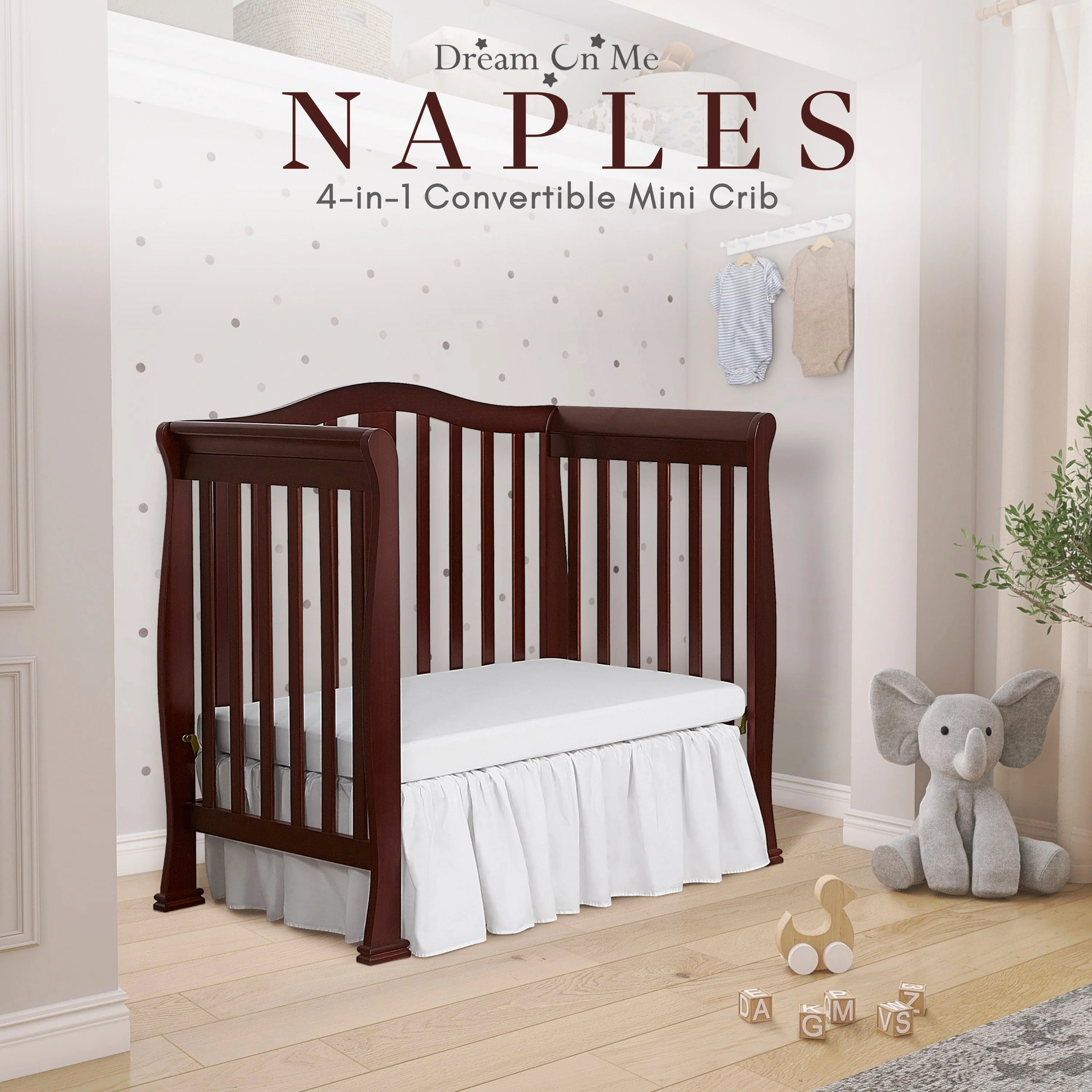 - CONVERTIBILITY OPTIONS: Use the Naples 4-in-1 Convertible Mini Crib as a mini crib, mini daybed and twin-size bed to keep pace with your child! Comfortable and compact, it’s ideal to free up nursery space or to use in grandma’s home