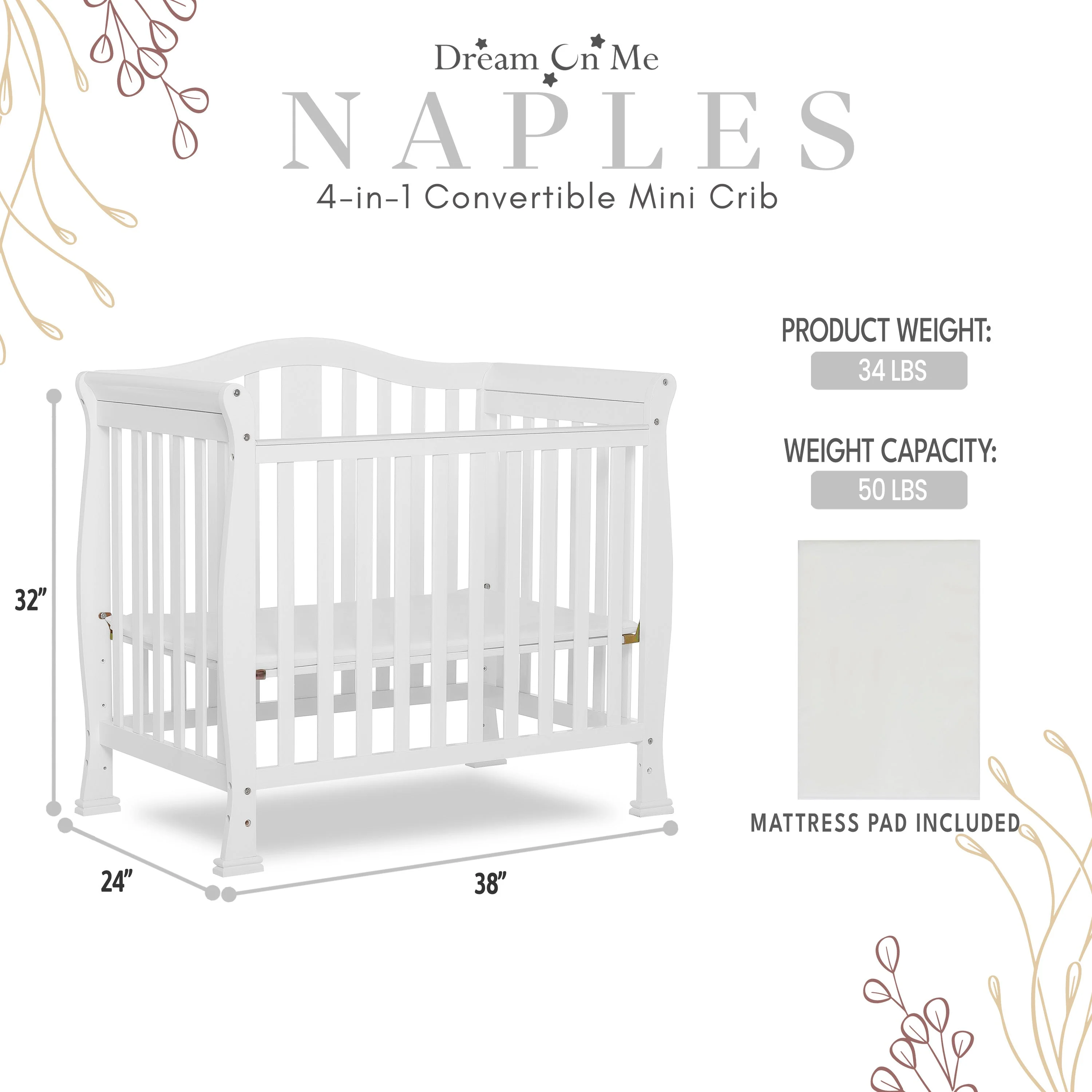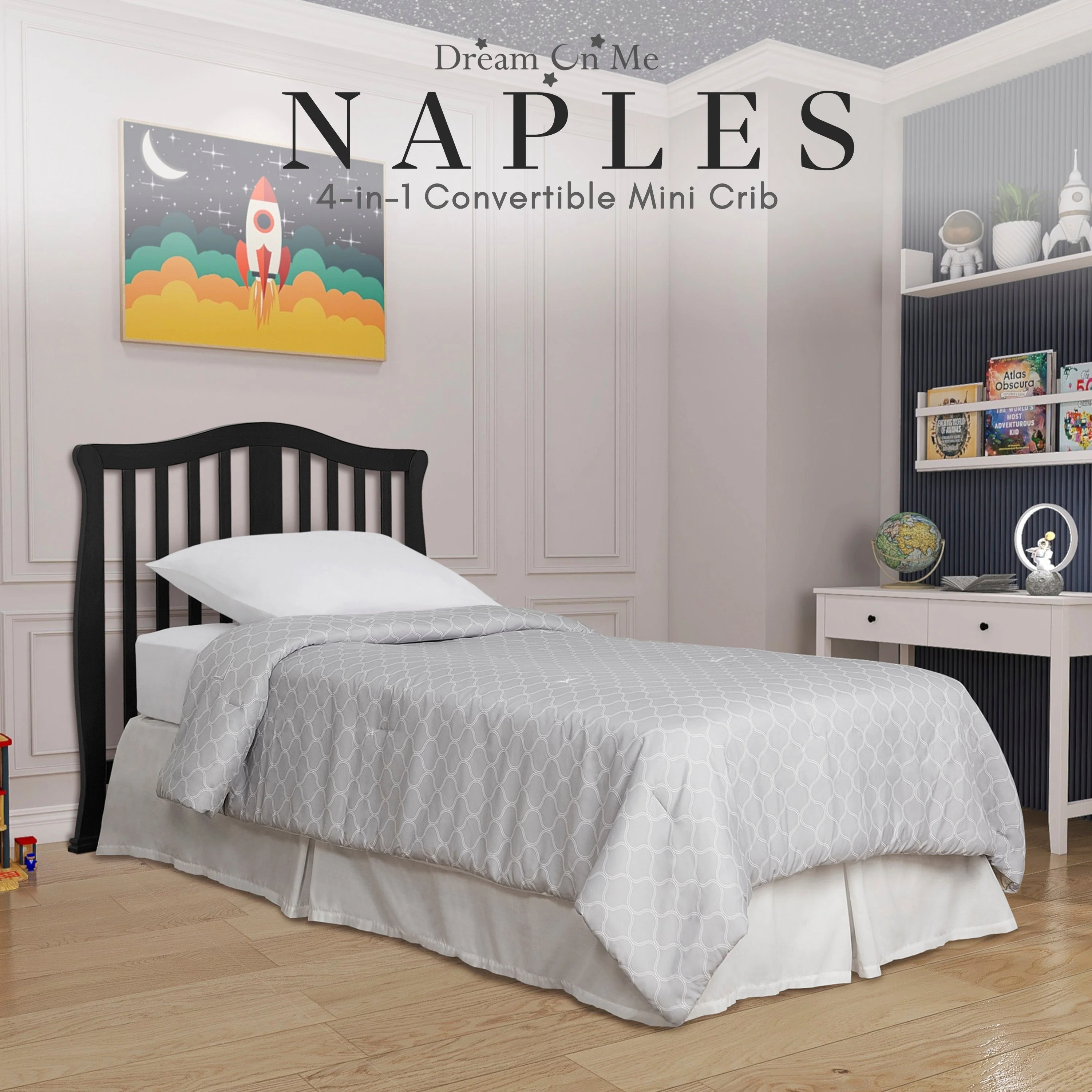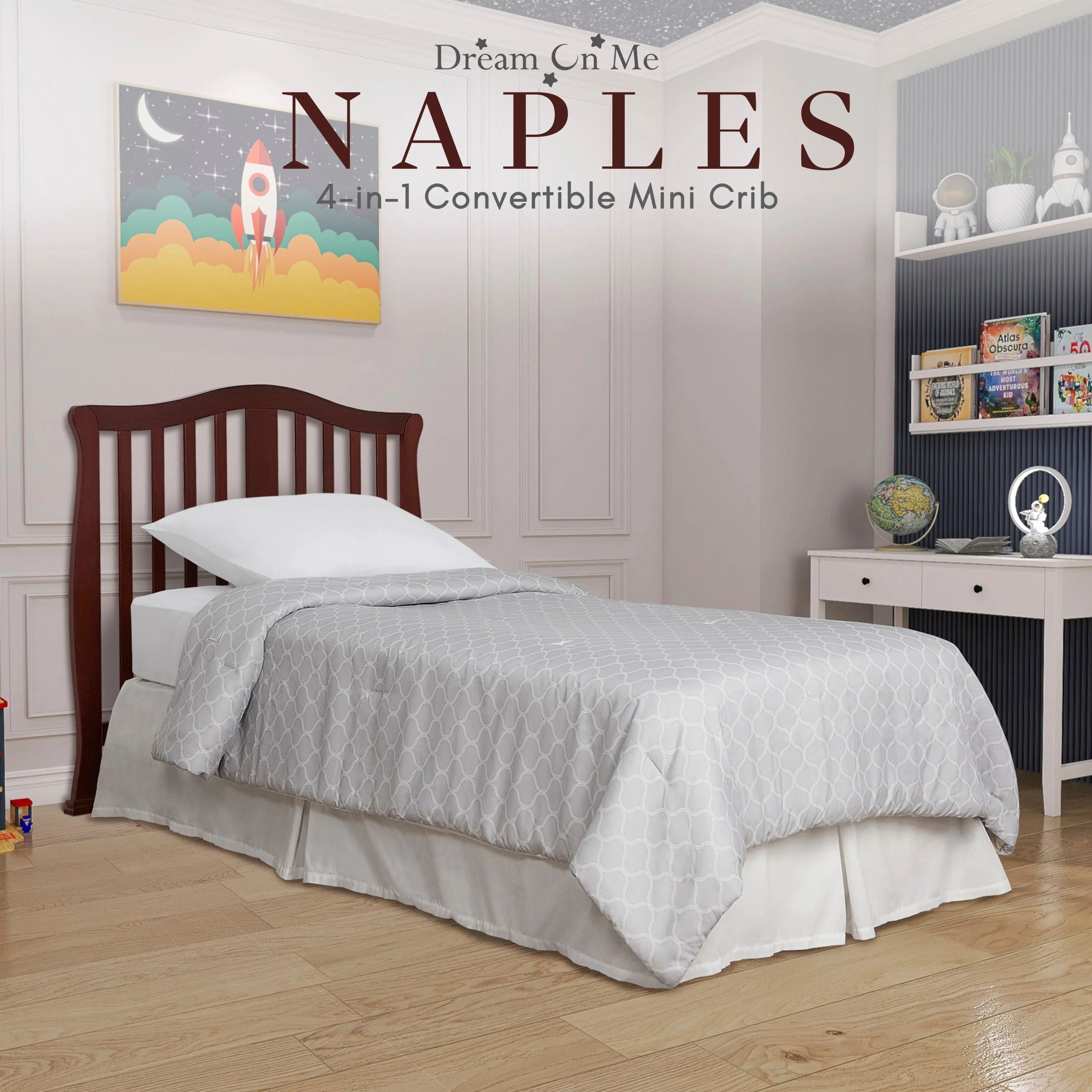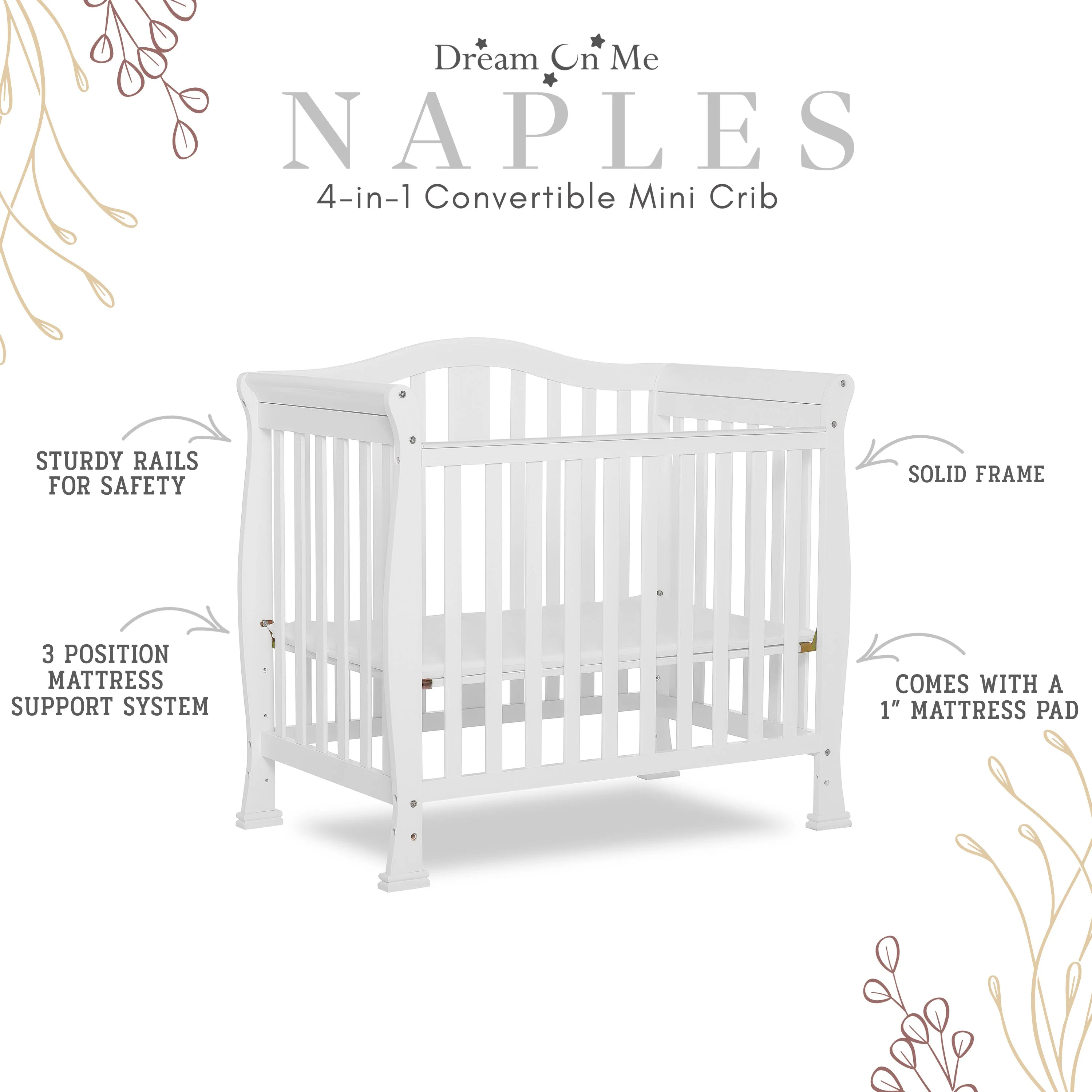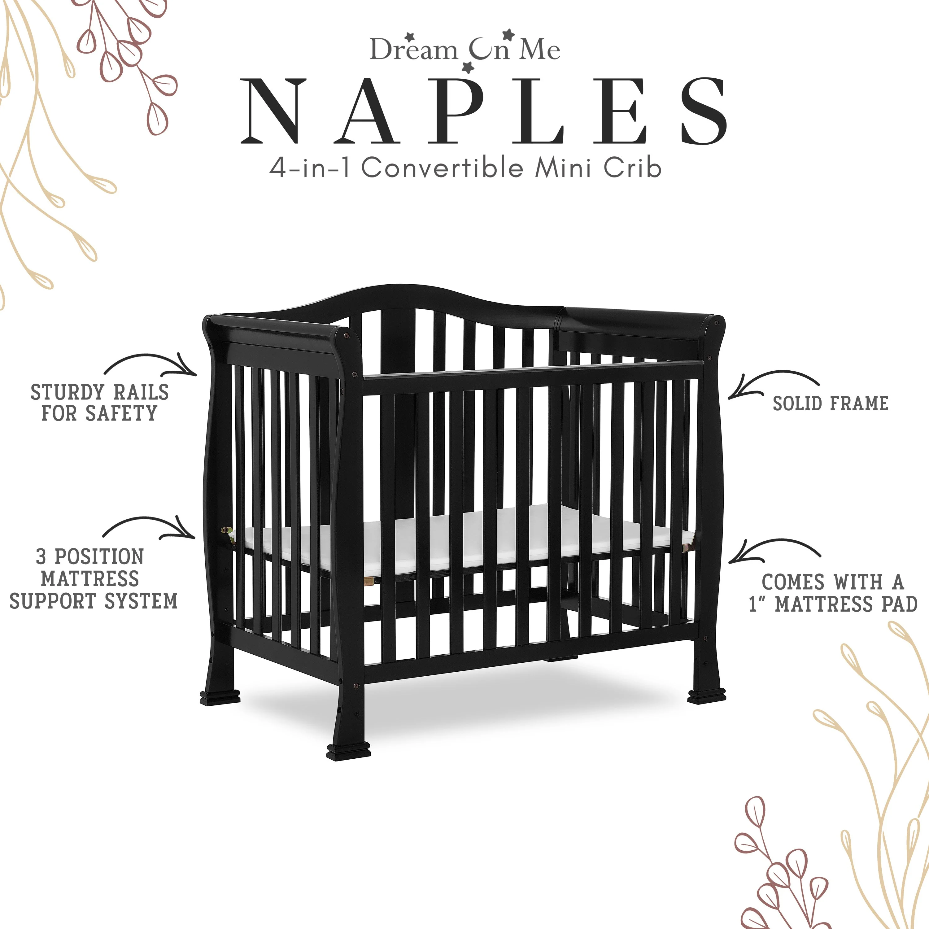 - CONVERTIBILITY OPTIONS: Use the Naples 4-in-1 Convertible Mini Crib as a mini crib, mini daybed and twin-size bed to keep pace with your child! Comfortable and compact, it’s ideal to free up nursery space or to use in grandma’s home
