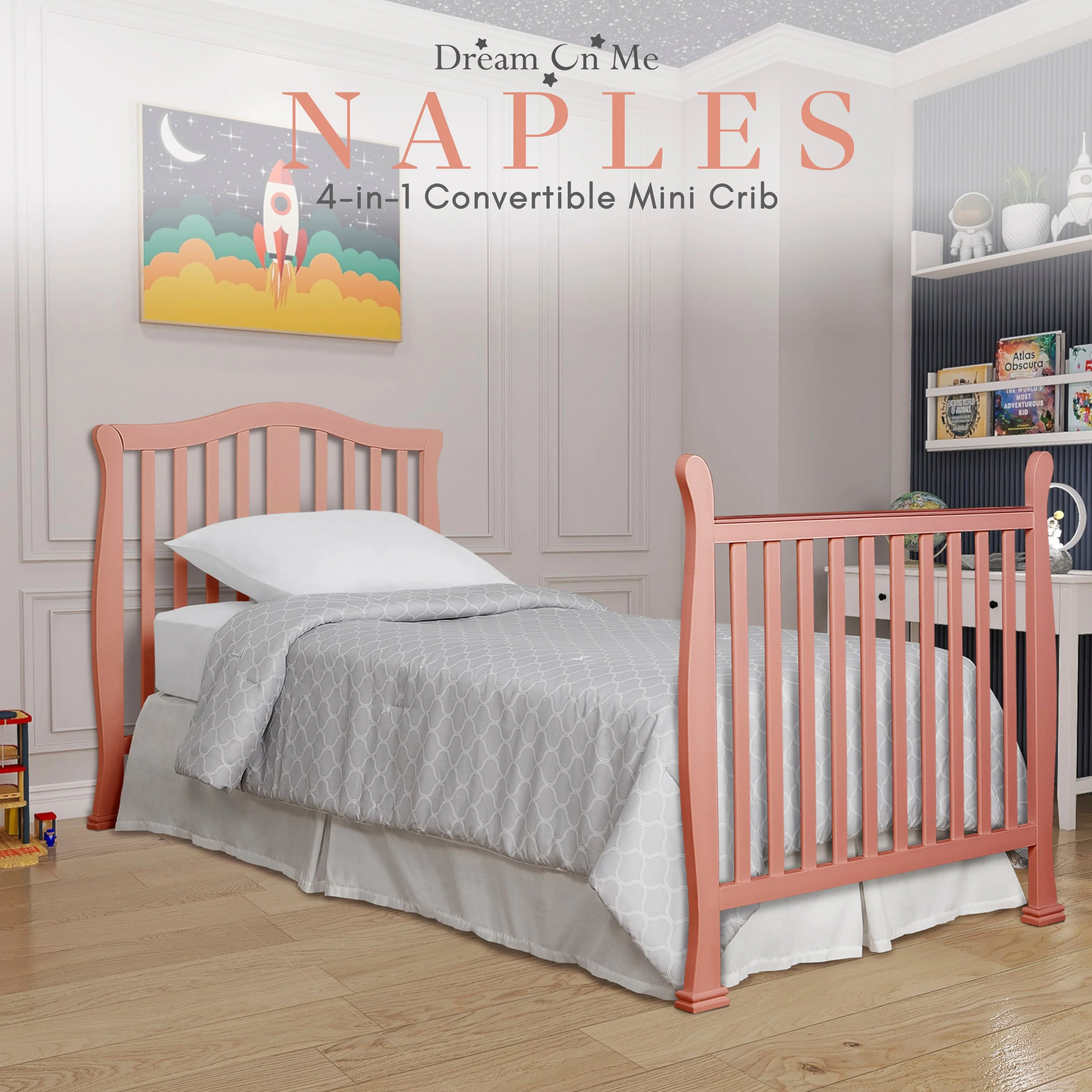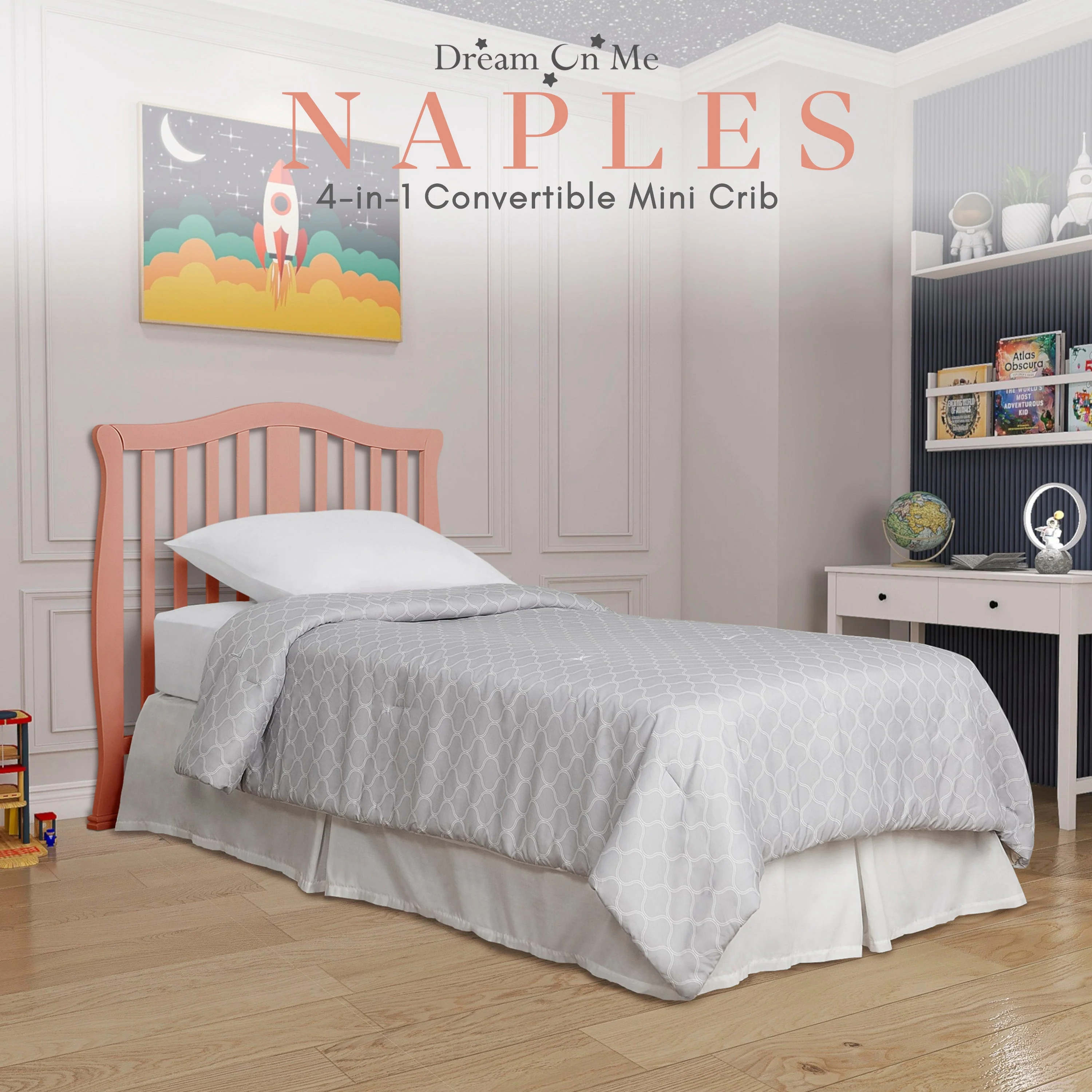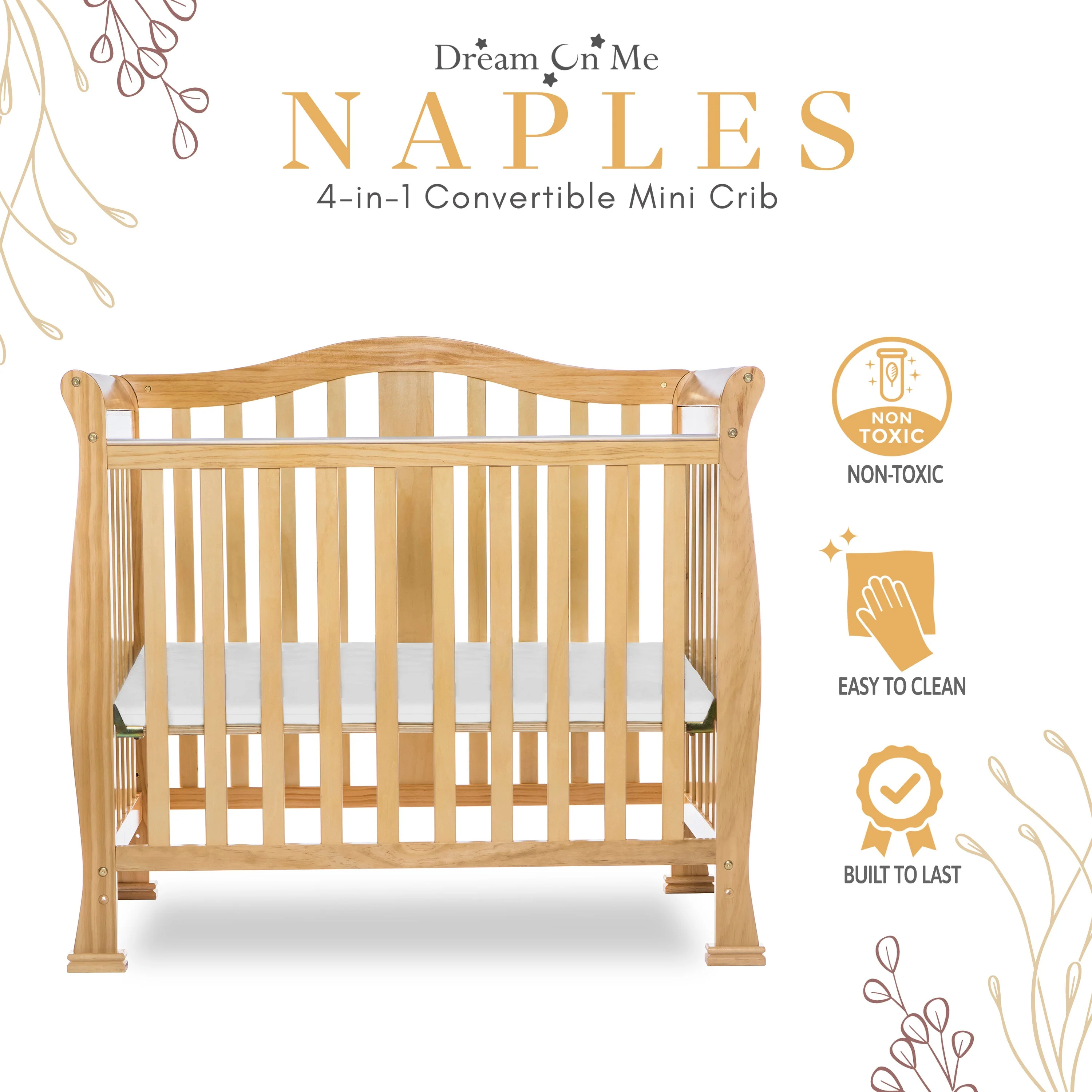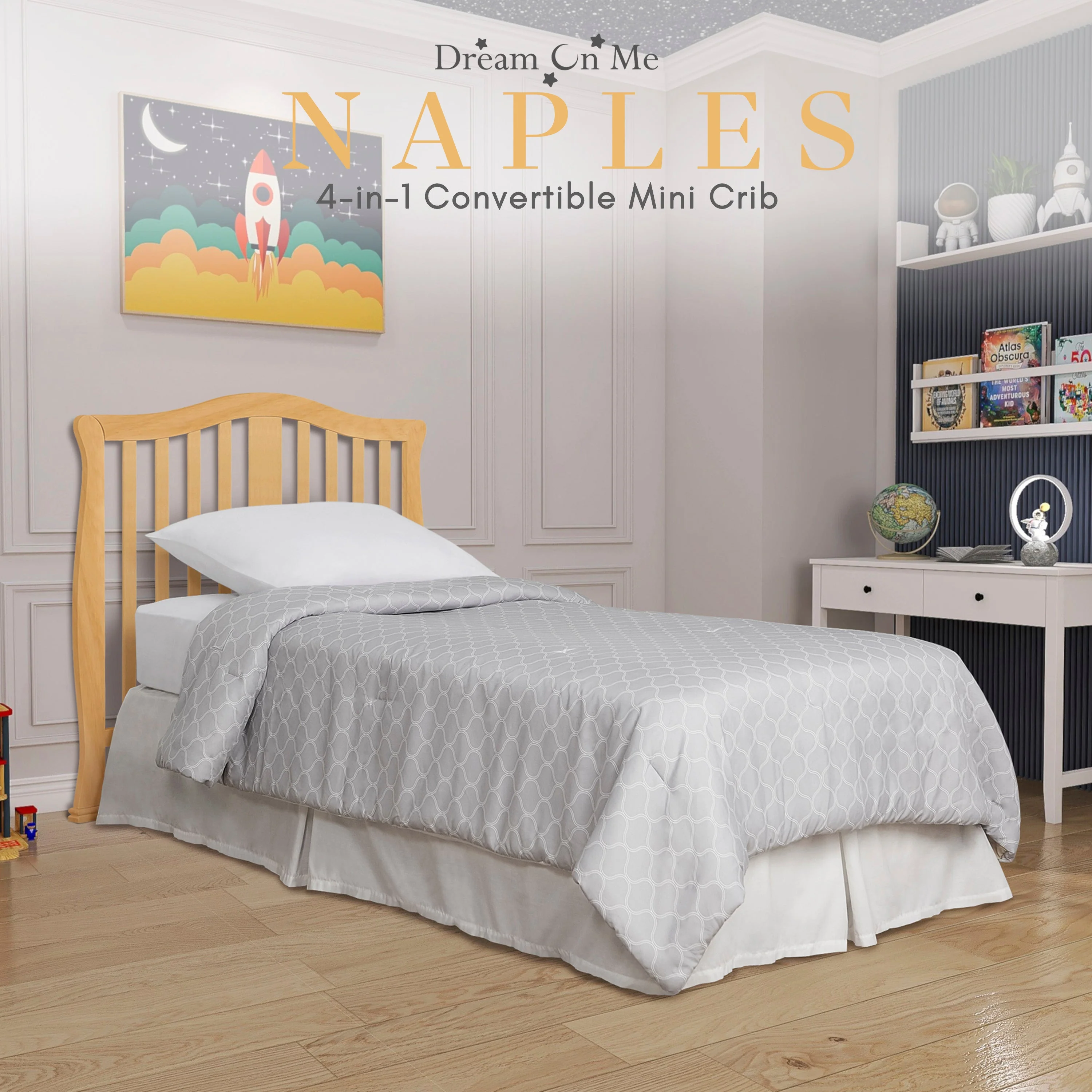 - CONVERTIBILITY OPTIONS: Use the Naples 4-in-1 Convertible Mini Crib as a mini crib, mini daybed and twin-size bed to keep pace with your child! Comfortable and compact, it’s ideal to free up nursery space or to use in grandma’s home