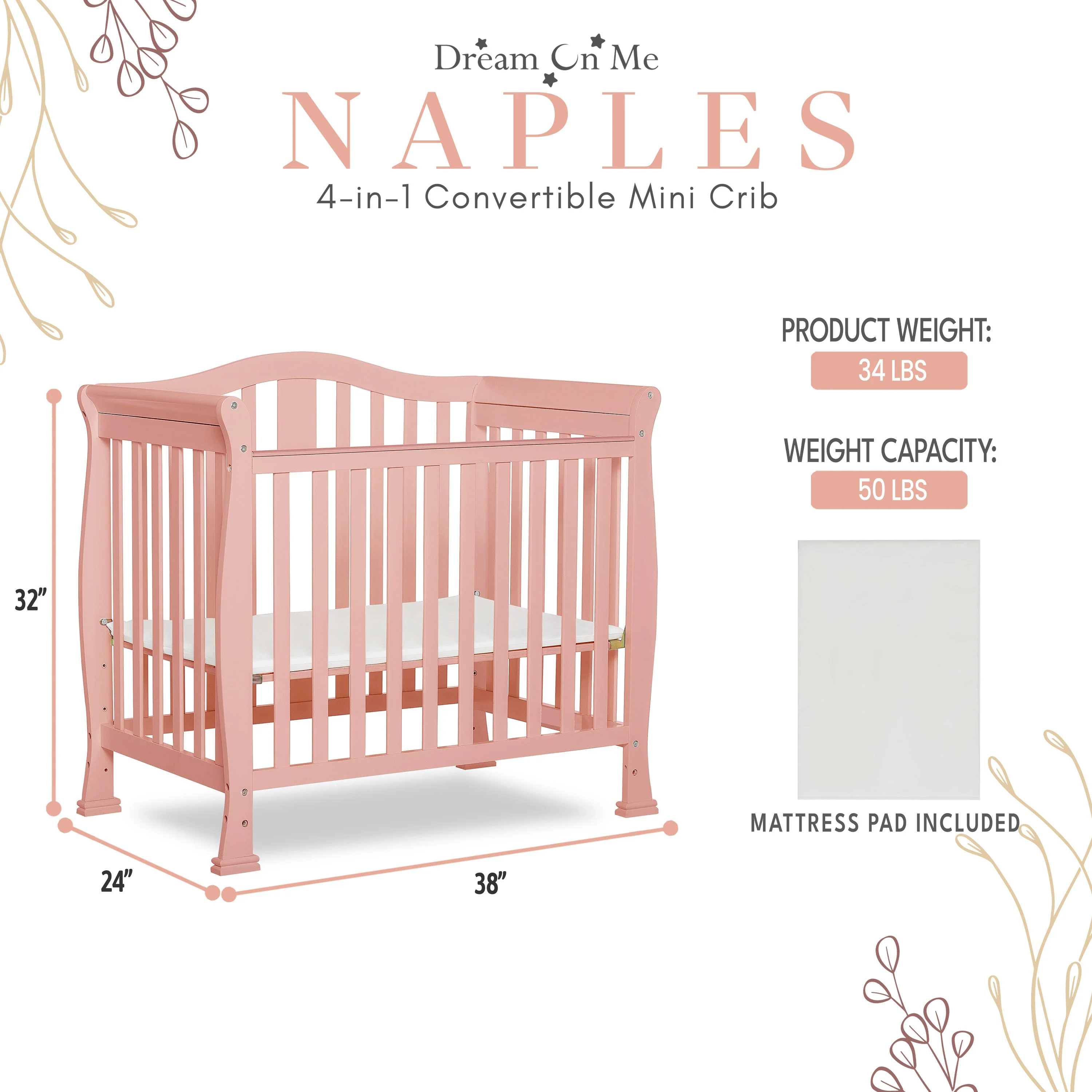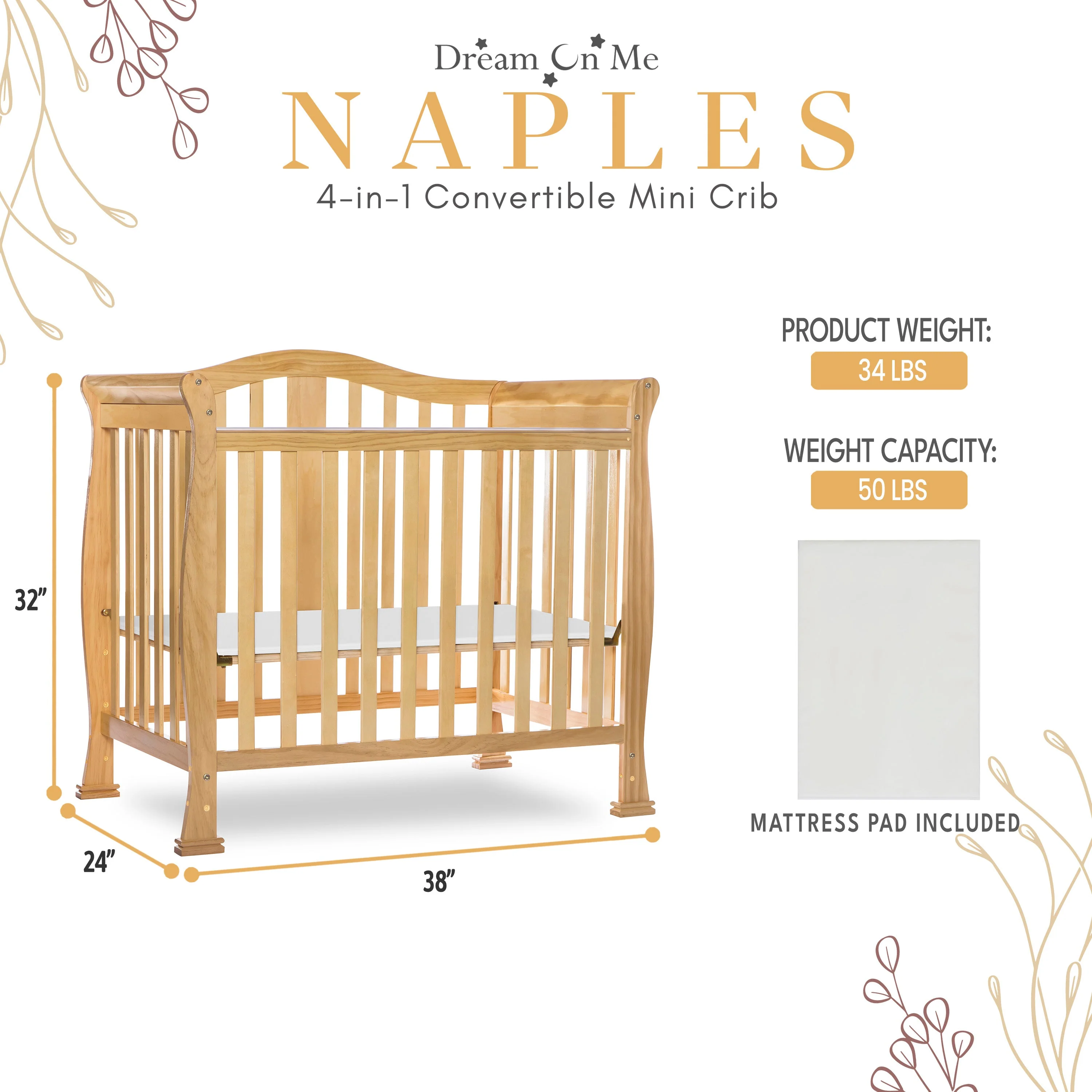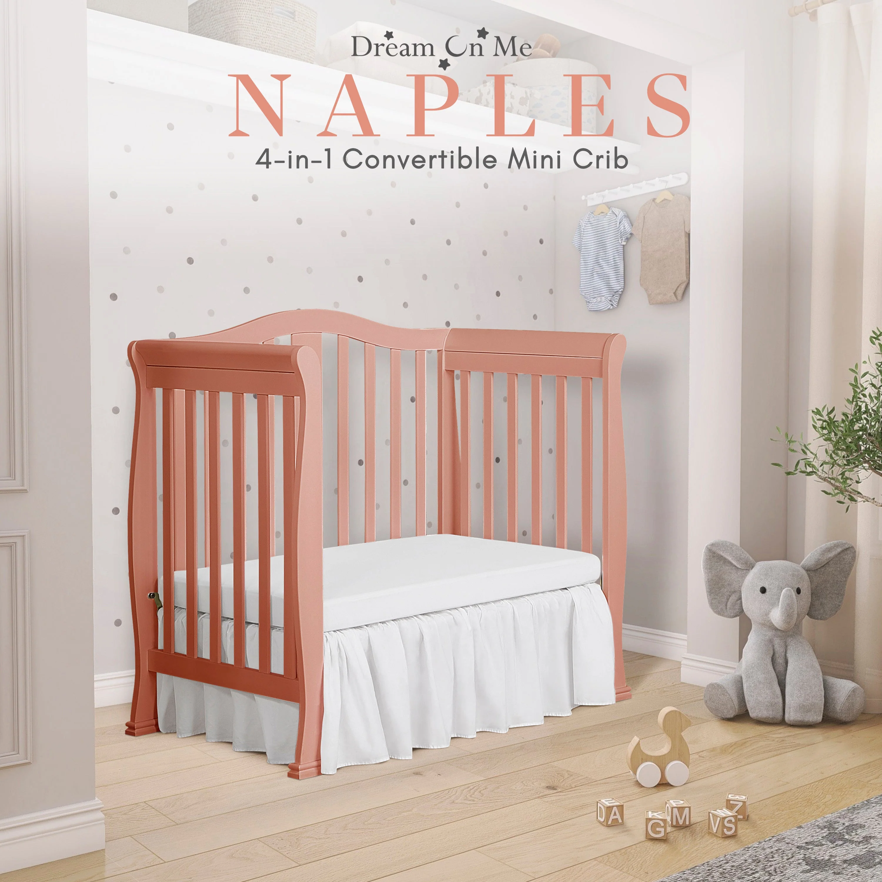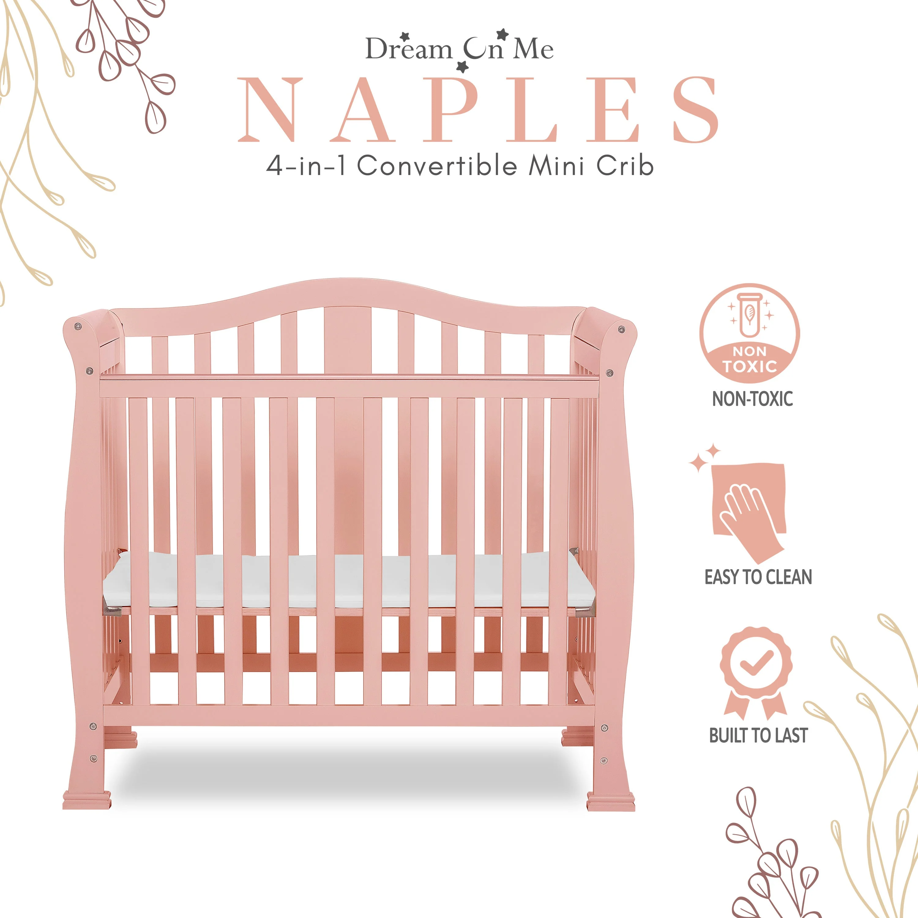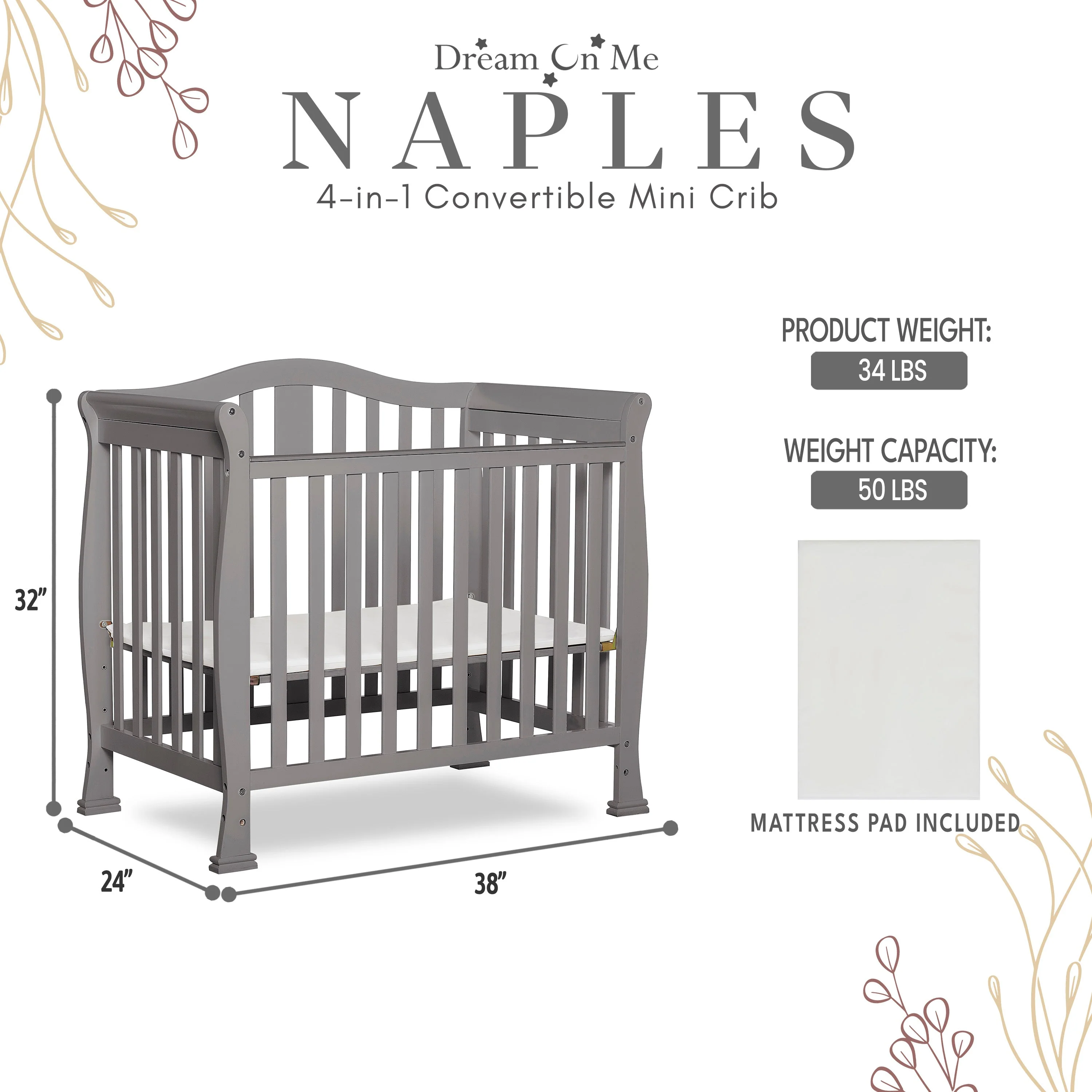 - CONVERTIBILITY OPTIONS: Use the Naples 4-in-1 Convertible Mini Crib as a mini crib, mini daybed and twin-size bed to keep pace with your child! Comfortable and compact, it’s ideal to free up nursery space or to use in grandma’s home