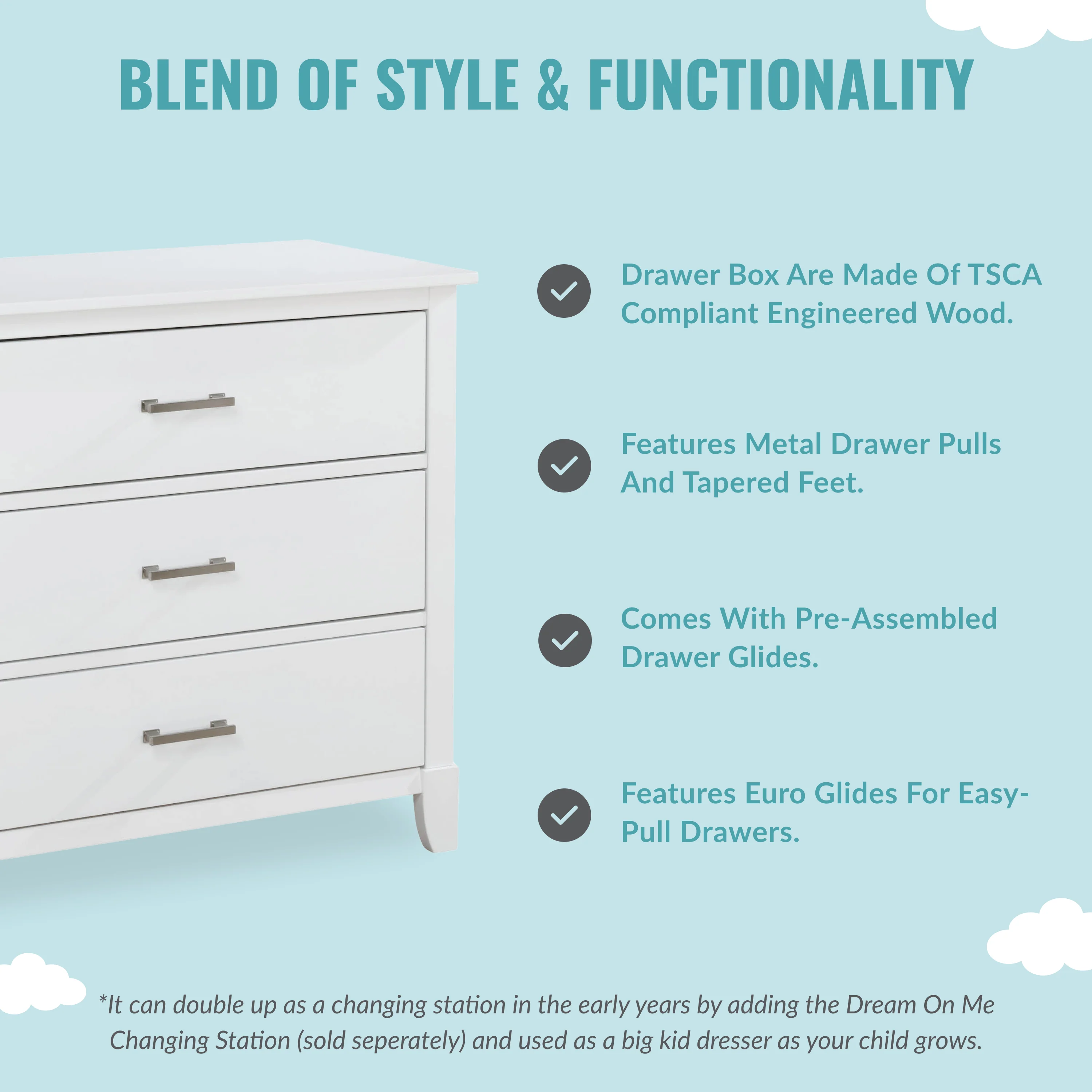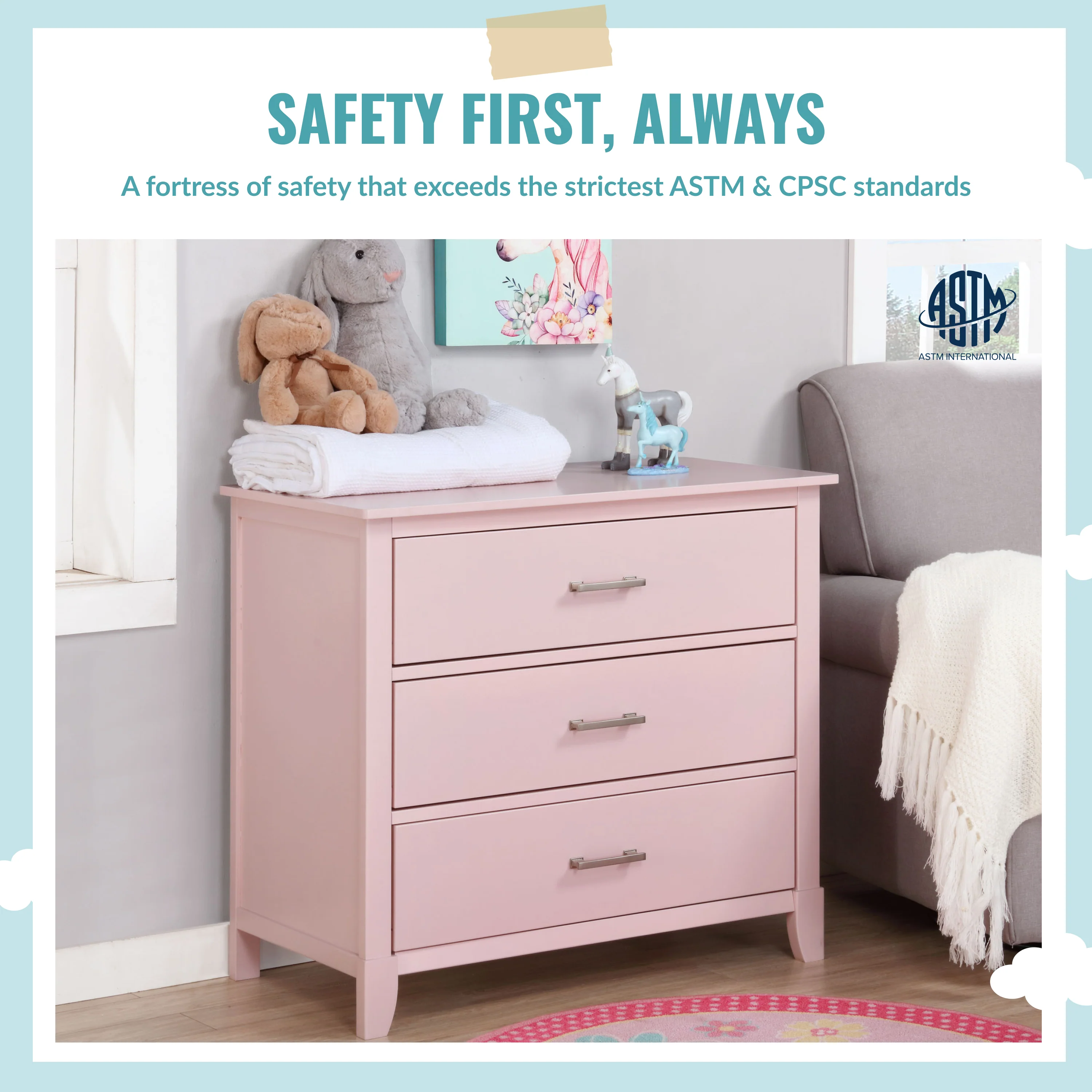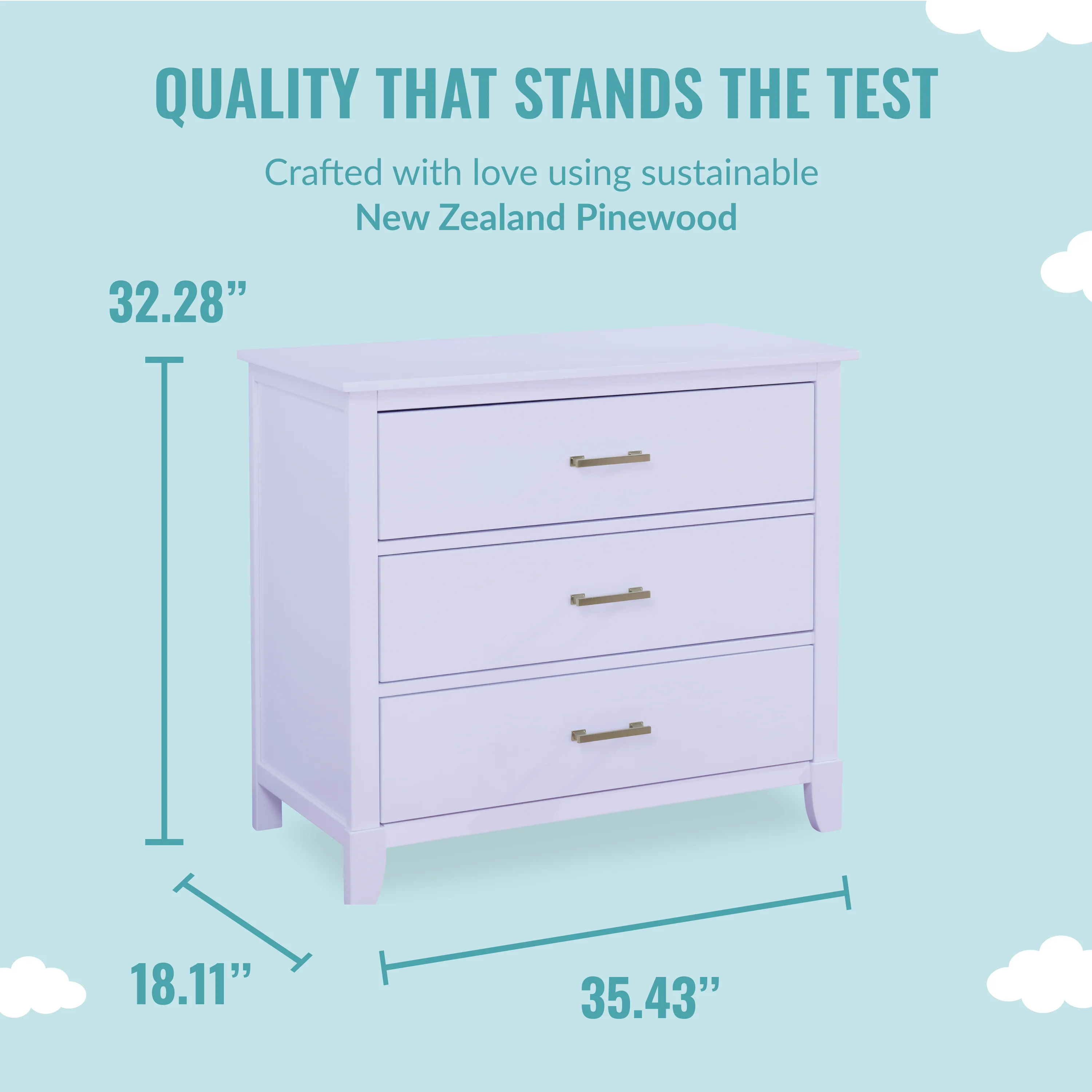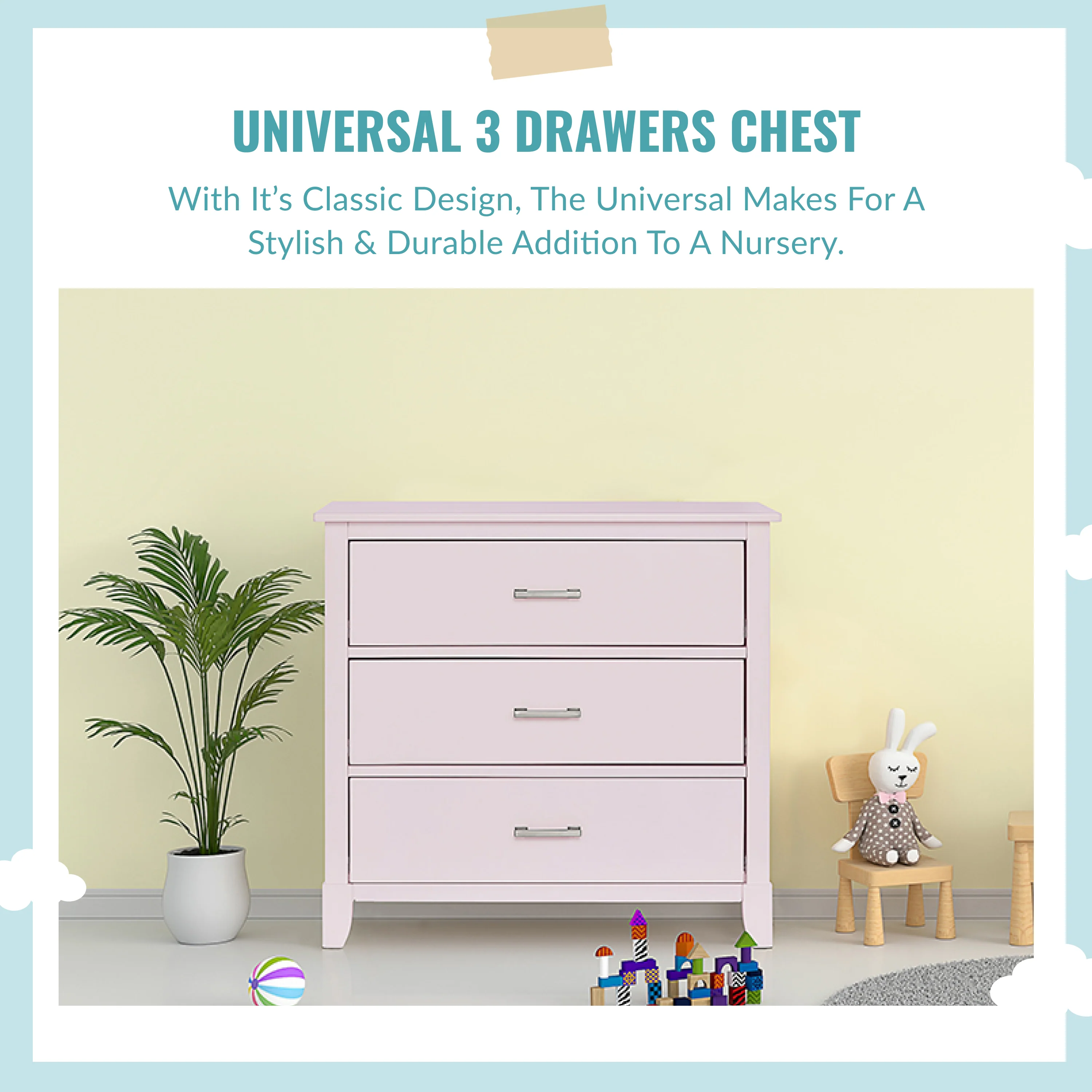 The Dream On Me Universal 3 Drawers Chest is a durable piece of nursery furniture that blends style with functionality. It comes with pre-assembled drawer glides making the assembly process a breeze. It has Euro glides which mean you can pull open drawers with ease even when your hands are full holding your LO! The Universal Chest’s classic design means it will blend with any decor theme and help you create an ageless space.