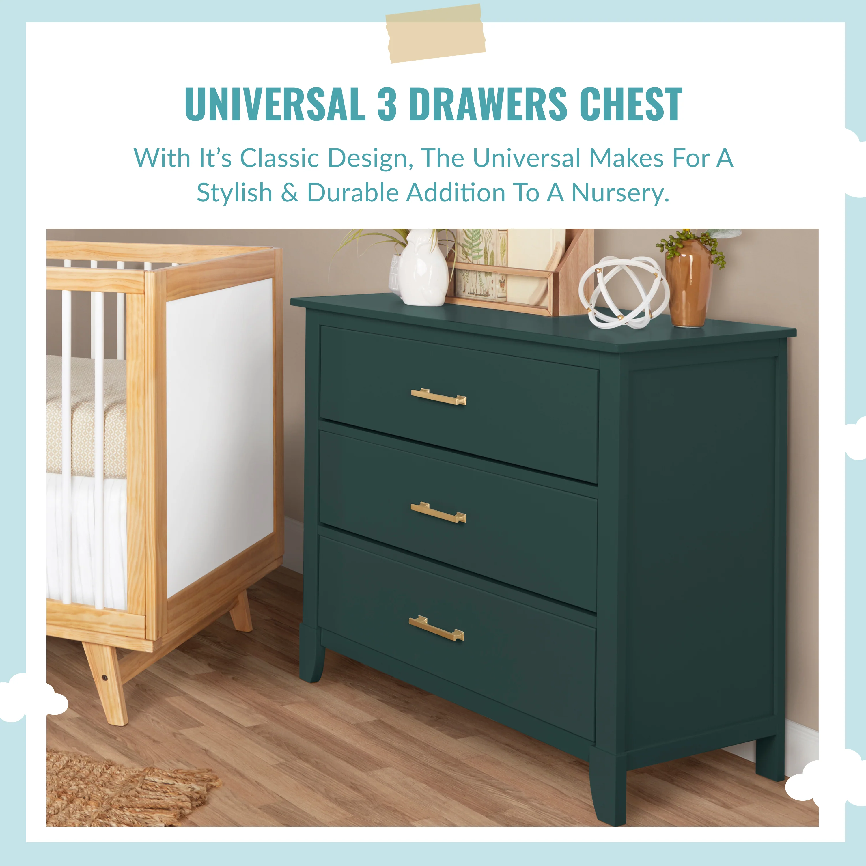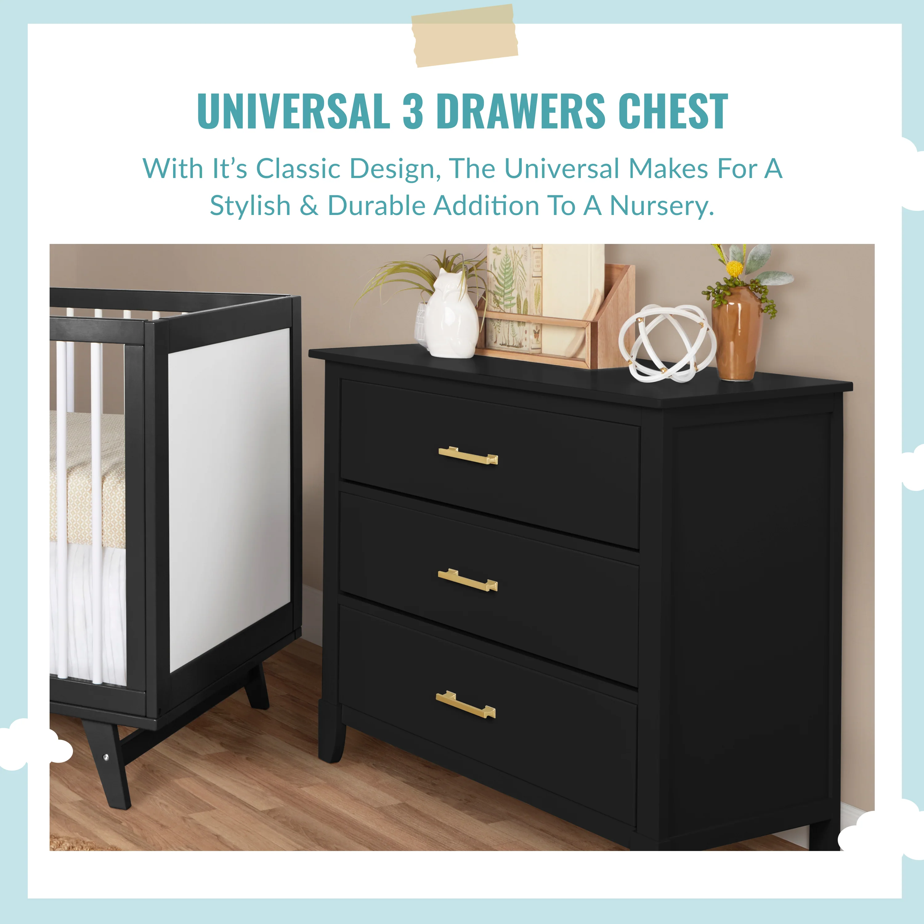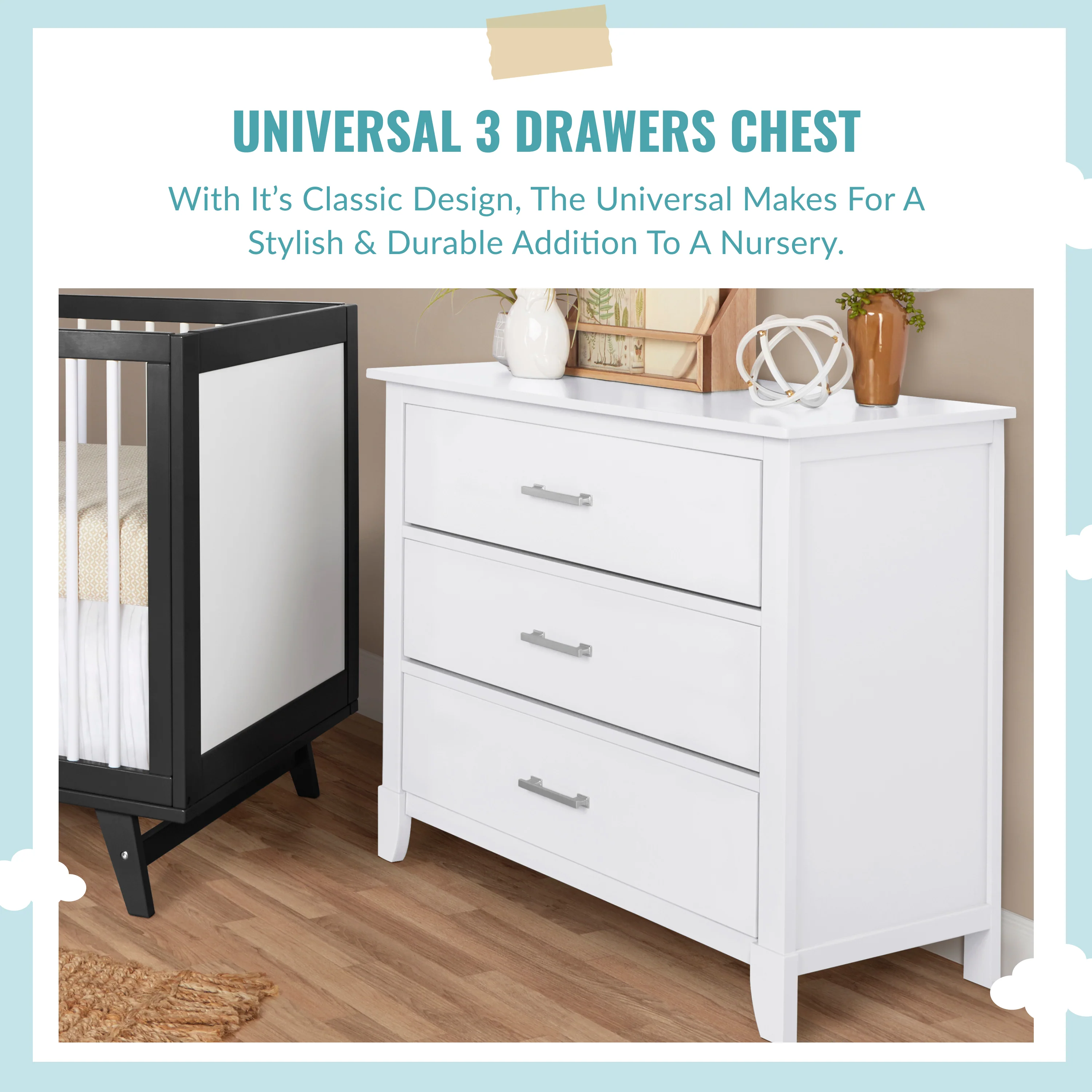 - CLASSIC DESIGN: The Universal Chest’s functional design blends into any nursery theme. It features clean lines and tapered feet which enhance its classic appeal. Metal drawer pulls add a smart textural contrast