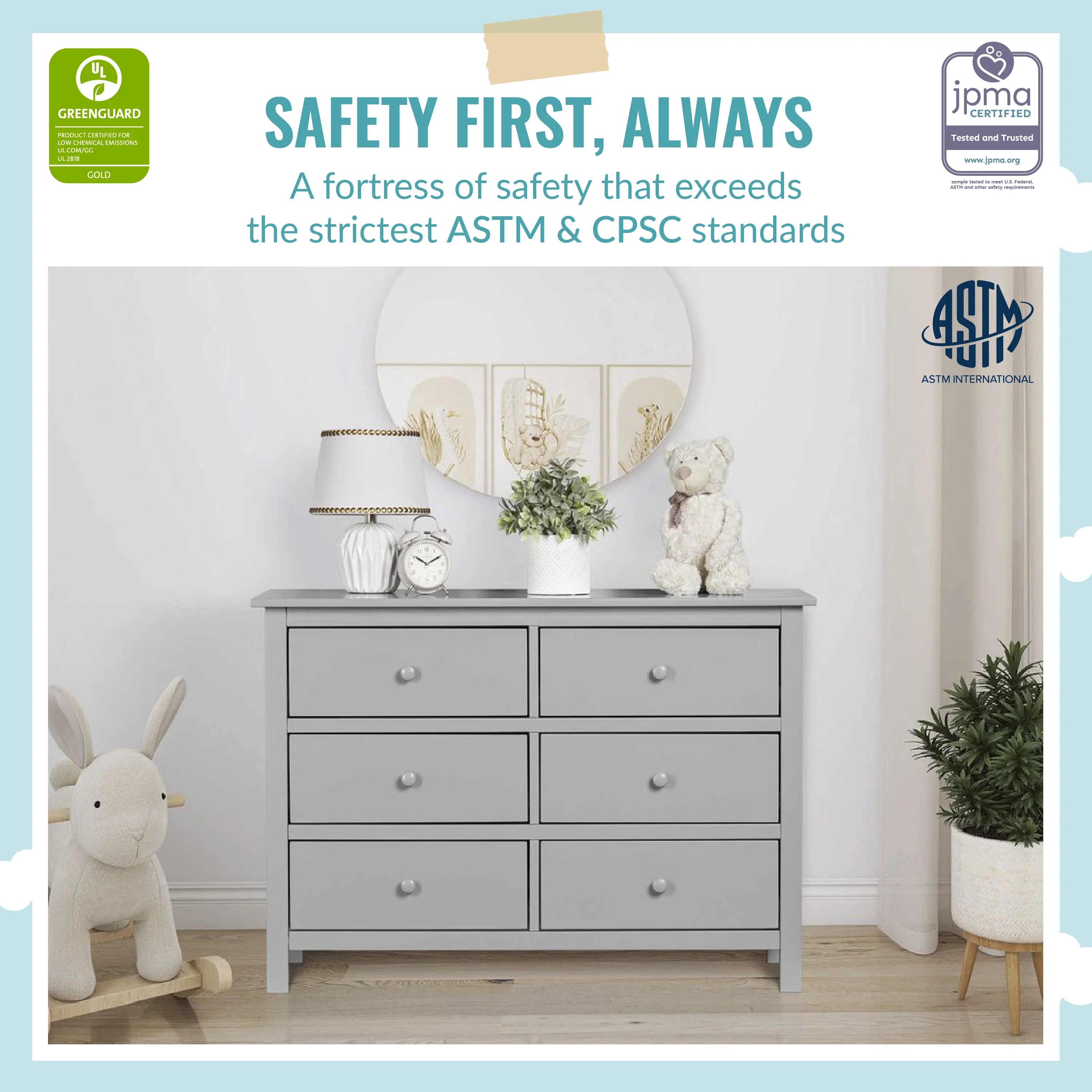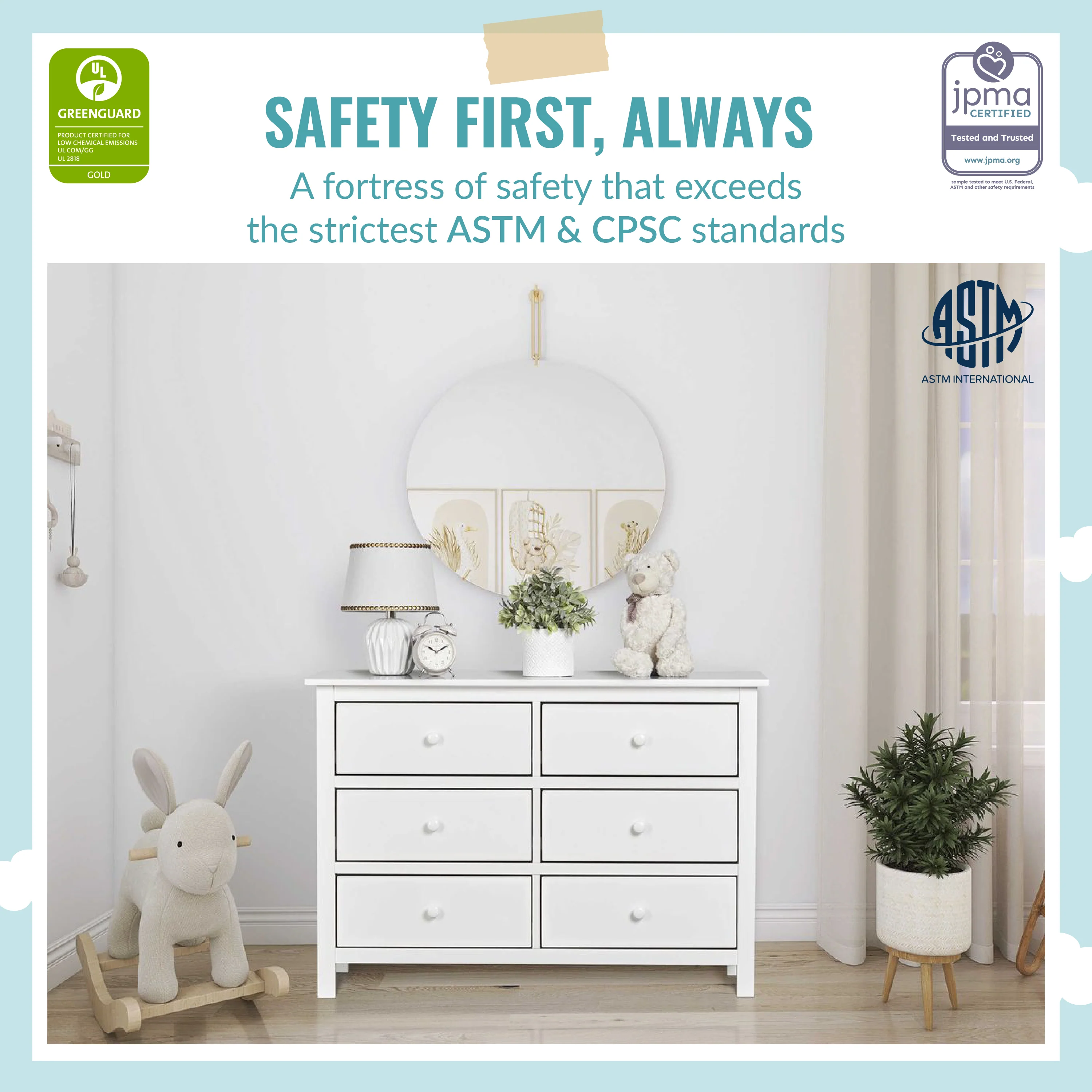 - FOR YOUR BABY'S SAFETY: Say goodbye to toxic chemicals! Finished in a non-toxic multi-step painting process and lead and phthalate safe. Rest assured knowing it exceeds ASTM International and U.S. CPSC safety standards. A stop mechanism and anti-tip kit are included for additional safety