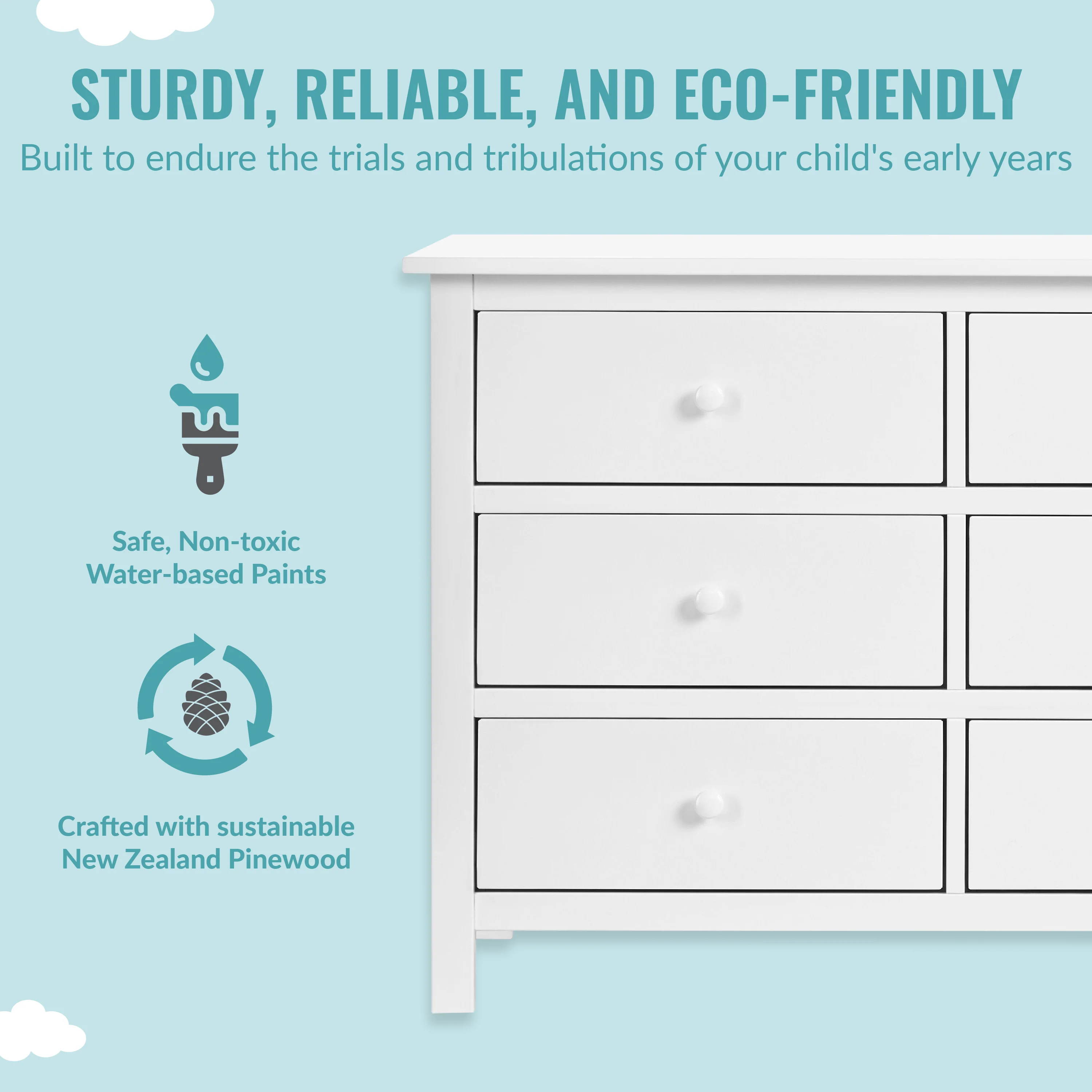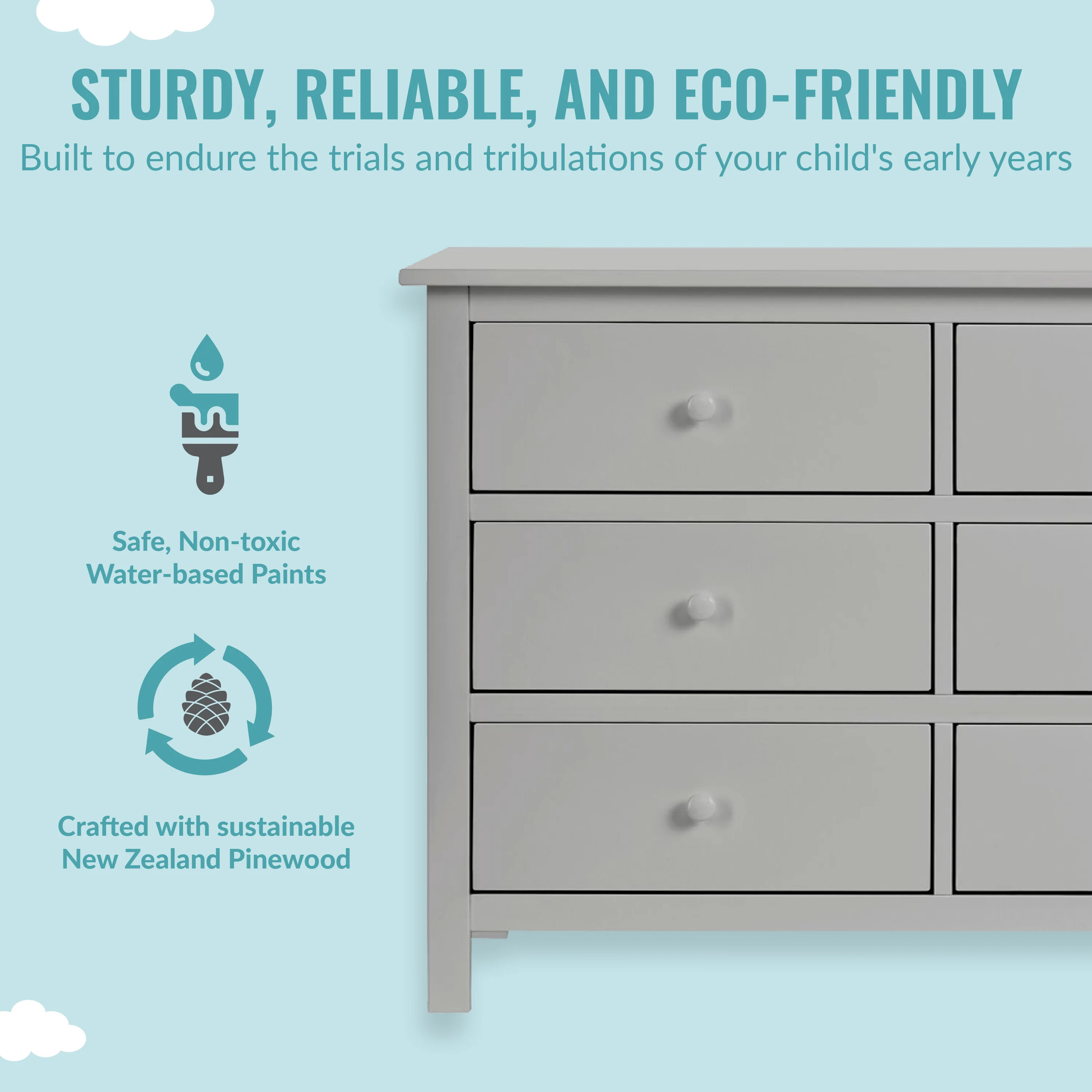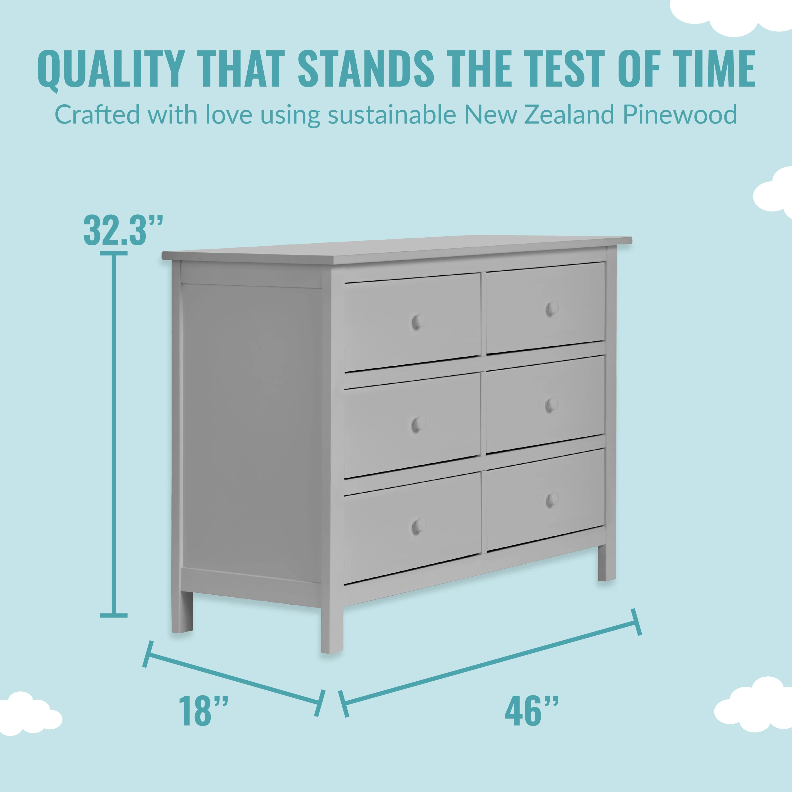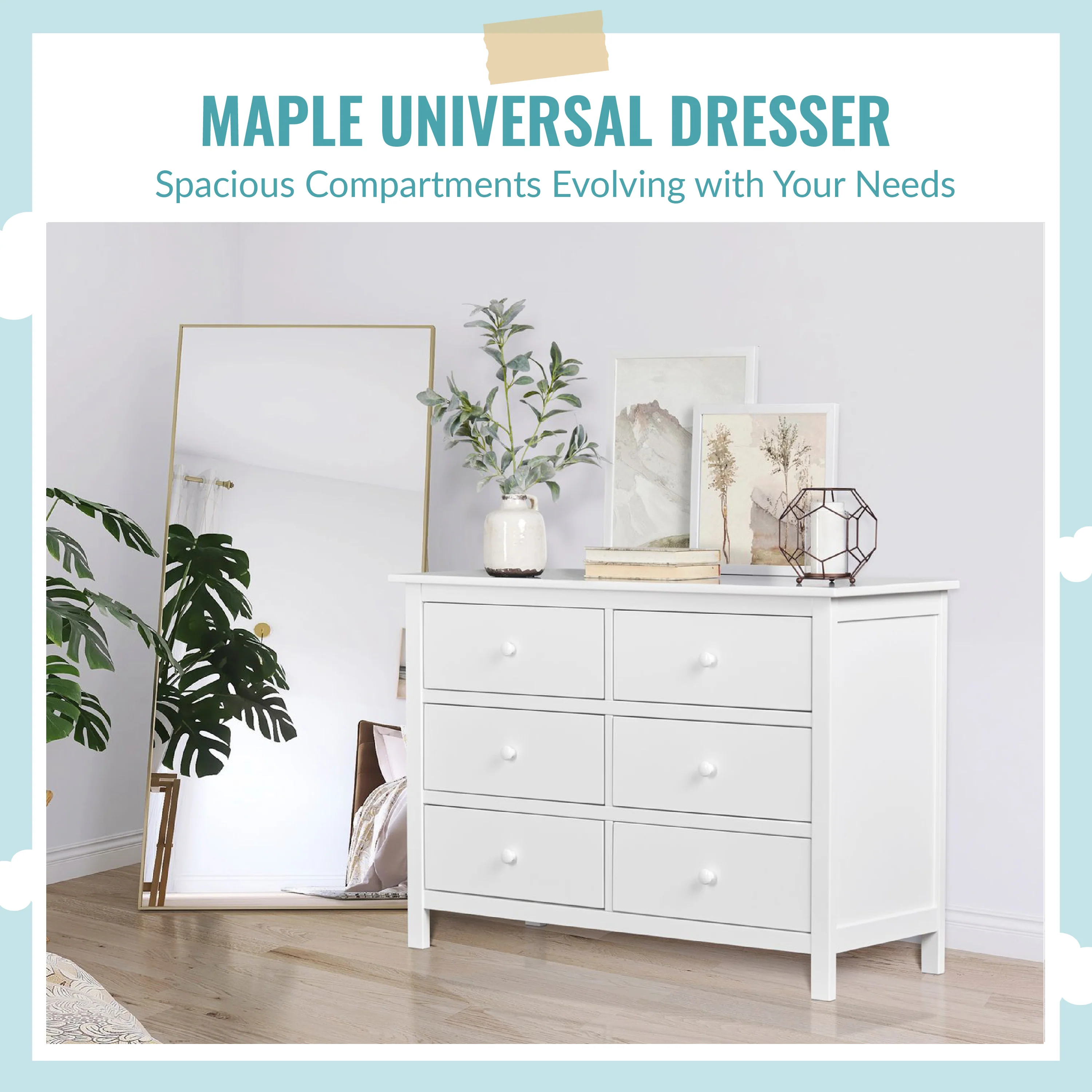 - DURABLE & VERSATILE DESIGN: Six spacious drawers that can hold all the adorable baby clothes, blankets, and more. It is designed to accommodate a changing tray now and a big kid dresser later!