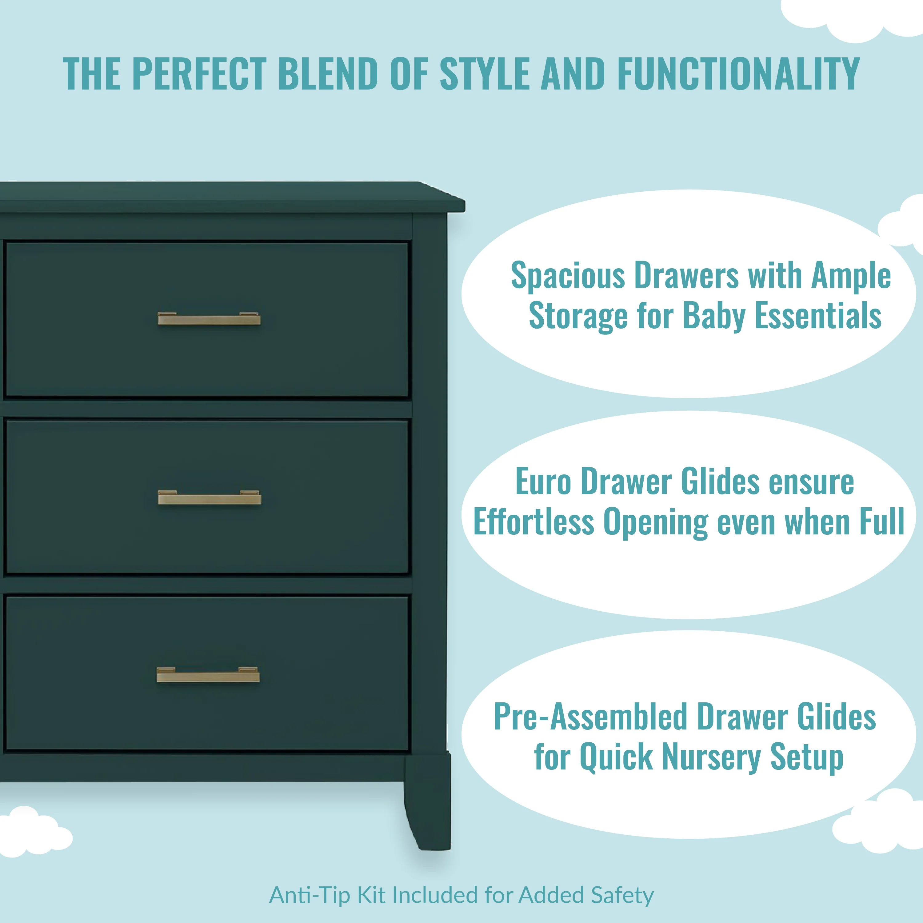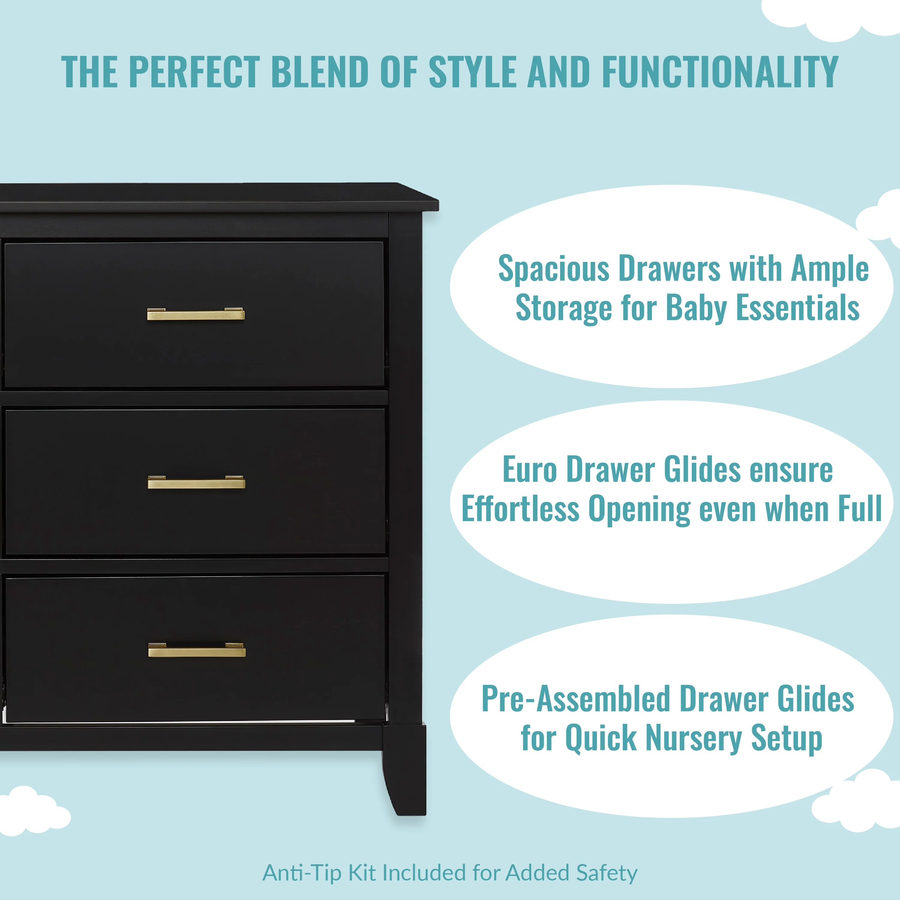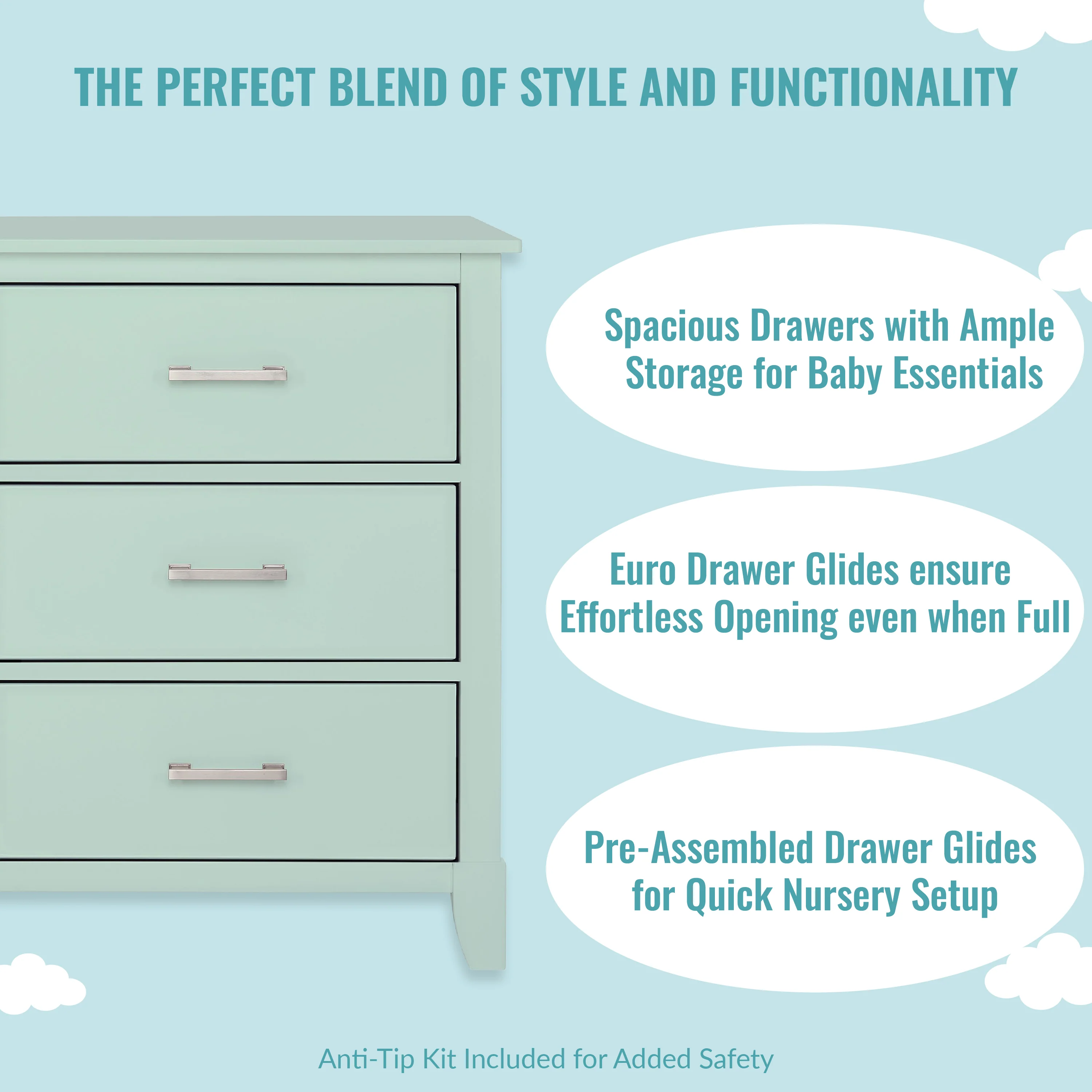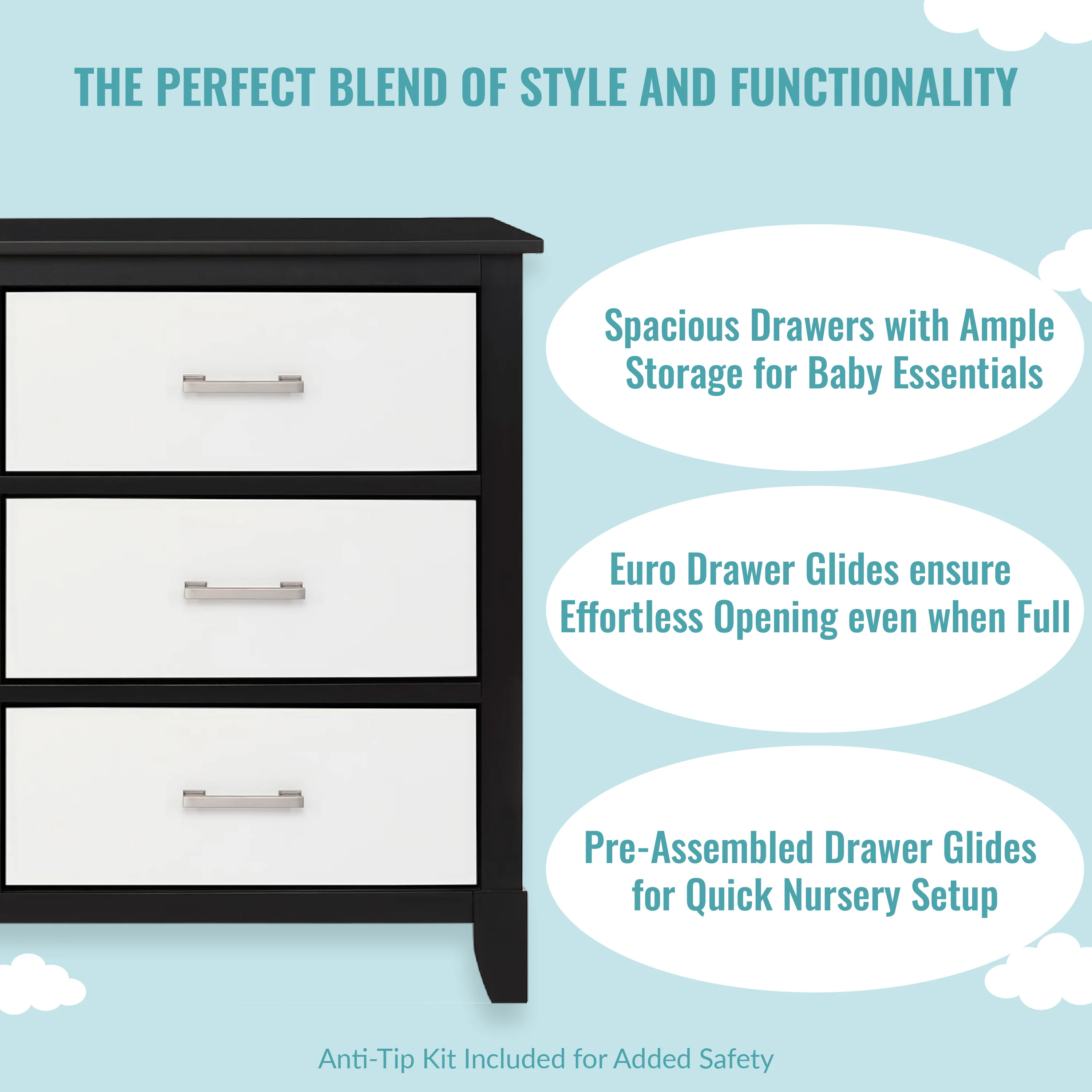 - FUNCTIONAL CHARM: The minimalist vibe is perfect to create a stylish nursery! The design features clean lines, tapered feet and metal drawer pulls for a textural contrast. It comes in contemporary finishes to blend easily into any room theme
