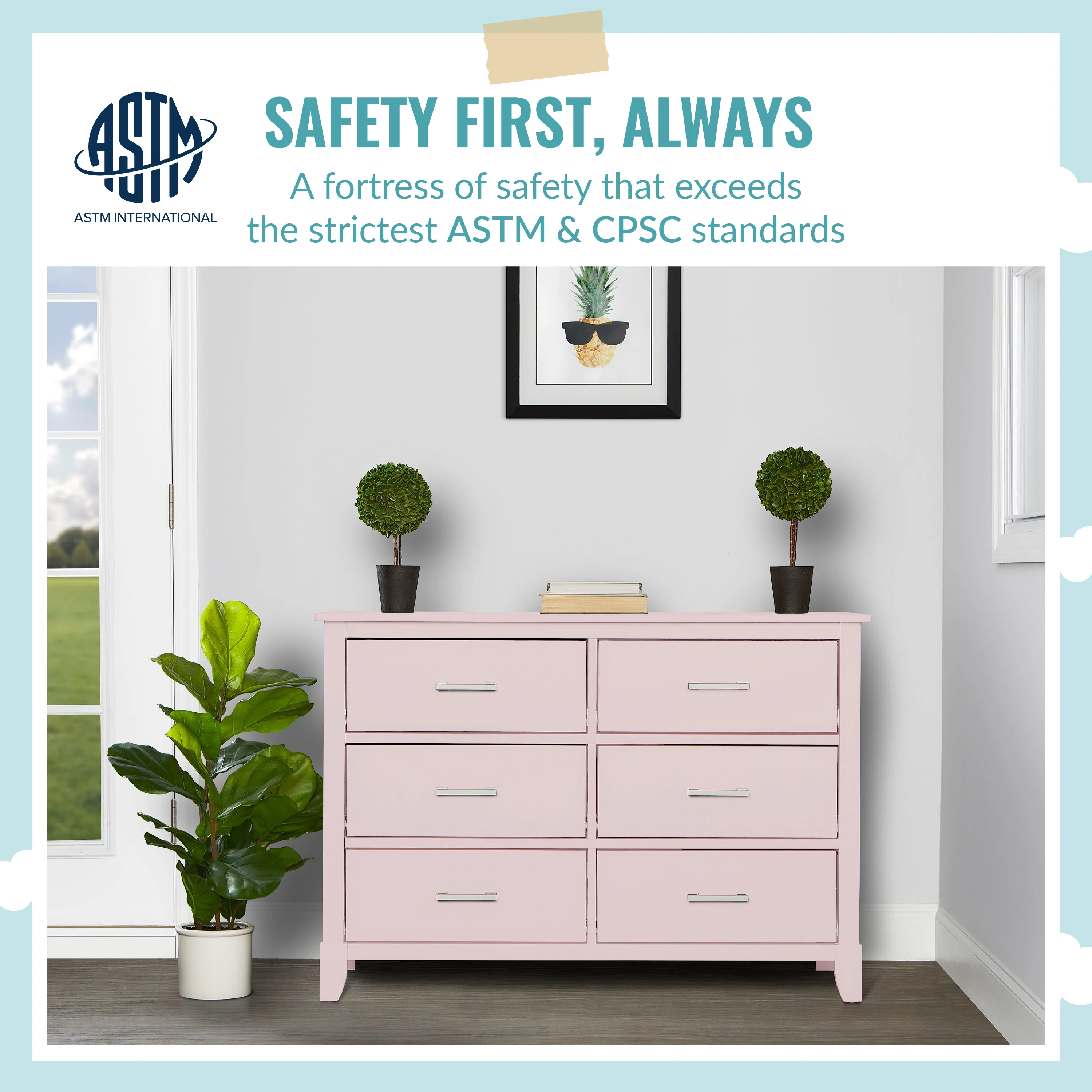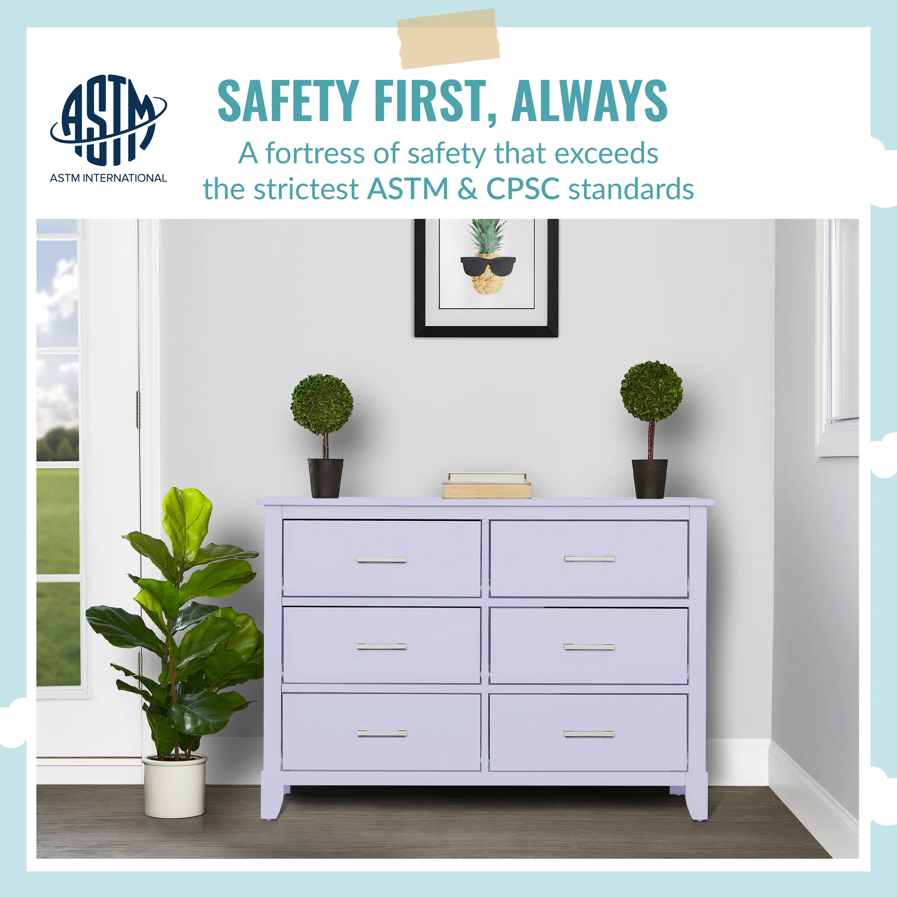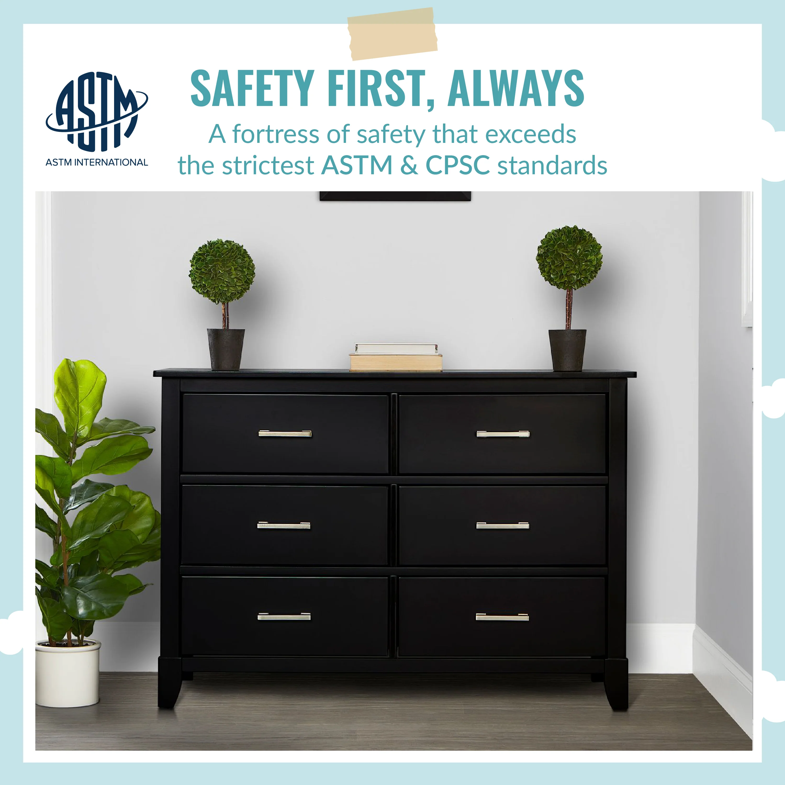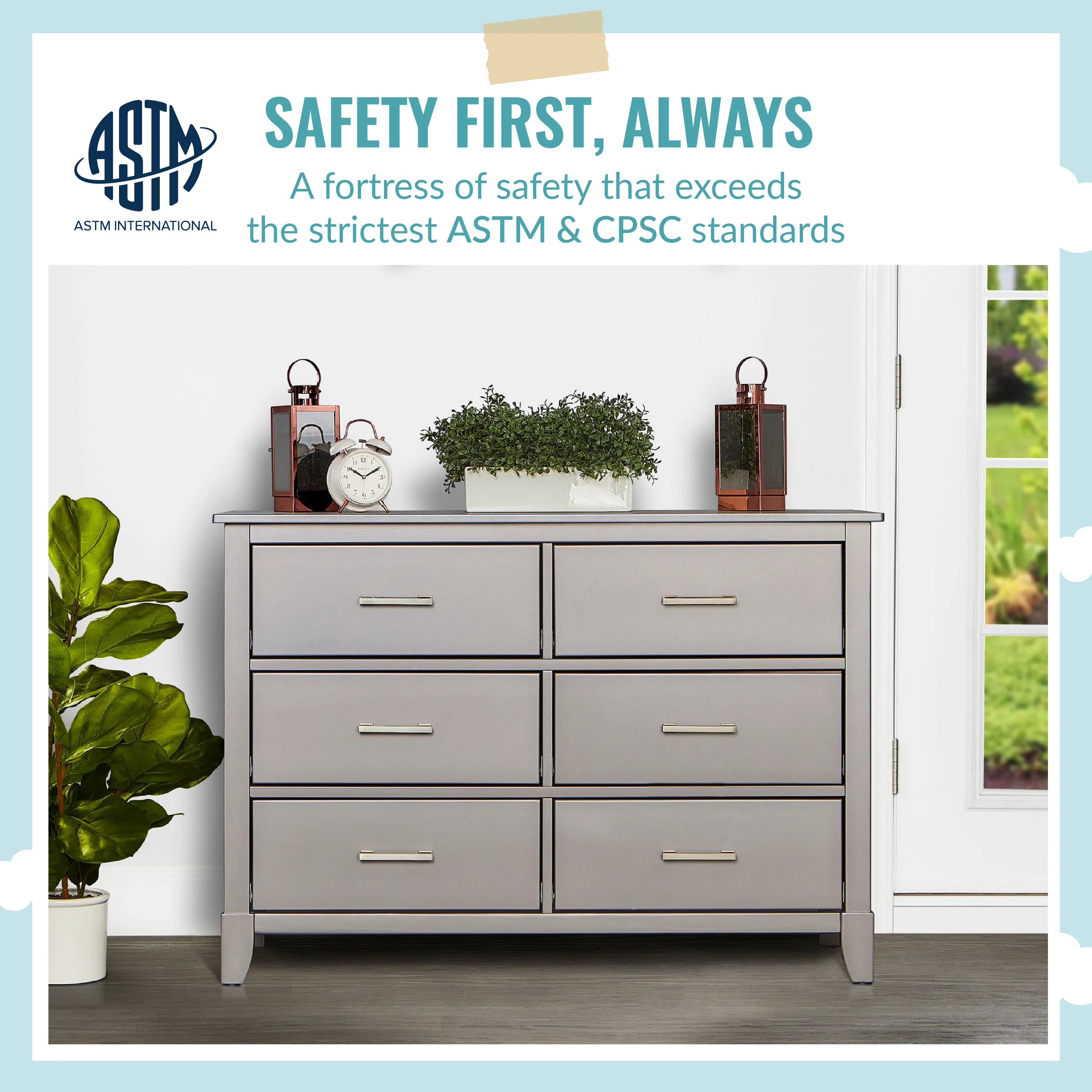 - SAFETY MATTERS: Finished in a non-toxic multi-step painting process and is lead and phthalate safe. The Universal Dresser meets/exceeds ASTM/CPSC safety standards. Stop mechanism and anti-tip kit included for additional safety