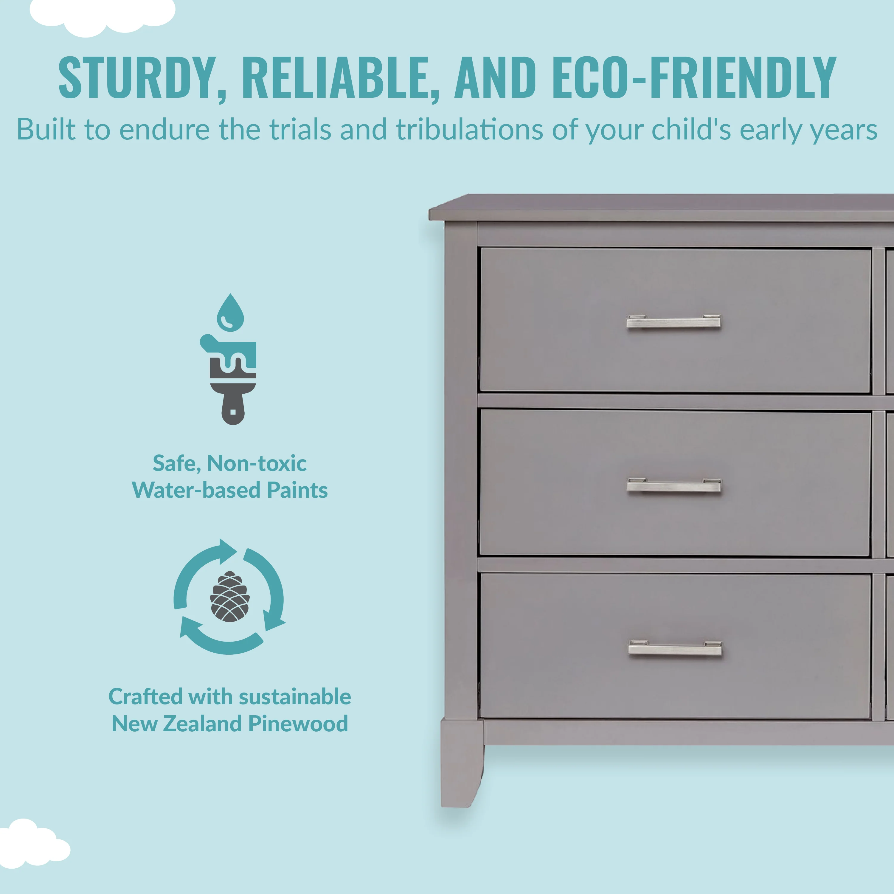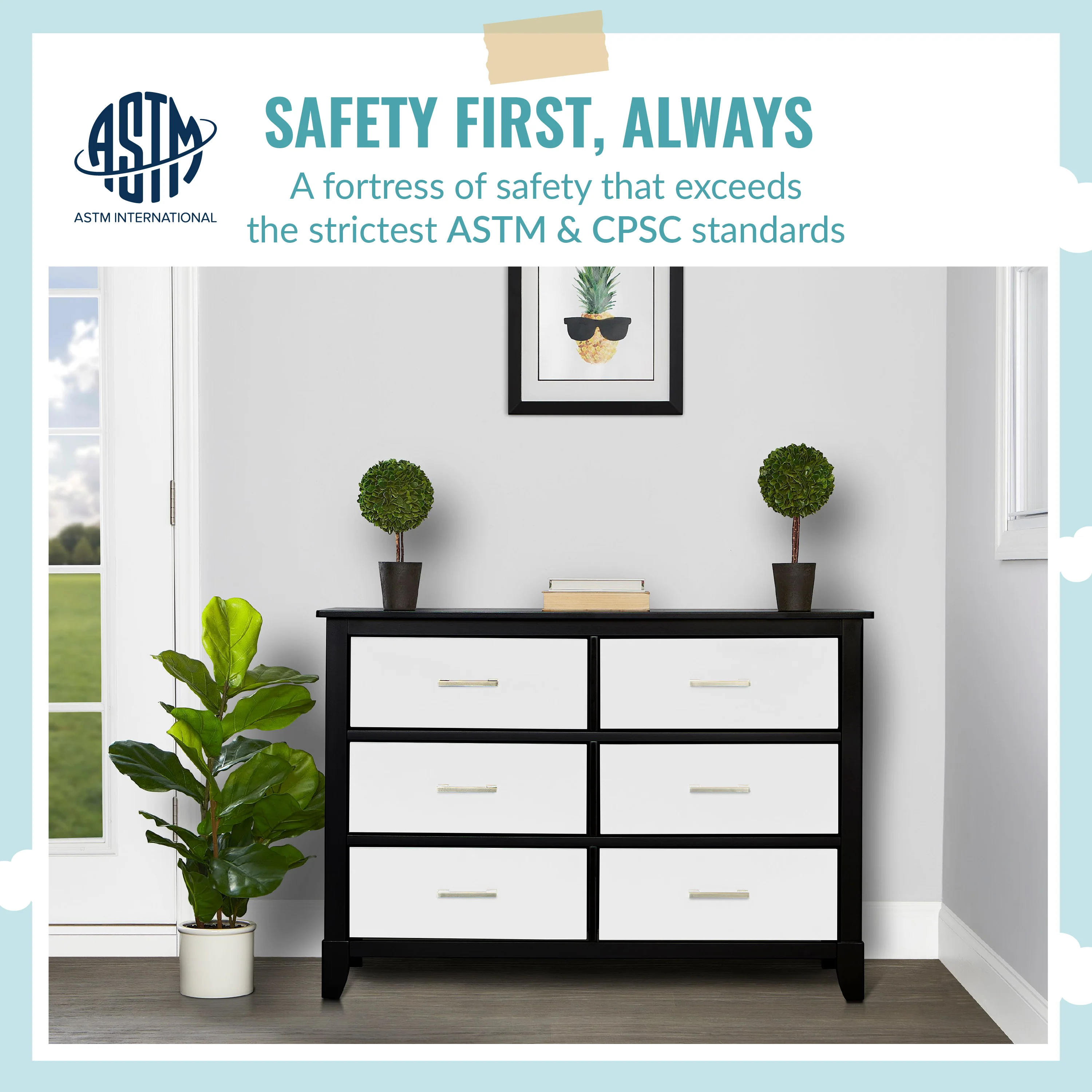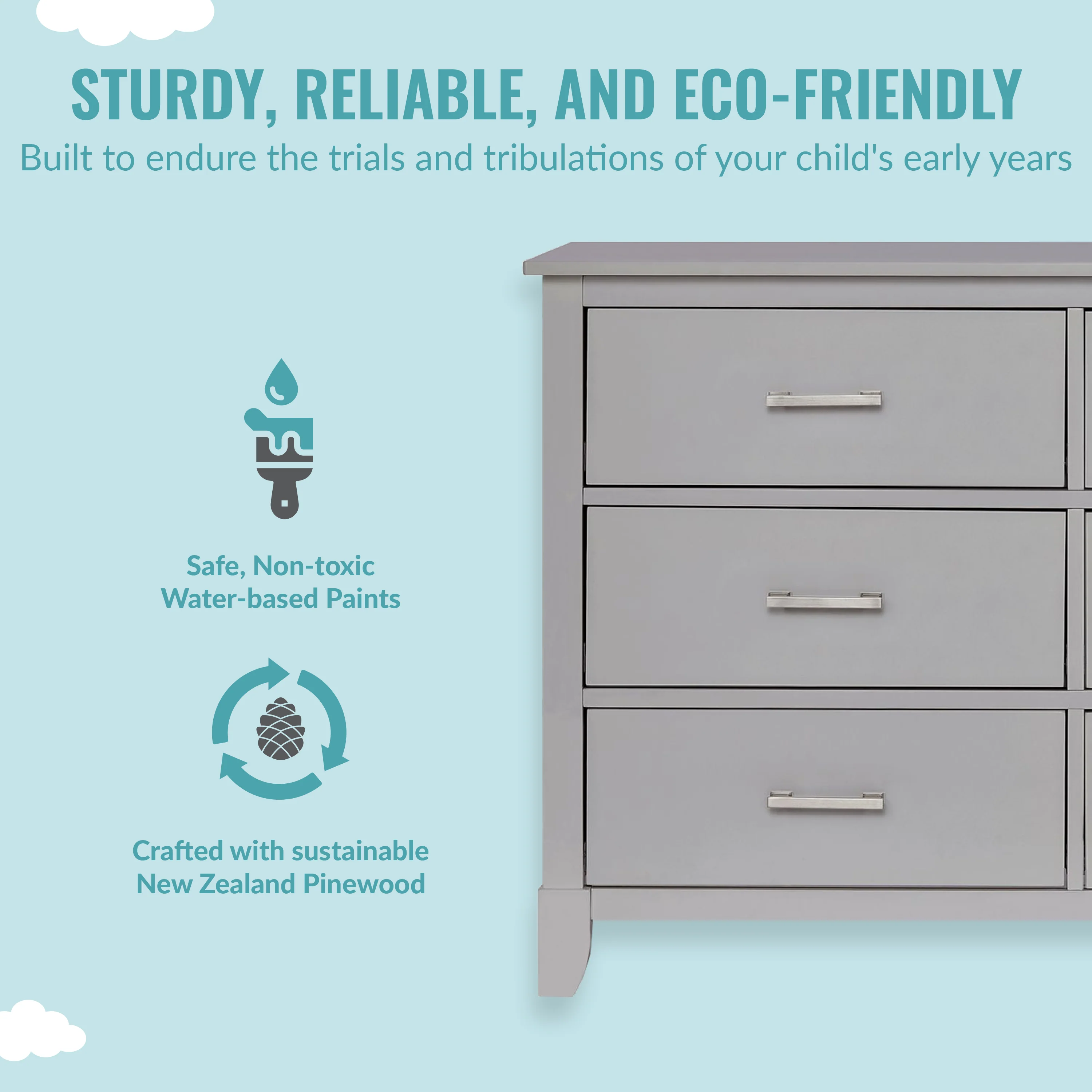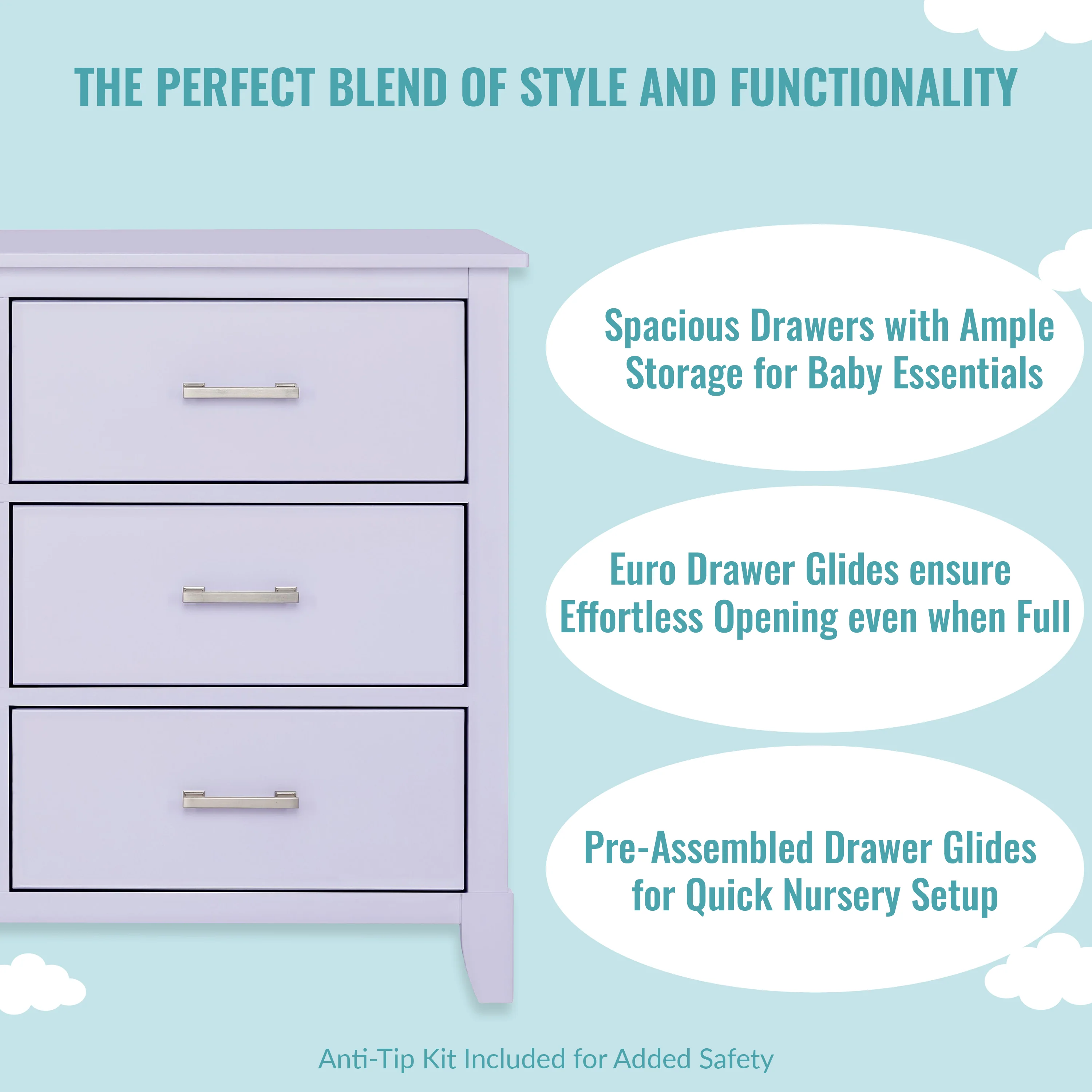 - SAFETY MATTERS: Finished in a non-toxic multi-step painting process and is lead and phthalate safe. The Universal Dresser meets/exceeds ASTM/CPSC safety standards. Stop mechanism and anti-tip kit included for additional safety
