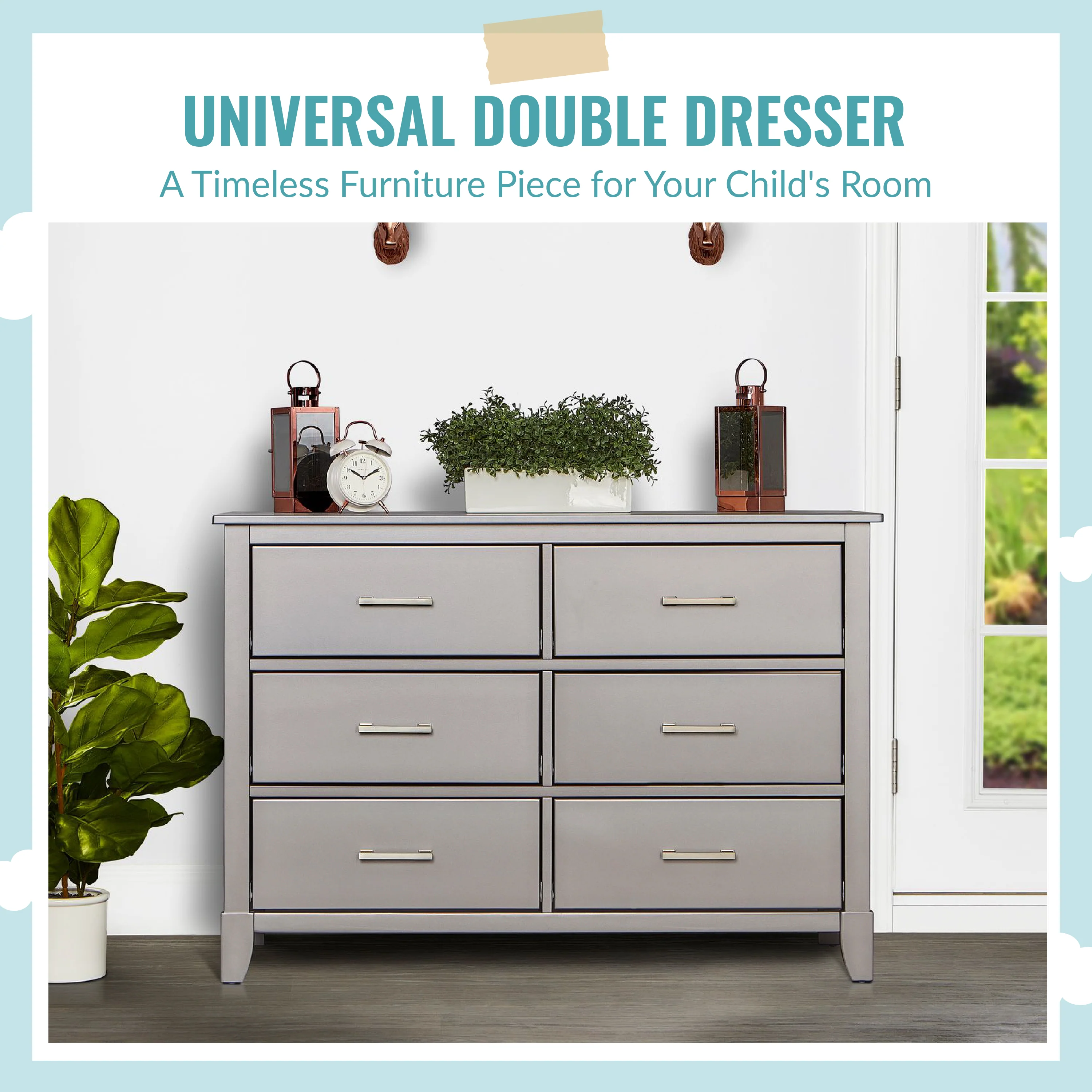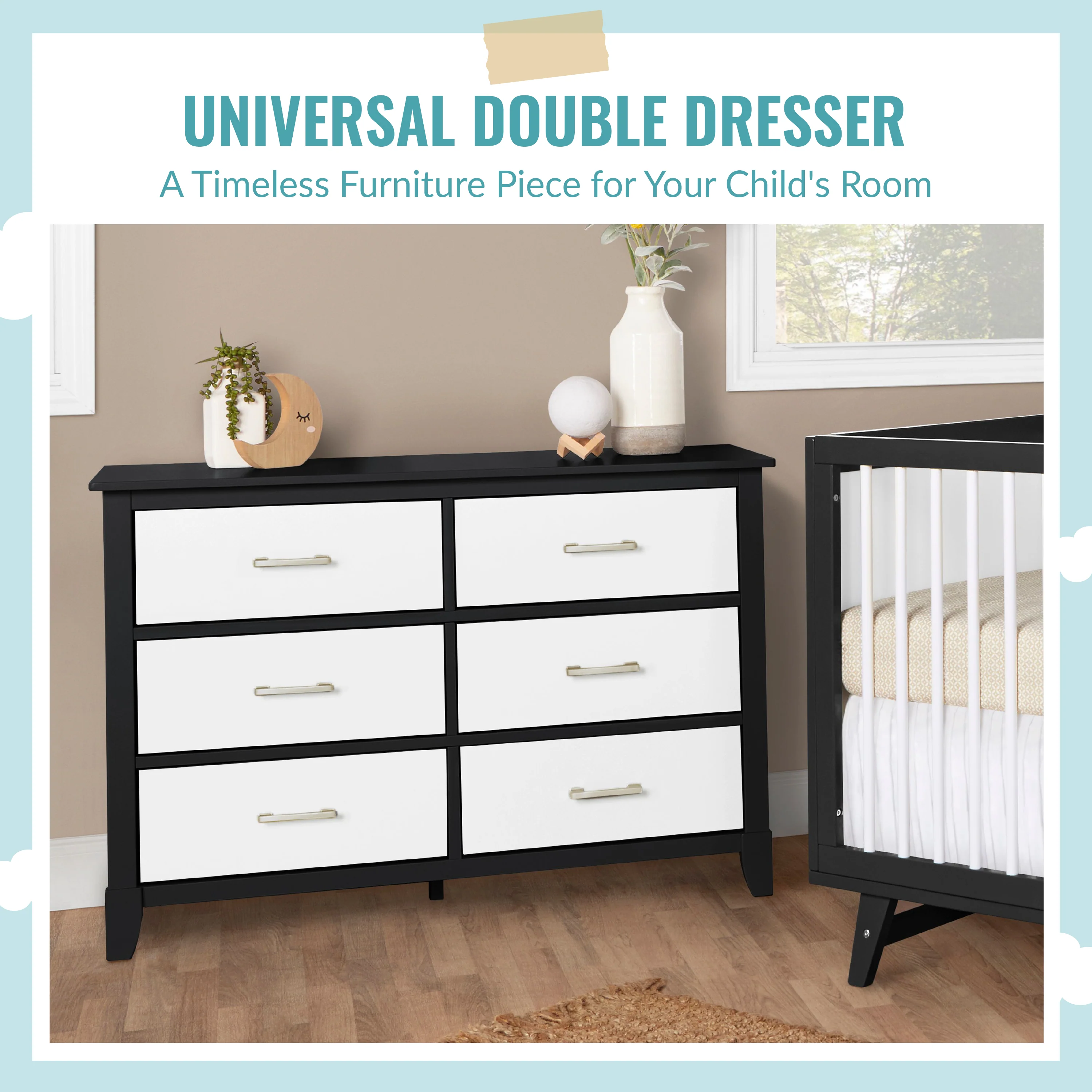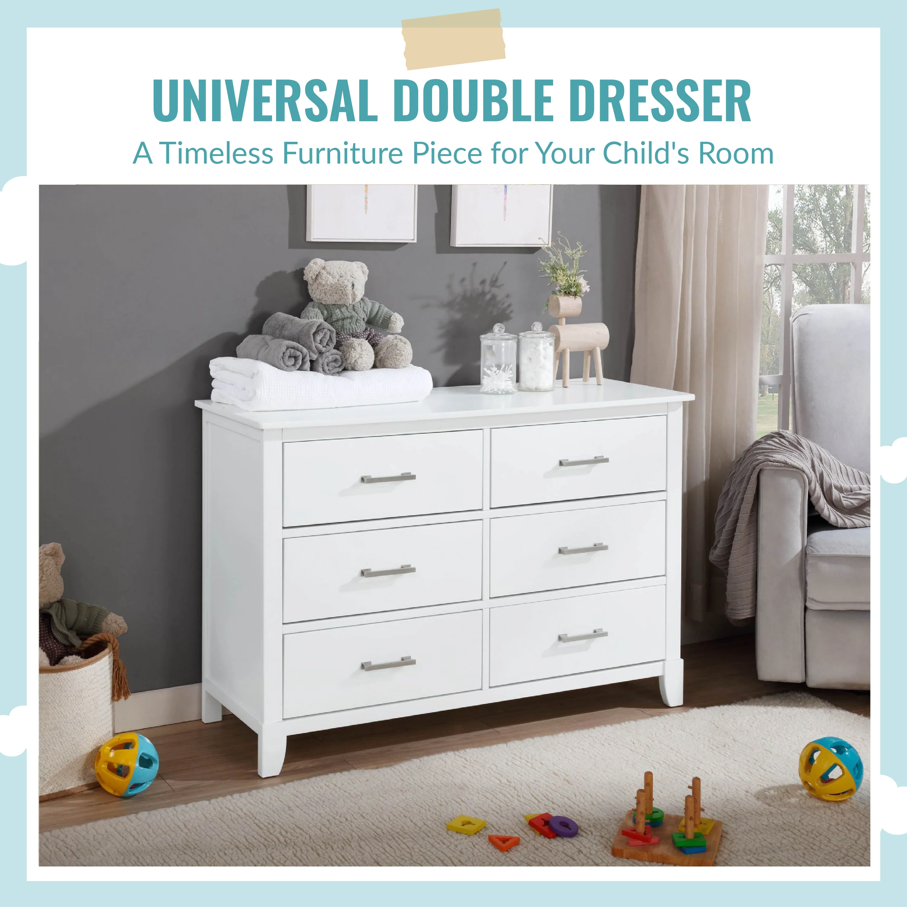 The Universal Double Dresser is a must-have nursery storage solution that adapts gracefully with your child. It comes with pre-assembled drawer glides that make the assembly process a breeze. Its Euro glides allow you to pull open drawers with ease even when your hands are full holding your LO! The clean lines, tapered feet and metal drawer pulls add style to any nursery!