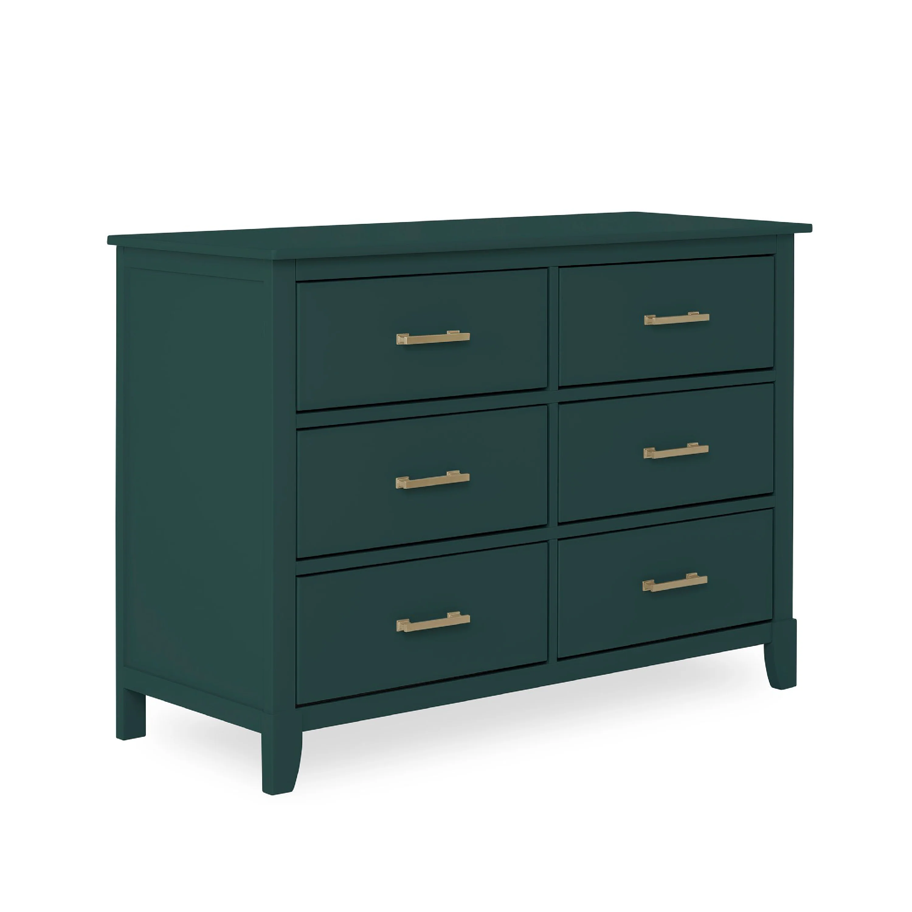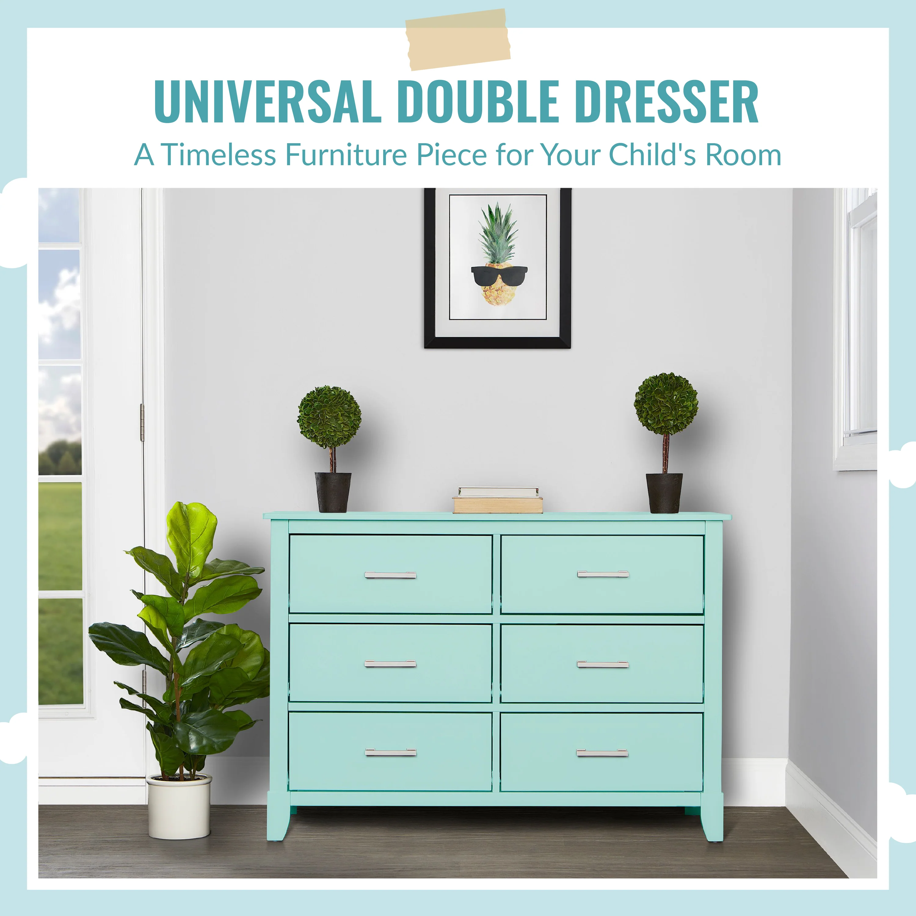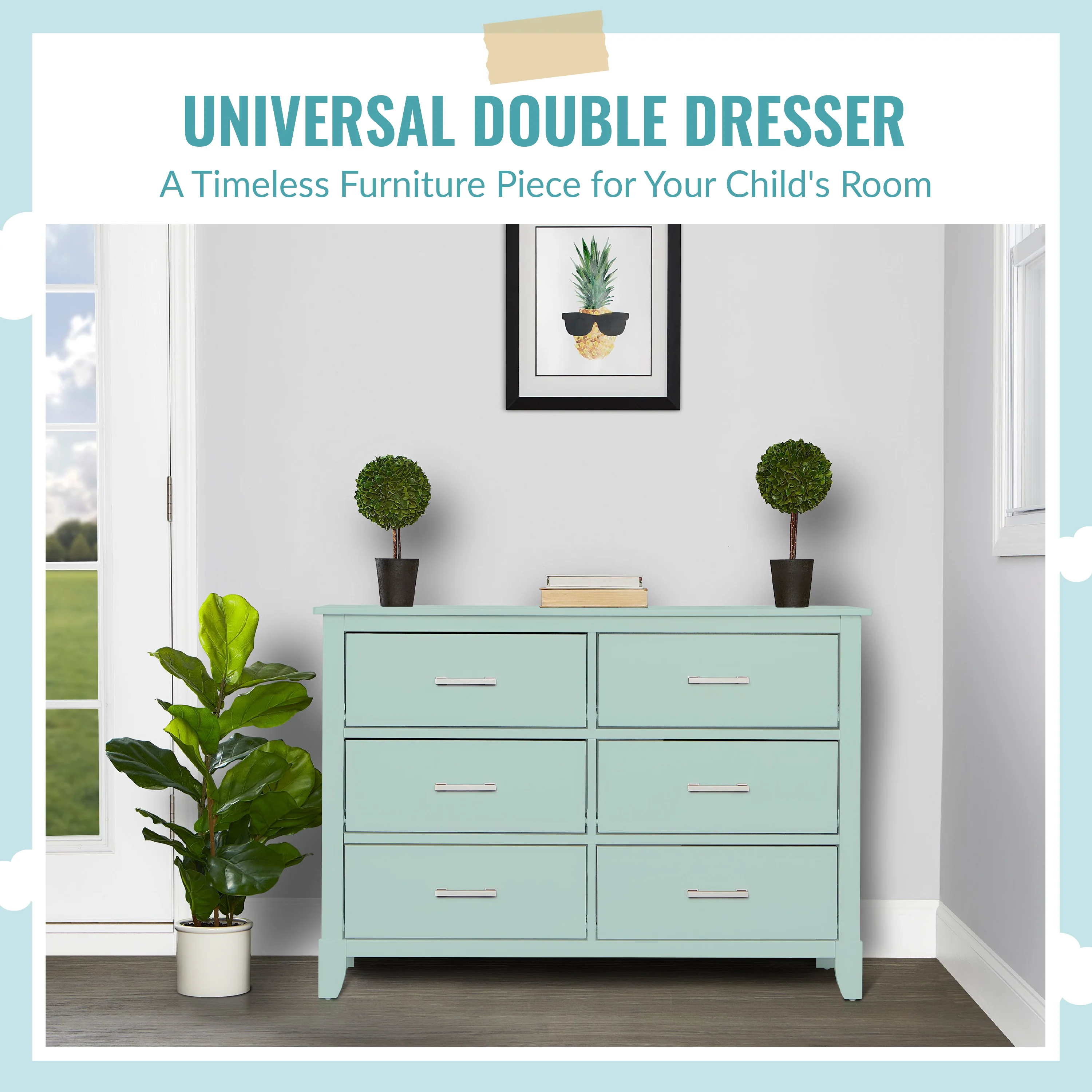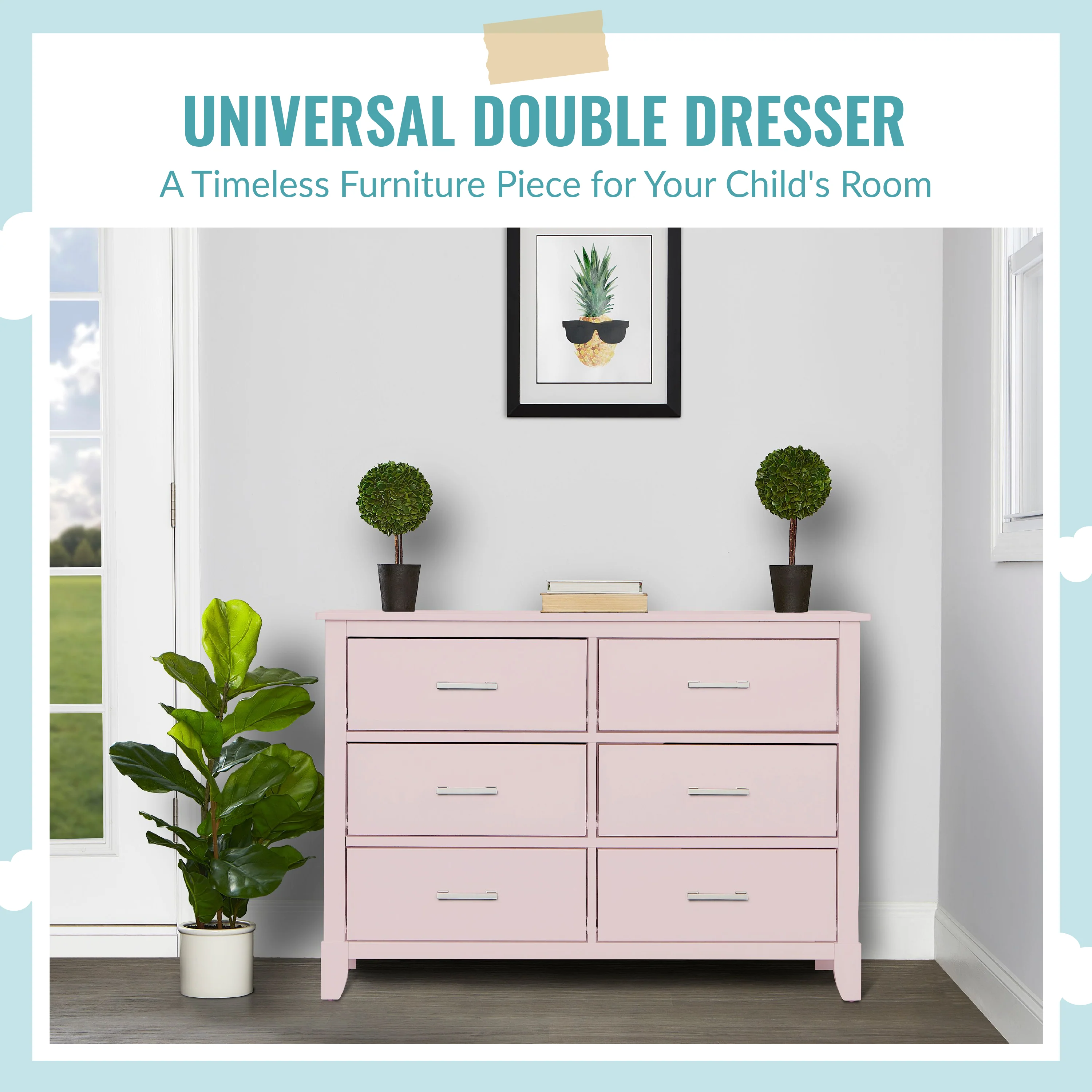 The Universal Double Dresser is a must-have nursery storage solution that adapts gracefully with your child. It comes with pre-assembled drawer glides that make the assembly process a breeze. Its Euro glides allow you to pull open drawers with ease even when your hands are full holding your LO! The clean lines, tapered feet and metal drawer pulls add style to any nursery!