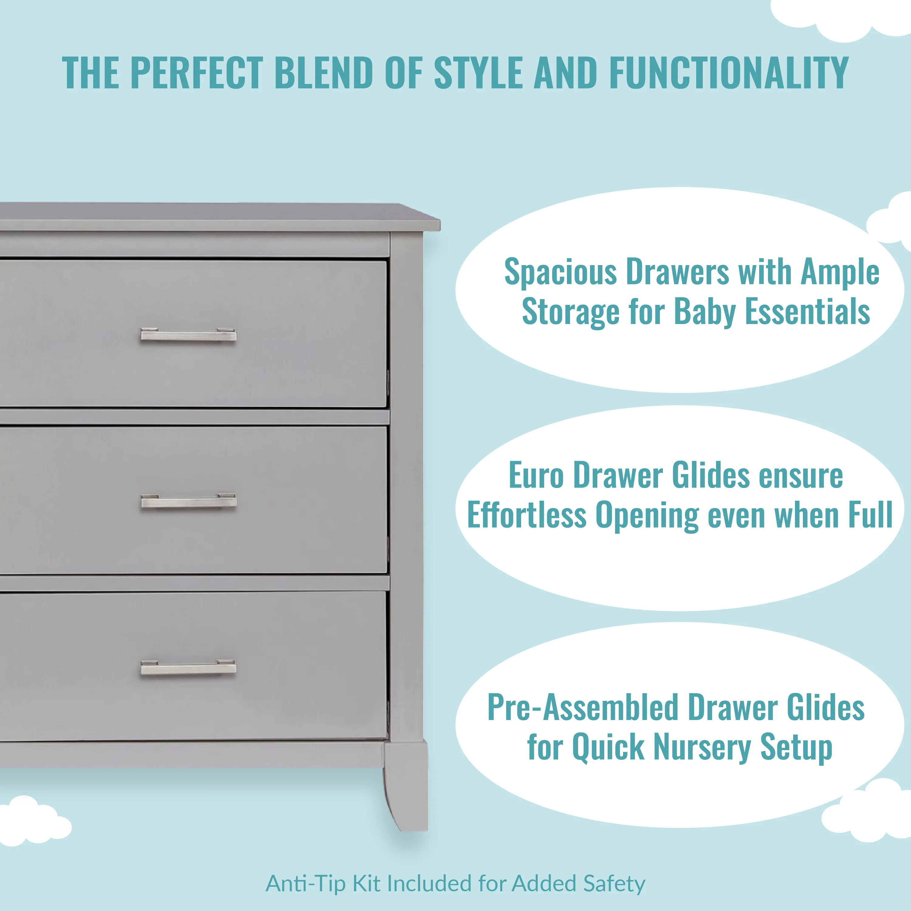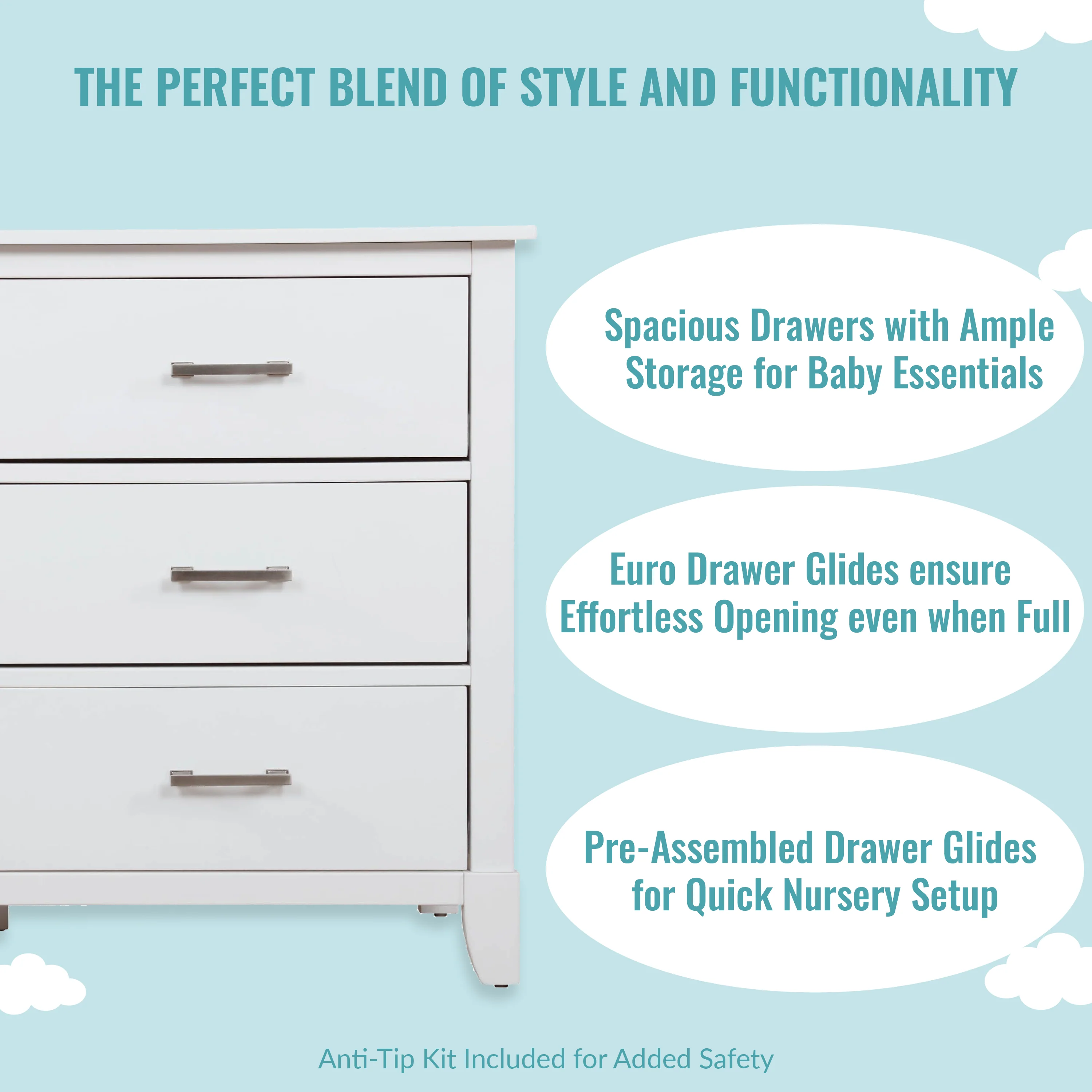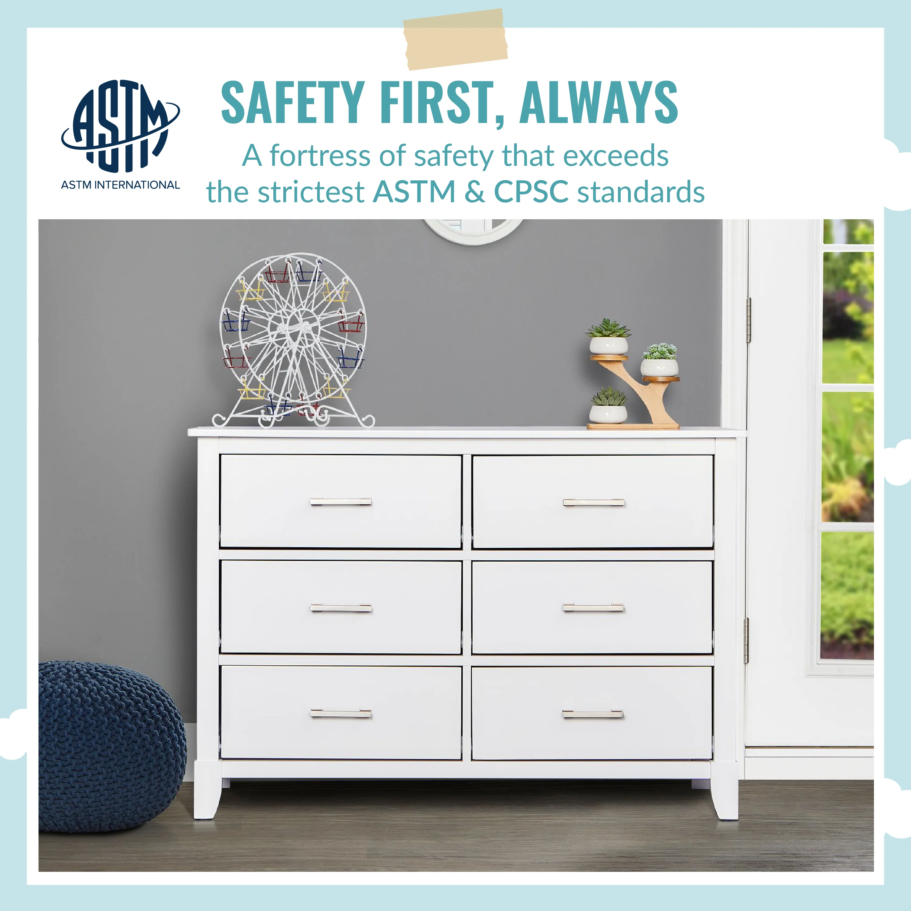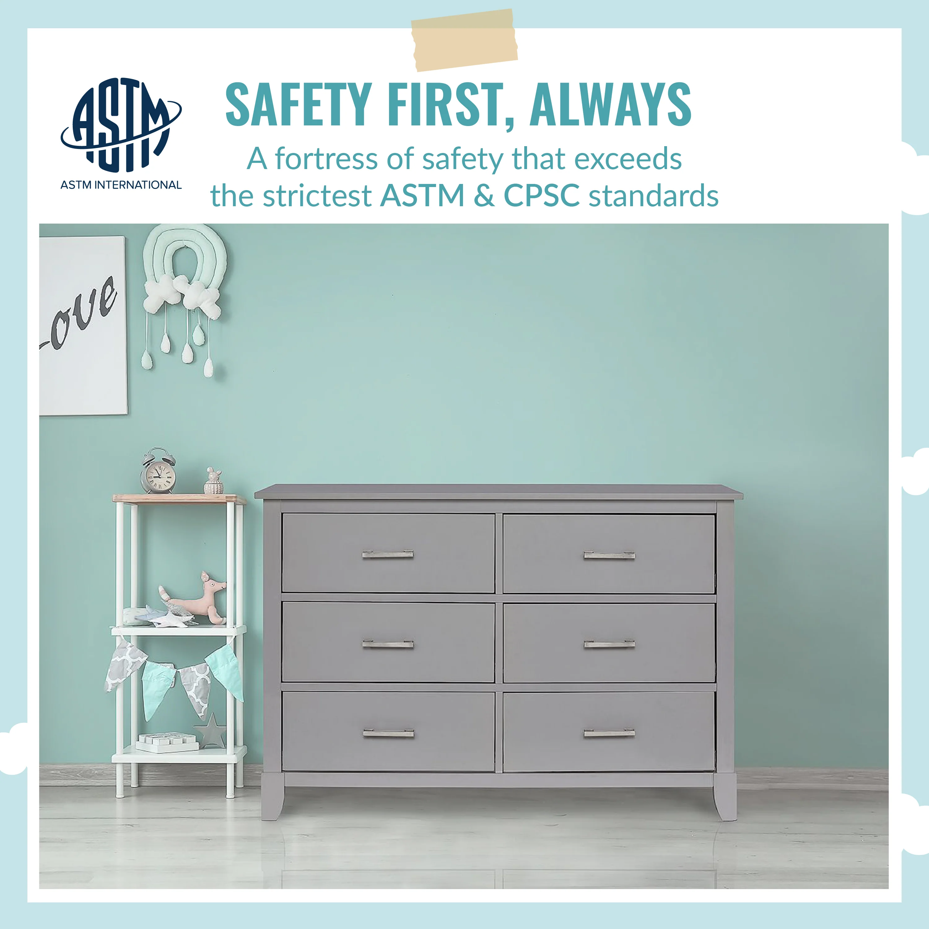 • SAFETY MATTERS: Finished in a non-toxic multi-step painting process and is lead and phthalate safe. The Universal Dresser meets/exceeds ASTM/CPSC safety standards. Stop mechanism and anti-tip kit included for additional safety