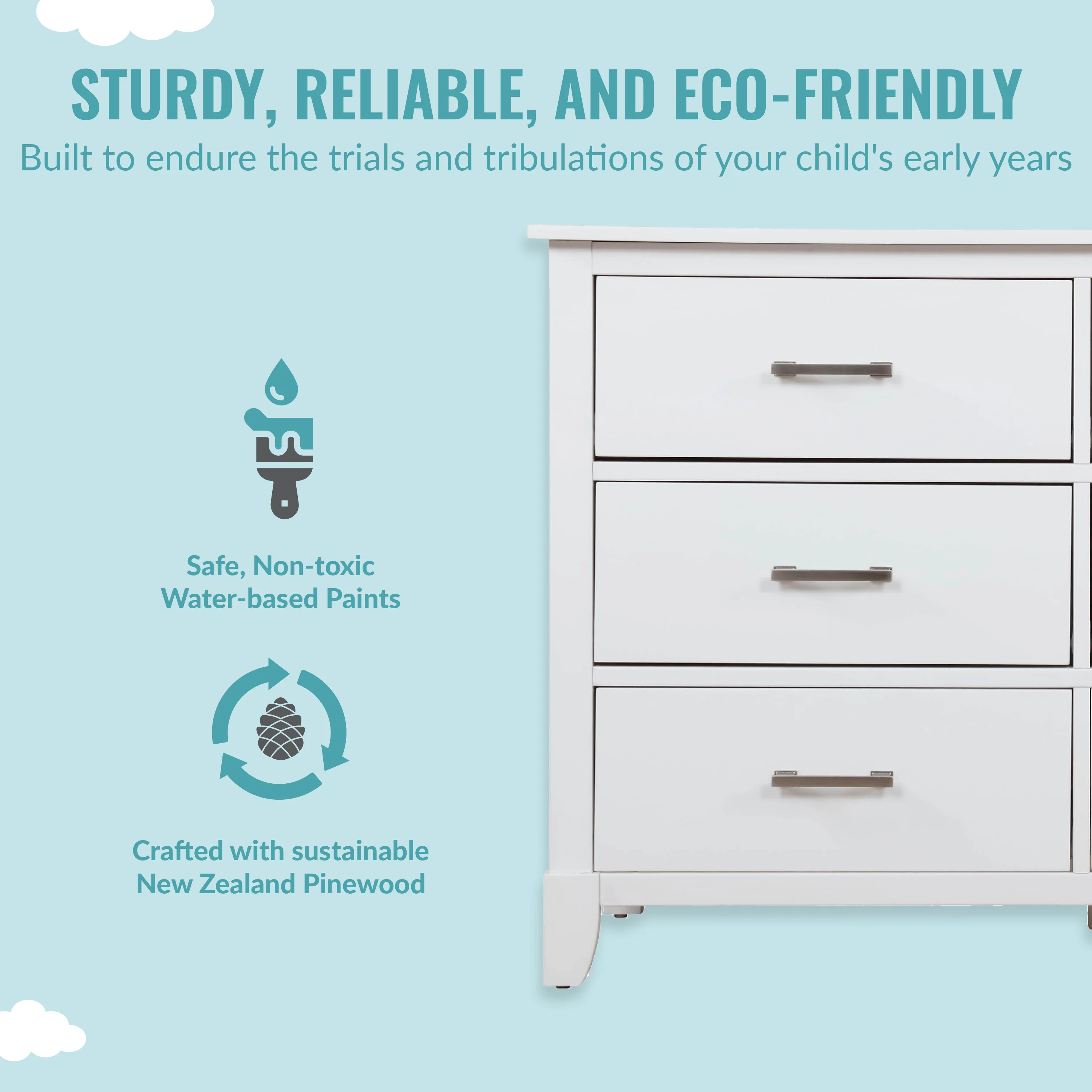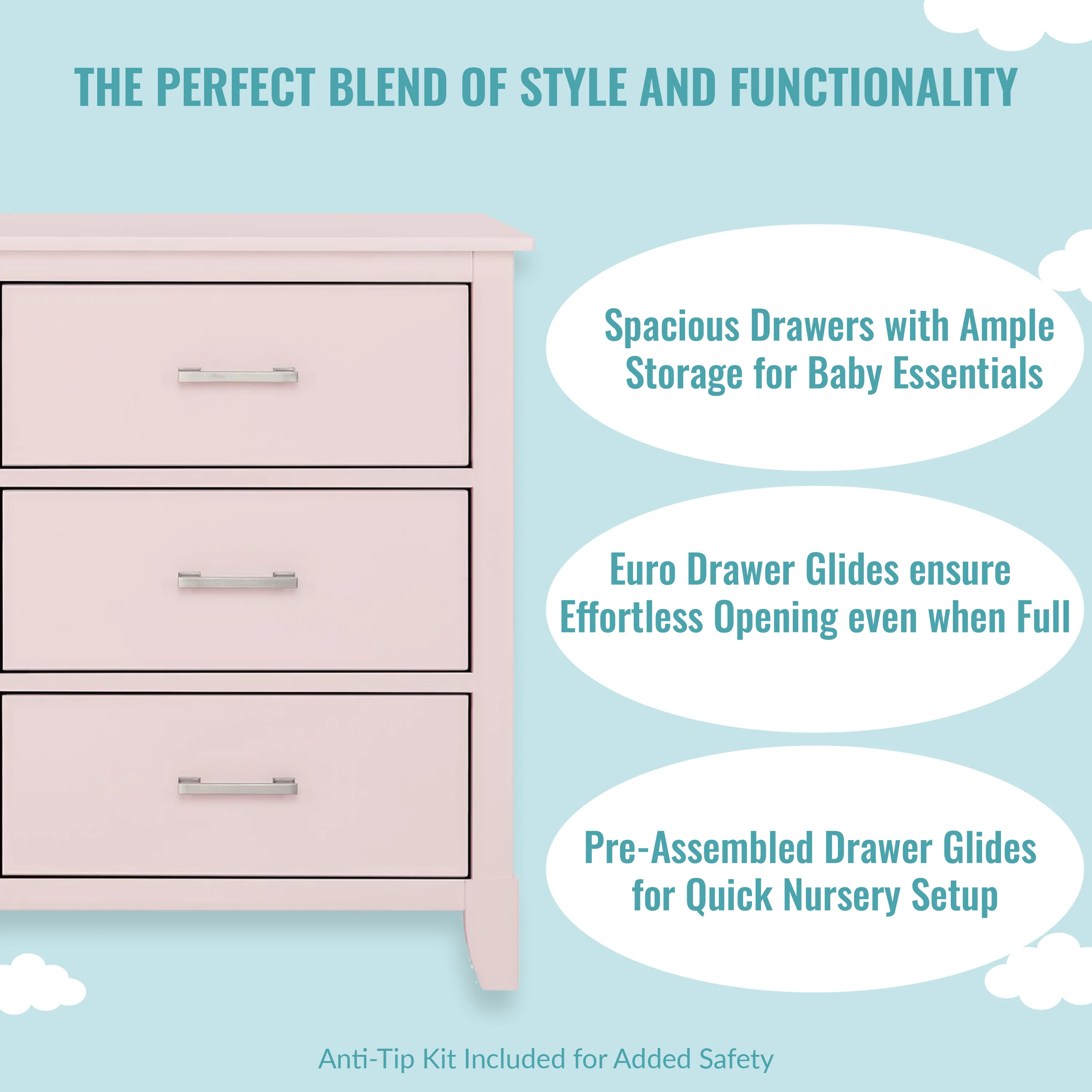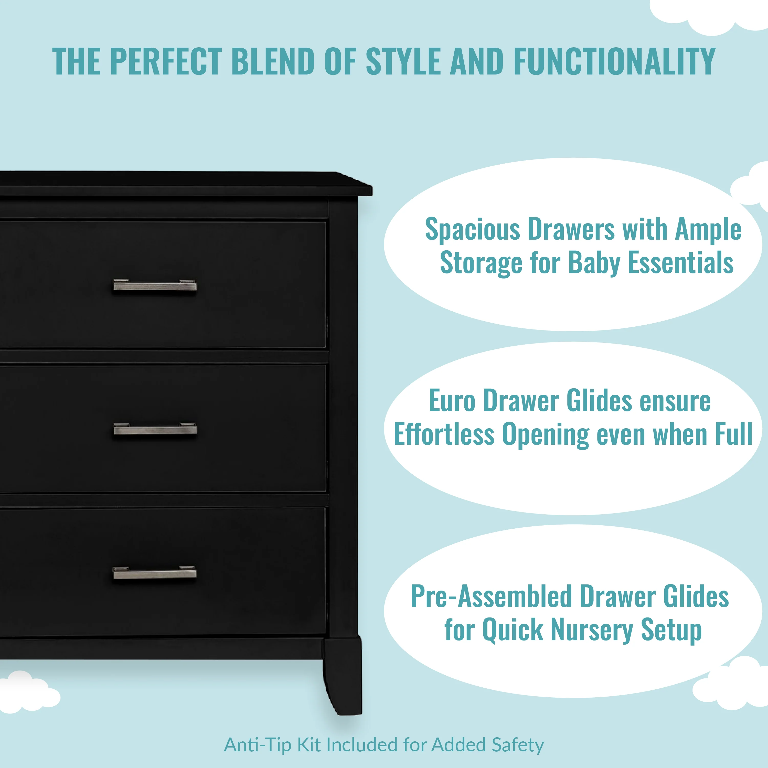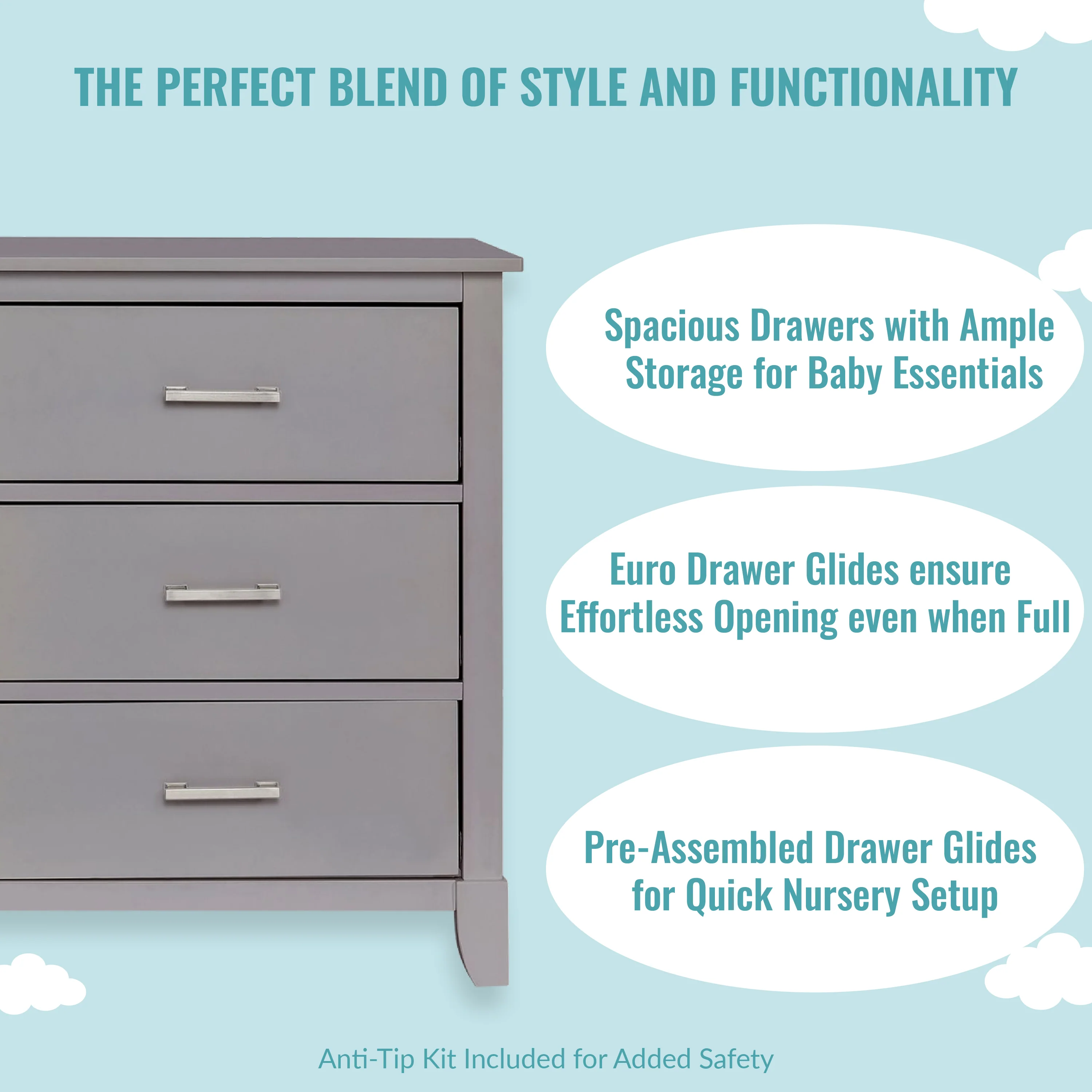 • SAFETY MATTERS: Finished in a non-toxic multi-step painting process and is lead and phthalate safe. The Universal Dresser meets/exceeds ASTM/CPSC safety standards. Stop mechanism and anti-tip kit included for additional safety