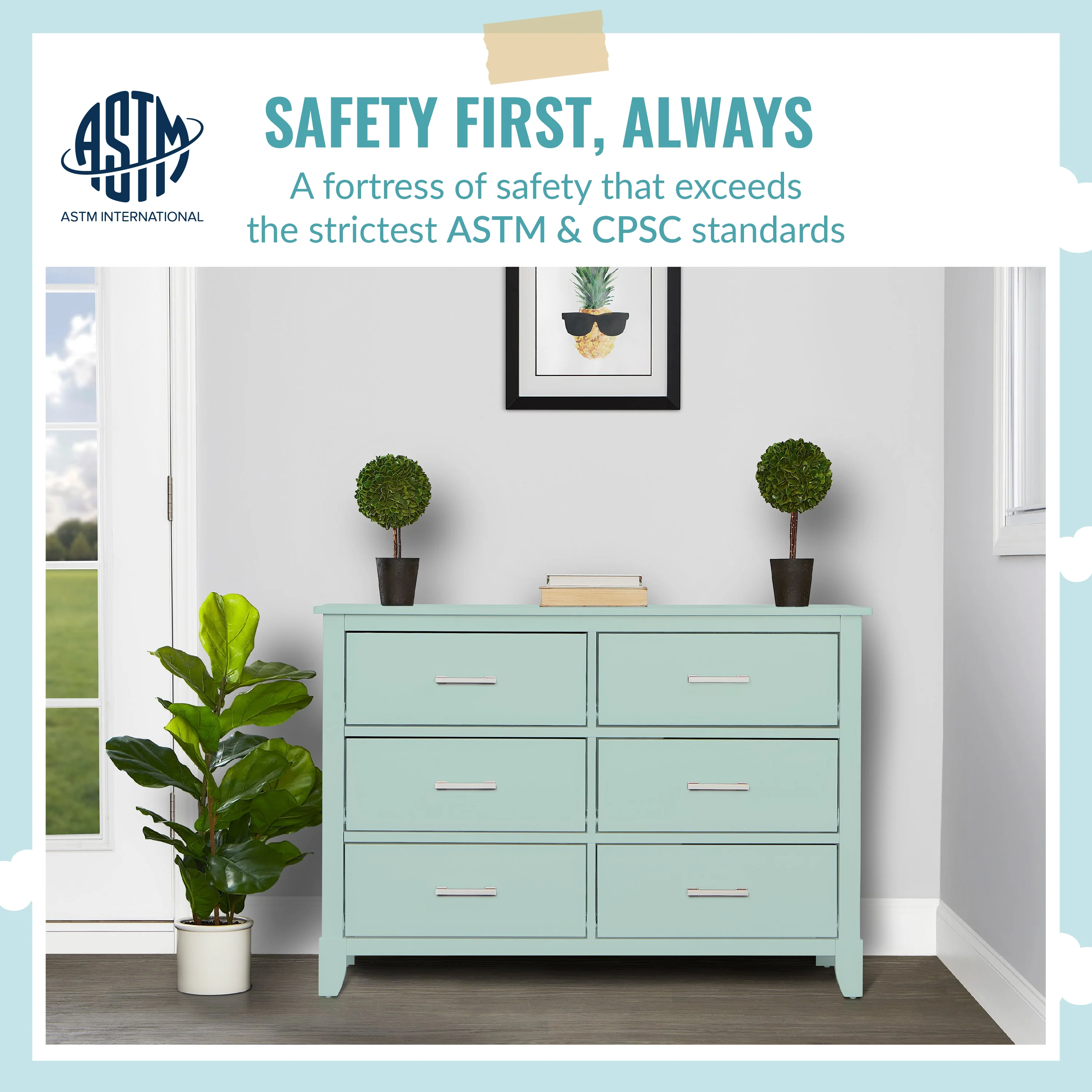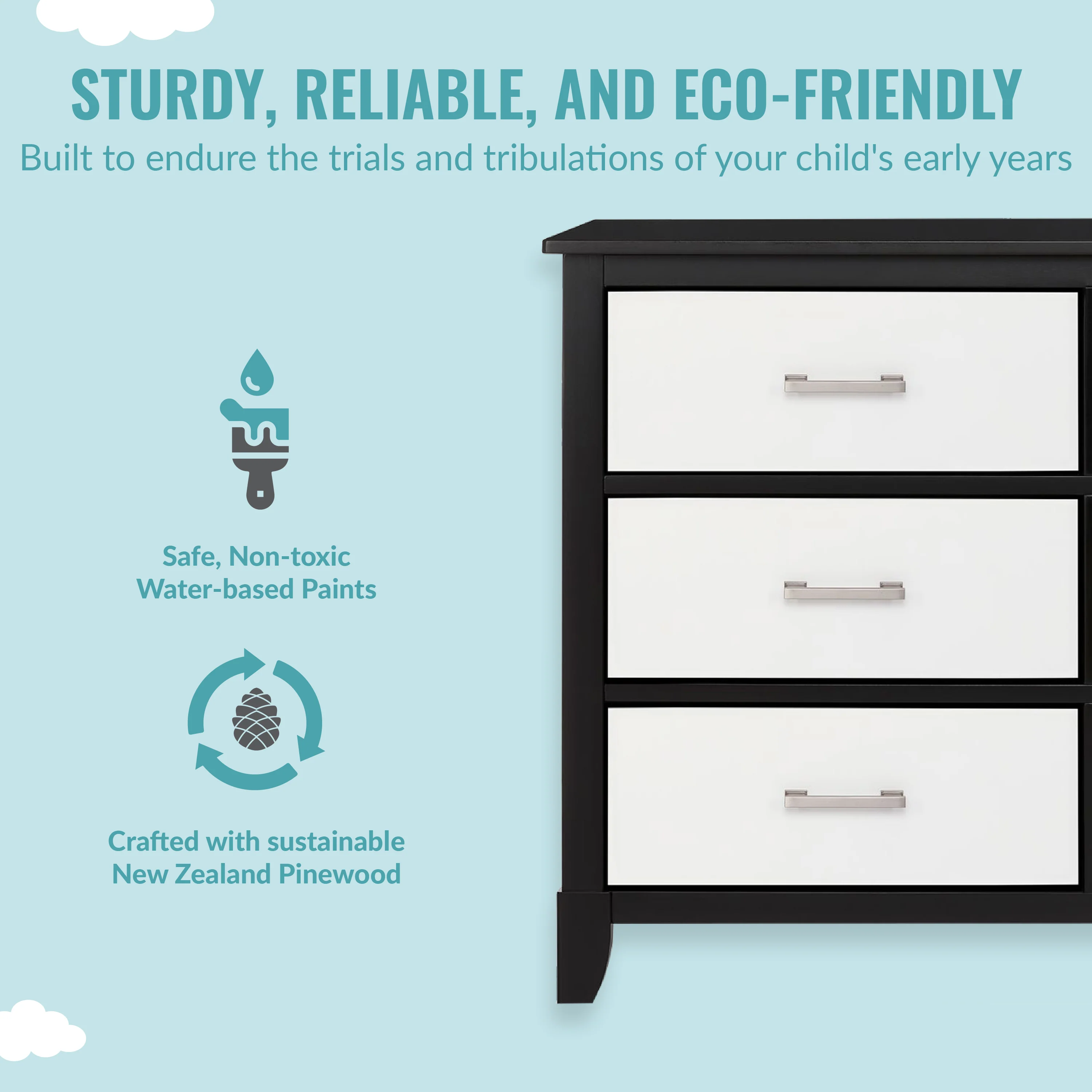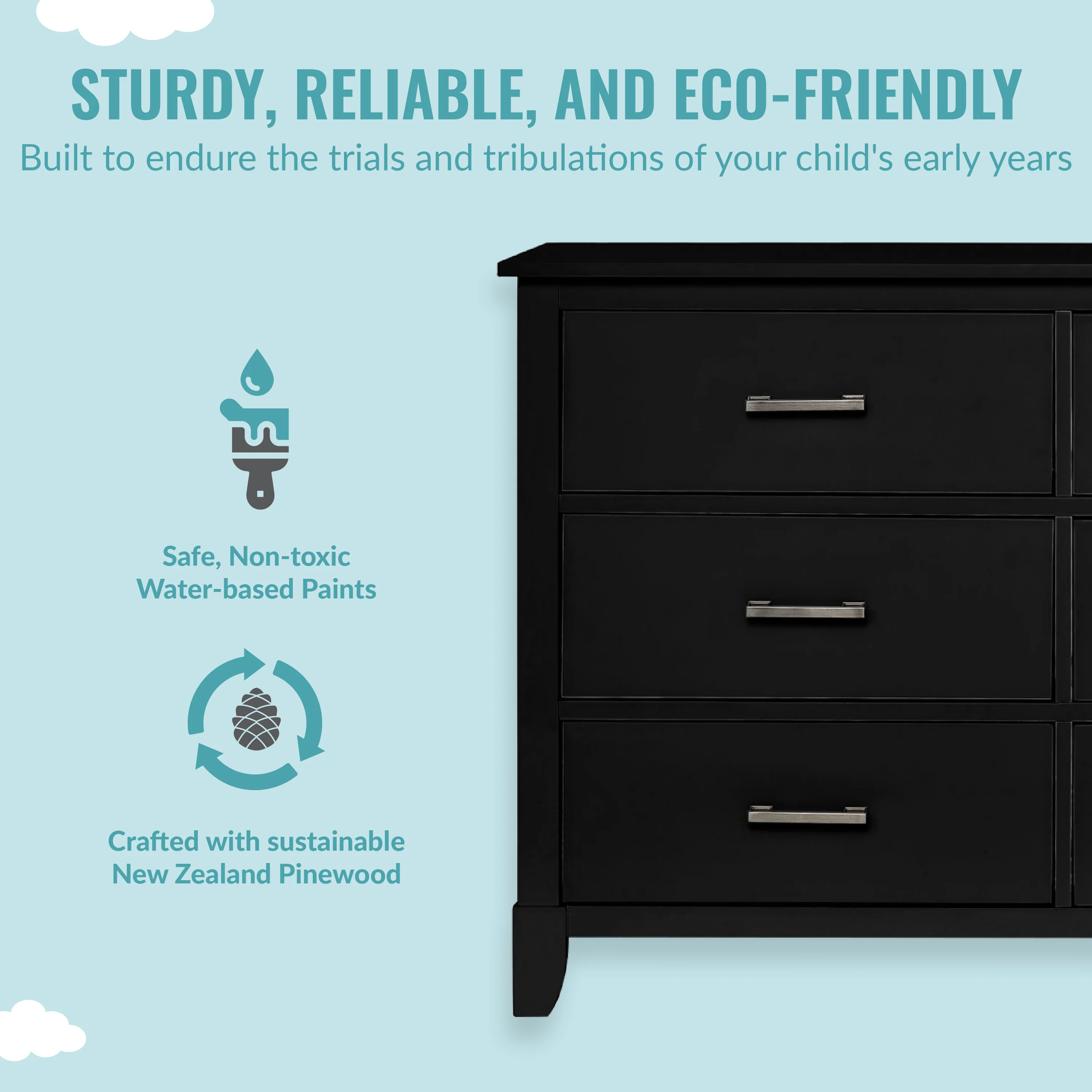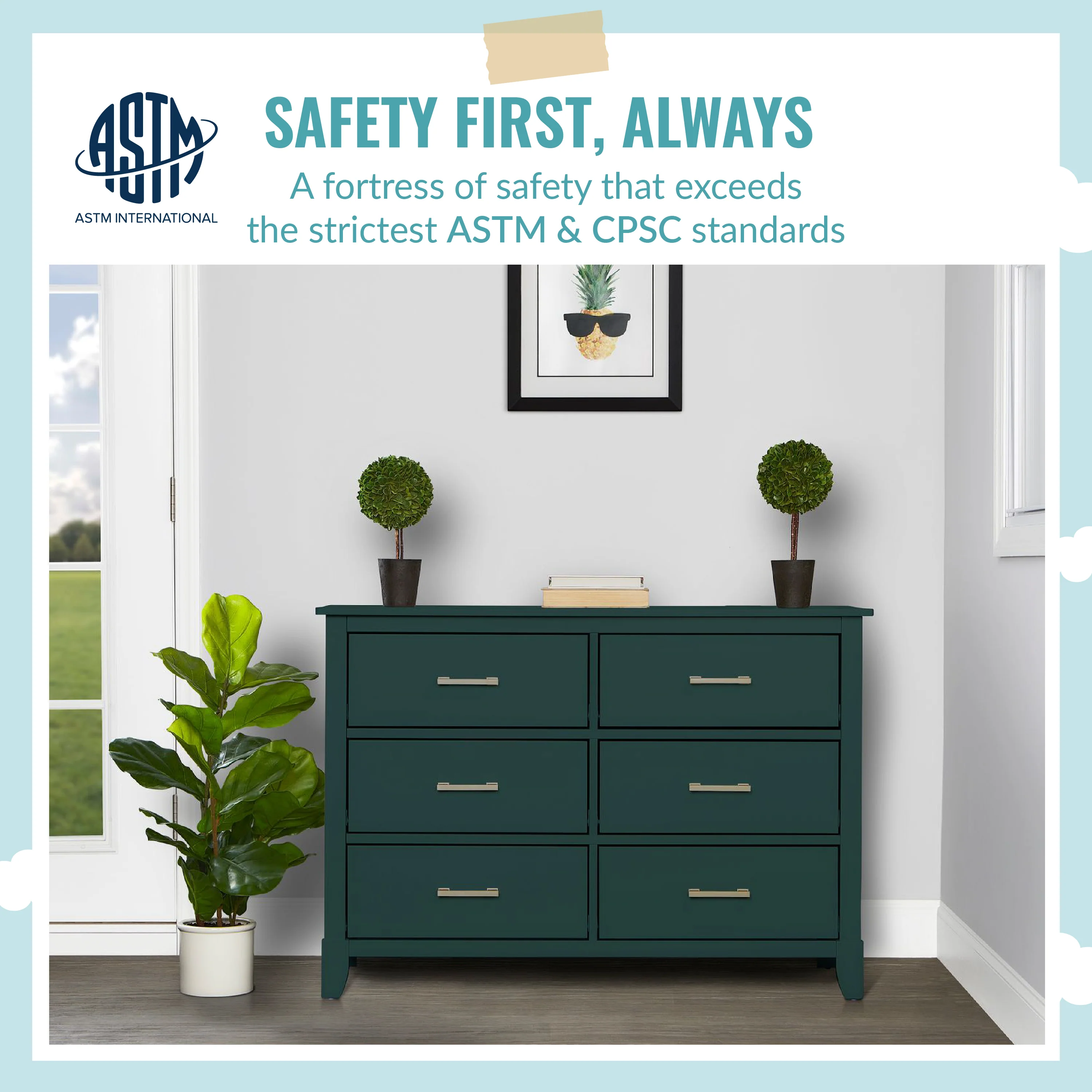 • SAFETY MATTERS: Finished in a non-toxic multi-step painting process and is lead and phthalate safe. The Universal Dresser meets/exceeds ASTM/CPSC safety standards. Stop mechanism and anti-tip kit included for additional safety