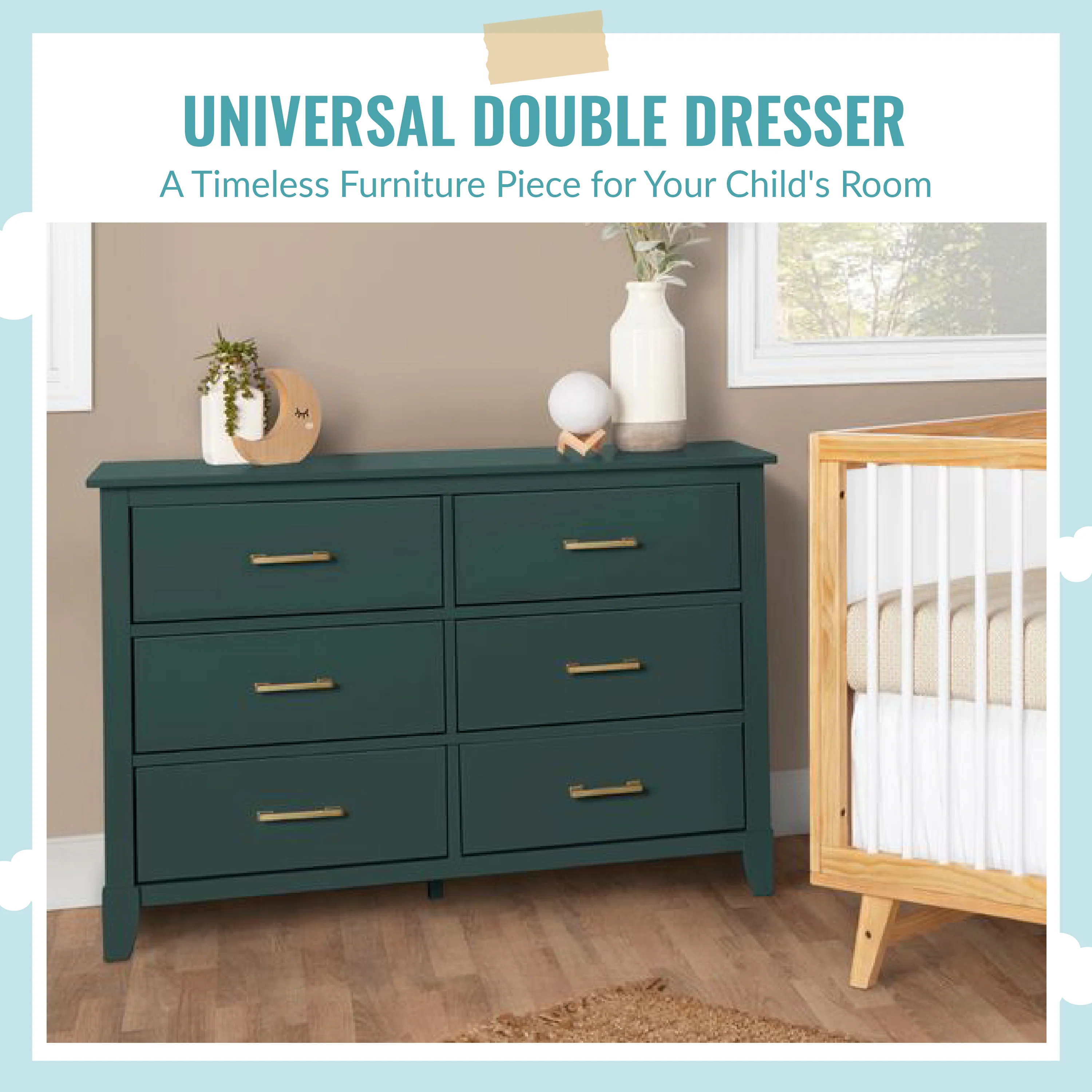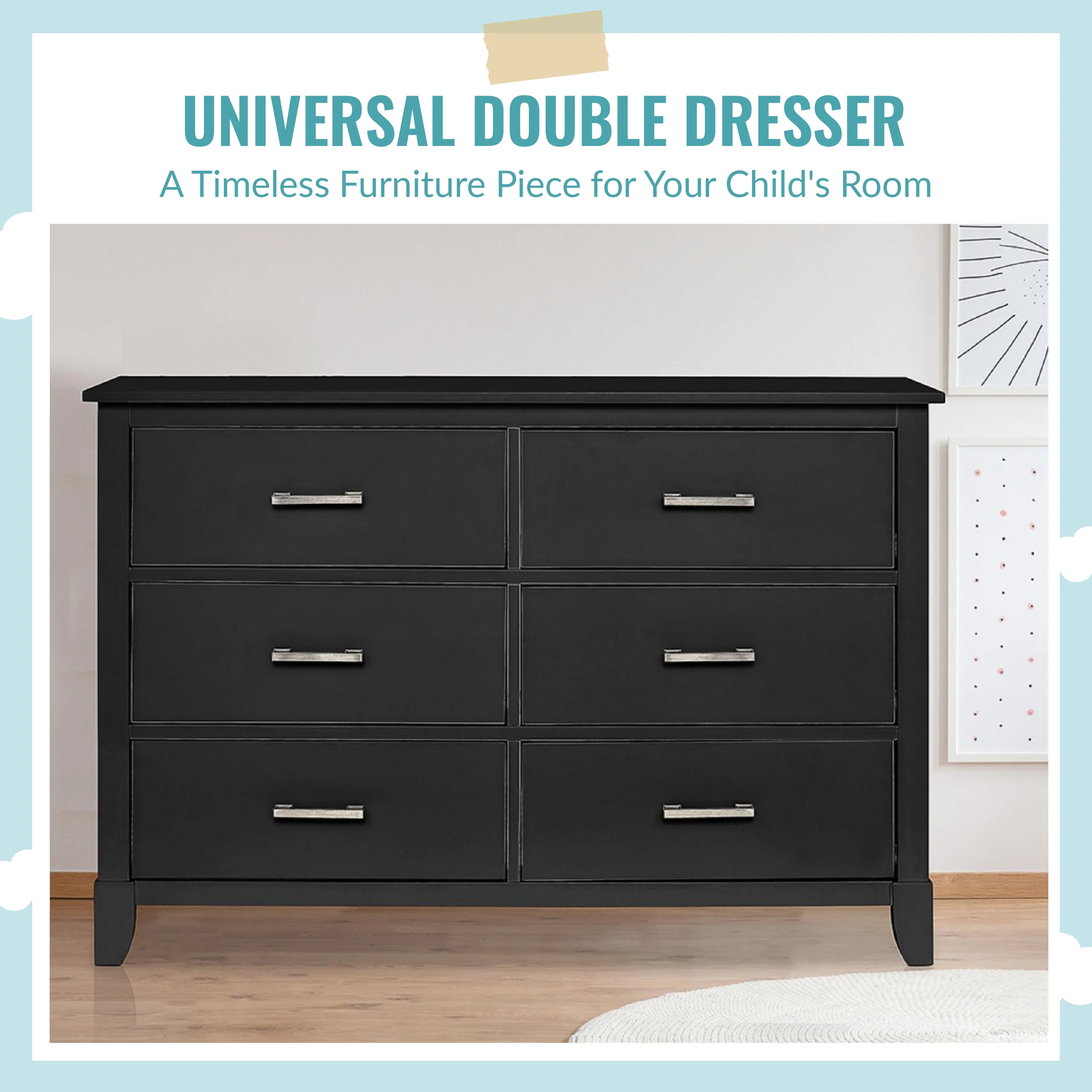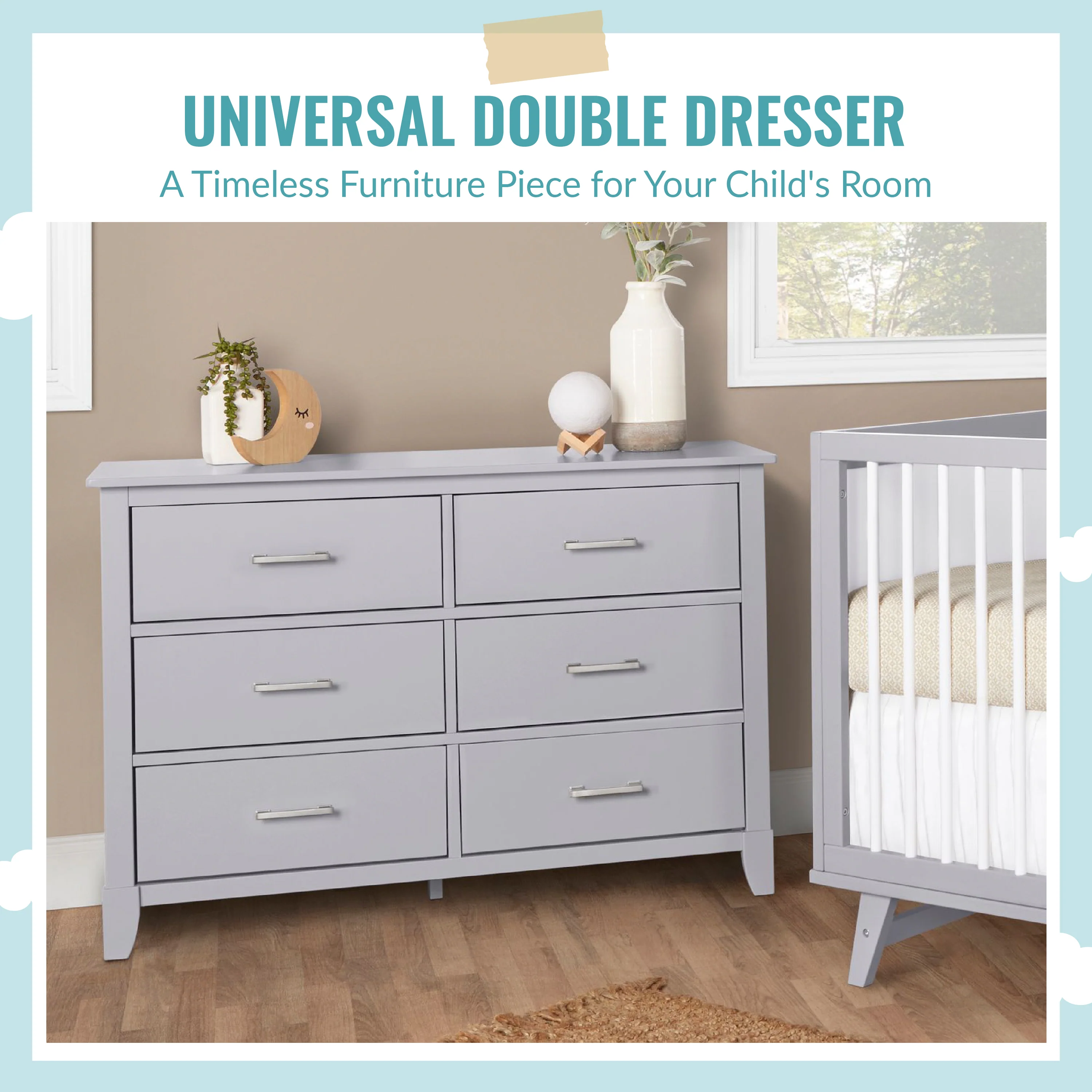 The Universal Double Dresser is a must-have nursery storage solution that adapts gracefully with your child. It comes with pre-assembled drawer glides that make the assembly process a breeze. Its Euro glides allow you to pull open drawers with ease even when your hands are full holding your LO! The clean lines, tapered feet and metal drawer pulls add style to any nursery!
