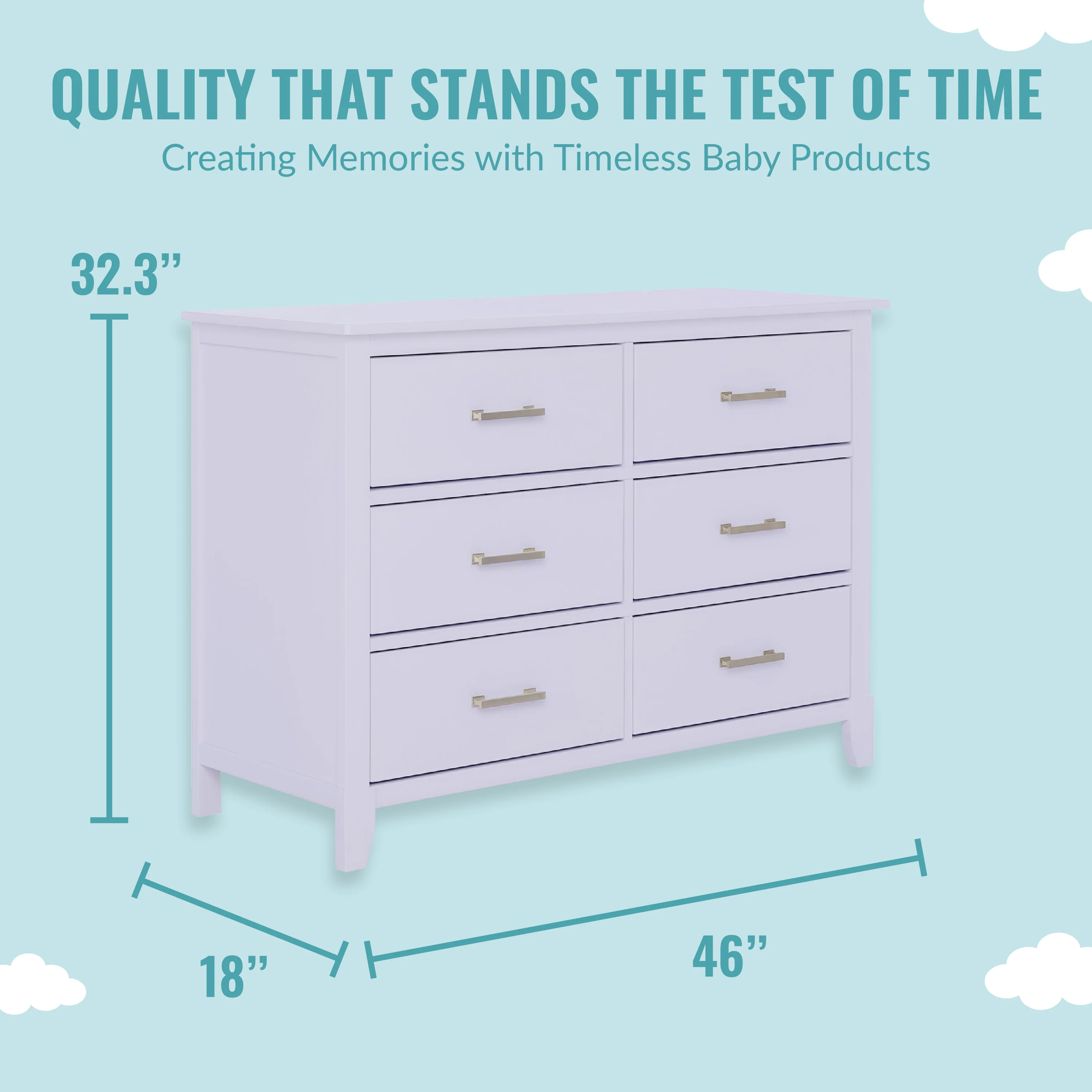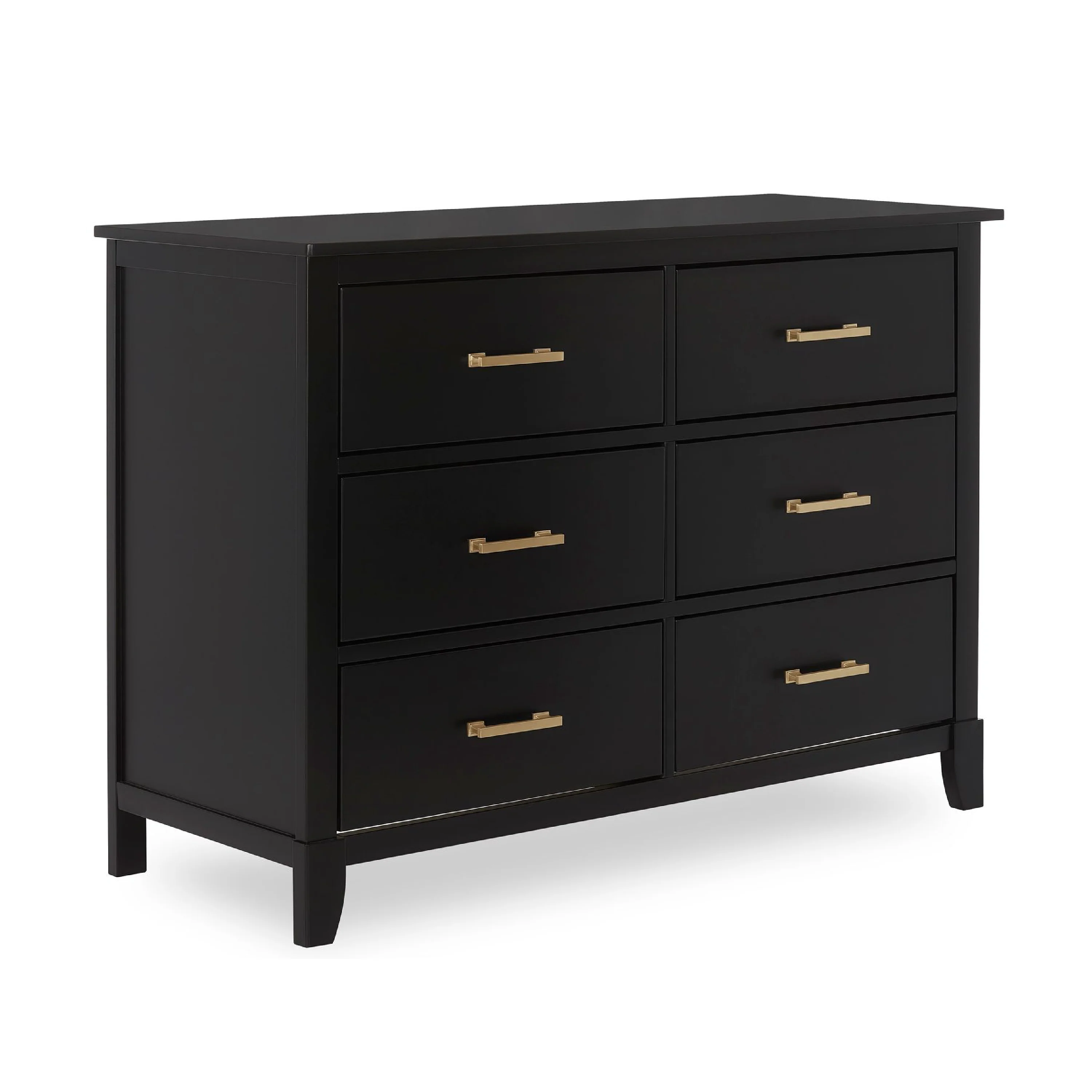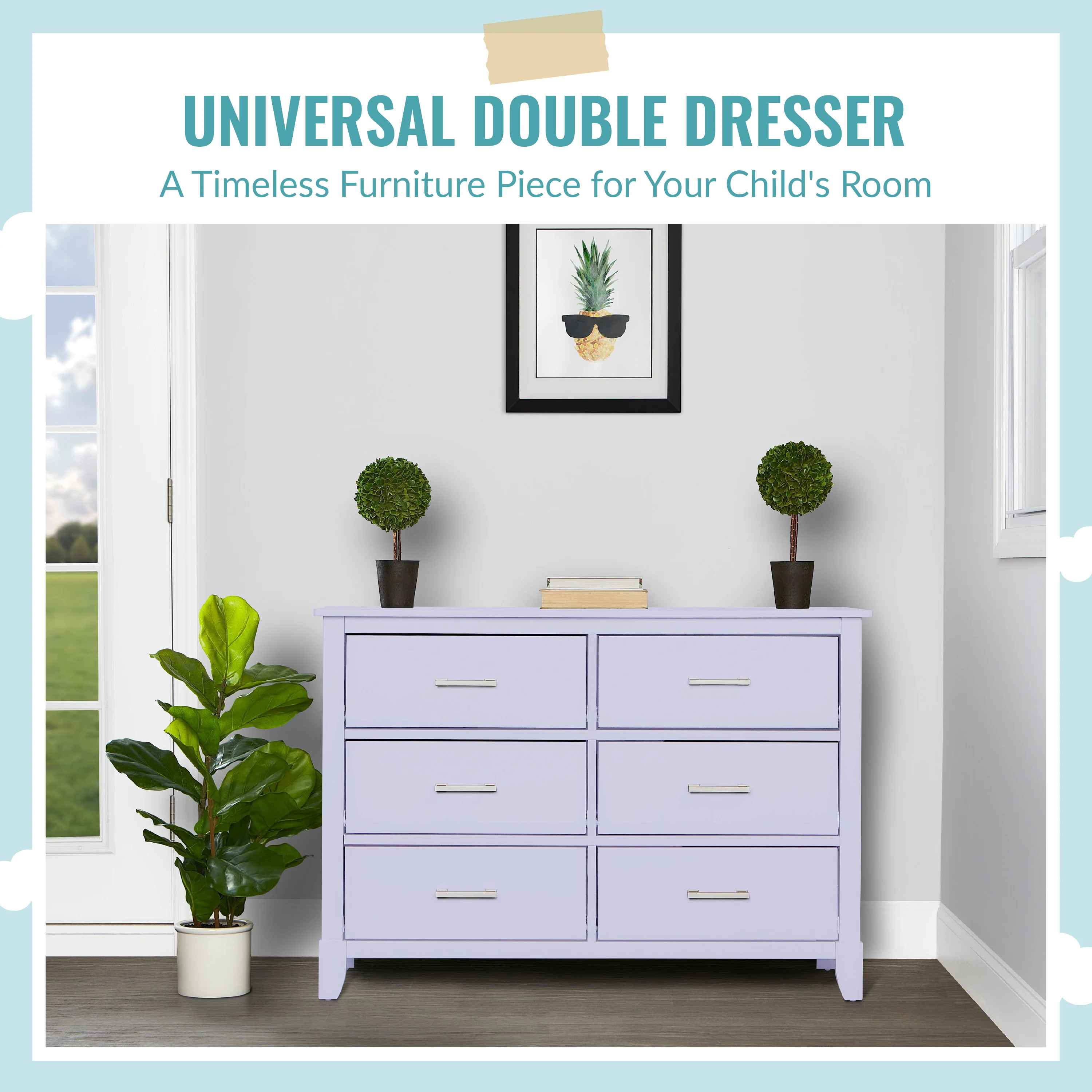 The Universal Double Dresser is a must-have nursery storage solution that adapts gracefully with your child. It comes with pre-assembled drawer glides that make the assembly process a breeze. Its Euro glides allow you to pull open drawers with ease even when your hands are full holding your LO! The clean lines, tapered feet and metal drawer pulls add style to any nursery!