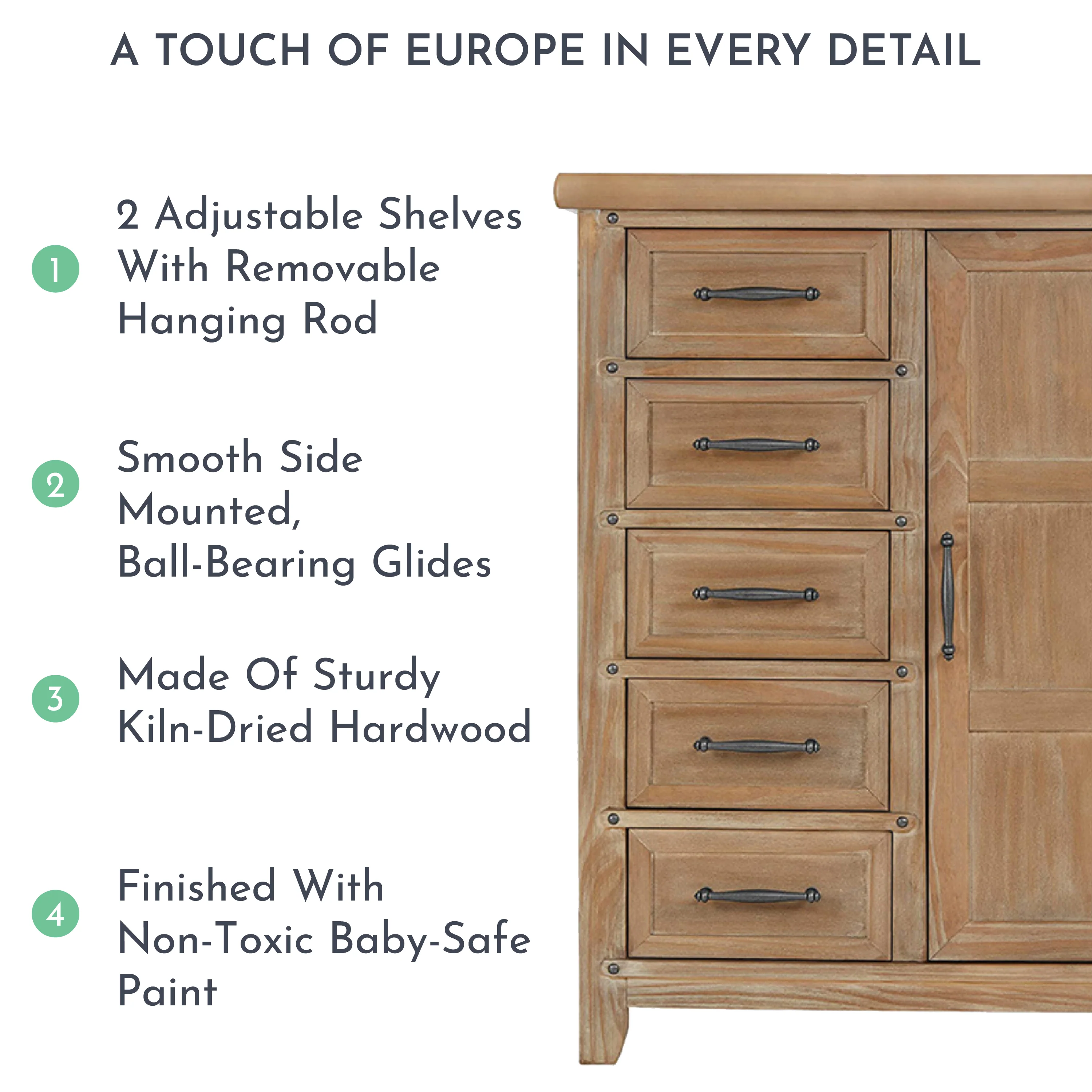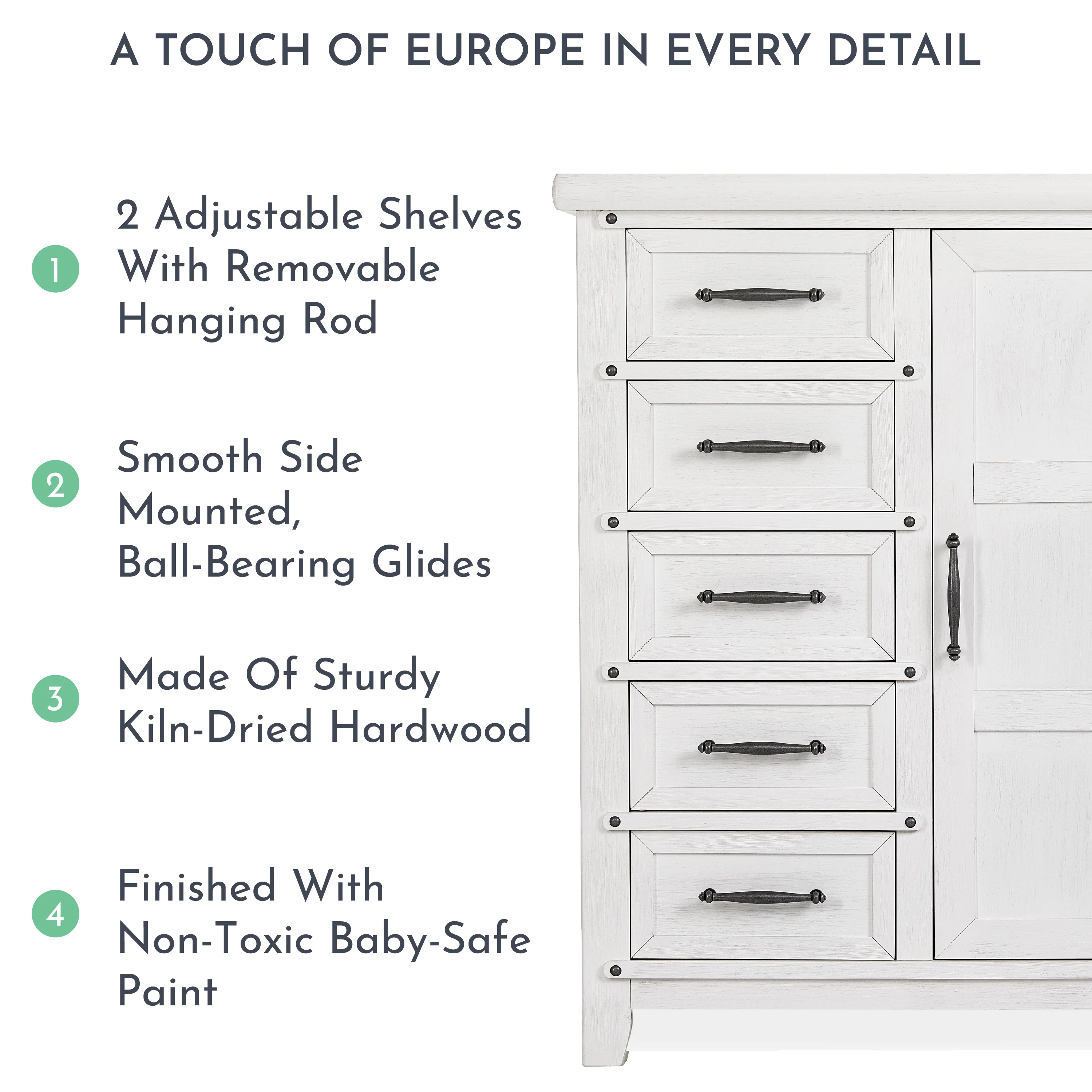 Transform your dream nursery with the influence of country European-style design�?and a whole lot of space! Introducing the Andorra Chifforobe with a unique, metal Nail-head trim - a storage necessity that’s designed to add that grandeur to any décor.