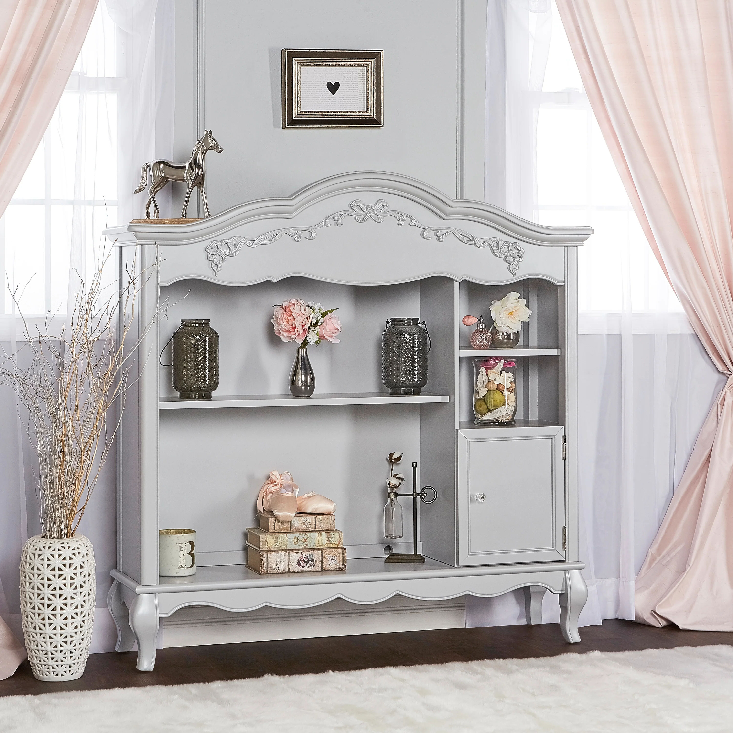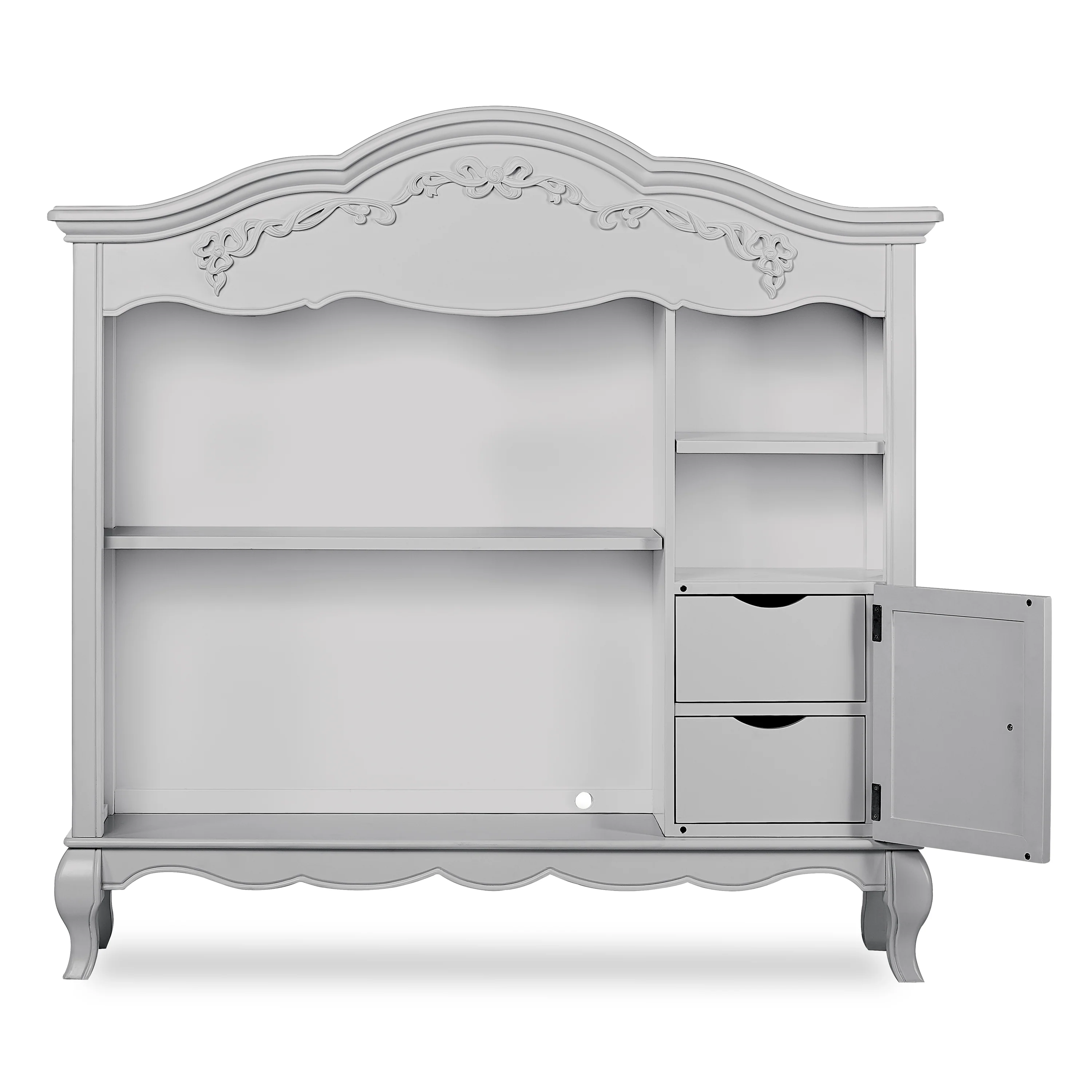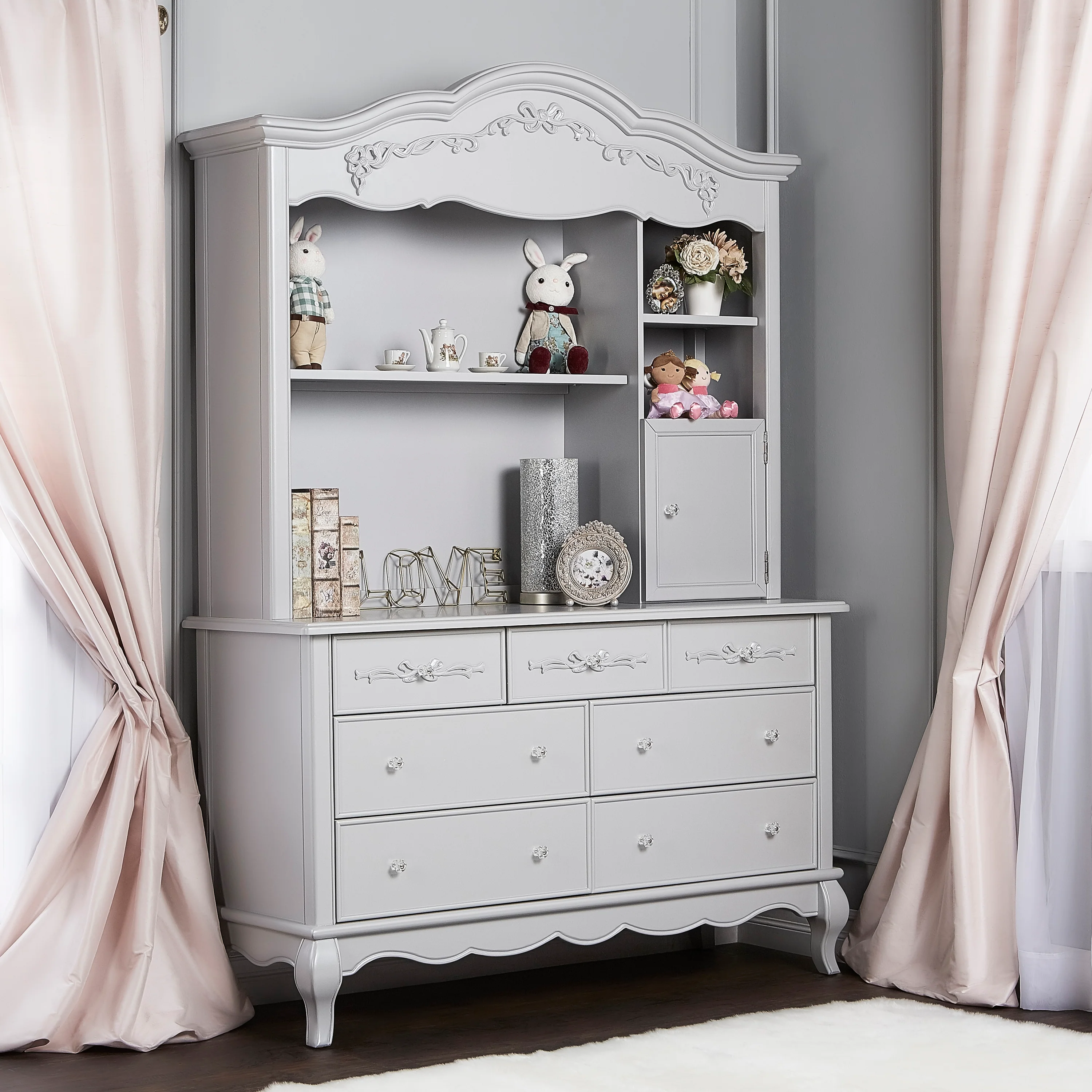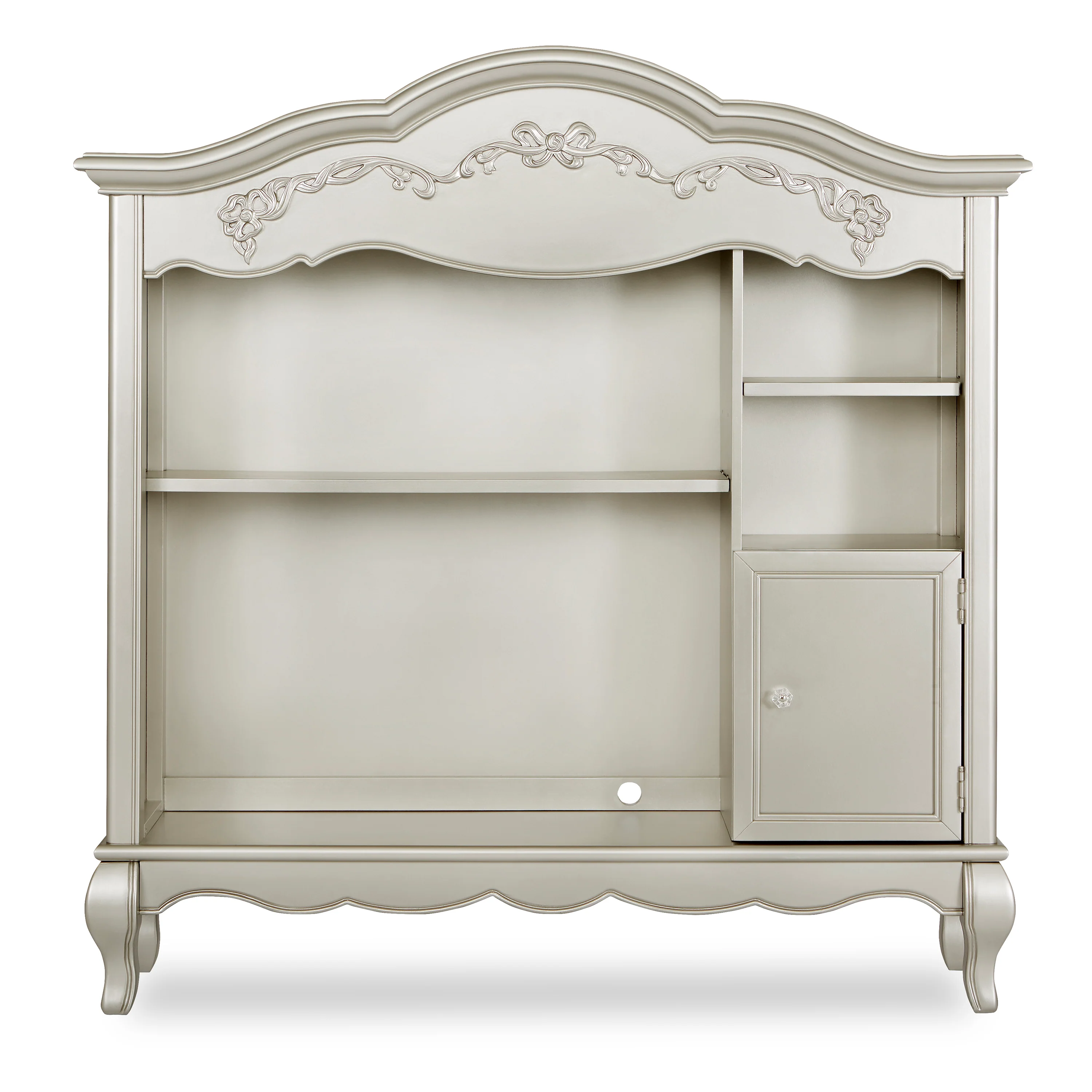 Once upon a time, there was a whimsical fairytale nursery collection that was inspired and designed by Evolur. This Victorian style hutch incorporates soft feminine carving, crystal and metal knobs, Queen Anne style feet, and a delicate ribbon and bow scrollwork, which creates a room as if taken straight from the pages of a fairytale. The Evolur Aurora hutch features one fixed upper-shelf and one removable shelf, this piece incorporates two hidden drawers. The Aurora hutch base can be remove and attached to the Aurora double dresser. This dual-purpose hutch is design to make baby changing easier; simply place your go to baby changing essentials on the shelves and you are ready for every single changing occasion. This multiple function hutch can also be use in other areas in the home for keepsakes, pictures frames, books and beautiful decorations. The Evolur Aurora hutch is available in Ivory Lace, Blush Pink Pearl and Grey Pearl finishes, which is ideal for any décor to create and inspire a happily ever after your child will adore.