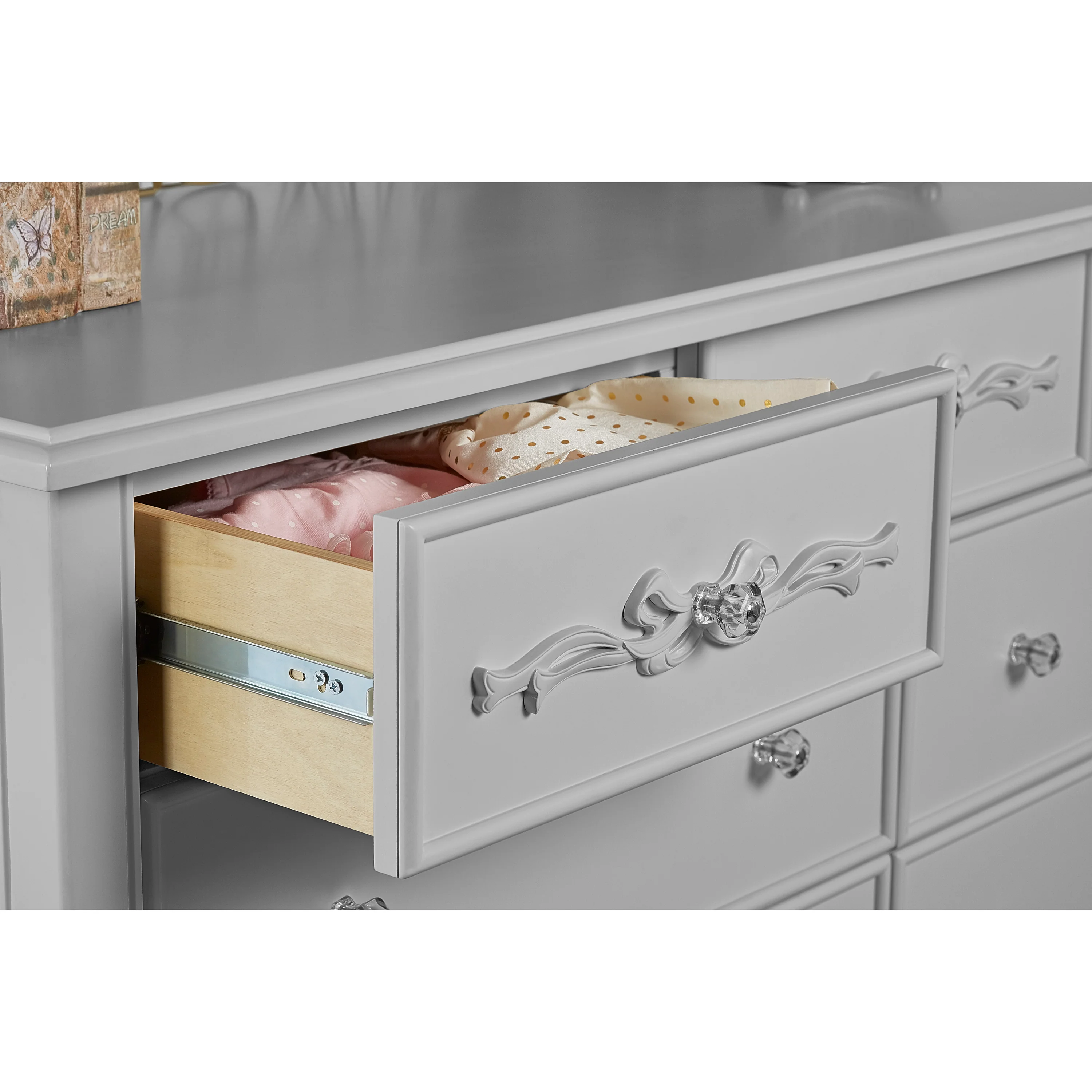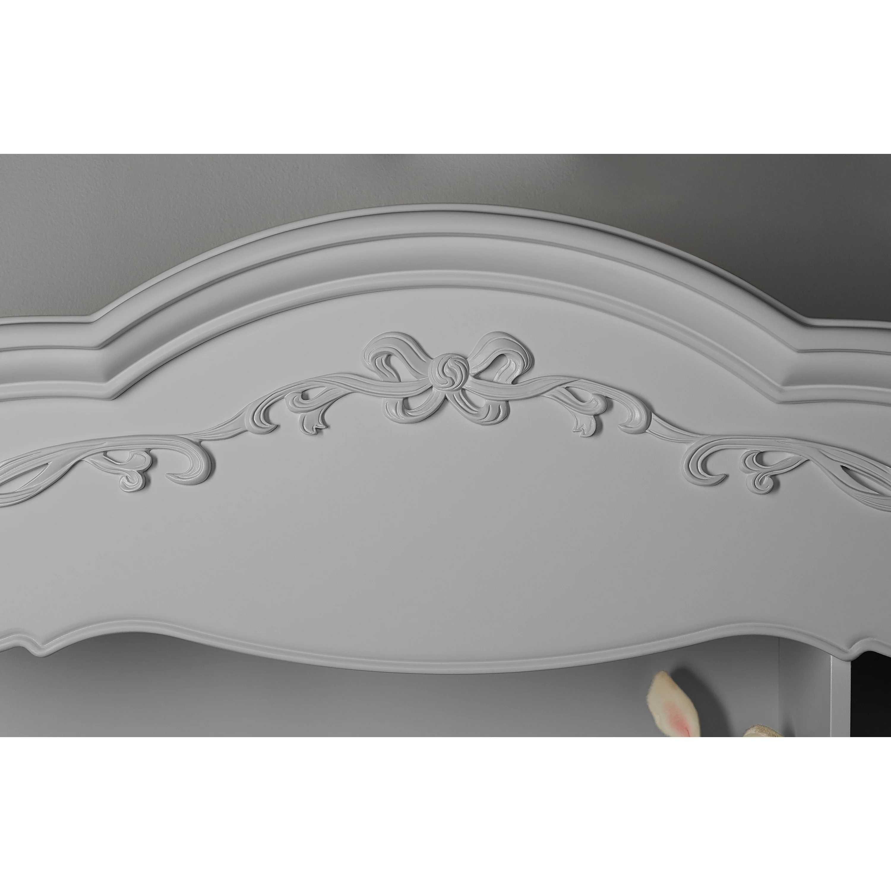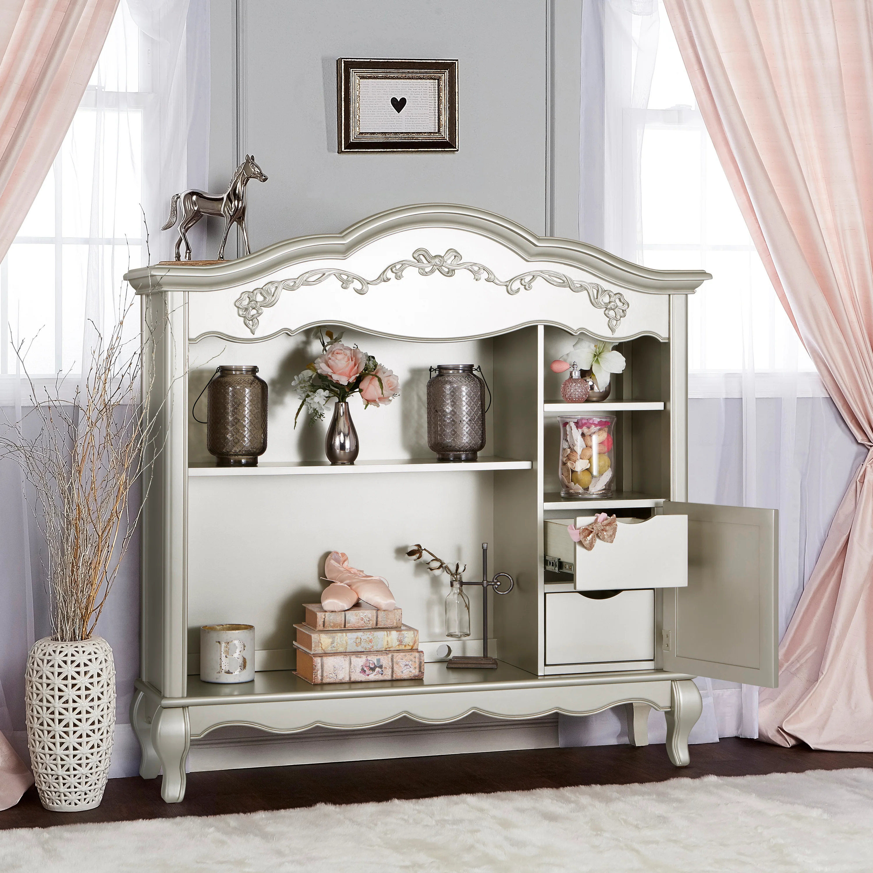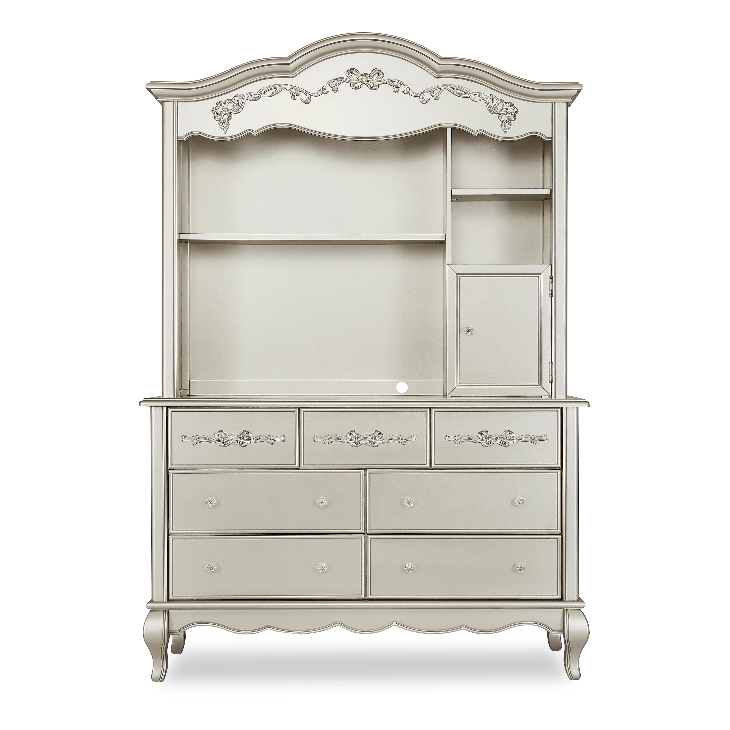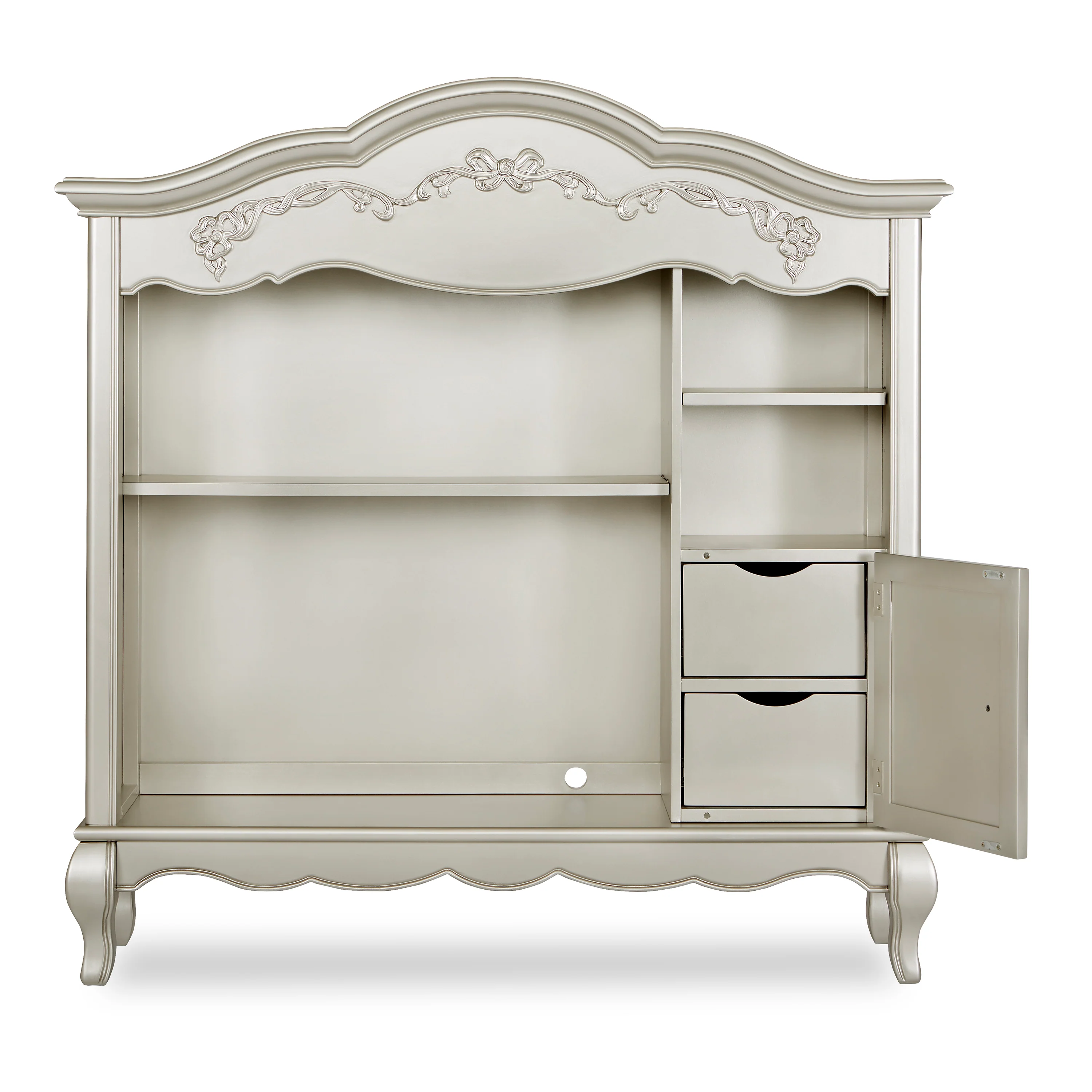 Once upon a time, there was a whimsical fairytale nursery collection that was inspired and designed by Evolur. This Victorian style hutch incorporates soft feminine carving, crystal and metal knobs, Queen Anne style feet, and a delicate ribbon and bow scrollwork, which creates a room as if taken straight from the pages of a fairytale. The Evolur Aurora hutch features one fixed upper-shelf and one removable shelf, this piece incorporates two hidden drawers. The Aurora hutch base can be remove and attached to the Aurora double dresser. This dual-purpose hutch is design to make baby changing easier; simply place your go to baby changing essentials on the shelves and you are ready for every single changing occasion. This multiple function hutch can also be use in other areas in the home for keepsakes, pictures frames, books and beautiful decorations. The Evolur Aurora hutch is available in Ivory Lace, Blush Pink Pearl and Grey Pearl finishes, which is ideal for any décor to create and inspire a happily ever after your child will adore.