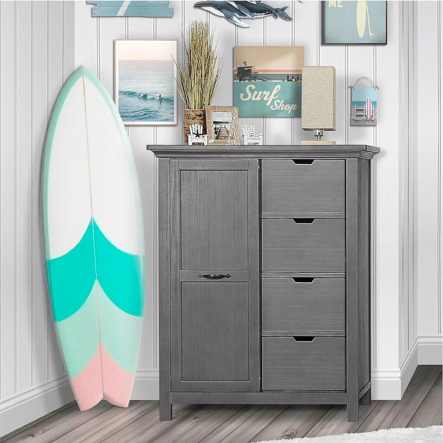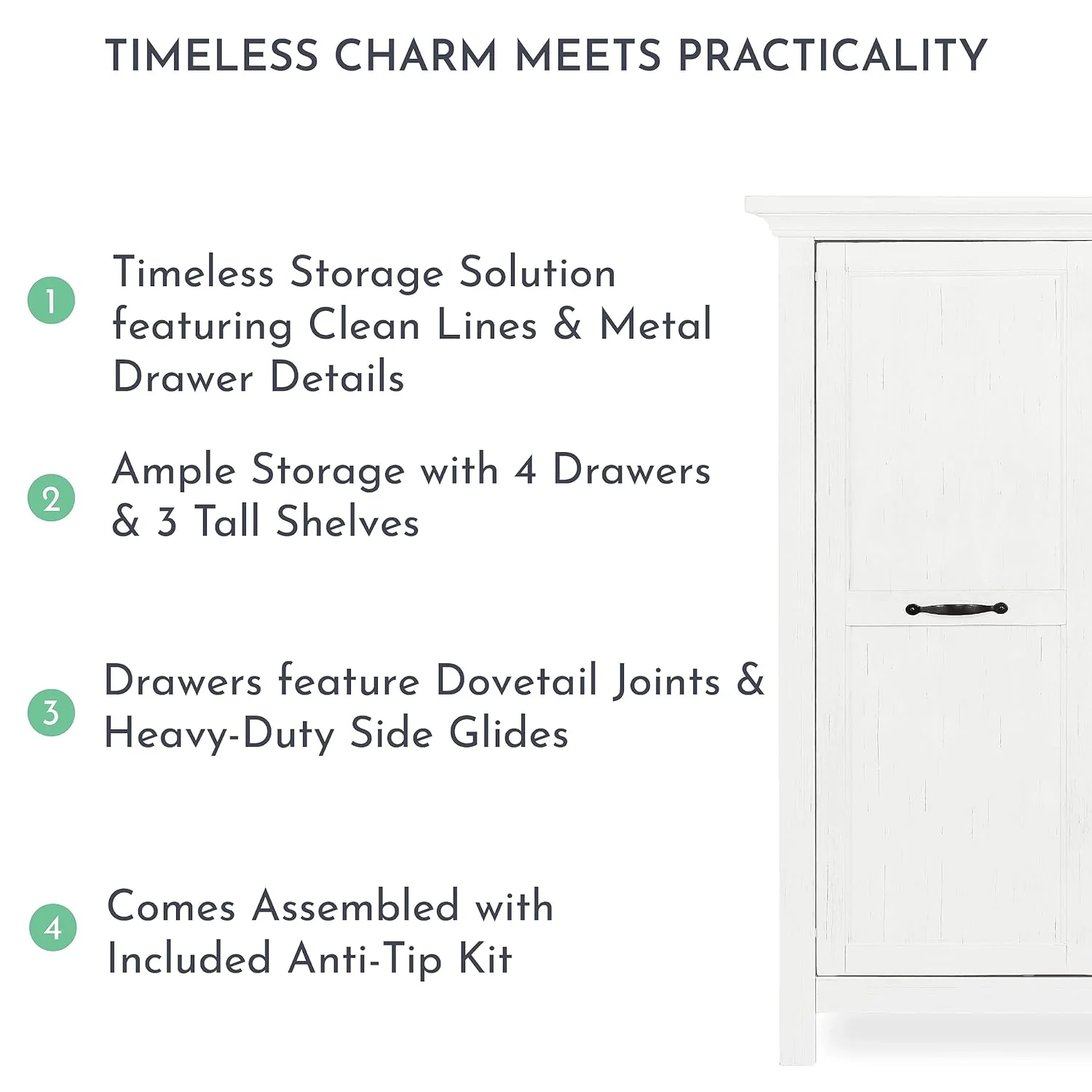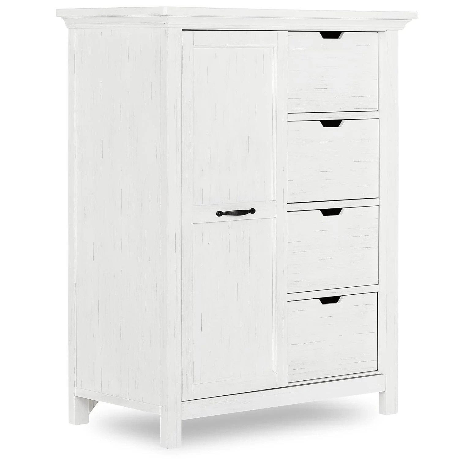 • Designed with four deep and roomy drawers and a sliding door that reveals three tall shelves, the chest comes assembled and includes an anti-tip kit.