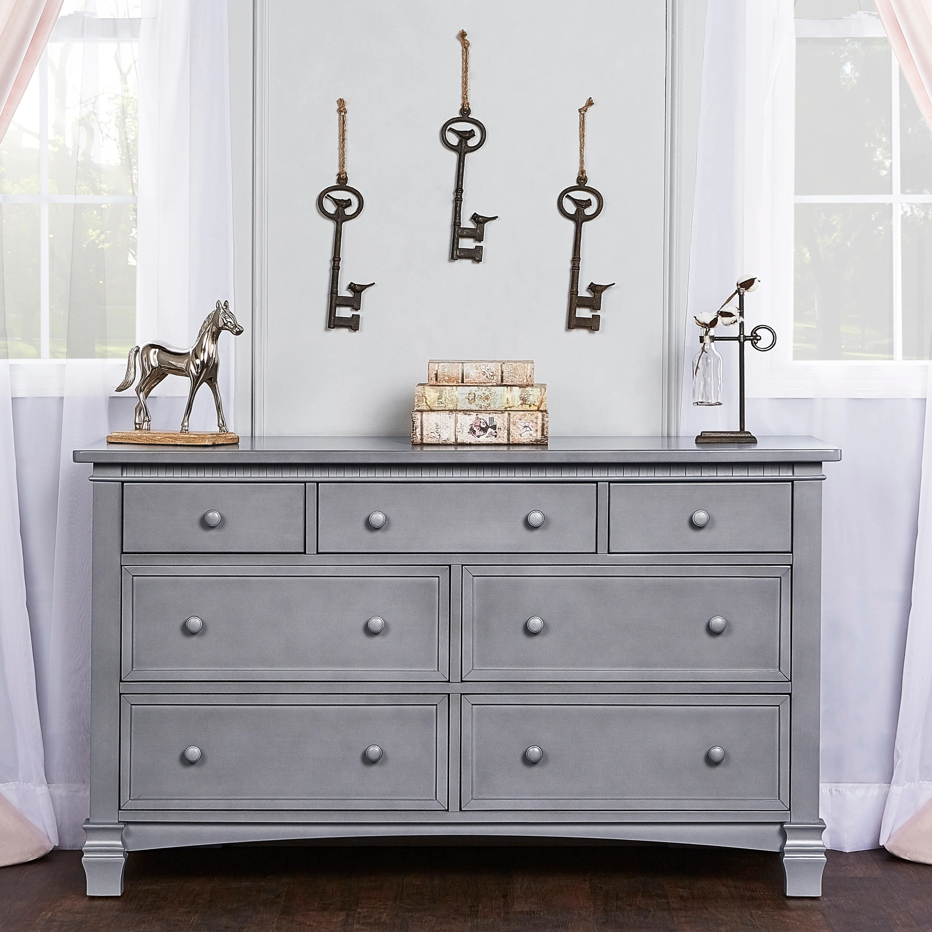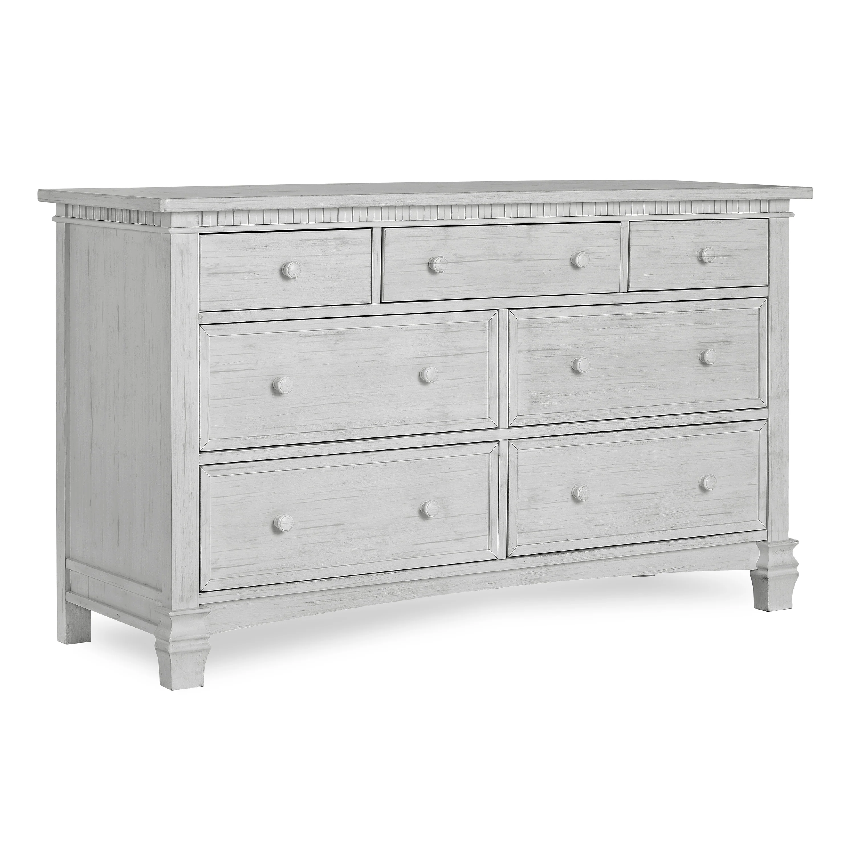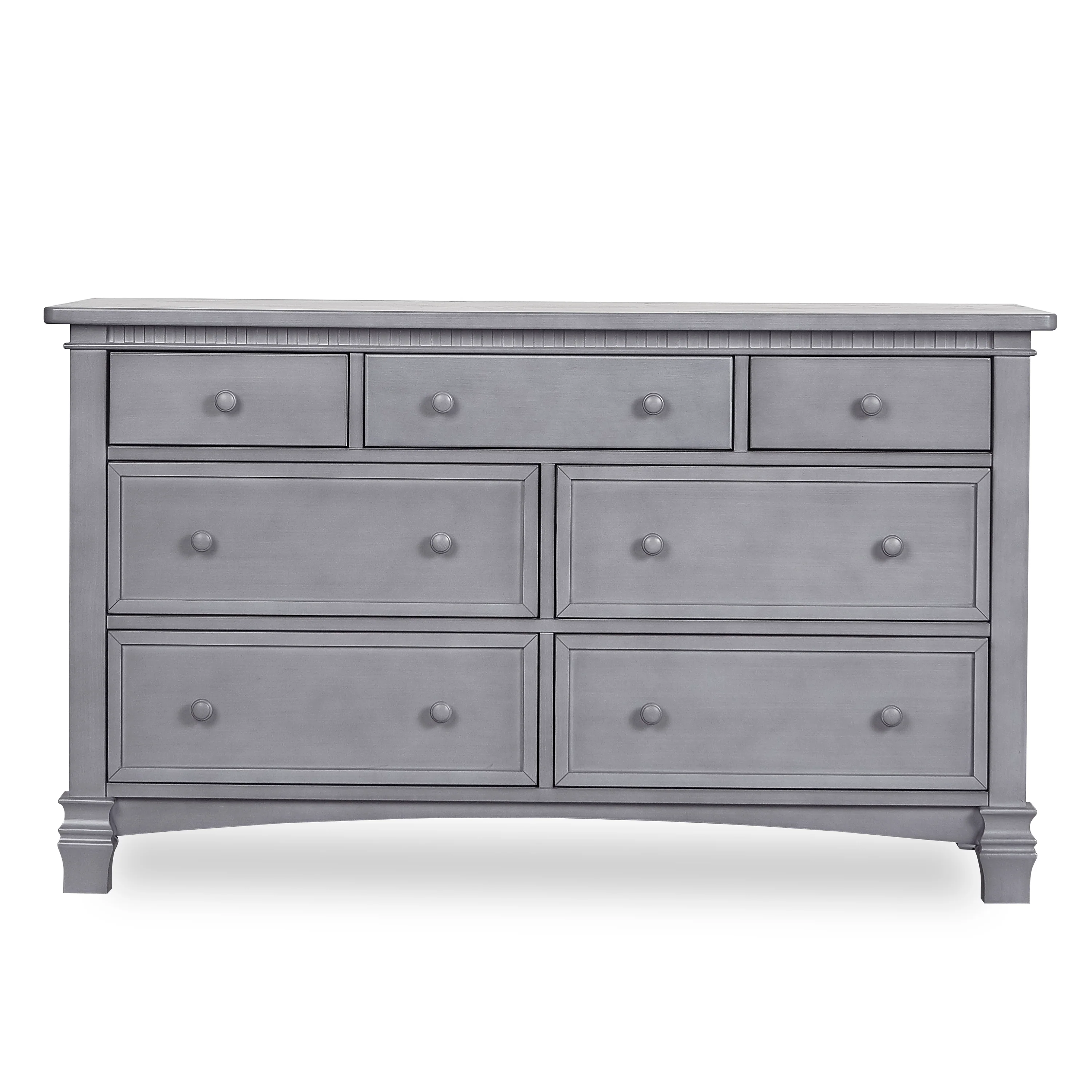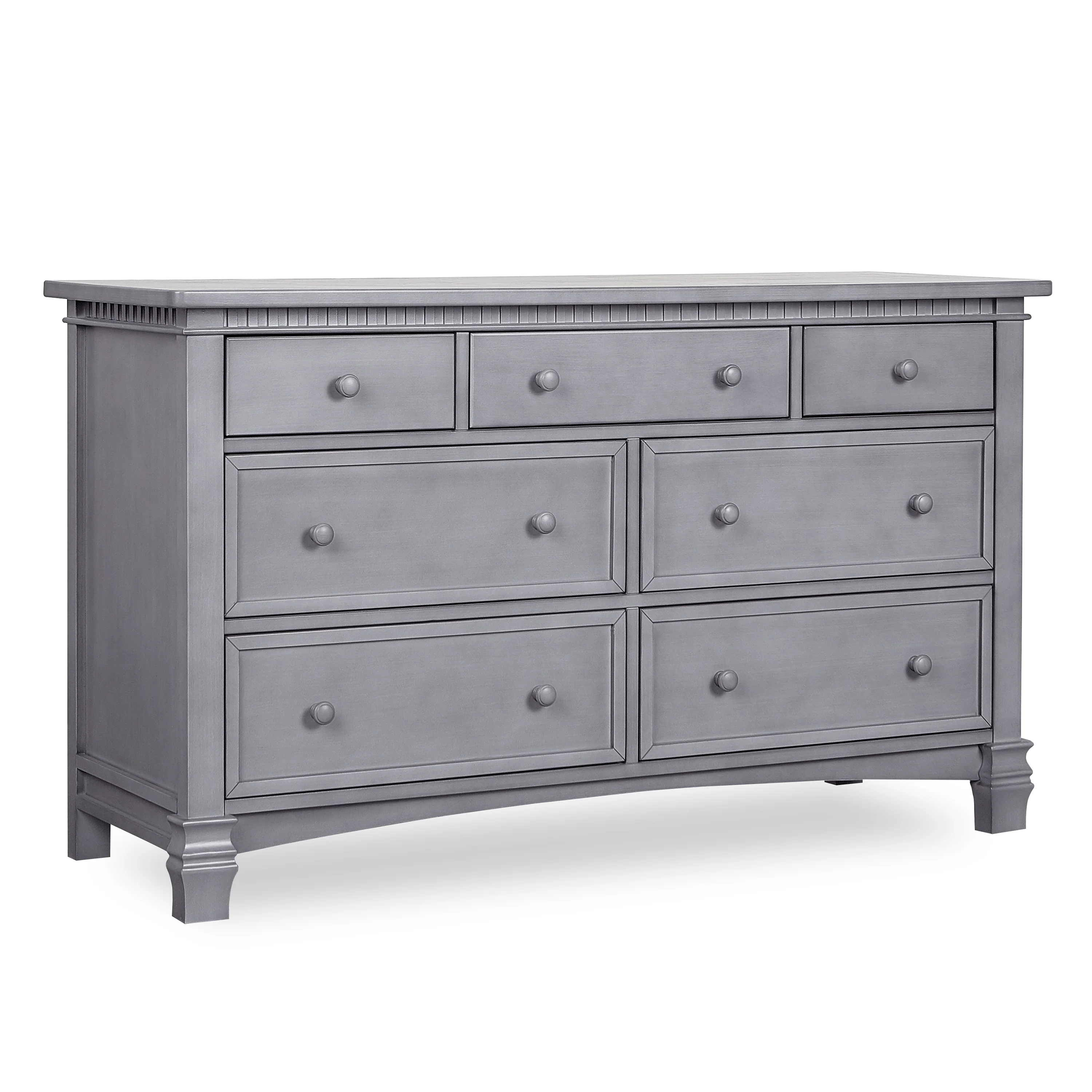 The Evolur Cheyenne and Santa Fe Double Dresser inspired by the Roman architecture, showcase traditional dentil molding, contemporary routing, fluting and imperial feet, that are timeless and thoroughly modern. The drawers feature wooden drawer pulls and quality side-mounted 3 tier glides to help provide durability over the years with its quality materials, craftsmanship and its forward-thinking functionality. This double dresser can serve as a changing surface by adding a contour pad (sold separately).